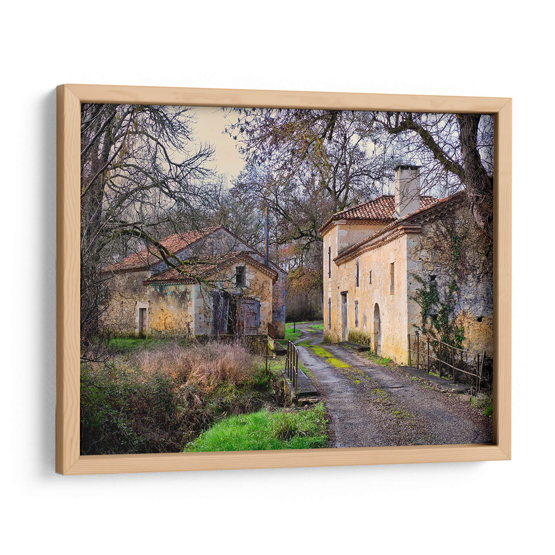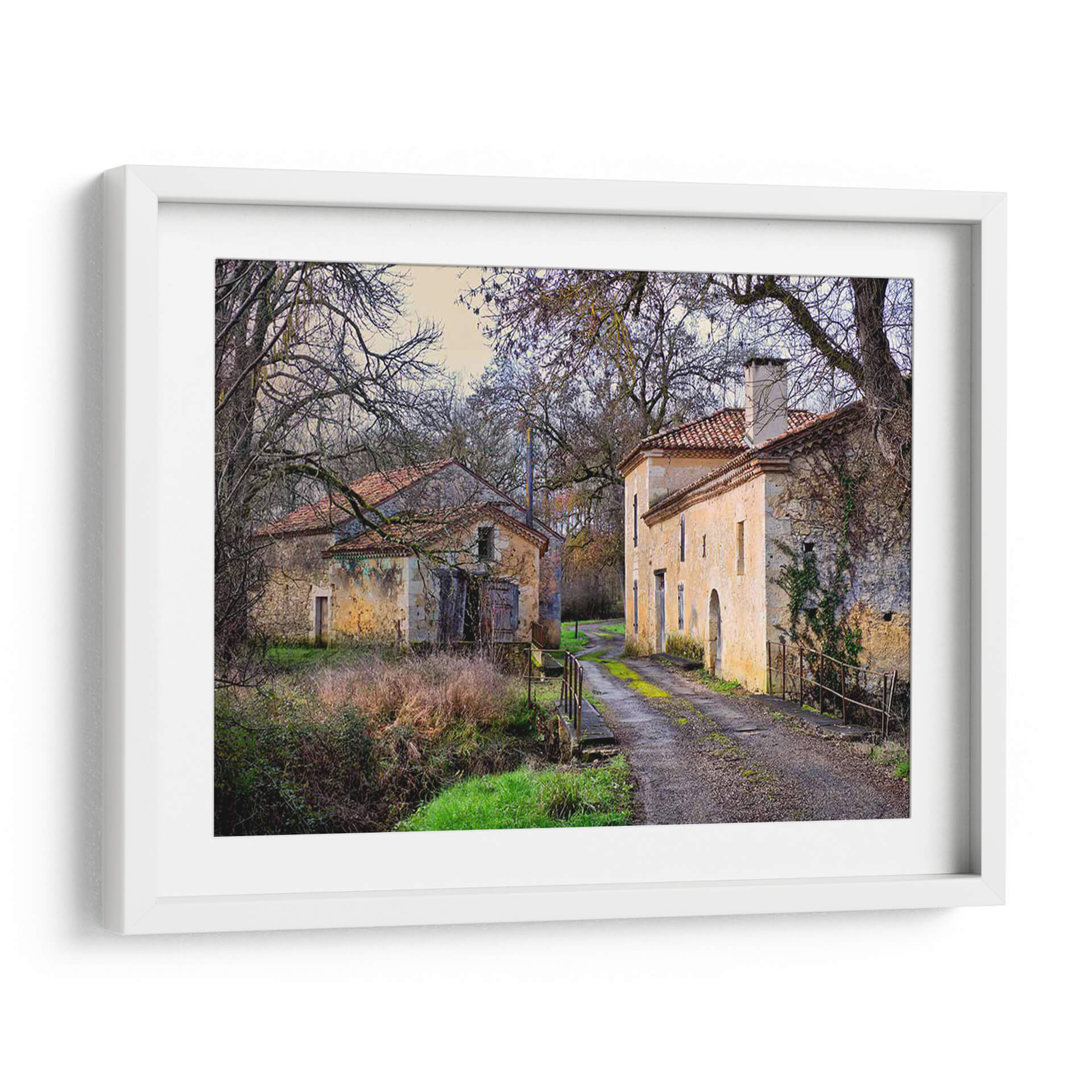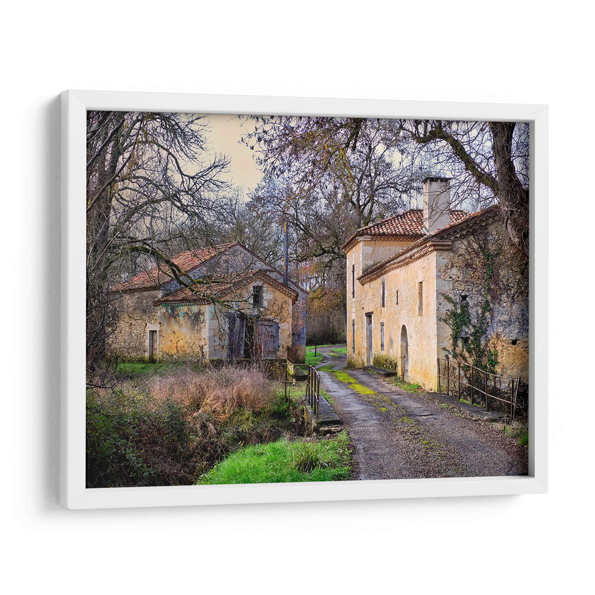 Adéntrate en la serena belleza de "Campo Pastoral XII", una cautivadora obra de Colby Chester que te transporta a un rincón idílico y atemporal. Esta pieza captura la esencia de un paisaje rural francés, con dos edificaciones de piedra rústica y tejados de teja roja, flanqueando un camino de grava que se adentra en la distancia. Los árboles desnudos, con sus ramas entrelazadas como un delicado encaje contra el cielo crepuscular, añaden una atmósfera melancólica y a la vez protectora. La paleta de colores, dominada por tonos tierra, ocres, verdes musgo y toques de azul pálido en el cielo, evoca una sensación de calma y nostalgia. Cada detalle, desde la textura de las paredes desgastadas hasta la vegetación que trepa por una de ellas, invita a la contemplación y al descanso. "Campo Pastoral XII" es más que un cuadro decorativo; es una ventana a un mundo de tranquilidad, ideal para infundir paz en tu sala de estar, un refugio de serenidad en tu estudio o un toque de encanto rústico en tu dormitorio. Deja que esta evocadora imagen sea el punto focal que transforme tu espacio en un santuario de serenidad y belleza natural.