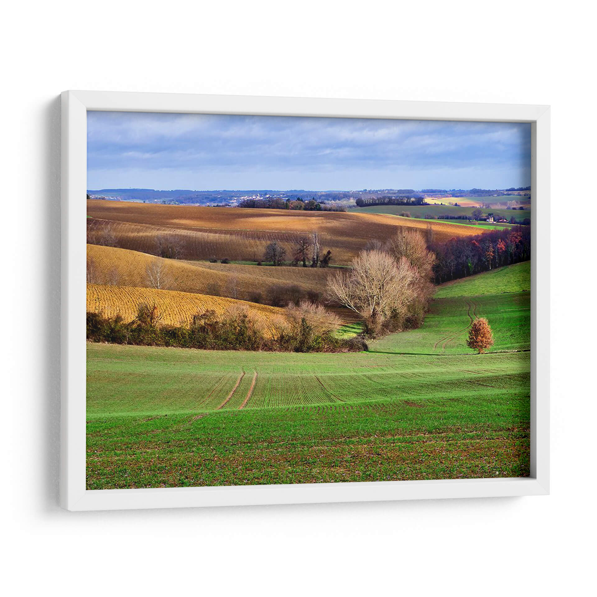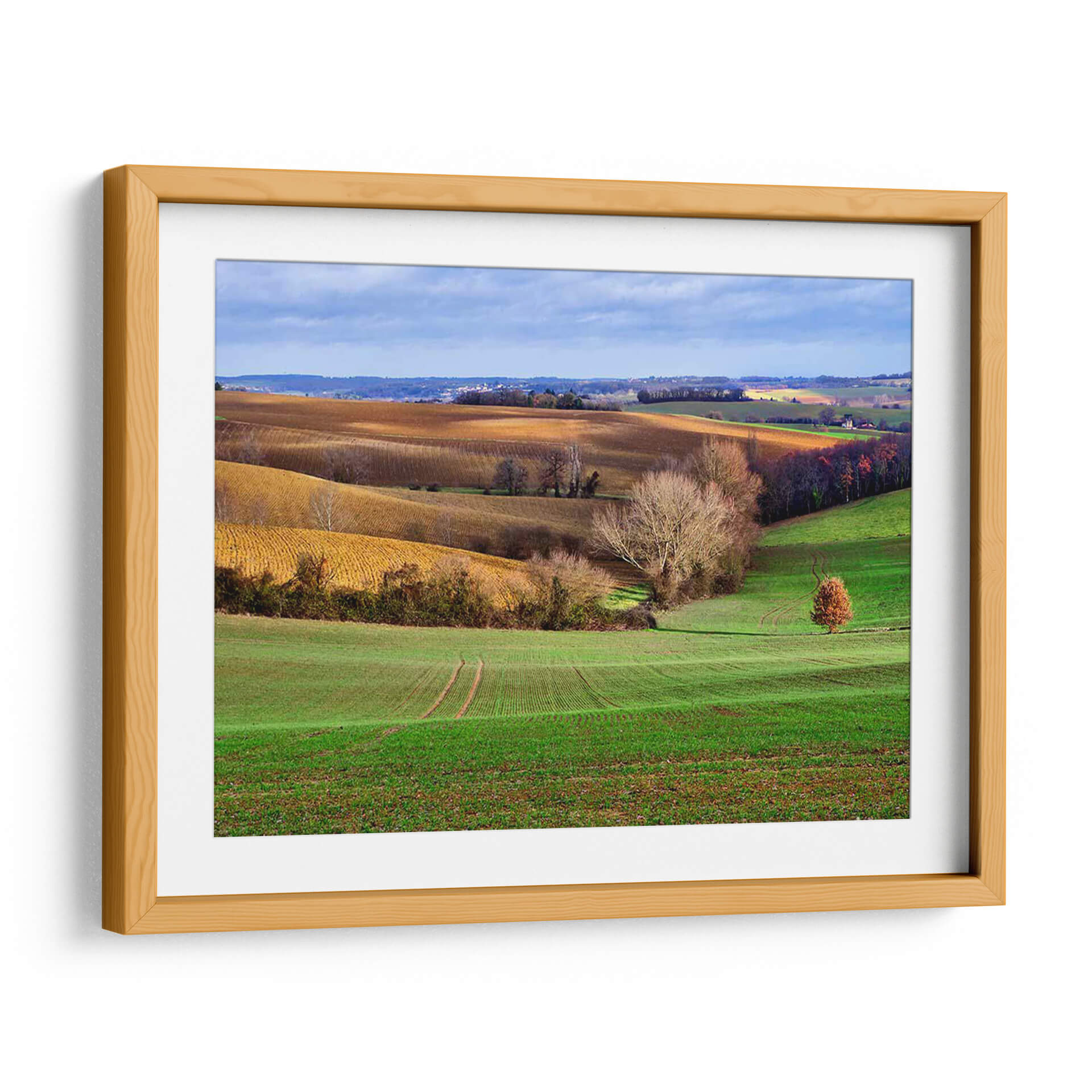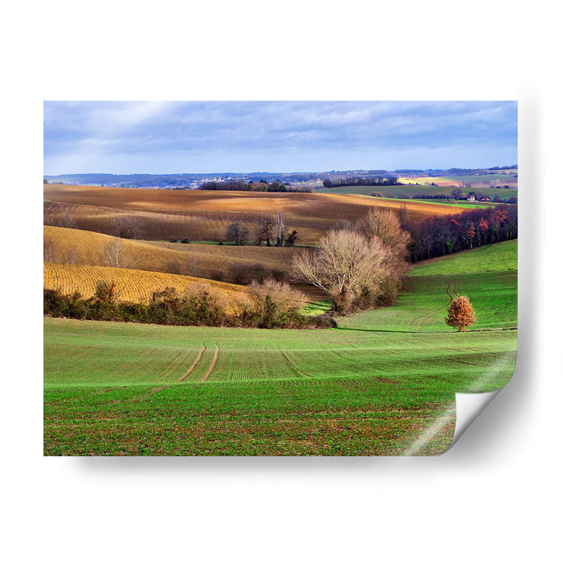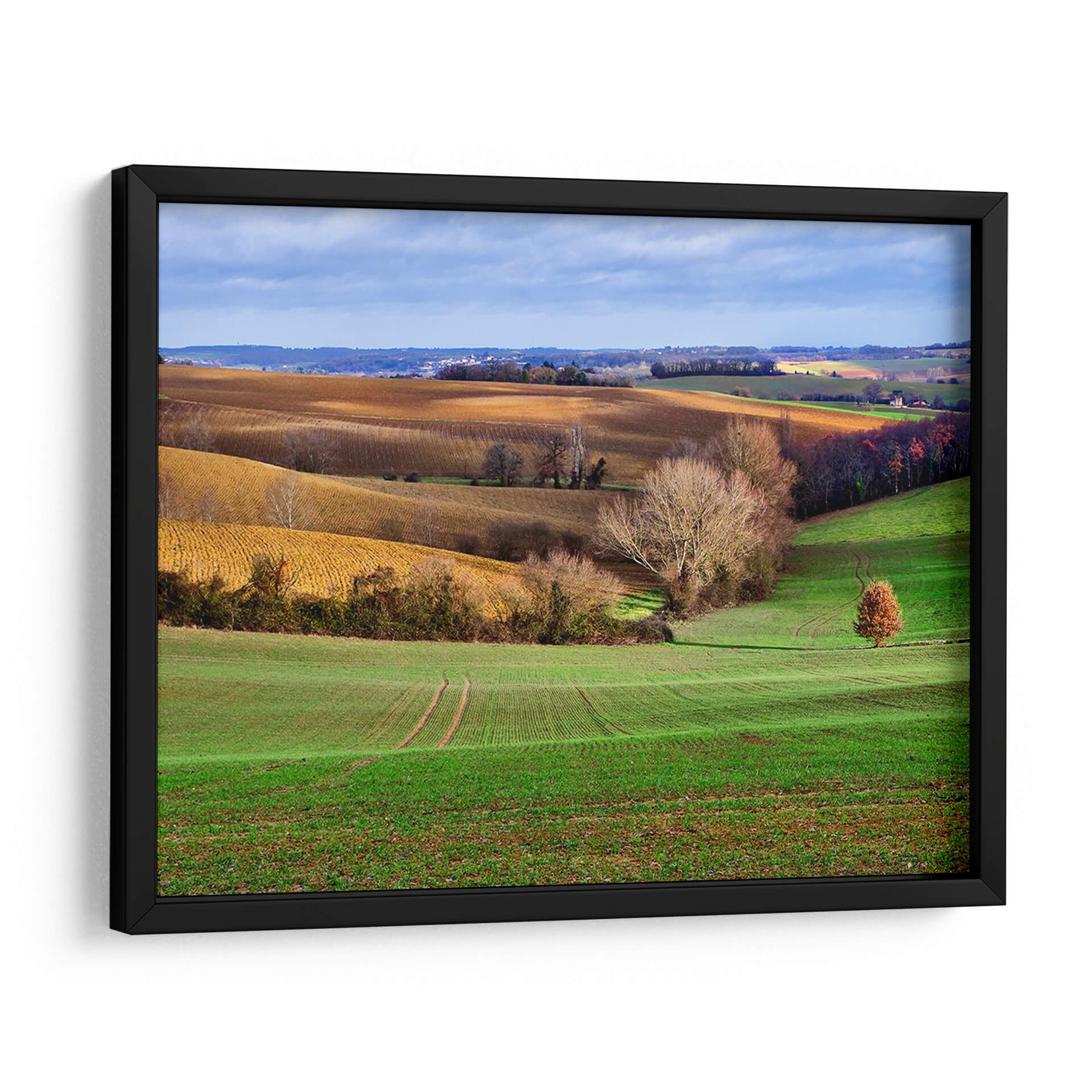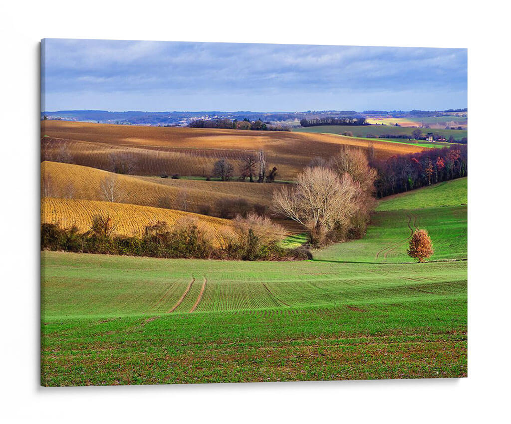 Sumérjase en la serenidad de "Campo Pastoral Xvii", una obra de arte que captura la esencia de la campiña francesa en un día de otoño. Este cuadro decorativo transporta al espectador a través de colinas ondulantes, donde los campos recién arados de un vibrante verde esmeralda se encuentran con tonos ocres y dorados de la tierra. La luz del sol atraviesa las nubes, creando un juego de sombras y brillos que realza la profundidad y textura del paisaje. Un árbol solitario, con su follaje otoñal en tonos rojizos, se erige como un punto focal sutil, invitando a la contemplación. El estilo pictórico, con pinceladas que sugieren movimiento y vida, evoca una sensación de paz y conexión con la naturaleza. "Campo Pastoral Xvii" es ideal para añadir un toque de tranquilidad y belleza natural a cualquier estancia, desde una sala de estar acogedora hasta un tranquilo dormitorio o una oficina que busque un respiro visual. Este paisaje pintado es más que una simple decoración; es una ventana a un momento de calma y armonía rural, perfecta para quienes aprecian la belleza atemporal de la naturaleza y desean infundir esa atmósfera en su hogar. Descubra la serenidad y el encanto de este paisaje rural en formato de cuadro decorativo.