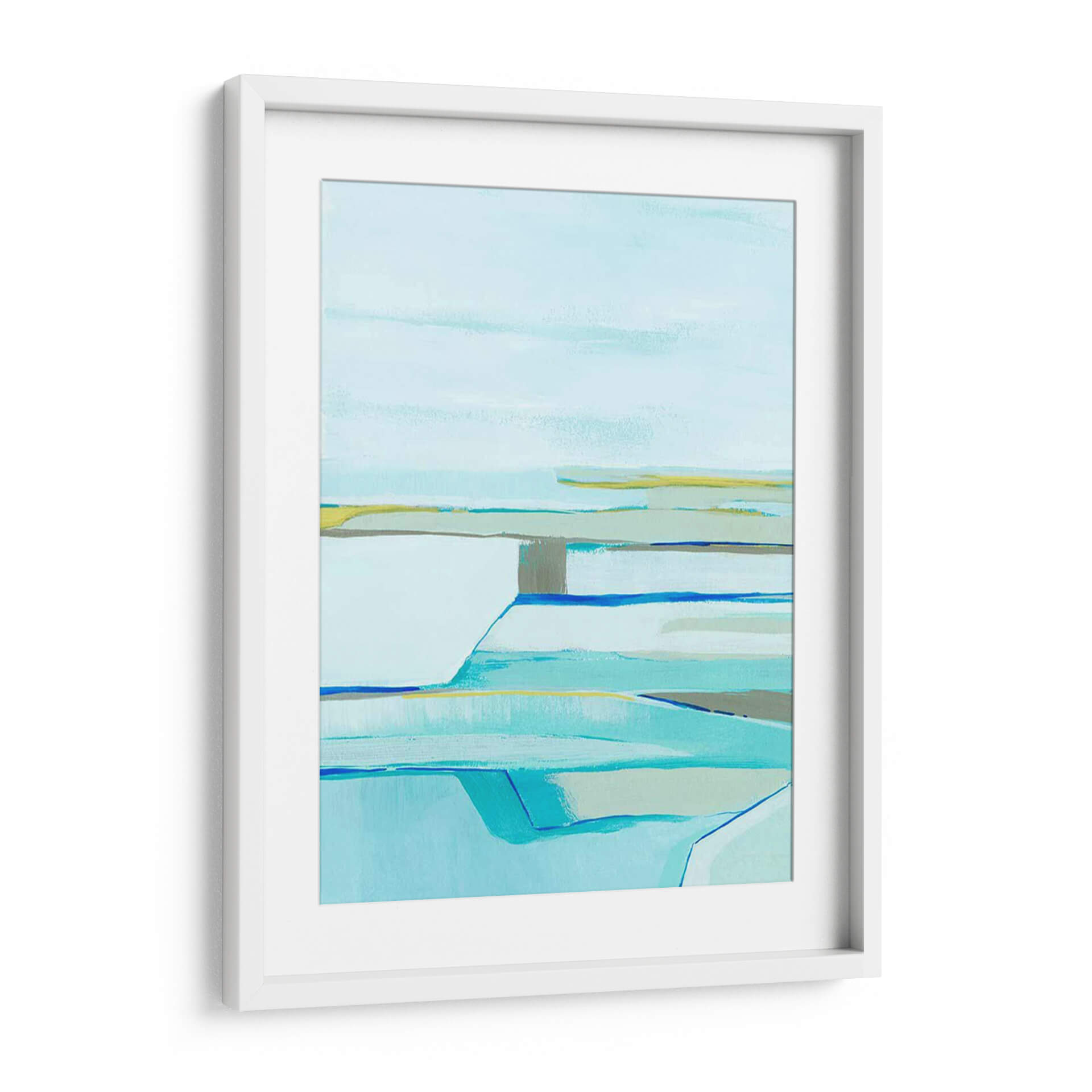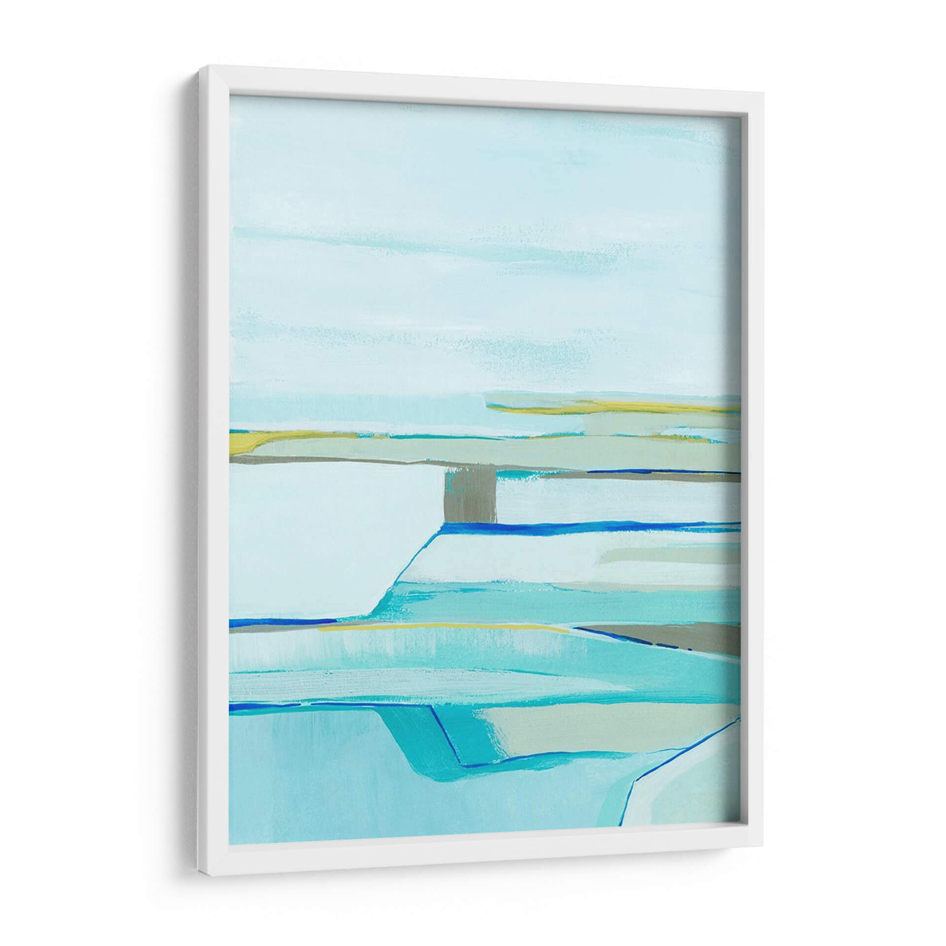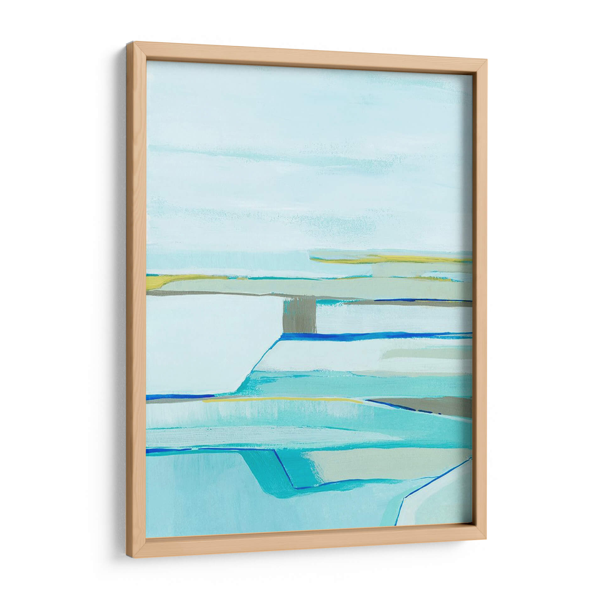 Sumérgete en la serenidad y la abstracción moderna con "Capas De La Gente De Mar Ii", una obra de Grace Popp que evoca la tranquilidad de paisajes costeros estilizados. Las pinceladas fluidas y la paleta de colores suaves, dominada por tonos de azul claro, turquesa, verde agua y toques sutiles de amarillo y gris, crean una atmósfera de calma y contemplación. La composición, con sus líneas horizontales y formas superpuestas, sugiere capas de agua, cielo y tierra, invitando a la interpretación personal y a la relajación visual. Este cuadro decorativo es ideal para transformar cualquier espacio en un oasis de paz, aportando una sensación de amplitud y frescura. Perfecto para salones, dormitorios o estudios que buscan un toque de sofisticación contemporánea y una conexión sutil con la naturaleza. Su estilo abstracto y minimalista lo convierte en una pieza versátil, capaz de complementar una amplia gama de decoraciones, desde las más modernas hasta las escandinavas o costeras. Añade una dimensión de serenidad y arte refinado a tu hogar con esta pieza cautivadora.