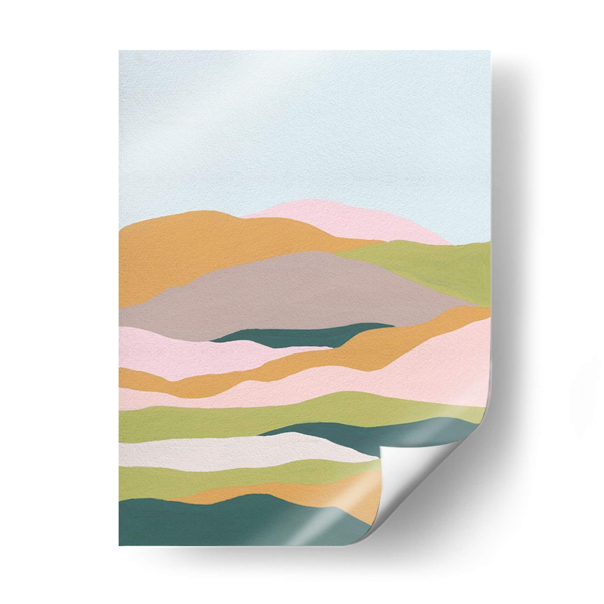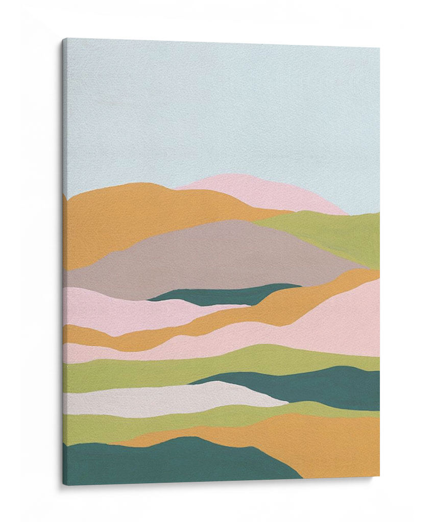 Sumérgete en la serenidad etérea de 'Capas De Nube Ii', una cautivadora obra de arte contemporáneo de Melissa Wang. Esta pieza transporta al espectador a un paisaje onírico, donde suaves colinas se deslizan unas sobre otras bajo un cielo sereno. La paleta de colores, dominada por tonos pastel y terrosos como el rosa pálido, verde menta, ocre suave y gris piedra, crea una atmósfera de calma y contemplación. Las formas orgánicas y fluidas, dispuestas en capas horizontales, evocan la sensación de las nubes flotando o las ondulaciones de la tierra vista desde la altura. El estilo minimalista y la composición depurada invitan a la introspección, haciendo de este cuadro decorativo una adición perfecta para espacios que buscan transmitir paz y armonía. Ideal para dormitorios, salas de estar o estudios, 'Capas De Nube Ii' añade un toque de sofisticación sutil y una conexión con la naturaleza que inspira tranquilidad. Es una pieza versátil que complementa decoraciones modernas, escandinavas o bohemias, aportando un elemento visualmente relajante y estéticamente refinado a cualquier ambiente.