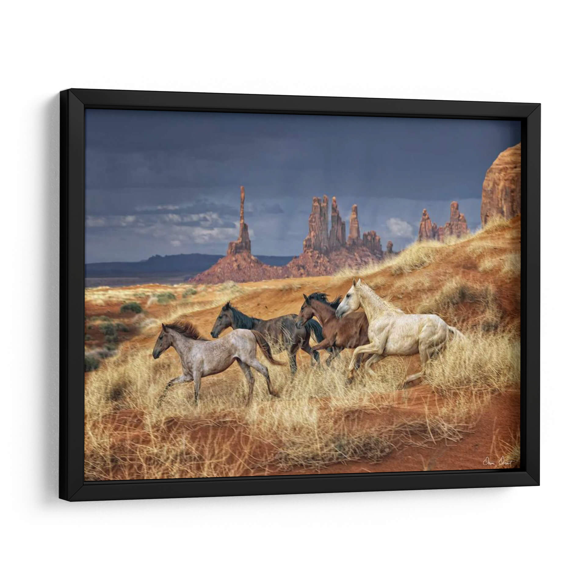 Captura la fuerza indómita y la belleza salvaje del oeste americano con el cuadro decorativo "Carrera Monumental" de David Drost. Esta obra maestra visual presenta un grupo de caballos salvajes galopando a través de un paisaje árido y majestuoso, evocando una sensación de libertad y poder. La paleta de colores, dominada por tonos tierra, ocres y el dramático contraste de un cielo tormentoso, crea una atmósfera potente y a la vez serena. Las formaciones rocosas monumentales al fondo añaden una escala épica, sugiriendo la vastedad y el espíritu indomable de la naturaleza. El movimiento dinámico de los caballos, capturado con maestría, transmite energía y vitalidad, convirtiendo esta pieza en un punto focal cautivador para cualquier espacio. Ideal para salas de estar, estudios u oficinas que buscan infundir un sentido de aventura, conexión con la naturaleza o una estética rústica y potente. "Carrera Monumental" no es solo una decoración de pared, es una invitación a sentir la libertad y la majestuosidad del espíritu salvaje. Añade esta pieza a tu colección y transforma tu hogar en un santuario de arte inspirador.
