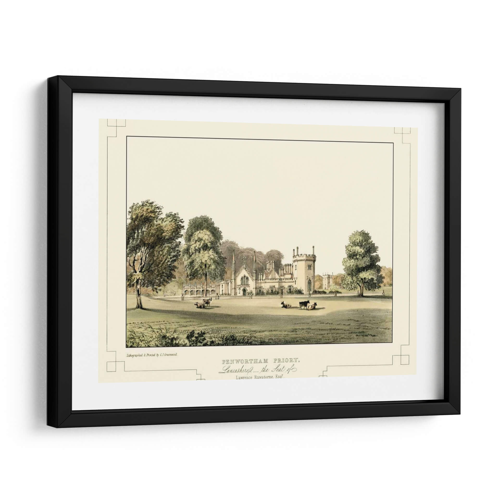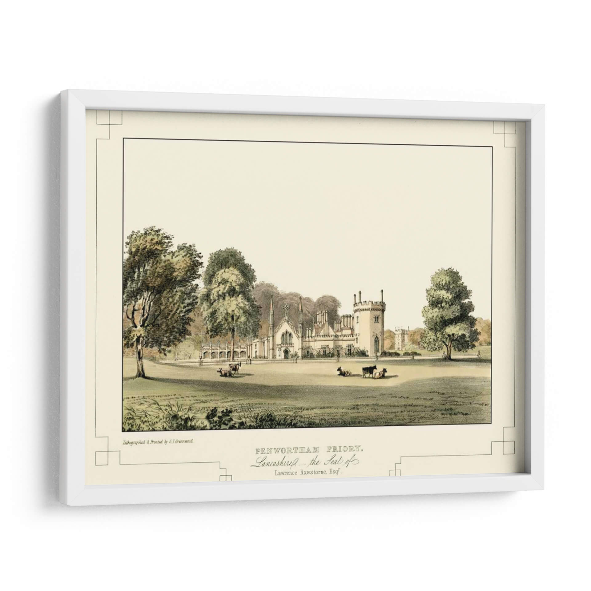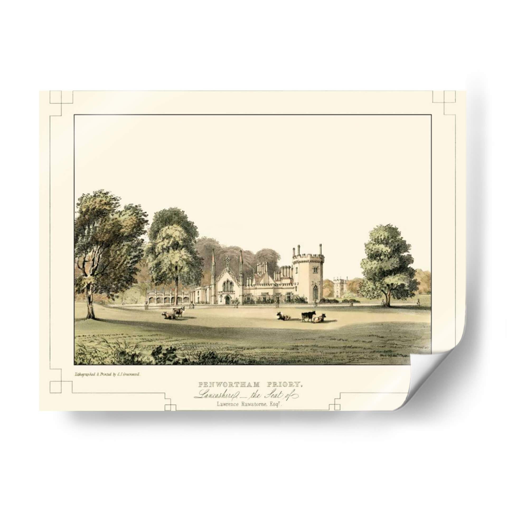 Sumérgete en la serenidad y el encanto histórico con "Castillos de Lancashire III", una exquisita obra de arte que captura la majestuosidad de una época pasada. C.J. Greenwood nos transporta a través de una escena pastoral idílica, donde la arquitectura imponente de Penwortham Priory se alza rodeada de exuberante vegetación y apacibles animales pastando. La paleta de colores, dominada por tonos tierra, verdes y sutiles toques de beige, crea una atmósfera de calma y atemporalidad. Los detalles finos de la litografía, desde la textura de los árboles hasta las delicadas líneas de la arquitectura, invitan a una contemplación profunda. Este cuadro decorativo es perfecto para añadir un toque de elegancia clásica y un aire de tranquilidad a tu salón, estudio u oficina. Su composición equilibrada y su temática histórica lo convierten en una pieza versátil, capaz de complementar tanto decoraciones tradicionales como espacios que buscan un contraste con elementos contemporáneos. "Castillos de Lancashire III" no es solo una imagen, es una ventana a la historia y un refugio visual que aporta sofisticación y paz a cualquier ambiente.