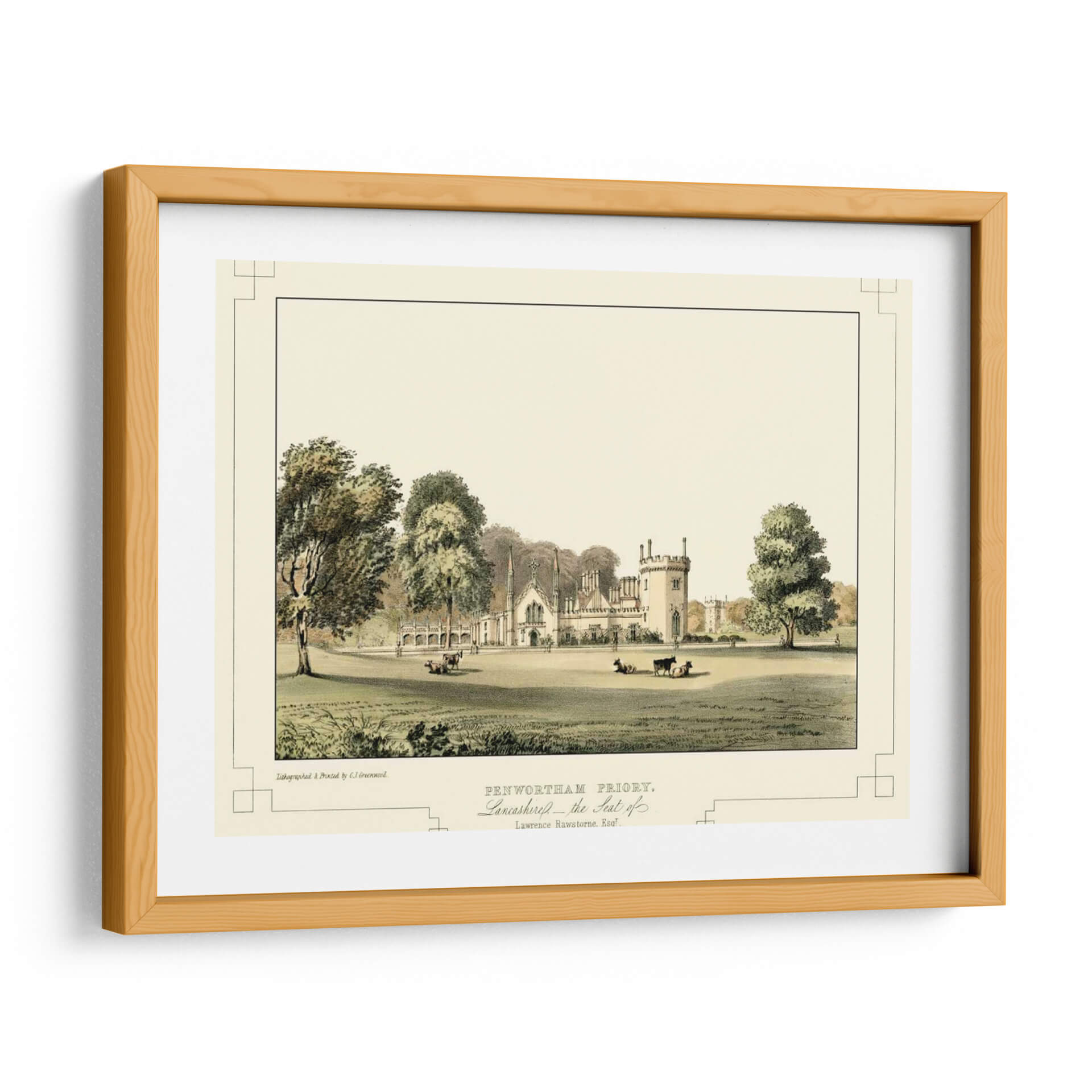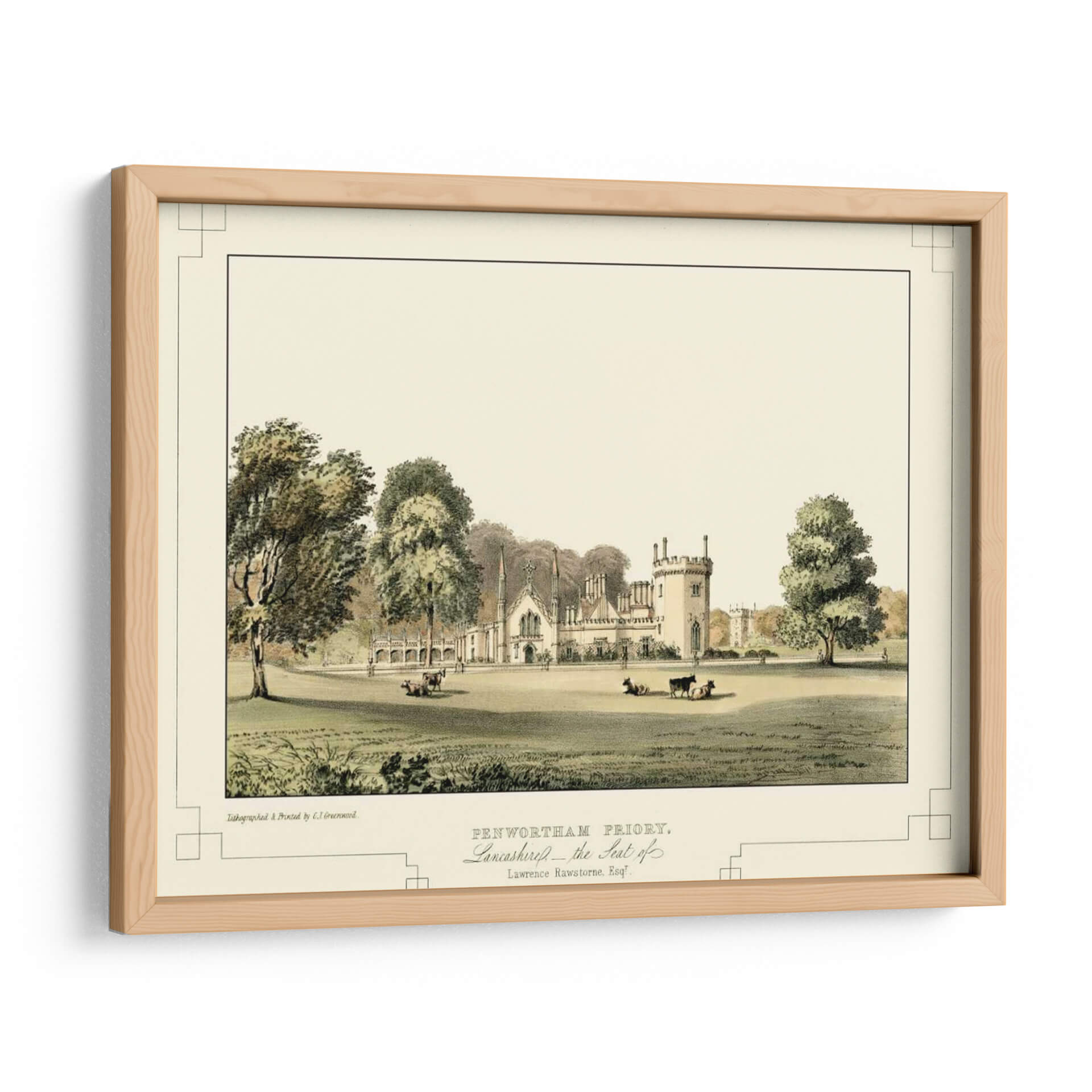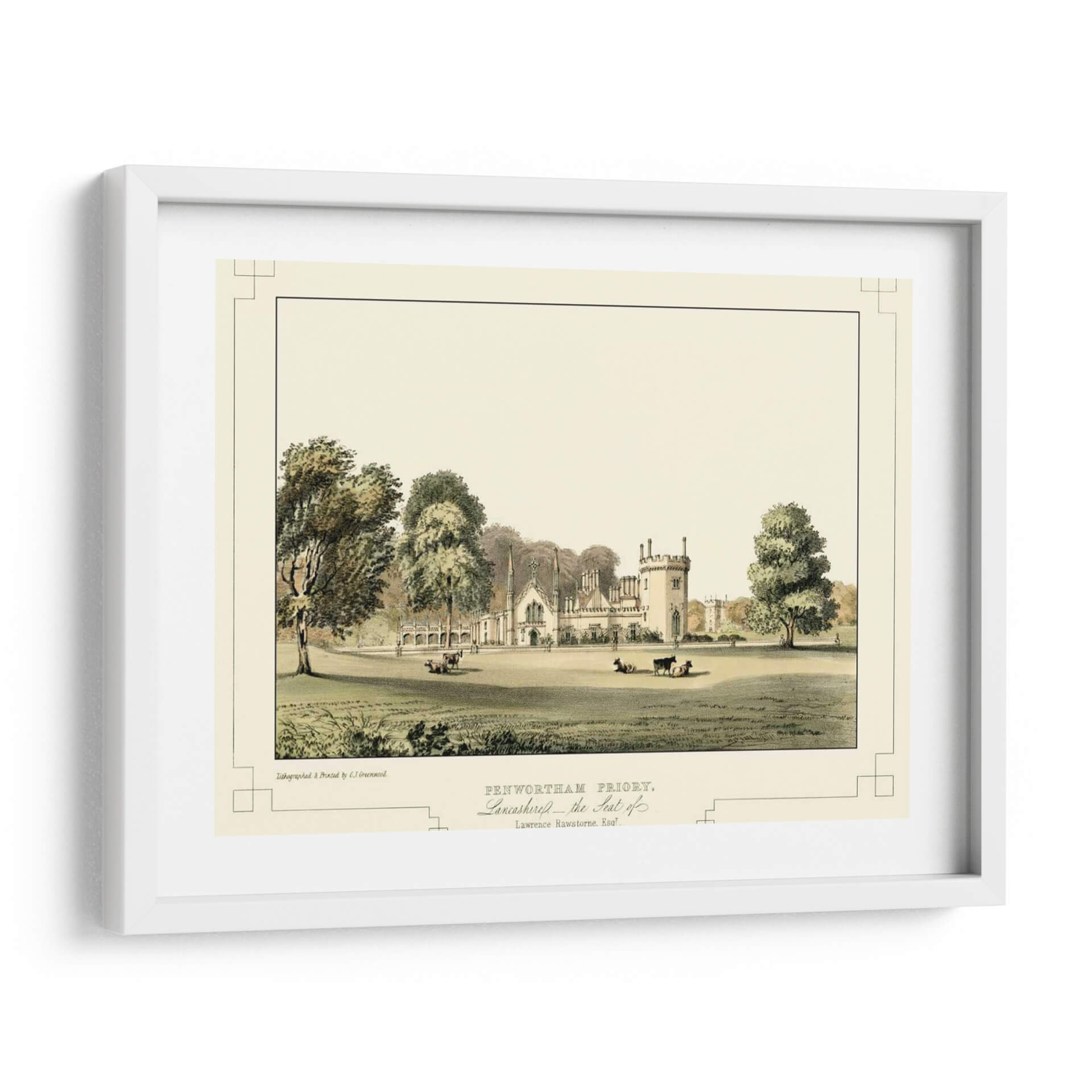 Sumérgete en la serenidad y el encanto histórico con "Castillos de Lancashire III", una exquisita obra de arte que captura la majestuosidad de una época pasada. C.J. Greenwood nos transporta a través de una escena pastoral idílica, donde la arquitectura imponente de Penwortham Priory se alza rodeada de exuberante vegetación y apacibles animales pastando. La paleta de colores, dominada por tonos tierra, verdes y sutiles toques de beige, crea una atmósfera de calma y atemporalidad. Los detalles finos de la litografía, desde la textura de los árboles hasta las delicadas líneas de la arquitectura, invitan a una contemplación profunda. Este cuadro decorativo es perfecto para añadir un toque de elegancia clásica y un aire de tranquilidad a tu salón, estudio u oficina. Su composición equilibrada y su temática histórica lo convierten en una pieza versátil, capaz de complementar tanto decoraciones tradicionales como espacios que buscan un contraste con elementos contemporáneos. "Castillos de Lancashire III" no es solo una imagen, es una ventana a la historia y un refugio visual que aporta sofisticación y paz a cualquier ambiente.