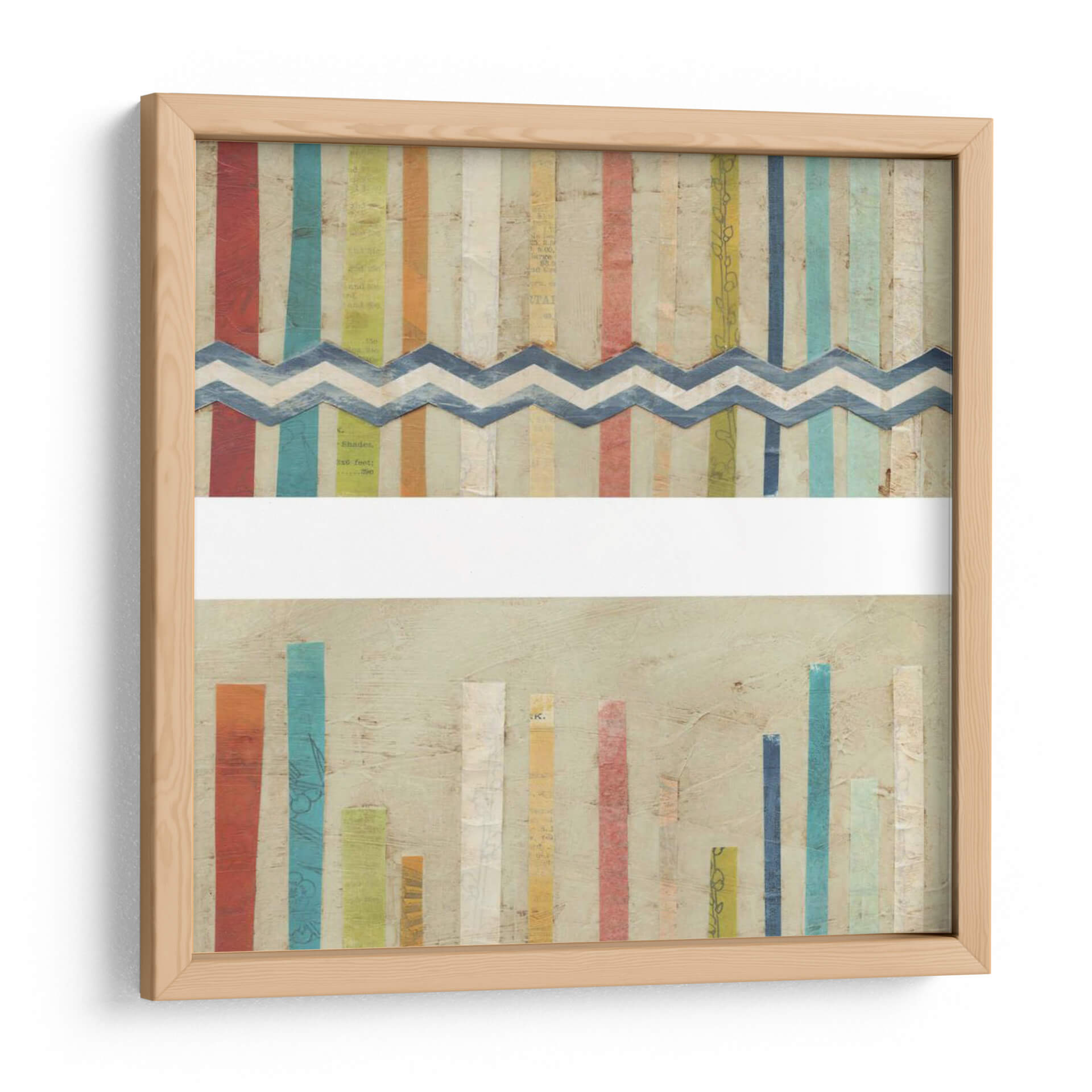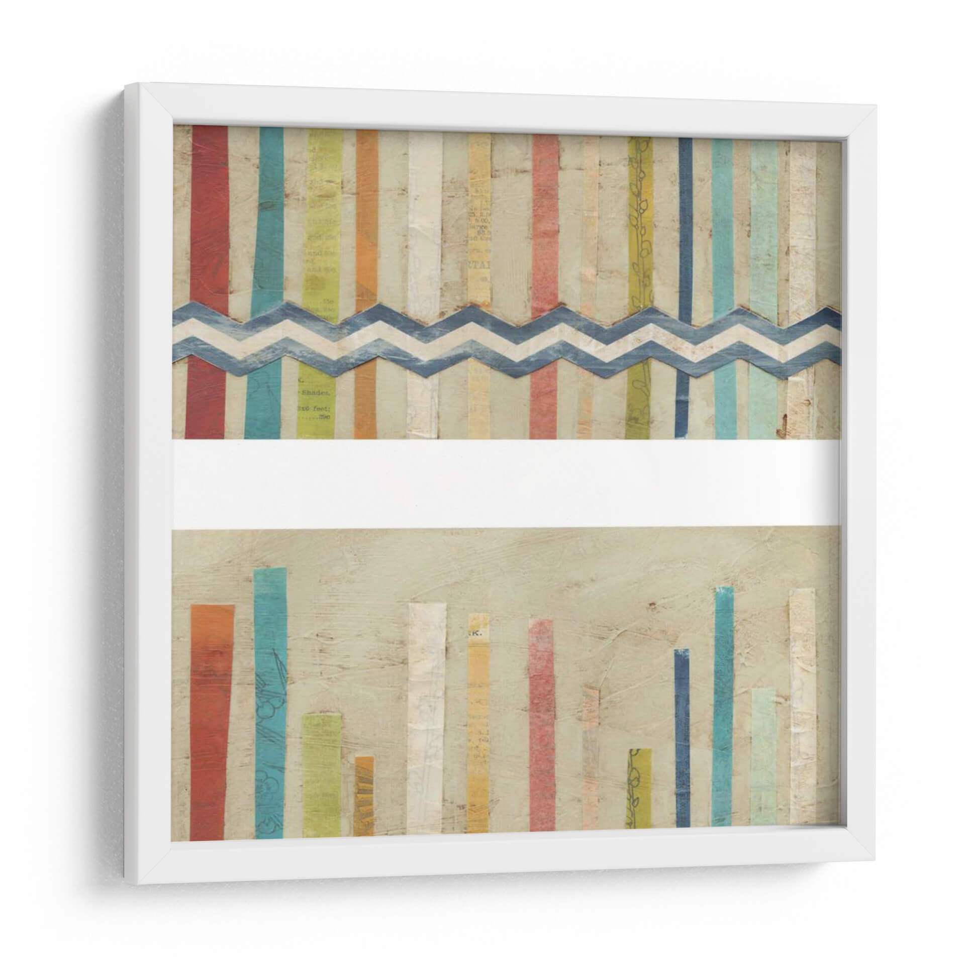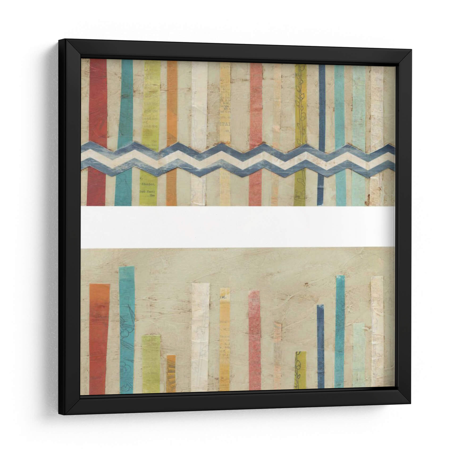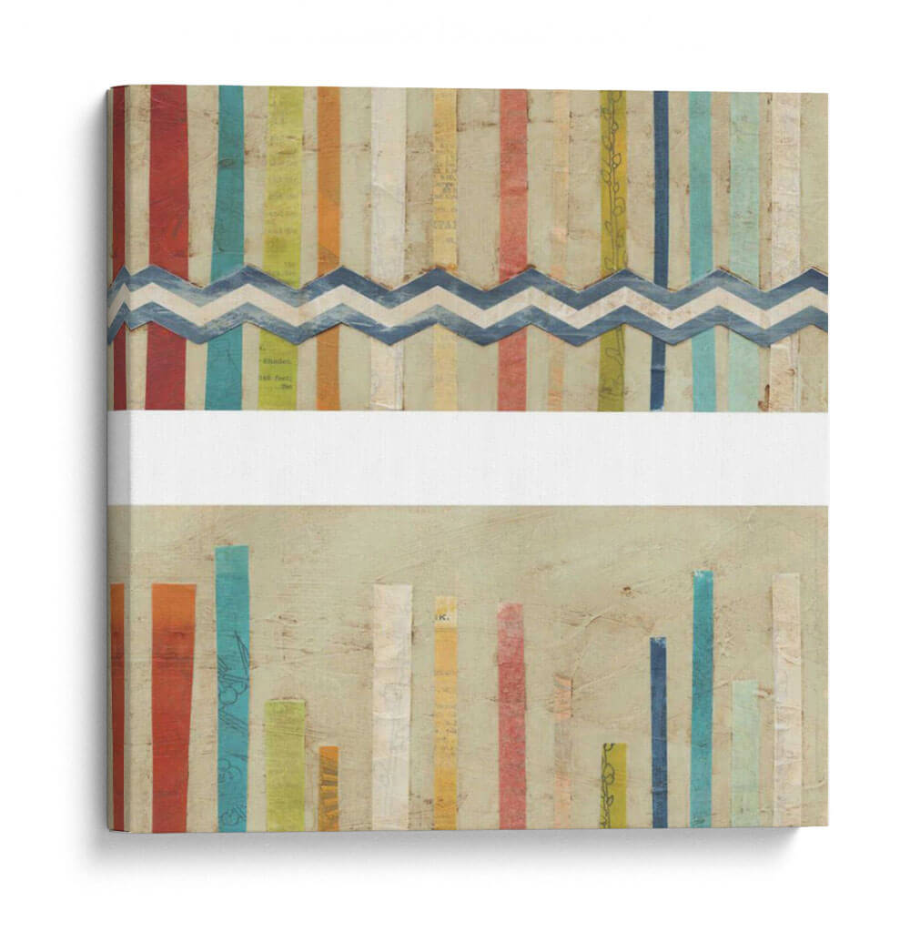 Sumérgete en la vibrante y texturizada obra de arte 'Cercas De Papel 2-Up I' de June Erica Vess, un cuadro decorativo que combina la frescura del estilo contemporáneo con un toque artesanal. Esta pieza cautiva con su composición única, dividida visualmente por una franja de zigzag en azul sobre un fondo de tiras verticales de colores. Los colores primarios y secundarios, como el rojo, azul, amarillo y verde, se entrelazan con tonos pastel y texturas de papel, creando una sensación de energía lúdica y orden. En la parte inferior, un conjunto de barras verticales de diferentes alturas y colores sobre un fondo neutro evoca un sentido de crecimiento o progreso. La obra es ideal para espacios que buscan un acento de color y carácter, como salas de estar modernas, estudios creativos u oficinas que deseen inspirar dinamismo. 'Cercas De Papel 2-Up I' no es solo una decoración, es una invitación a la interpretación visual, añadiendo profundidad y estilo a cualquier ambiente, y reflejando una estética moderna y optimista. Transforma tu hogar con este lienzo que habla de textura, color y composición.