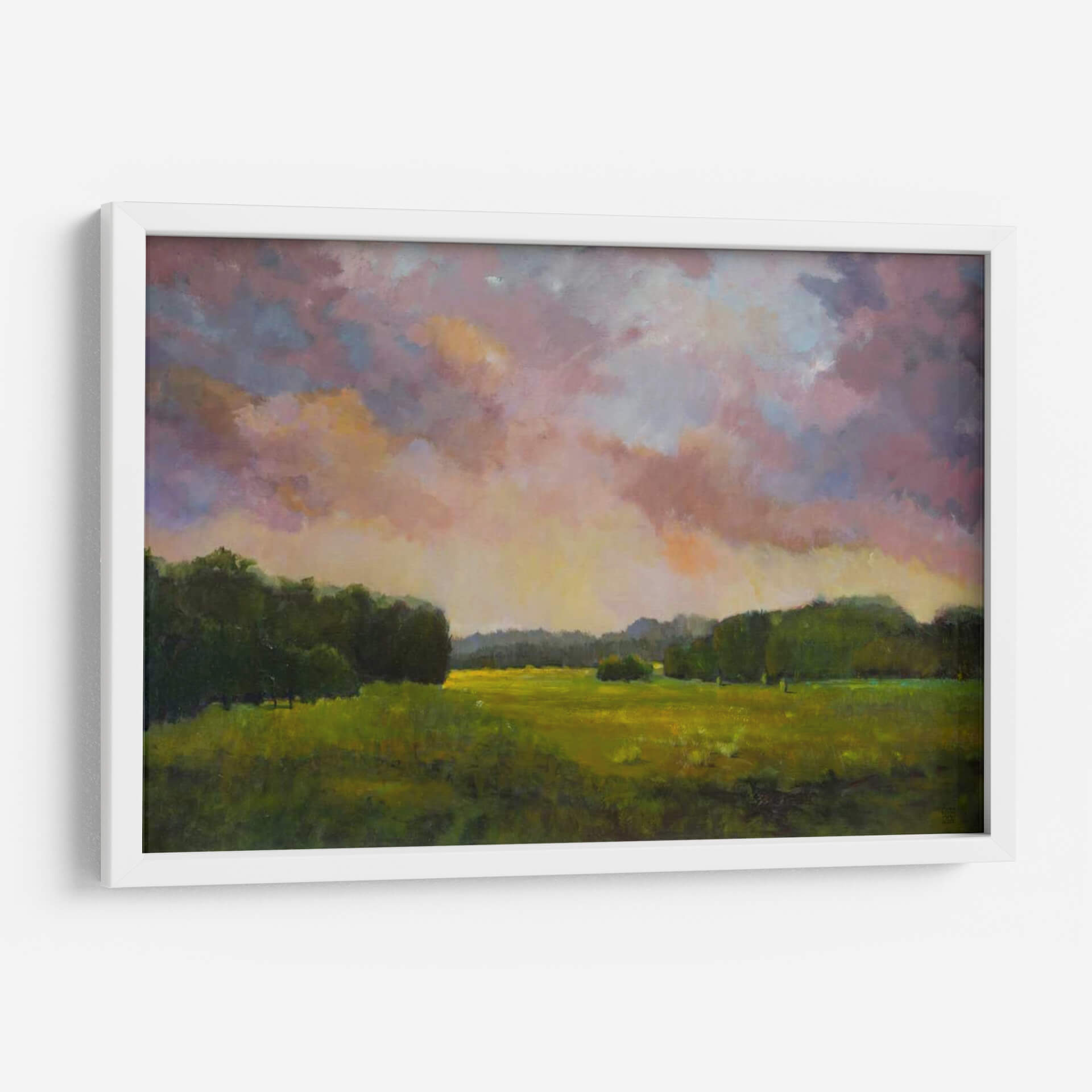 Sumérgete en la serenidad y el asombro con "Cielo Mágico", una obra de arte cautivadora de Judith DAgostino. Este cuadro decorativo transporta al espectador a un paisaje etéreo, donde un campo verde vibrante se extiende bajo un cielo dramático y lleno de nubes. La paleta de colores, que combina tonos verdes profundos y terrosos en el primer plano con suaves rosas, violetas y dorados en las nubes, crea una atmósfera de ensueño y tranquilidad. La técnica pictórica sugiere un estilo impresionista o postimpresionista, con pinceladas visibles que aportan textura y vida a la escena, capturando la luz de manera magistral. La composición, con la línea del horizonte baja y el cielo expansivo, invita a la contemplación y a la evasión. "Cielo Mágico" es ideal para añadir un toque de naturaleza sublime y paz a cualquier espacio, ya sea un salón moderno, un dormitorio acogedor o una oficina que busque inspiración. Este cuadro decorativo no es solo una pieza de arte, sino una ventana a un momento de pura belleza natural, perfecto para quienes buscan infundir calma y sofisticación en su hogar u oficina.