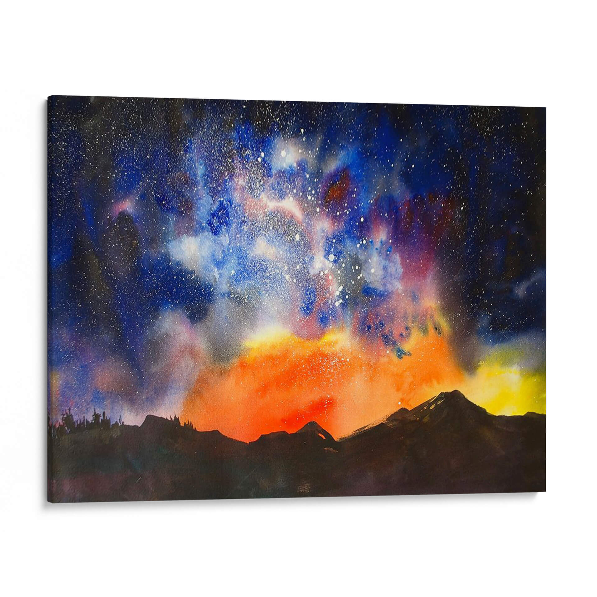 Sumérgete en la inmensidad del universo con "Cielo Nocturno Vi", una obra de arte que captura la majestuosidad del cosmos sobre un paisaje montañoso siluetado. La técnica de acuarela de Scherrer Finch da vida a una explosión de colores vibrantes, donde profundos azules y púrpuras del cielo nocturno se entrelazan con dramáticos tonos anaranjados y amarillos del amanecer o un evento cósmico. Miles de estrellas salpican la oscuridad, creando una sensación de asombro y maravilla. La base oscura y definida de las montañas proporciona un ancla terrenal a la etérea representación celestial, creando un contraste cautivador. Este cuadro decorativo es ideal para añadir un toque de misterio y serenidad a tu sala de estar, dormitorio u oficina, invitando a la contemplación y la inspiración. Transforma cualquier espacio en un portal hacia lo desconocido, donde la belleza natural del universo se despliega en todo su esplendor. Una pieza perfecta para los amantes de la astronomía, la naturaleza y el arte abstracto que evoca emociones profundas y un sentido de conexión cósmica. Añade este toque celestial a tu decoración y deja que tu imaginación vuele entre galaxias.