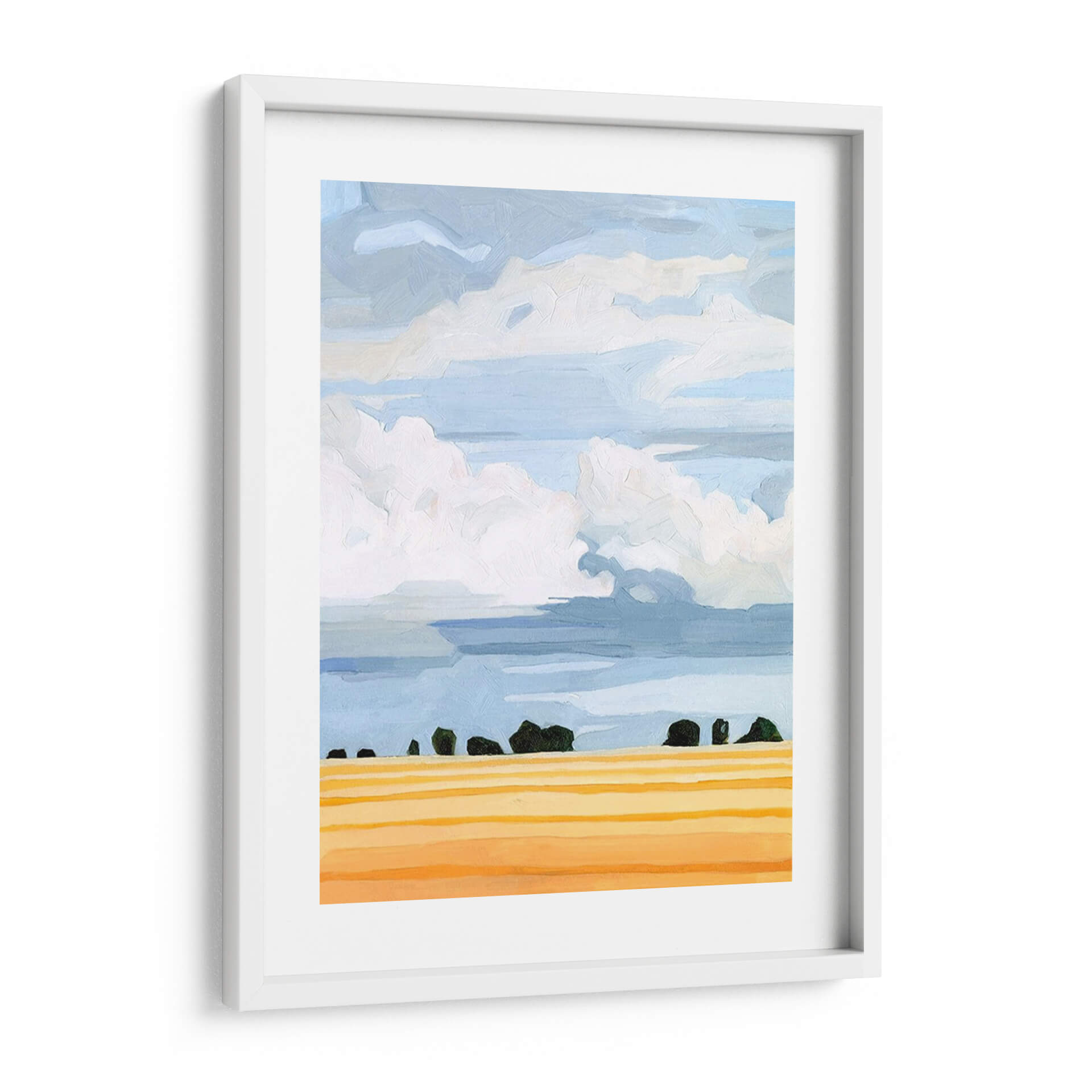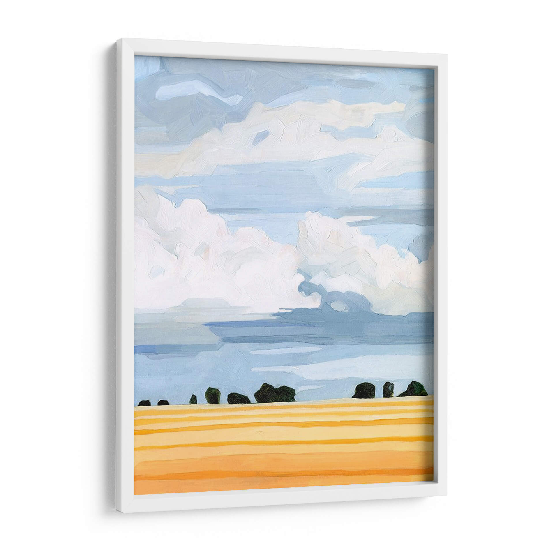 Sumérgete en la serenidad de "Cloudscape Pale Ii", una cautivadora obra de arte contemporáneo de Emma Scarvey. Esta pieza evoca la calma y la vastedad de un paisaje celeste, con un cielo dominado por nubes etéreas y suaves pinceladas que dan forma a formas etéreas. La paleta de colores, que transita del azul pálido del cielo a los cálidos tonos ocres y dorados de un campo maduro, crea una atmósfera de tranquilidad y contemplación. Las formas oscuras y estilizadas de árboles o rocas en el horizonte añaden un sutil contraste y profundidad, invitando a la reflexión. El estilo de Scarvey, caracterizado por su enfoque expresivo y una composición minimalista, permite que la luz y el color jueguen un papel protagonista, generando una sensación de espacio abierto y paz. Este cuadro decorativo es ideal para añadir un toque de serenidad y sofisticación a cualquier estancia, desde un dormitorio acogedor hasta un elegante salón o una oficina que busque inspiración. "Cloudscape Pale Ii" no es solo una pieza de decoración, sino una ventana a un momento de quietud y belleza natural, perfecta para quienes aprecian el arte que calma el espíritu y embellece el hogar con su elegancia atemporal y su evocadora presencia visual.
