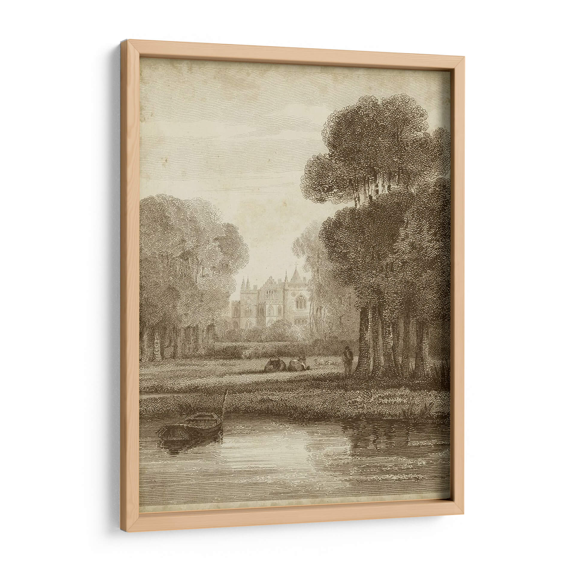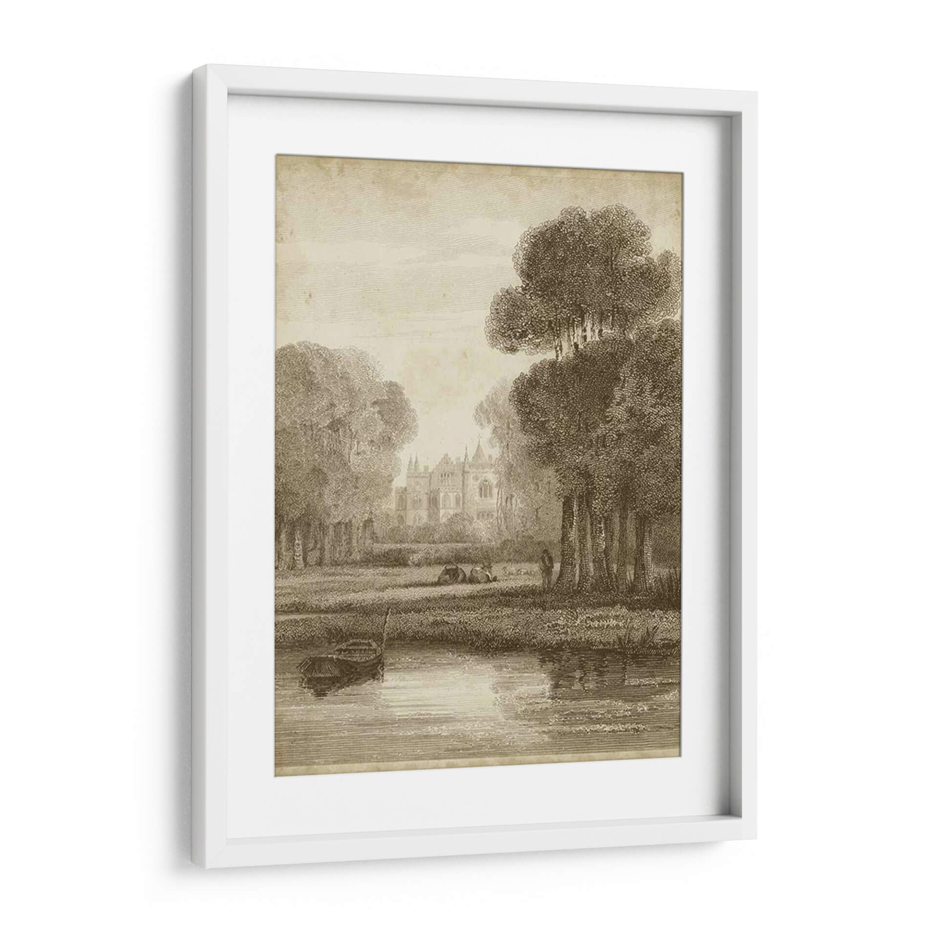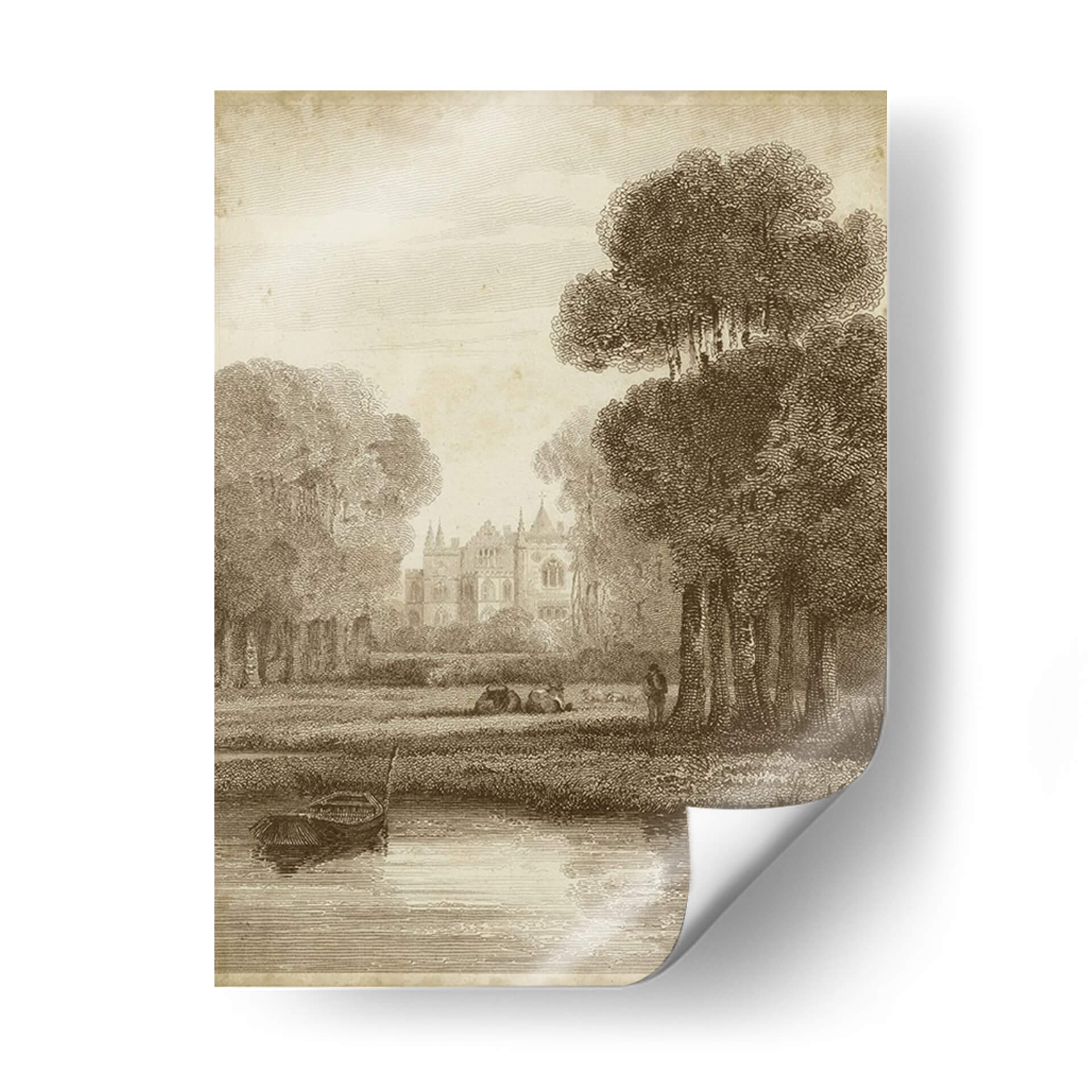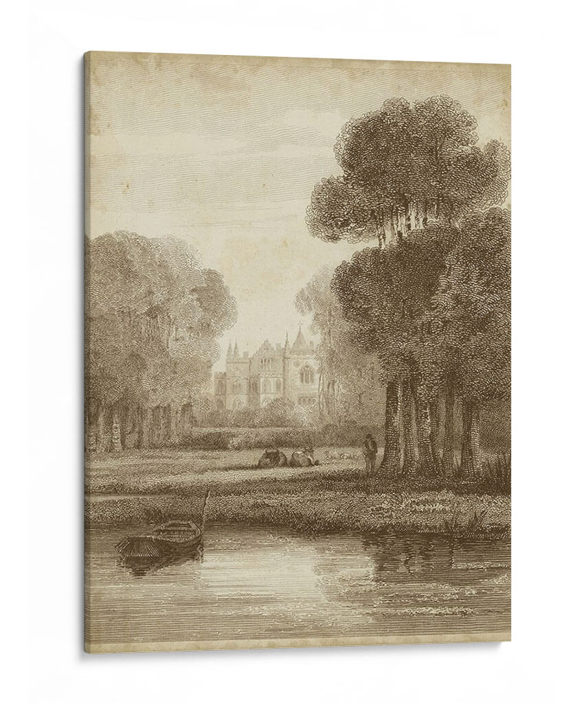 Sumérgete en la serena belleza de "Colina de Fresa", una obra de arte que evoca la tranquilidad de un paisaje campestre clásico. Esta pieza, con su detallada representación de una escena bucólica, transporta al espectador a un momento de paz y contemplación. La composición presenta una majestuosa arquitectura en la distancia, rodeada de exuberante vegetación y un apacible cuerpo de agua, donde una pequeña embarcación descansa en la orilla. La paleta de colores sepia y tonos tierra confiere a la obra una atmósfera atemporal y elegante, perfecta para complementar cualquier espacio que busque un toque de sofisticación y calma. Las delicadas líneas y el sombreado meticuloso, característicos del estilo clásico, aportan profundidad y realismo a la escena, invitando a perderse en sus detalles. "Colina de Fresa" es ideal para quienes aprecian el arte tradicional y buscan una pieza decorativa que ofrezca un escape visual del ajetreo diario, aportando un aire de nostalgia y refinamiento a salones, estudios u oficinas. Este cuadro decorativo es una ventana a un mundo de serenidad, ideal para crear un ambiente de relajación y belleza duradera.