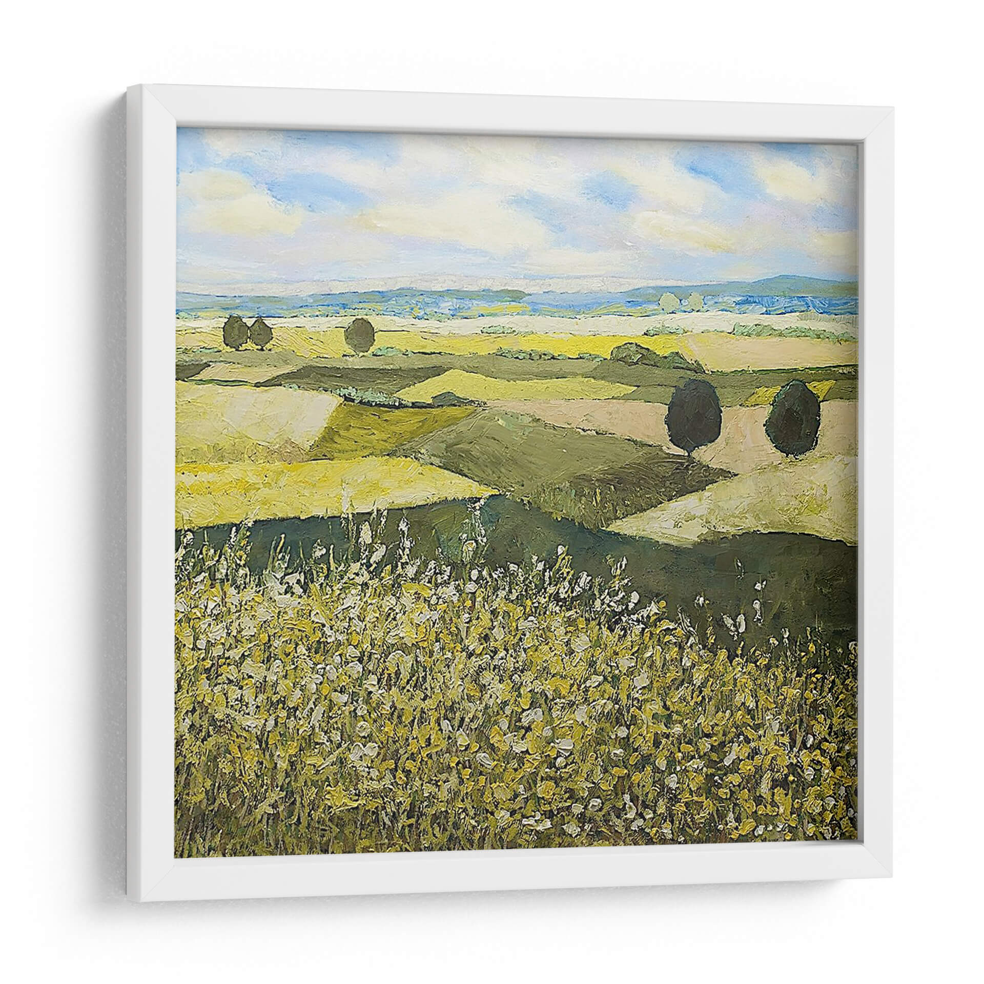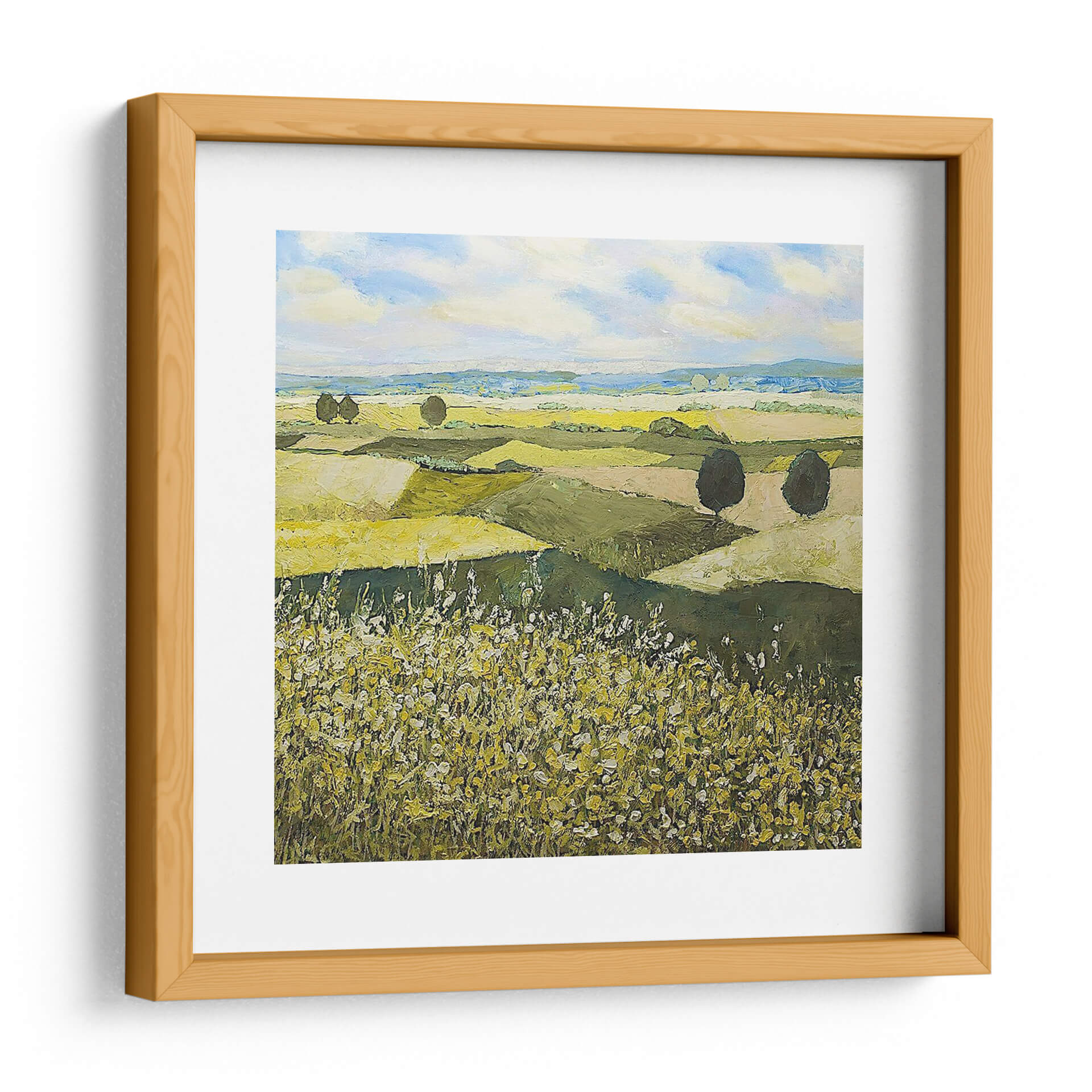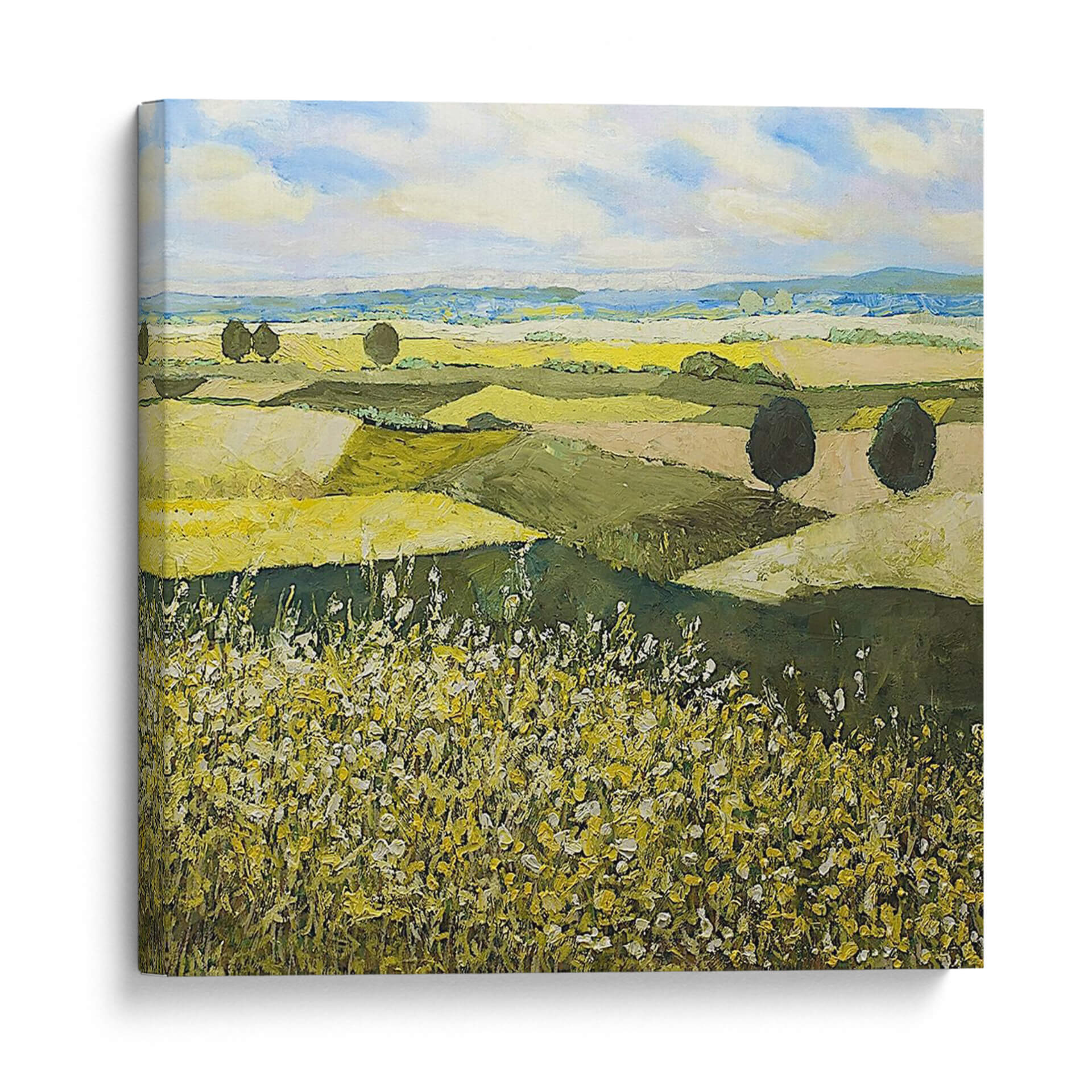 Sumérgete en la serenidad de 'Colinas Verdes', una obra de arte que captura la esencia de un paisaje rural bañado por la luz del sol. Los campos ondulados se extienden hasta el horizonte, divididos por tonos de verde y amarillo que evocan la abundancia de la naturaleza en su máxima expresión. La pincelada audaz y texturizada de Vicki Gladle Bolick da vida a esta escena, aportando una sensación de movimiento y profundidad. Un campo de flores silvestres en primer plano añade un toque de delicadeza y color vibrante, contrastando con las formas más abstractas de las colinas y los árboles solitarios que salpican la distancia. El cielo azul, salpicado de nubes blancas y esponjosas, completa esta visión idílica, invitando a la contemplación y la calma. Este cuadro decorativo es perfecto para cualquier espacio que busque transmitir paz y conexión con la naturaleza, añadiendo un toque de arte contemporáneo y vibrante a tu hogar u oficina. Su paleta de colores cálidos y terrosos lo convierte en una pieza versátil, ideal para salas de estar, dormitorios o estudios.