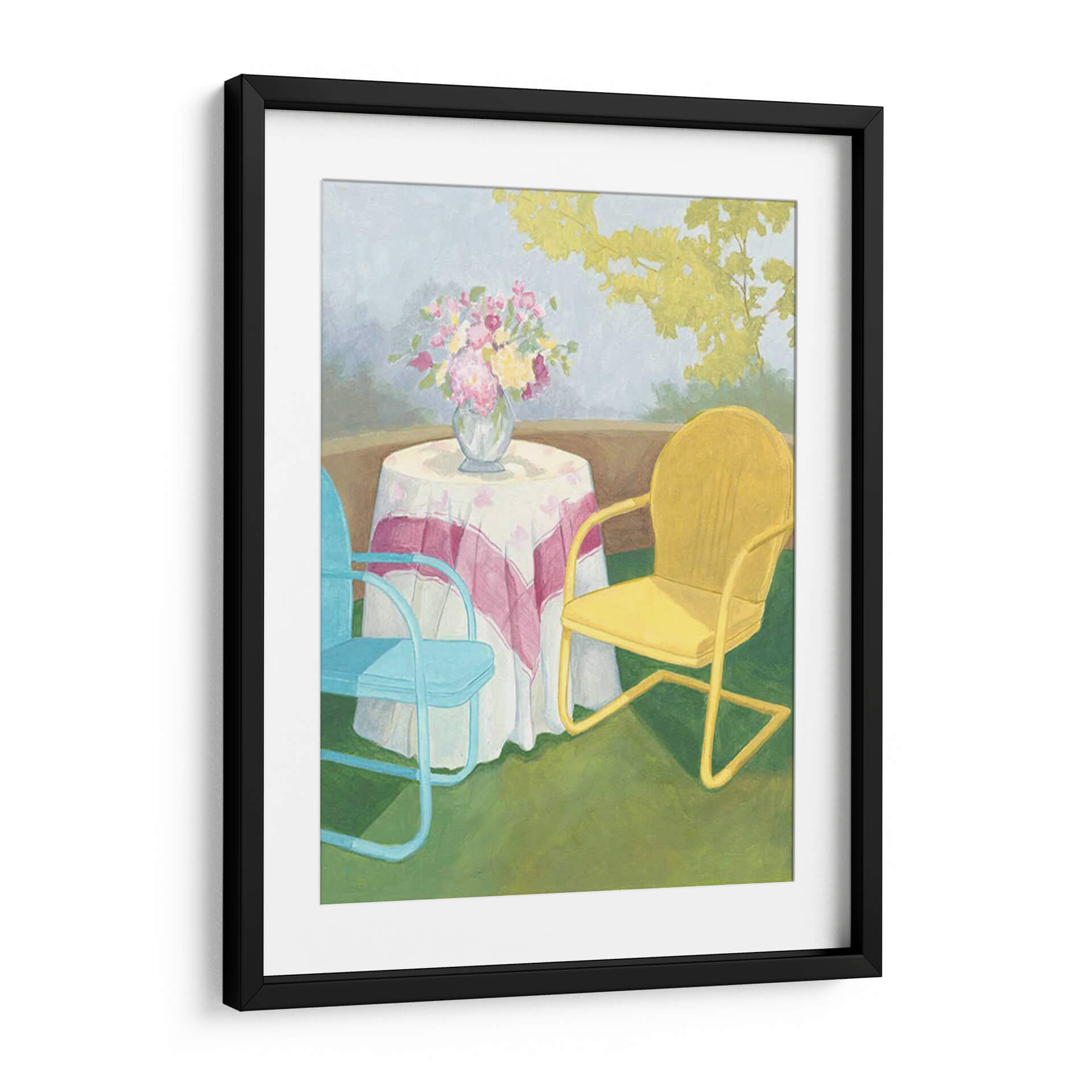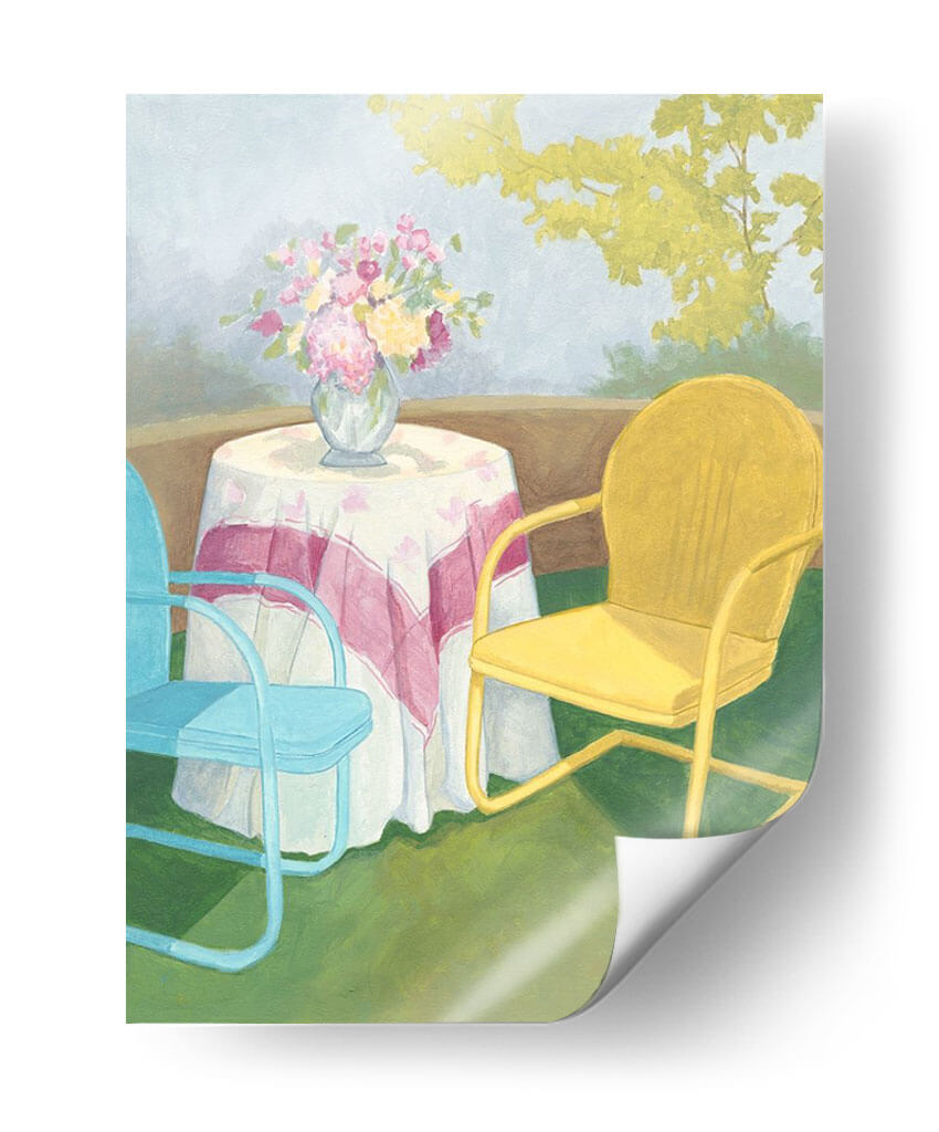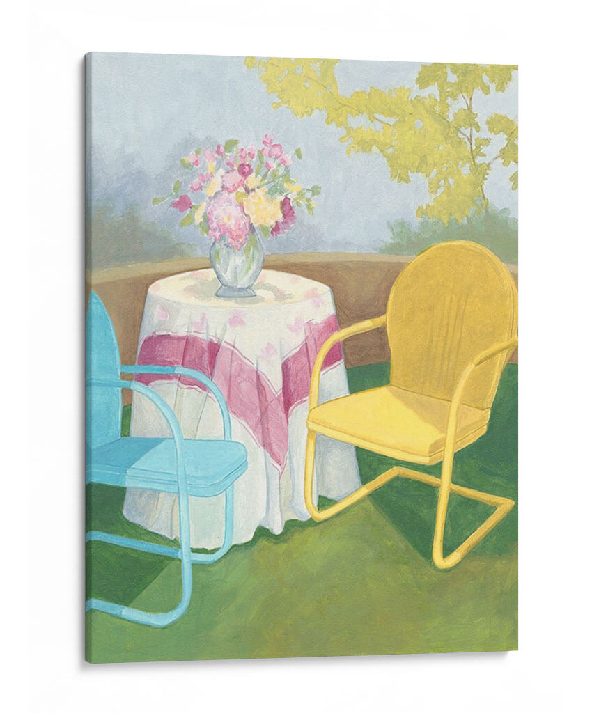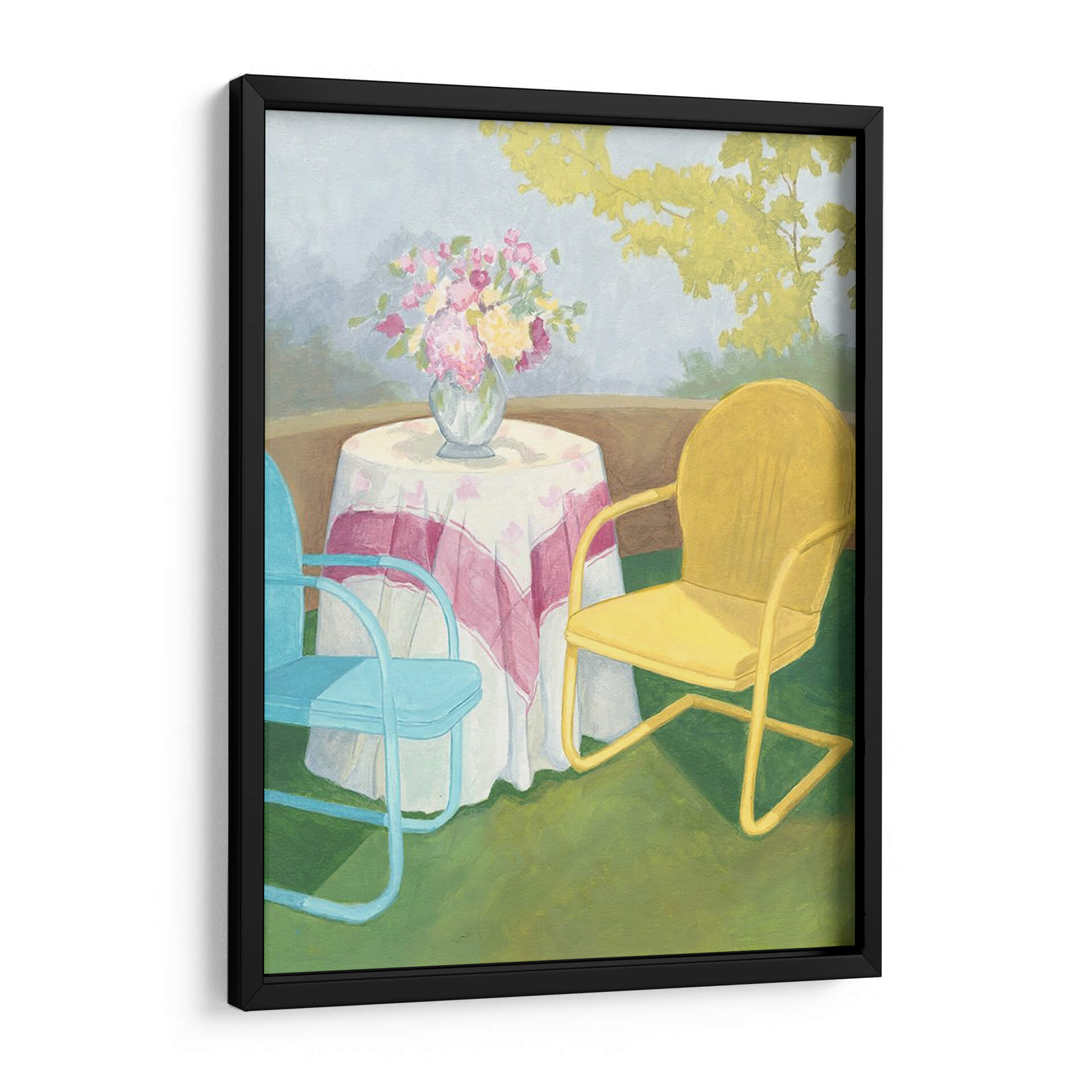 Sumérgete en la serenidad de un encuentro al aire libre con "Conversación de Jardín II", una cautivadora obra de arte de Megan Meagher. Este cuadro decorativo captura la esencia de un momento tranquilo en un jardín, invitando a la contemplación y al disfrute. La pieza presenta un bodegón idílico con un jarrón rebosante de flores coloridas sobre una mesa vestida con un mantel estampado, flanqueada por dos sillas de jardín de vibrantes tonos pastel: una azul sereno y otra amarilla soleada. El suave follaje en tonos otoñales y un cielo apacible enmarcan la escena, creando una atmósfera de calma y calidez. El estilo pictórico, con pinceladas visibles y una paleta de colores armoniosa, evoca una sensación de nostalgia y confort. "Conversación de Jardín II" es ideal para añadir un toque de color y serenidad a tu sala de estar, comedor o un rincón acogedor en tu estudio. Transforma tu espacio en un oasis de tranquilidad y belleza, donde cada mirada te recuerde la simple elegancia de la naturaleza y la alegría de los momentos compartidos. Esta pieza es una invitación a la pausa y a la apreciación de la belleza cotidiana.