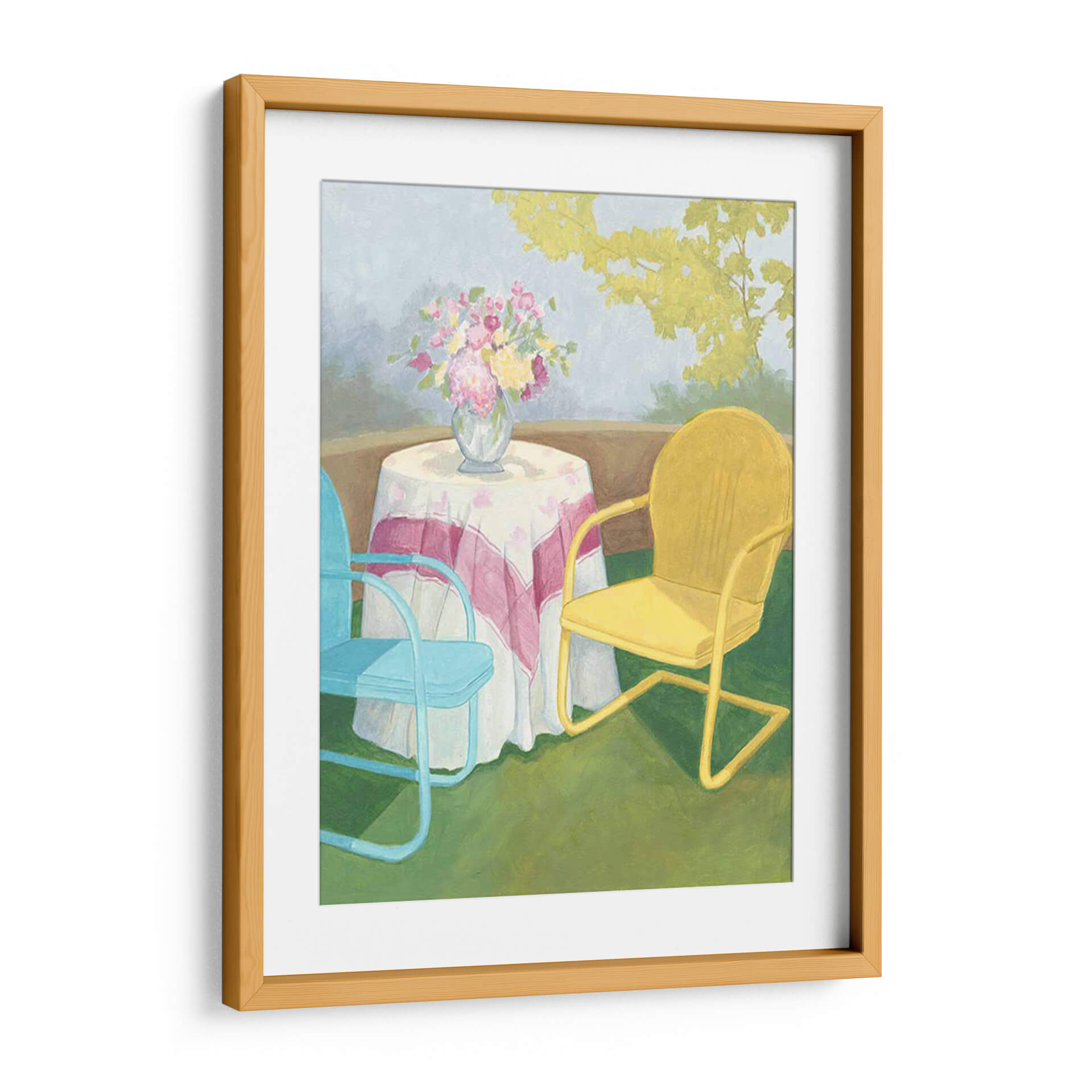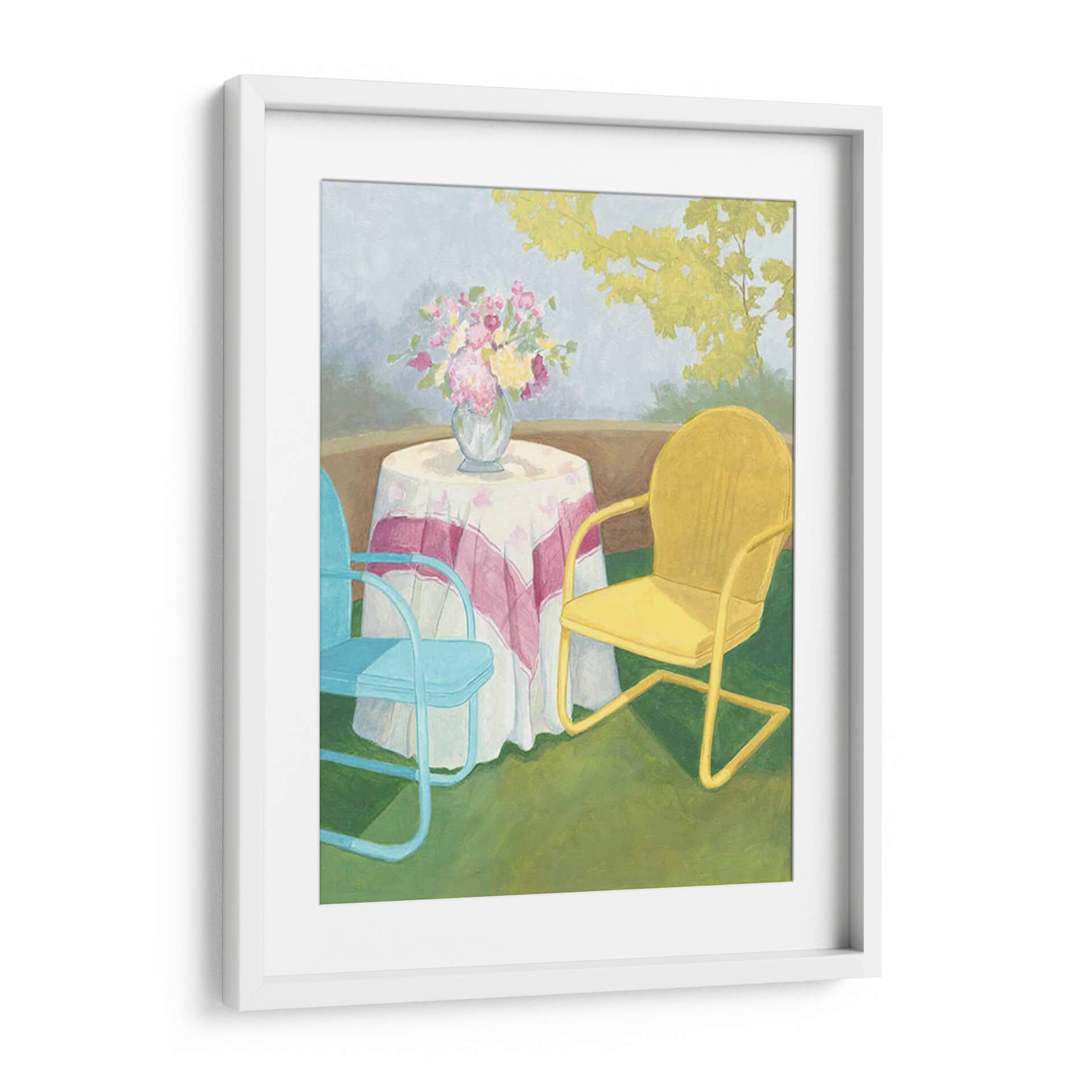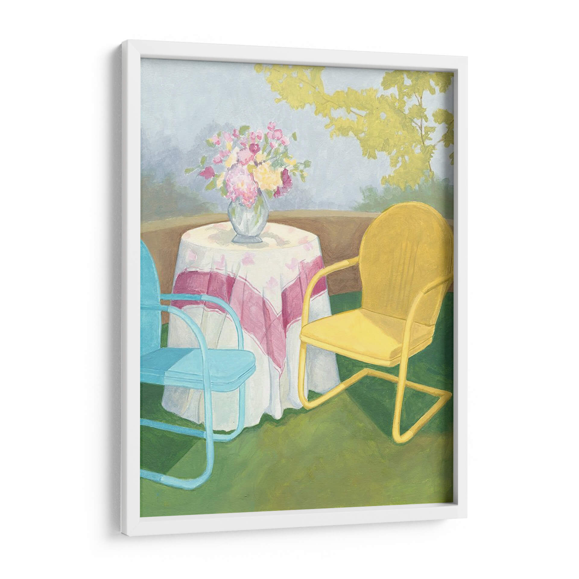 Sumérgete en la serenidad de un encuentro al aire libre con "Conversación de Jardín II", una cautivadora obra de arte de Megan Meagher. Este cuadro decorativo captura la esencia de un momento tranquilo en un jardín, invitando a la contemplación y al disfrute. La pieza presenta un bodegón idílico con un jarrón rebosante de flores coloridas sobre una mesa vestida con un mantel estampado, flanqueada por dos sillas de jardín de vibrantes tonos pastel: una azul sereno y otra amarilla soleada. El suave follaje en tonos otoñales y un cielo apacible enmarcan la escena, creando una atmósfera de calma y calidez. El estilo pictórico, con pinceladas visibles y una paleta de colores armoniosa, evoca una sensación de nostalgia y confort. "Conversación de Jardín II" es ideal para añadir un toque de color y serenidad a tu sala de estar, comedor o un rincón acogedor en tu estudio. Transforma tu espacio en un oasis de tranquilidad y belleza, donde cada mirada te recuerde la simple elegancia de la naturaleza y la alegría de los momentos compartidos. Esta pieza es una invitación a la pausa y a la apreciación de la belleza cotidiana.