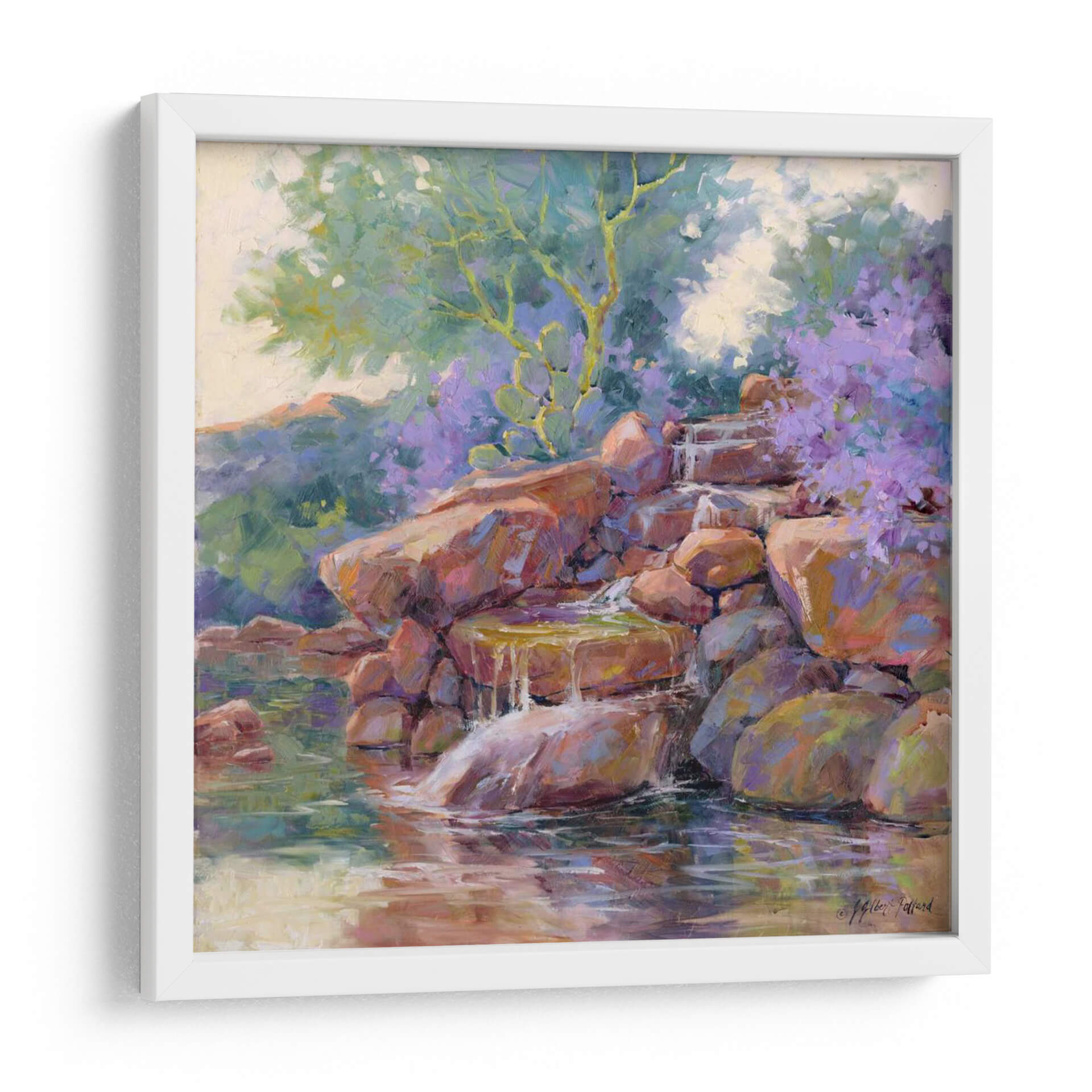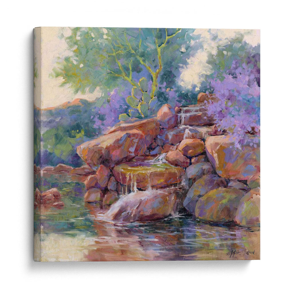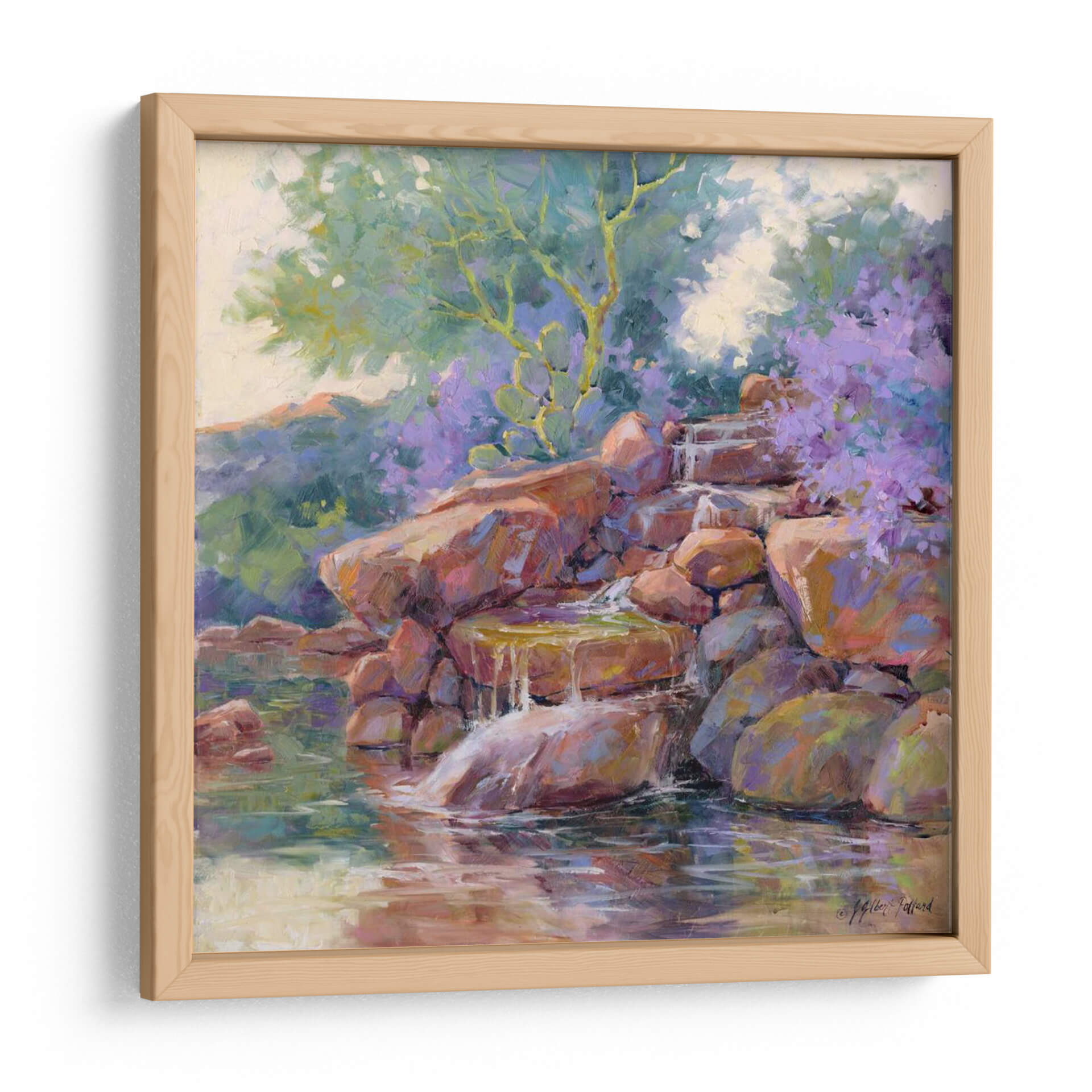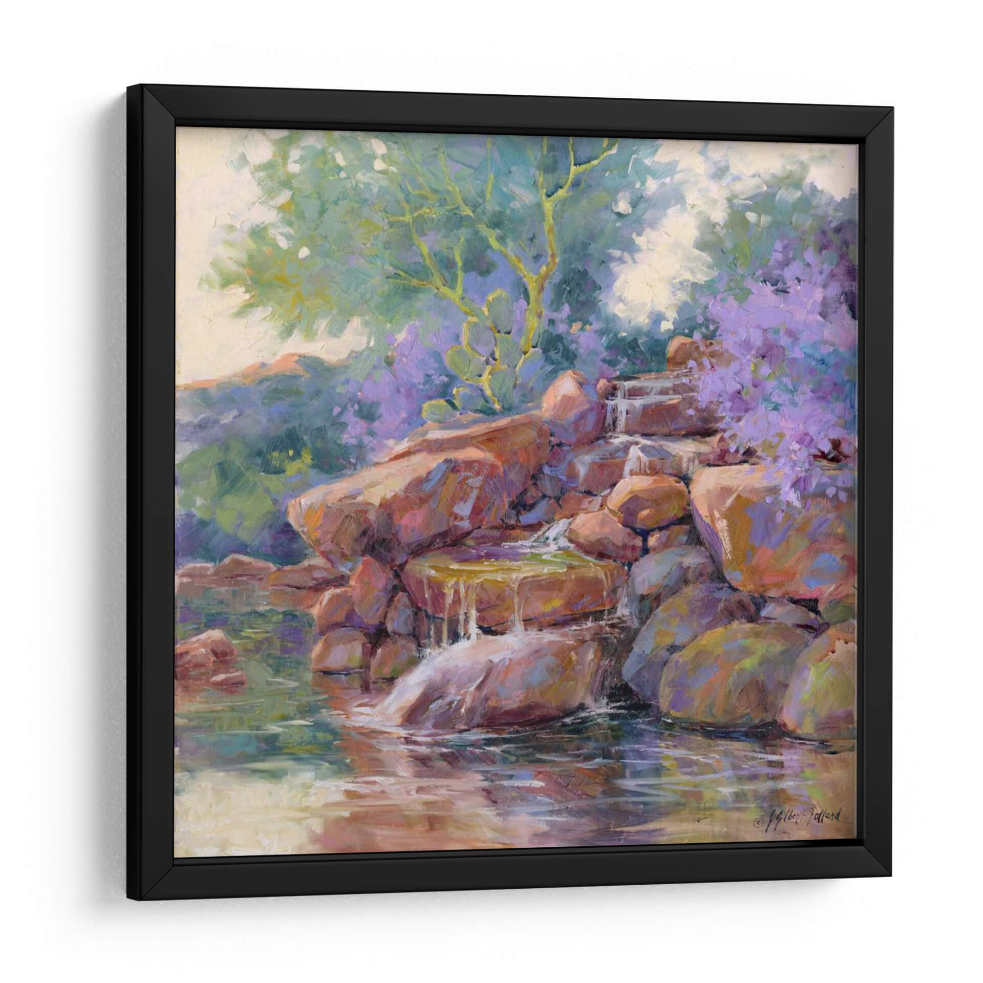 Sumérgete en la serena belleza del paisaje desértico con 'Corriente del Desierto', una cautivadora obra de arte de Julie G. Pollard. Este cuadro decorativo captura la esencia de un oasis escondido, donde rocas de tonos cálidos y rojizos dan forma a una cascada serena que fluye hacia aguas tranquilas. La paleta de colores, rica en tonos tierra, verdes vibrantes y toques de lavanda, evoca una atmósfera de paz y conexión con la naturaleza. El estilo impresionista de Pollard da vida a cada pincelada, sugiriendo la textura de las rocas, la delicadeza de la vegetación y el suave movimiento del agua. La composición, que combina el detalle de la cascada con la amplitud del paisaje de fondo, invita a la contemplación. Ideal para añadir un toque de calidez y tranquilidad a tu salón, dormitorio u oficina, este cuadro decorativo transformará cualquier espacio en un refugio de paz y belleza natural. Deja que la 'Corriente del Desierto' te transporte a un lugar de serenidad y asombro cada día.
