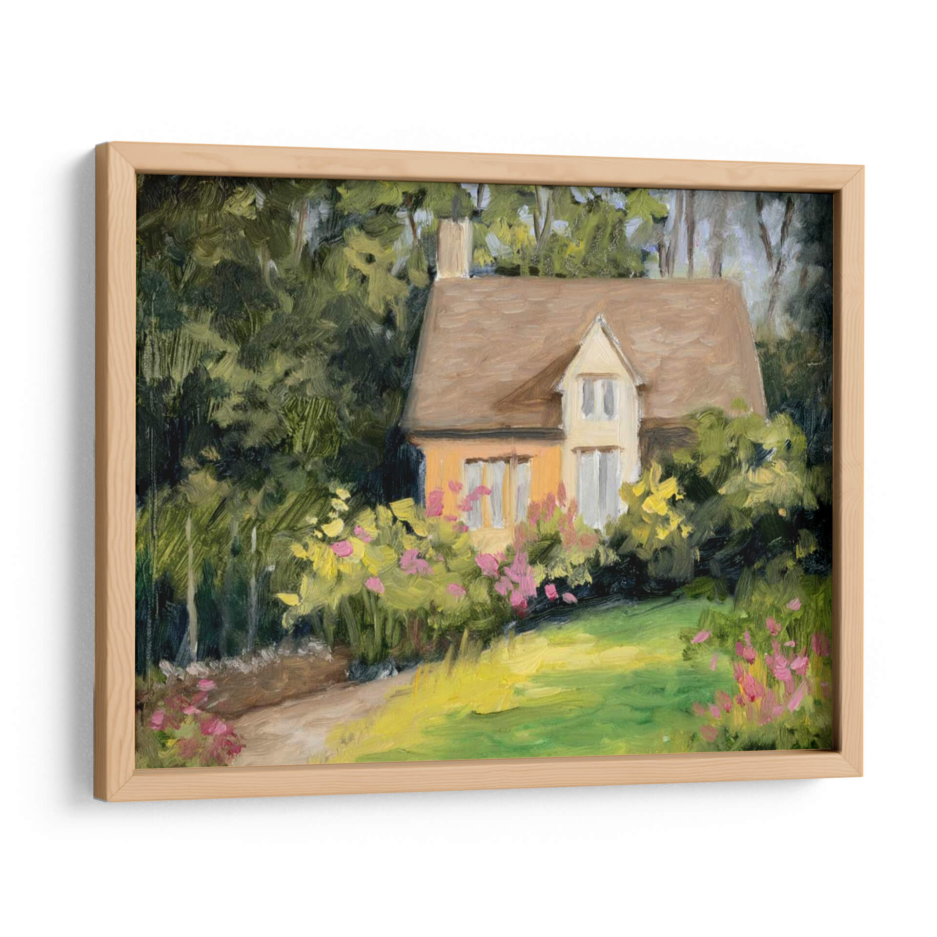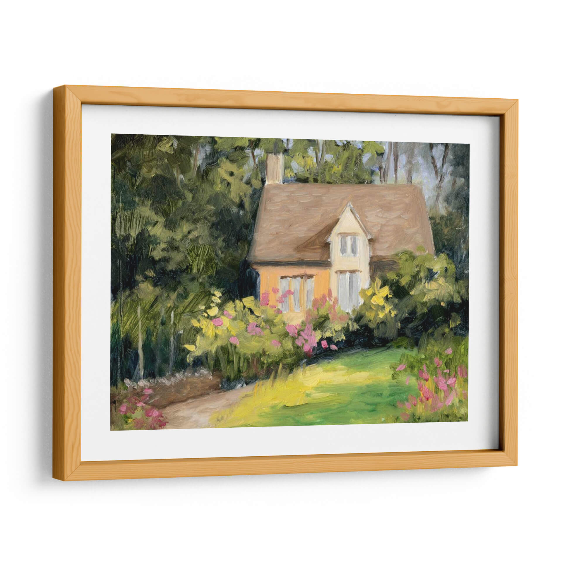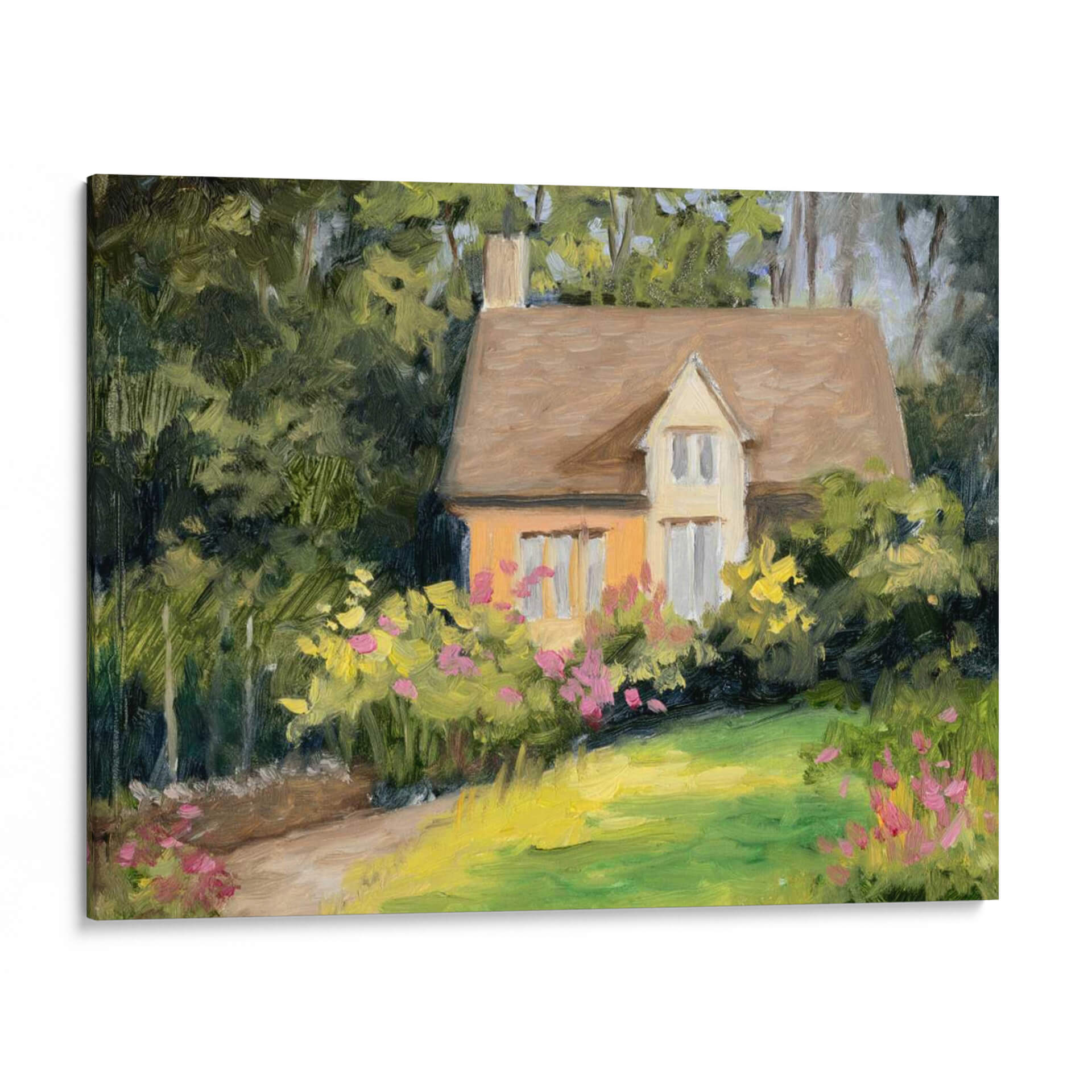 Sumérgete en la serenidad campestre con "Cotswold Cottage III", una obra de arte que captura la esencia de un idílico hogar inglés rodeado de exuberante vegetación. Mary Jean Weber ha pintado con maestría un paisaje donde una acogedora casa de campo se funde con la naturaleza, creando una escena que evoca paz y tranquilidad. La paleta de colores, dominada por tonos tierra cálidos en el tejado y la fachada de la casa, se complementa a la perfección con los verdes vibrantes de los árboles y el césped, salpicados por delicados toques de rosa y amarillo de las flores en primer plano. El estilo pictórico, con pinceladas sueltas y expresivas, confiere a la obra un aire impresionista que invita a la contemplación. Este cuadro decorativo es ideal para añadir un toque de encanto rústico y calidez a tu salón, comedor o dormitorio, transportándote a un refugio de paz cada vez que lo mires. La composición, centrada en la casita y rodeada por la naturaleza, crea un punto focal armonioso que equilibra la escena y atrae la mirada del espectador. "Cotswold Cottage III" es más que una simple decoración; es una ventana a un mundo de calma y belleza natural.
