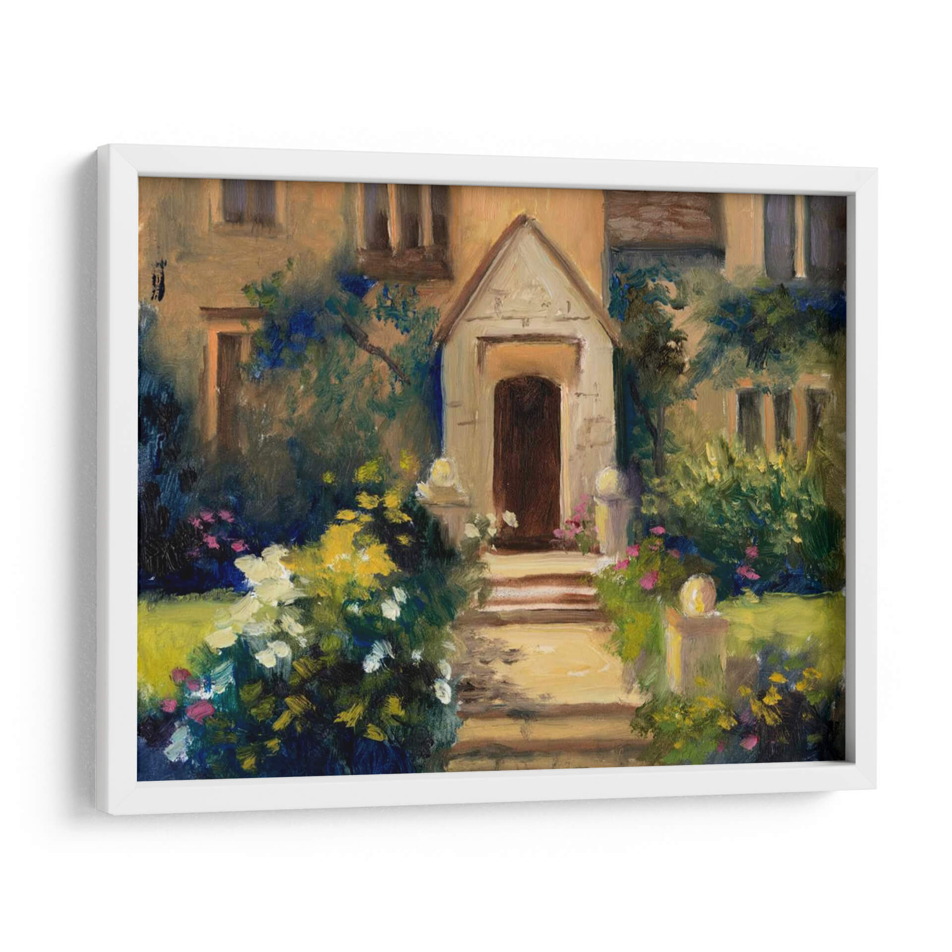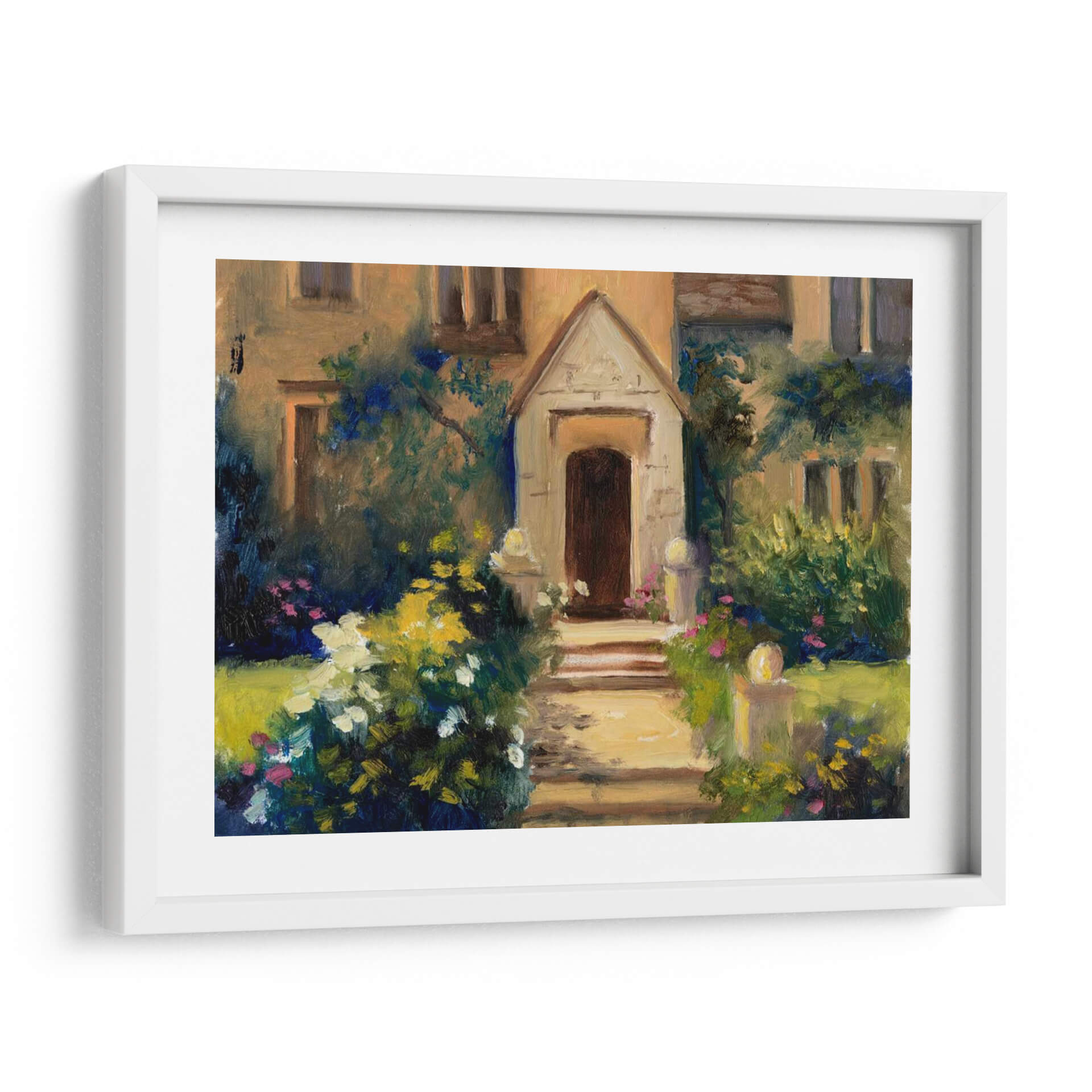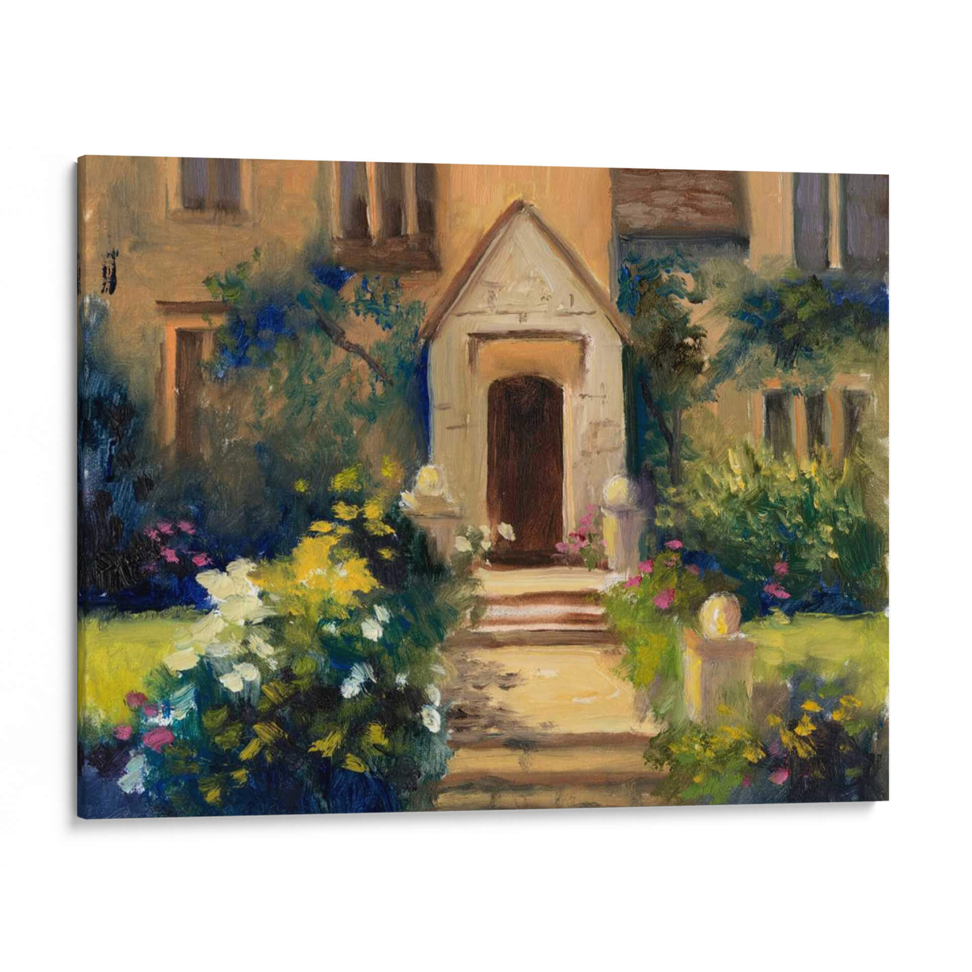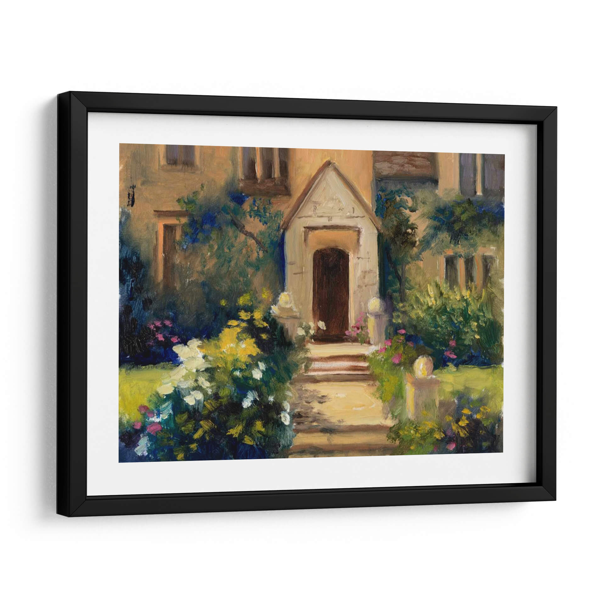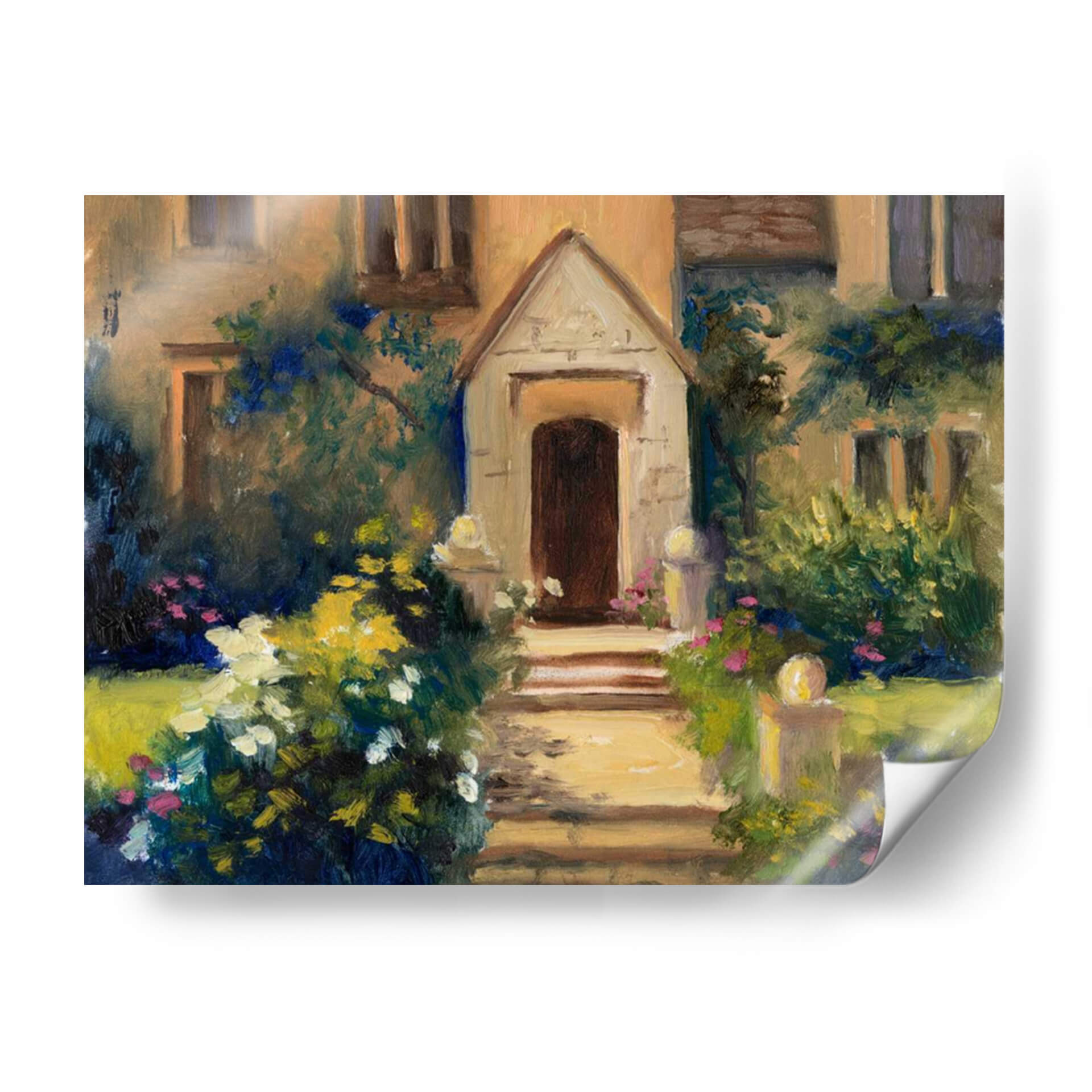 Sumérgete en la serenidad del campo inglés con 'Cotswold Cottage VII', una encantadora obra de arte de Mary Jean Weber. Esta pintura captura la esencia de un idílico hogar rural, con una entrada flanqueada por exuberantes jardines llenos de flores vibrantes y vegetación frondosa. La paleta de colores, dominada por tonos cálidos de ocre y tierra, se complementa con toques de azul profundo y blanco, creando una atmósfera acogedora y evocadora. Las pinceladas sueltas y el estilo impresionista de Weber dan vida a la escena, invitando al espectador a imaginar el aroma de las flores y la brisa suave. El camino de piedra que conduce a la puerta de madera oscura añade un elemento de misterio y anticipación, sugiriendo historias no contadas. Este cuadro decorativo es perfecto para añadir un toque de calidez y encanto rústico a cualquier espacio, ya sea una sala de estar, un dormitorio o un estudio. Su atmósfera tranquila y su belleza atemporal lo convierten en una pieza de conversación ideal, capaz de transformar cualquier pared en una ventana a la paz y la belleza de la campiña.