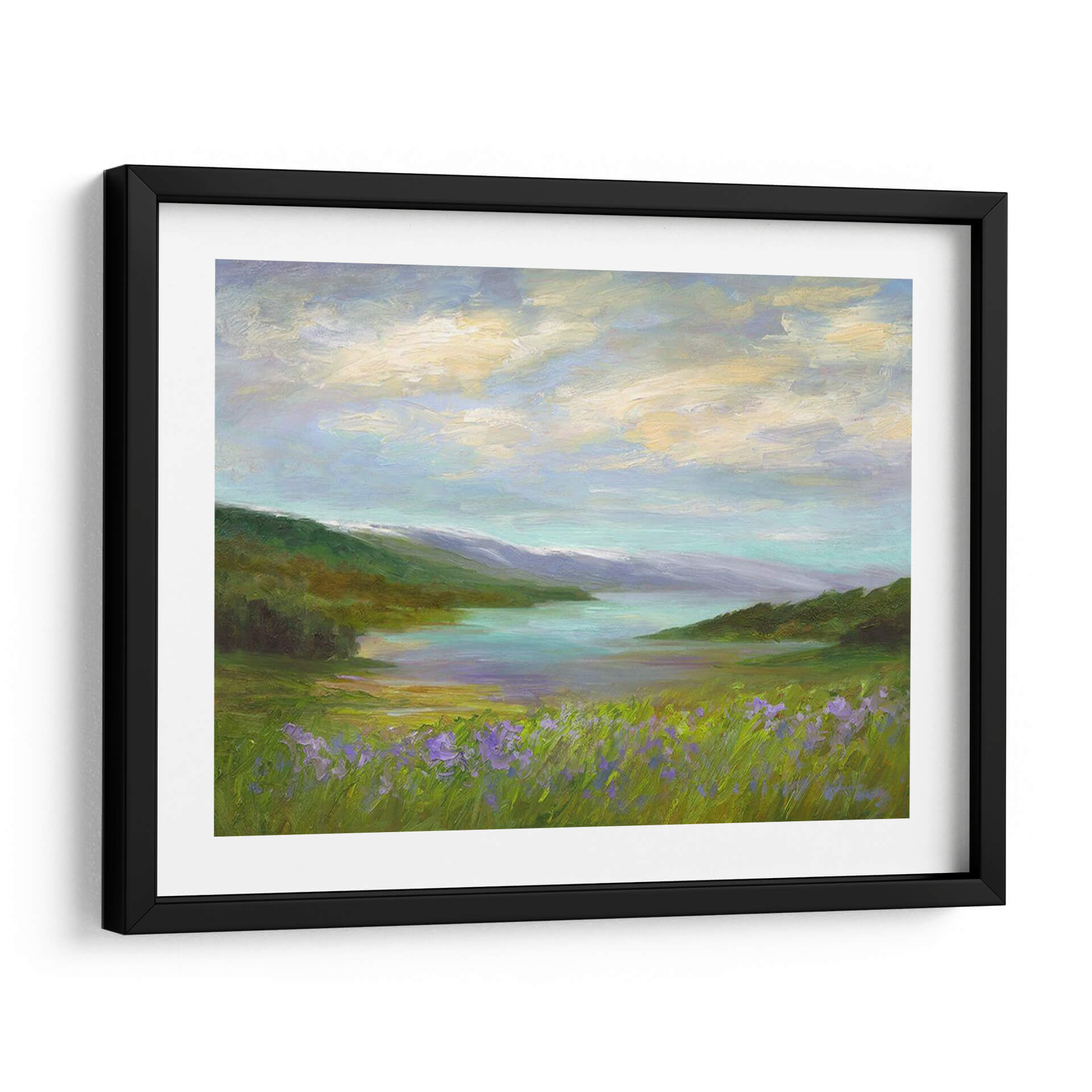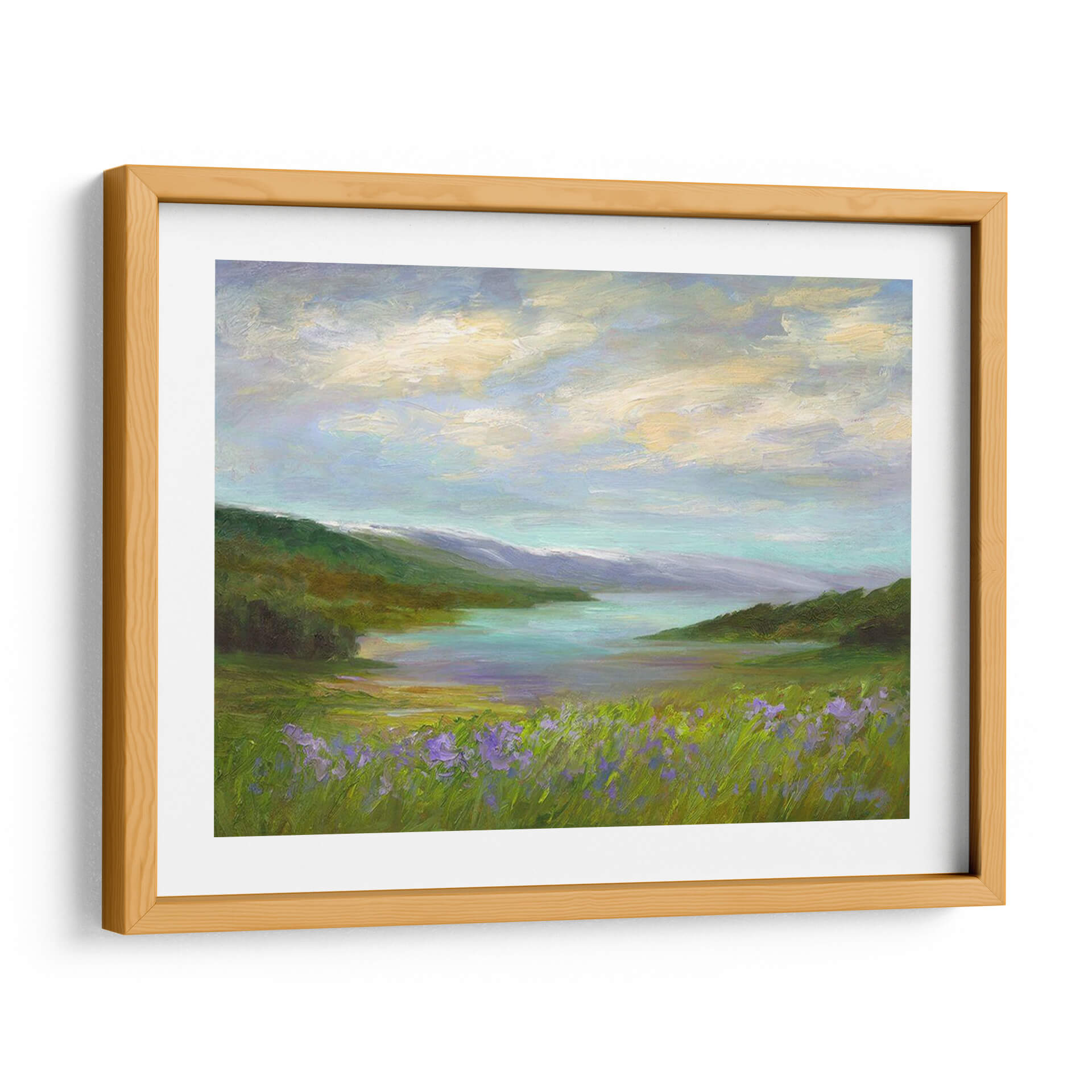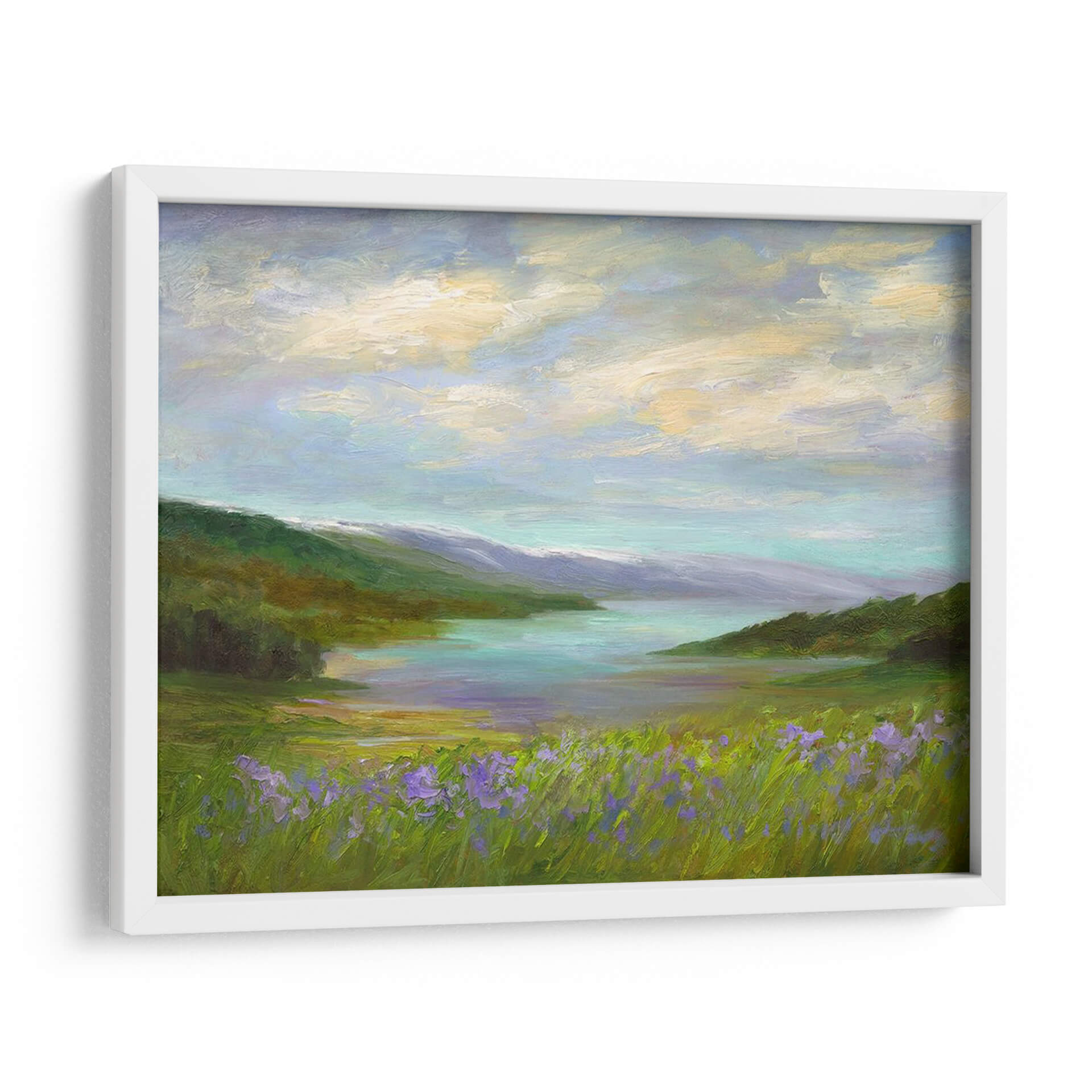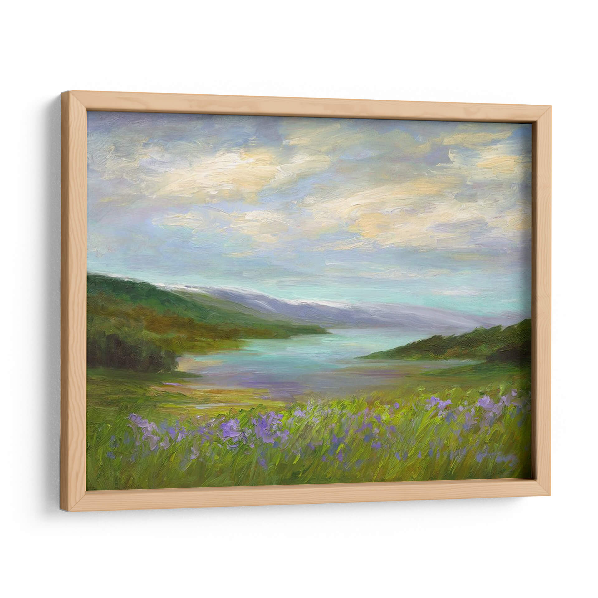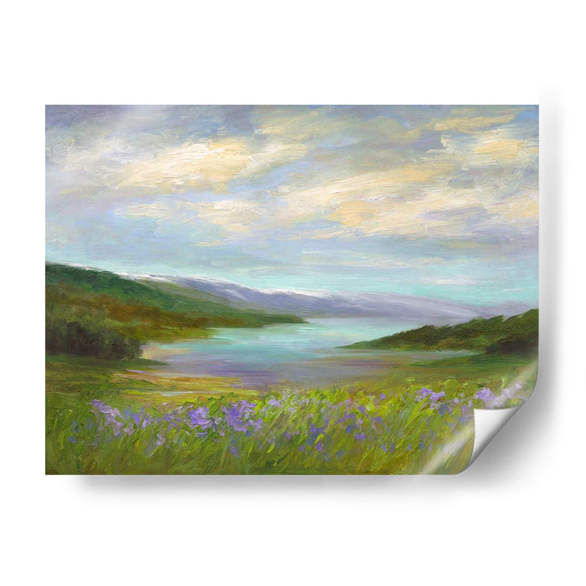 Sumérgete en la serenidad de 'Crystal Springs Vista', una obra de arte cautivadora que captura la esencia de un paisaje idílico con una pincelada evocadora. Sheila Finch nos transporta a un rincón de paz natural, donde un cuerpo de agua cristalina se refleja bajo un cielo nublado y suave. Los verdes exuberantes de la vegetación, salpicados por toques vibrantes de flores silvestres moradas en primer plano, crean una sensación de profundidad y vida. La paleta de colores, dominada por tonos pastel y terrosos, evoca una atmósfera de calma y tranquilidad, ideal para cualquier espacio que busque un refugio visual. Las sutiles transiciones de color y las texturas ricas de la pintura invitan a la contemplación, haciendo de este cuadro decorativo una pieza central que invita a la relajación y la conexión con la naturaleza. Perfecto para salones, dormitorios o cualquier lugar donde desees infundir una sensación de paz y belleza natural. Esta pieza es una invitación a pausar y apreciar la serena belleza del mundo que nos rodea, transformando tu hogar u oficina en un santuario de calma.
