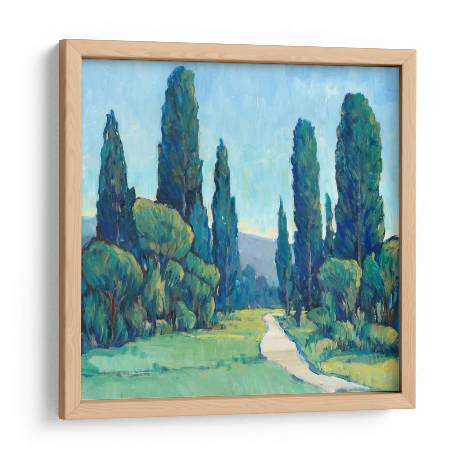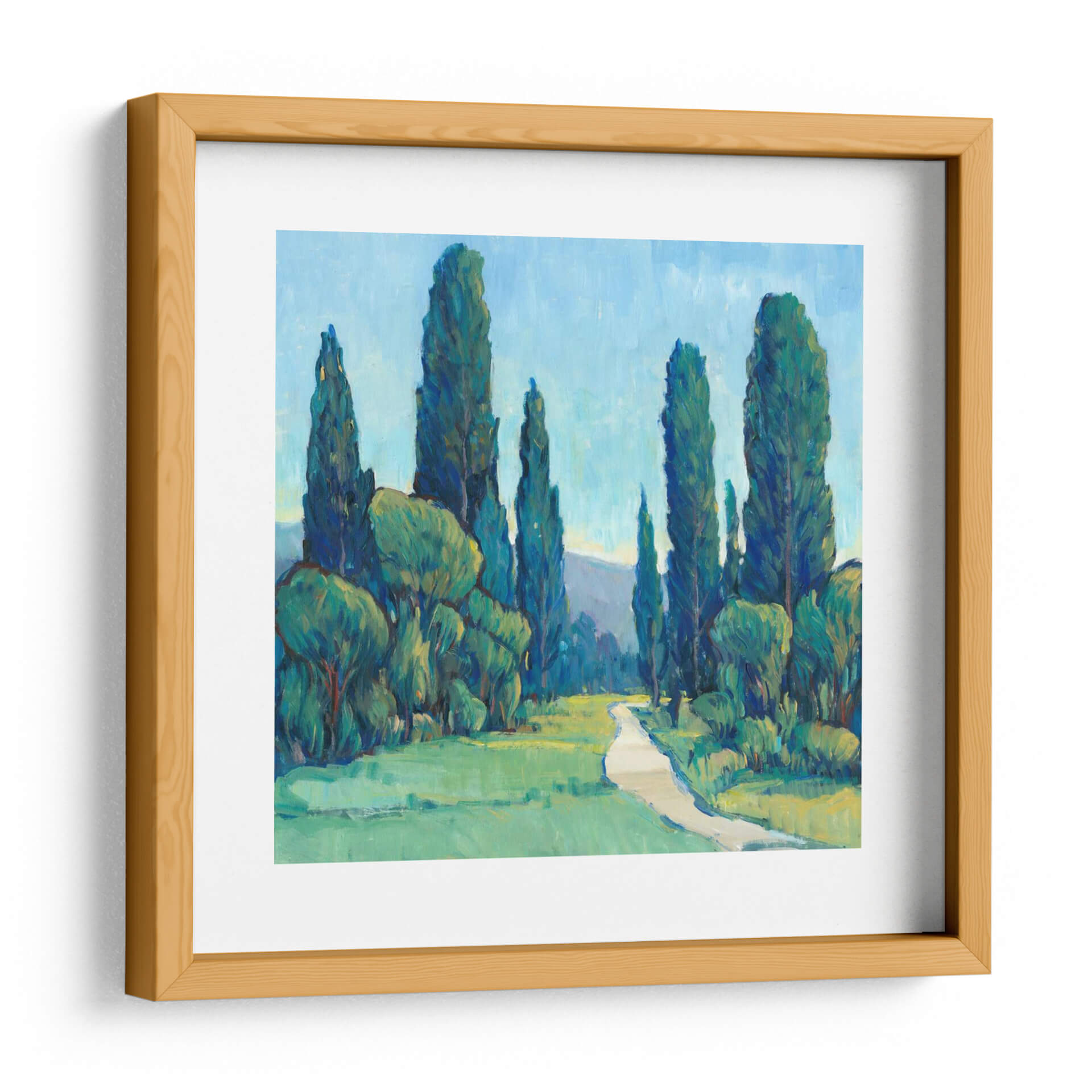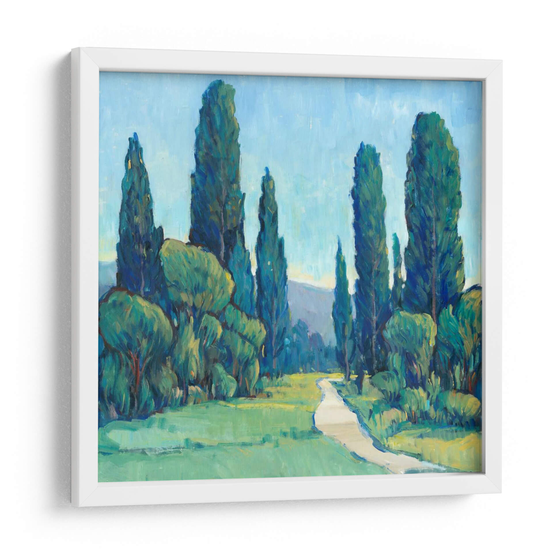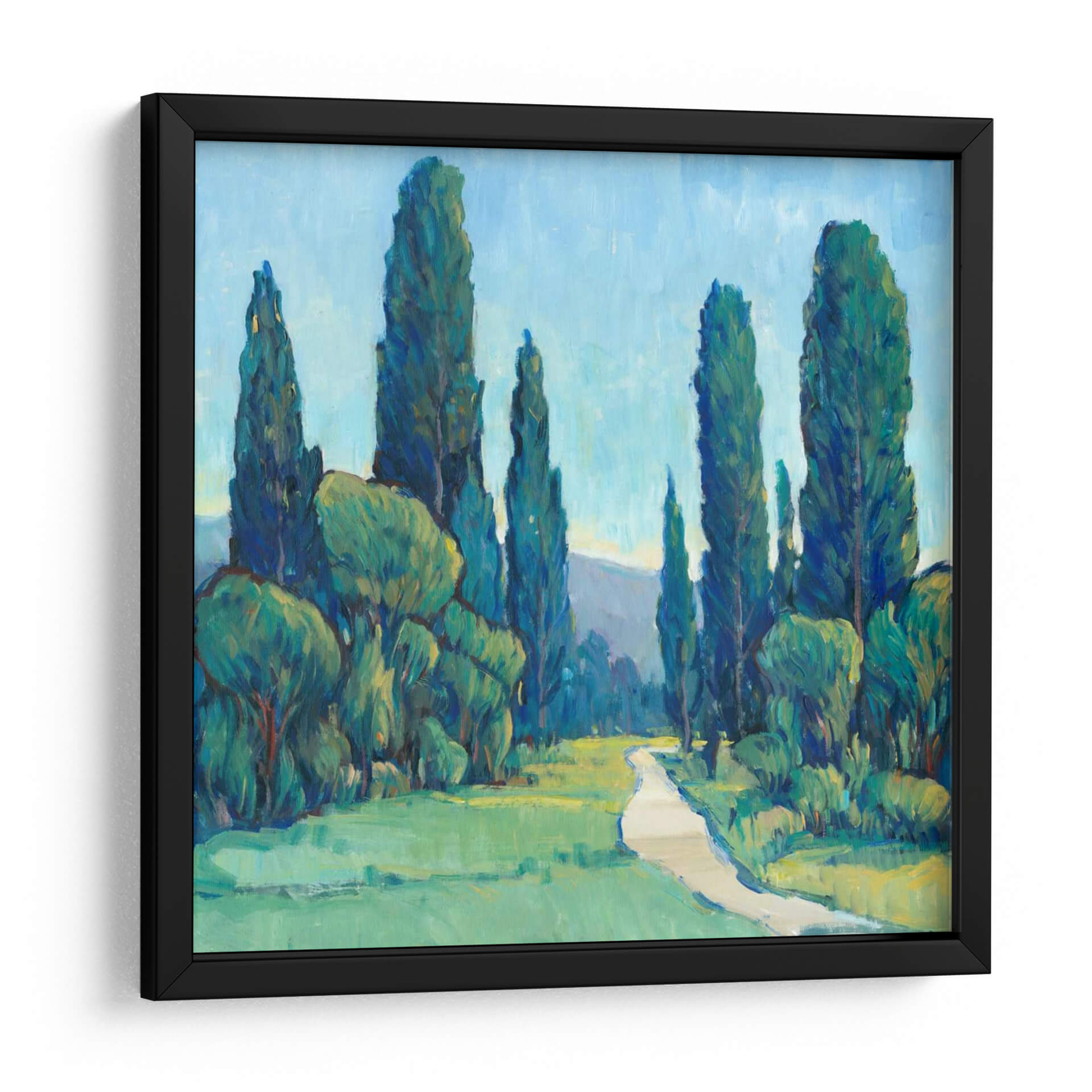 Sumérgete en la serenidad de 'Cypress Path II', una obra de arte que captura la esencia de un paseo tranquilo entre majestuosos cipreses. Los profundos tonos verdes y azules de la vegetación y el cielo se entrelazan, creando una atmósfera de paz y contemplación. La pincelada expresiva de Tim O'Toole da vida a este paisaje, invitando al espectador a recorrer el sinuoso camino que se adentra en la escena. Este cuadro decorativo es ideal para añadir un toque de naturaleza y calma a cualquier espacio, desde una sala de estar acogedora hasta un sereno dormitorio o un estudio introspectivo. La composición, con los altos cipreses flanqueando el sendero, guía la mirada hacia un horizonte suavemente perfilado, sugiriendo una promesa de descubrimiento. La paleta de colores, dominada por verdes vibrantes y azules celestes, evoca la frescura de un día luminoso en el campo. 'Cypress Path II' no es solo una pieza decorativa, sino una invitación a la relajación y la conexión con el entorno natural. Su estilo, que fusiona lo figurativo con una pincelada impresionista, lo convierte en una adición versátil y atemporal a tu decoración.