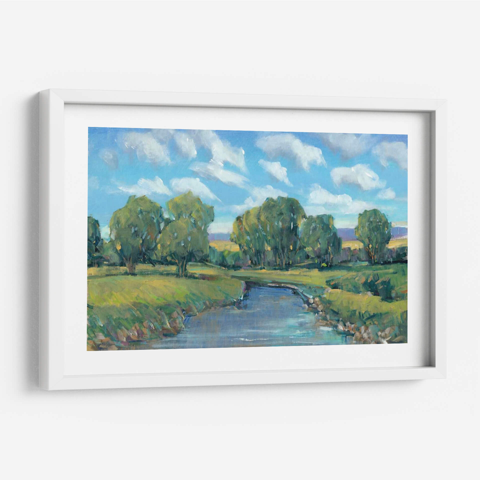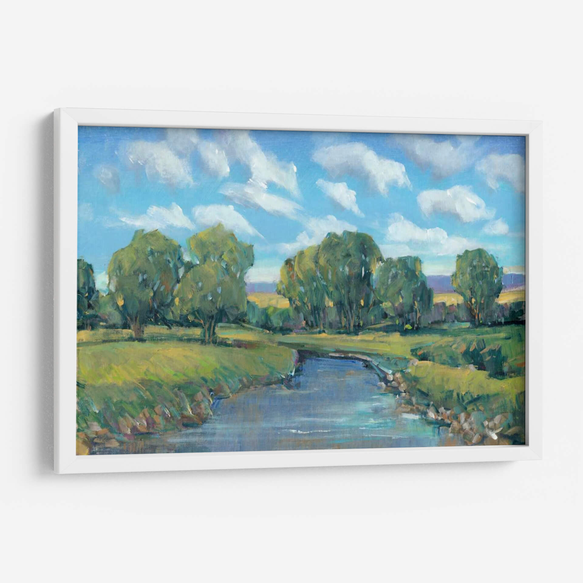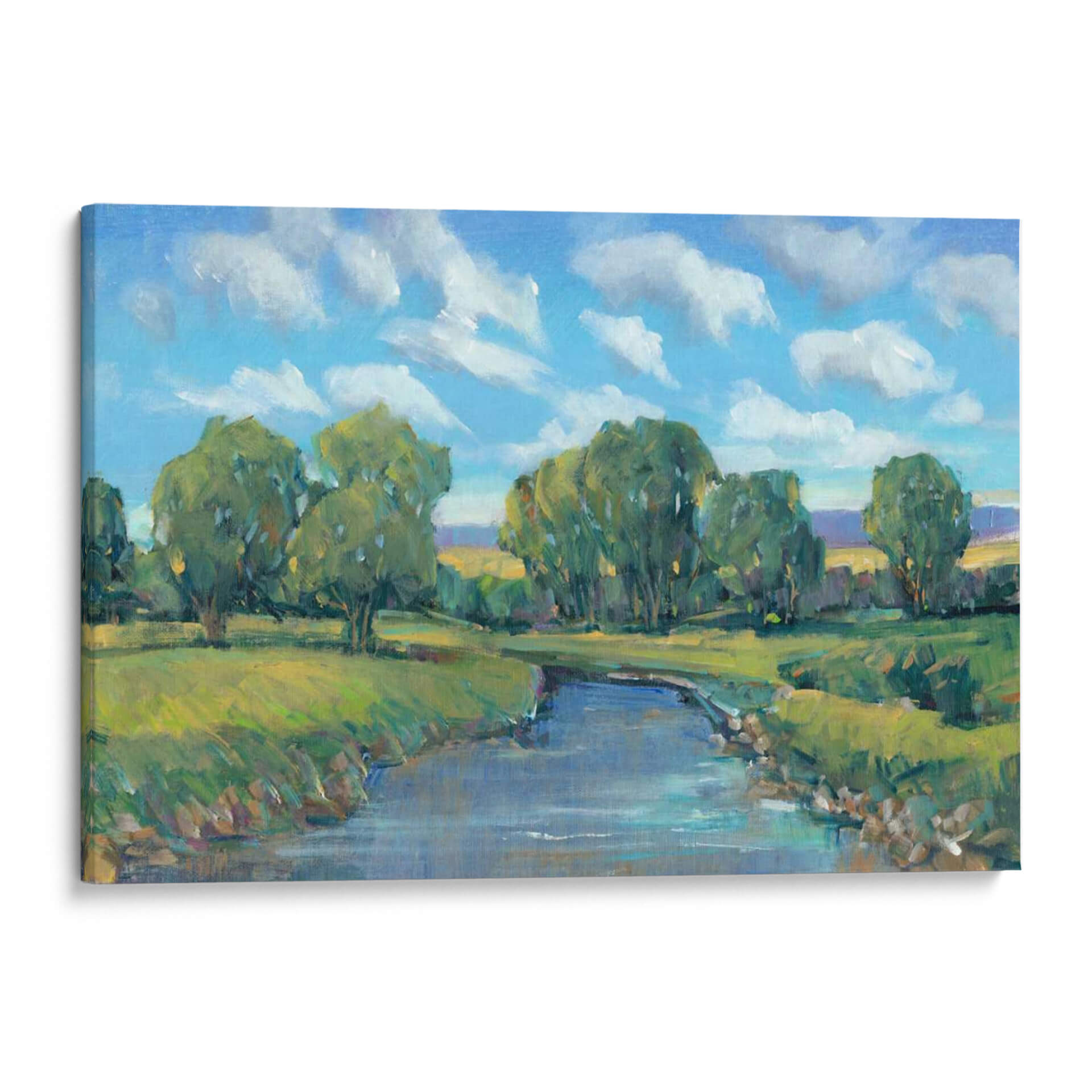 Sumérgete en la serenidad de "Día Del Río Lazy Ii", una obra de arte que captura la esencia de un paisaje fluvial tranquilo y vibrante. Pintado por Tim OToole, este cuadro decorativo evoca la paz y la belleza de un día apacible junto al agua. La obra presenta un río sereno que serpentea a través de un exuberante paisaje verde, flanqueado por árboles frondosos y un cielo azul adornado con nubes blancas algodonosas. La paleta de colores, dominada por verdes frescos, azules celestes y toques de amarillo terroso, crea una atmósfera de calma y renovación. El estilo impresionista de OToole se manifiesta en pinceladas sueltas y expresivas que dan vida a la escena, invitando al espectador a sentir la brisa y escuchar el suave murmullo del agua. Este cuadro es ideal para añadir un toque de naturaleza y tranquilidad a cualquier espacio, ya sea una sala de estar moderna, un dormitorio acogedor u una oficina que necesite un respiro visual. "Día Del Río Lazy Ii" no es solo una pieza decorativa, sino una ventana a un momento de paz y armonía natural, perfecta para quienes buscan conectar con la belleza del mundo exterior en su propio hogar. Transforma tu pared con esta escena inspiradora.
