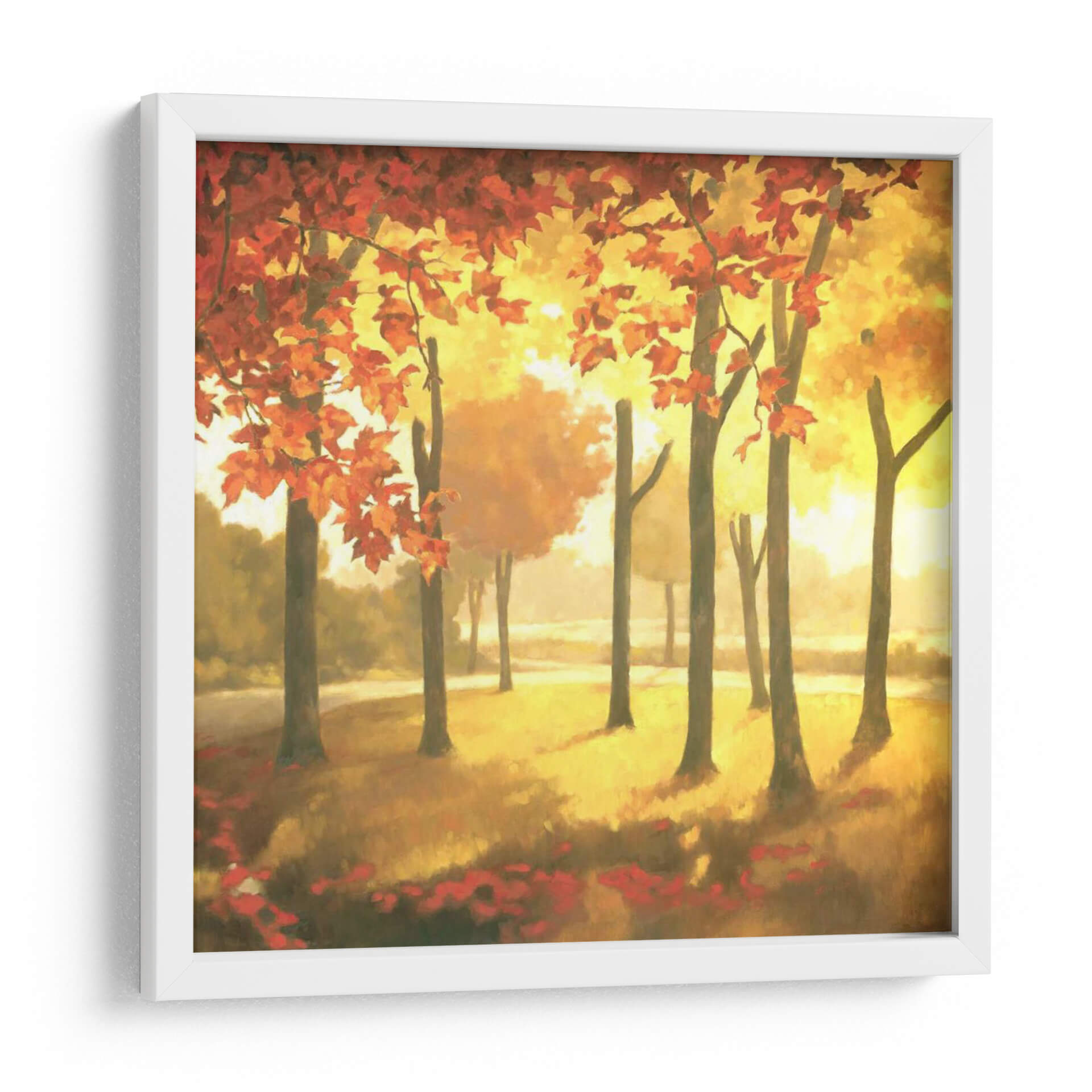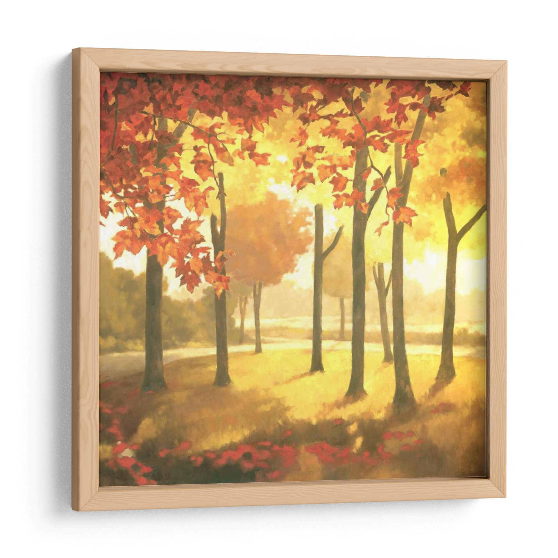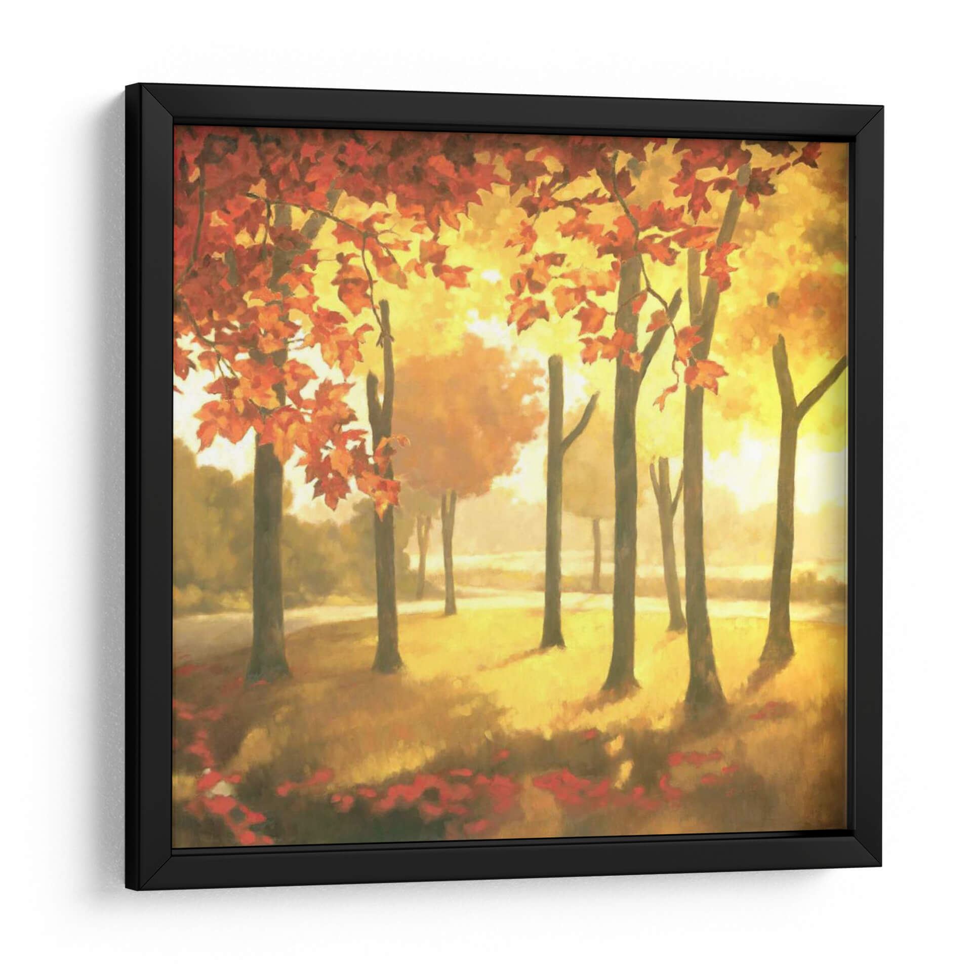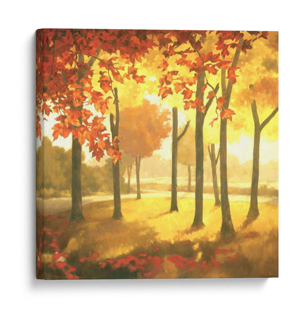 Sumérgete en la calidez y la vibrante atmósfera del otoño con "Dorado Octubre II", una cautivadora obra de arte de Graham Reynolds. Este cuadro decorativo captura la esencia de una arboleda bañada por la luz dorada del sol, donde las hojas de los árboles se tiñen de intensos tonos rojizos y anaranjados, mientras que el suelo se alfombra de pétalos caídos. La técnica impresionista y la pincelada suelta de Reynolds evocan una sensación de movimiento y la fugacidad de la estación. La paleta de colores, dominada por amarillos cálidos, naranjas vibrantes y toques de rojo intenso, crea un ambiente acogedor y lleno de vida, perfecto para añadir un toque de naturaleza y serenidad a cualquier espacio. Ideal para salones modernos, comedores o incluso oficinas que buscan un punto focal lleno de color y emoción. Este cuadro abstracto de paisaje es una invitación a contemplar la belleza efímera de la naturaleza y a traer un pedazo de esa magia otoñal a tu hogar, transmitiendo una sensación de paz y renovación.