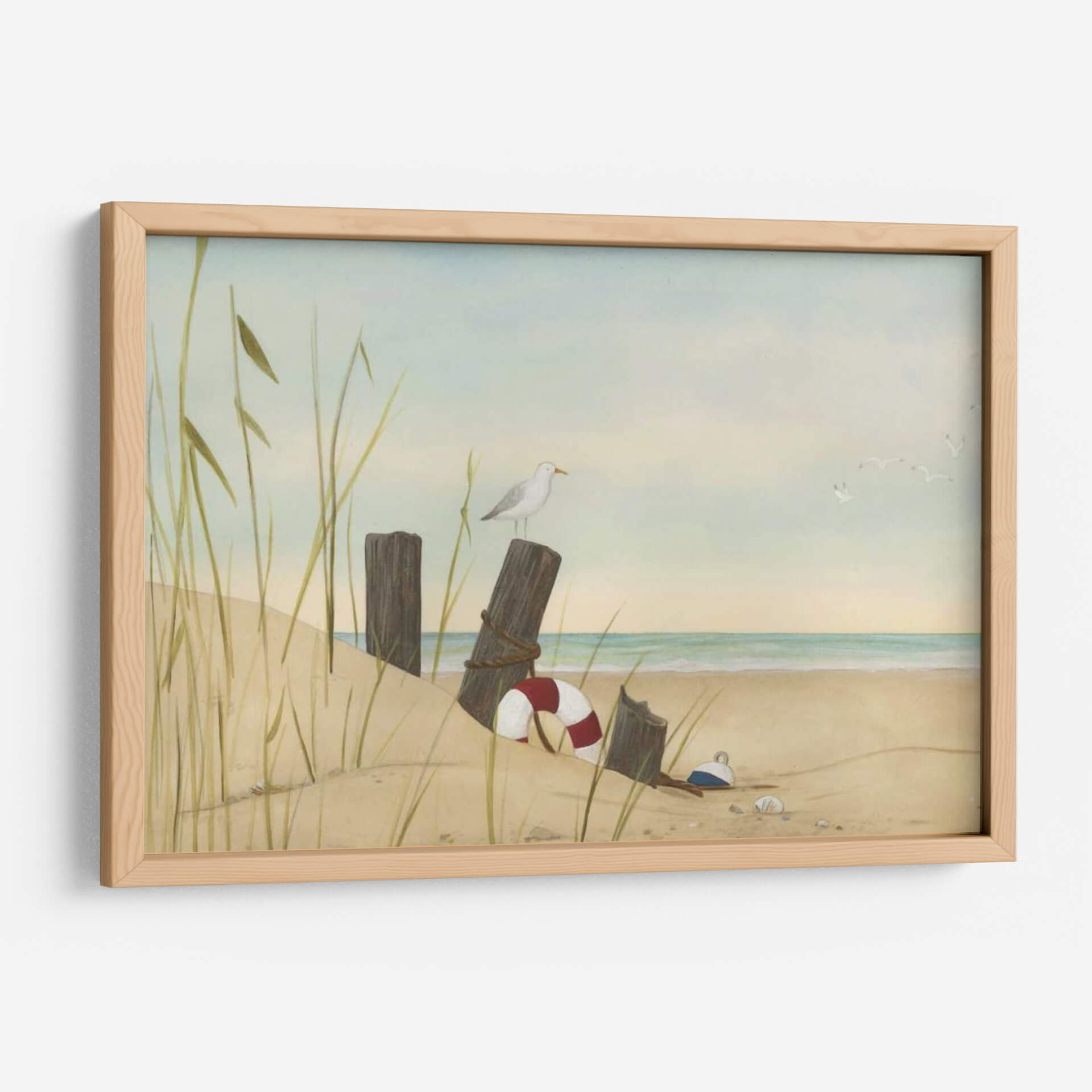Sumérgete en la serenidad de la costa con "Dunas de Playa I", una cautivadora obra de arte que captura la esencia de un día tranquilo junto al mar. La pintura presenta una escena costera idílica con dunas de arena suave, hierba marina que se mece suavemente con la brisa y postes de madera desgastados por el tiempo, evocando una sensación de nostalgia y paz. Una gaviota solitaria se posa en uno de los postes, observando el horizonte donde el cielo claro se funde con el mar en una suave línea. Los colores tierra predominantes, como los tonos arena y beige, se combinan con delicados azules celestes y marinos, creando una atmósfera relajante y armoniosa. El estilo de June Erica Vess, sutilmente realista con un toque de ensueño, invita a la contemplación y al sosiego. Este cuadro decorativo es perfecto para añadir un toque de calma y naturaleza a cualquier espacio, ideal para dormitorios, salas de estar o incluso oficinas que busquen un refugio visual de la rutina diaria. Transforma tu hogar en un oasis de tranquilidad con esta pieza que evoca la belleza atemporal de la playa.