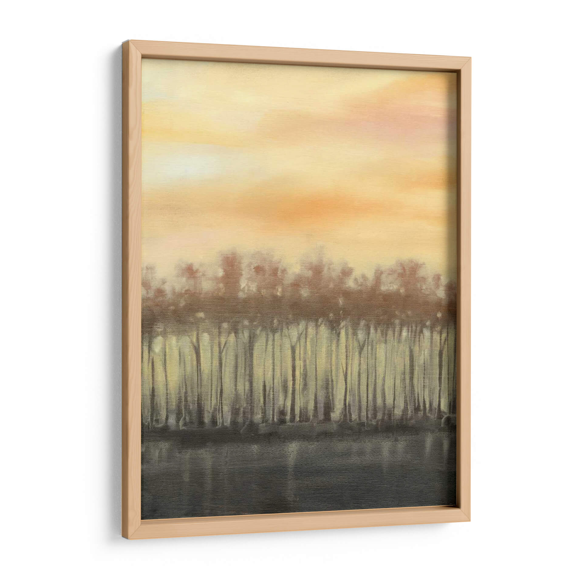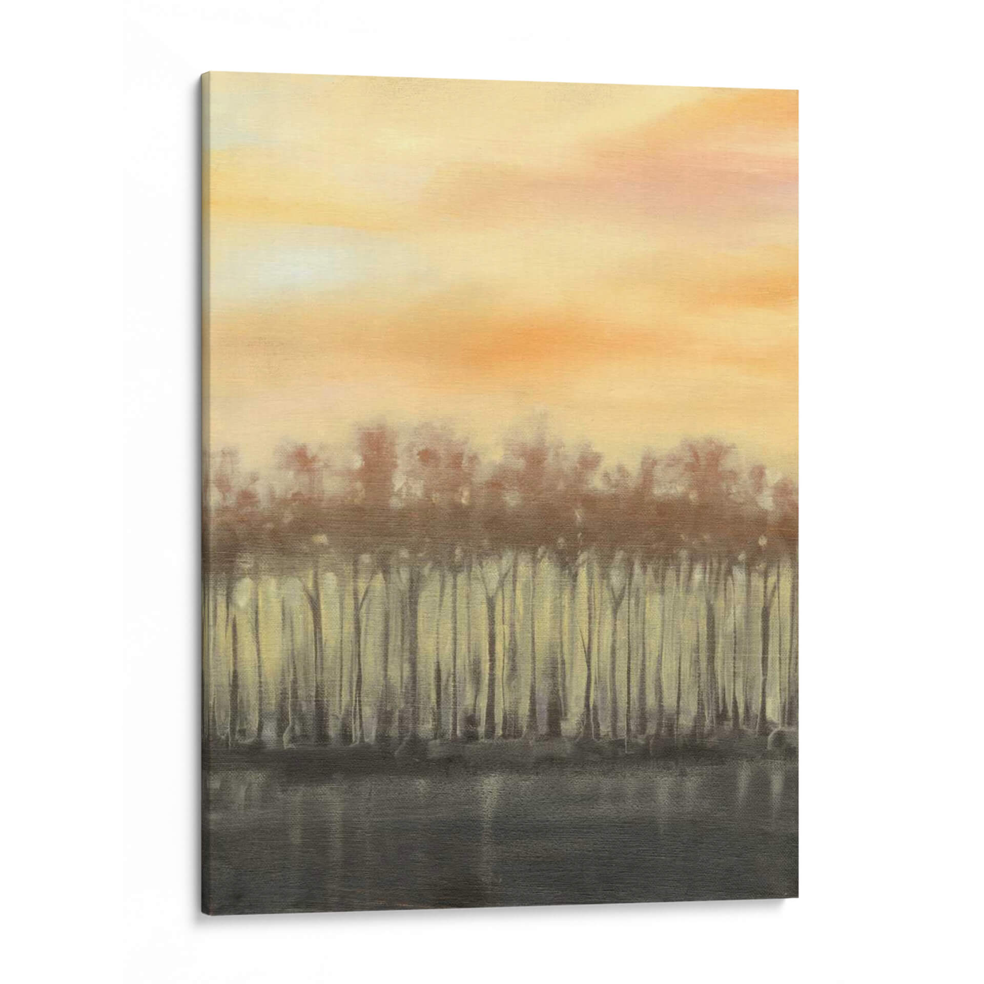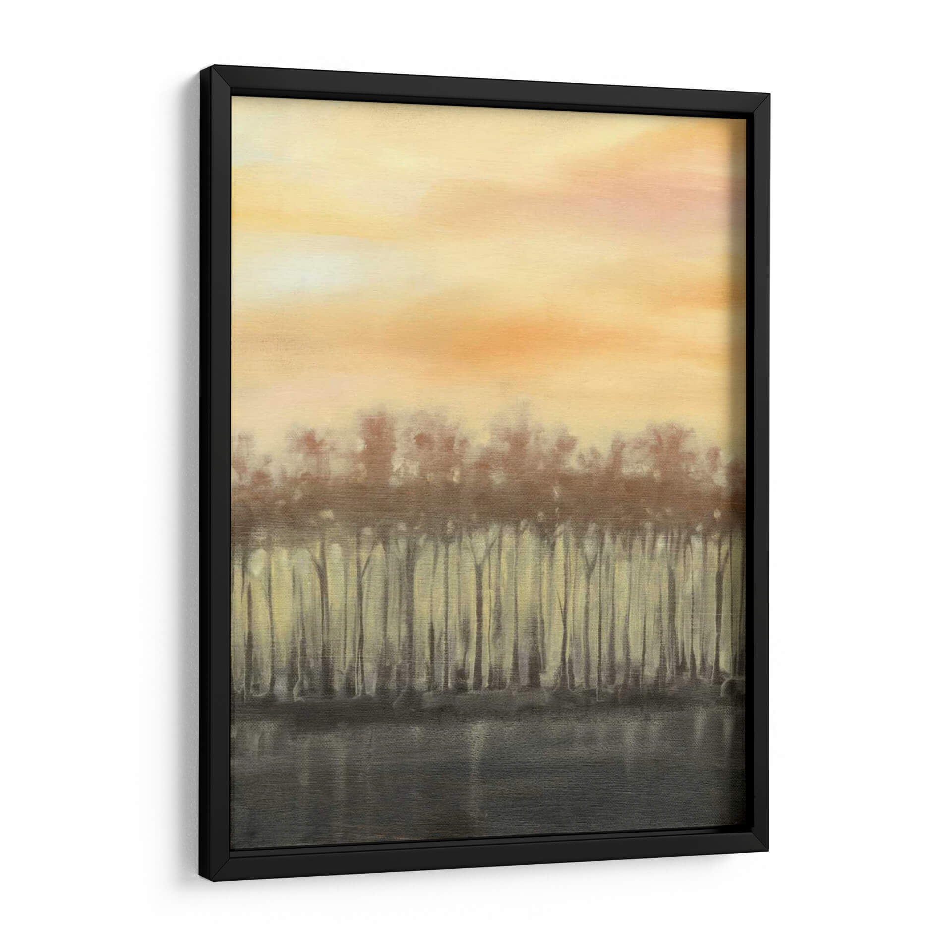 Sumérgete en la atmósfera serena de "Dusk En Otoño", una obra de arte cautivadora que evoca la tranquilidad de un atardecer otoñal. Jennifer Goldberger captura magistralmente la esencia de un bosque al anochecer, con una paleta de colores cálidos que transita suavemente desde el dorado del cielo hasta los tonos tierra y grises profundos del paisaje. Las siluetas de los árboles, representadas con pinceladas etéreas y difuminadas, sugieren una profundidad misteriosa y una conexión íntima con la naturaleza. La composición, que divide el lienzo en capas de cielo, bosque y agua reflectante, crea una sensación de calma y contemplación. Este cuadro decorativo es ideal para infundir serenidad en tu dormitorio, añadir un toque de sofisticación natural a tu sala de estar o crear un rincón de paz en tu oficina. Su estilo abstracto-impresionista permite que se integre armoniosamente en diversas decoraciones, aportando una sensación de calidez y elegancia atemporal.