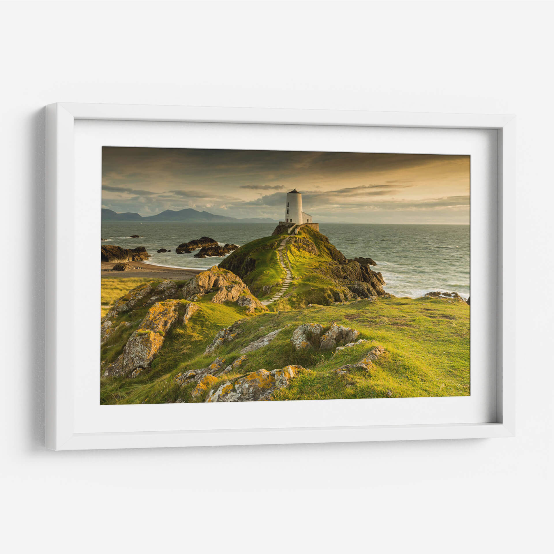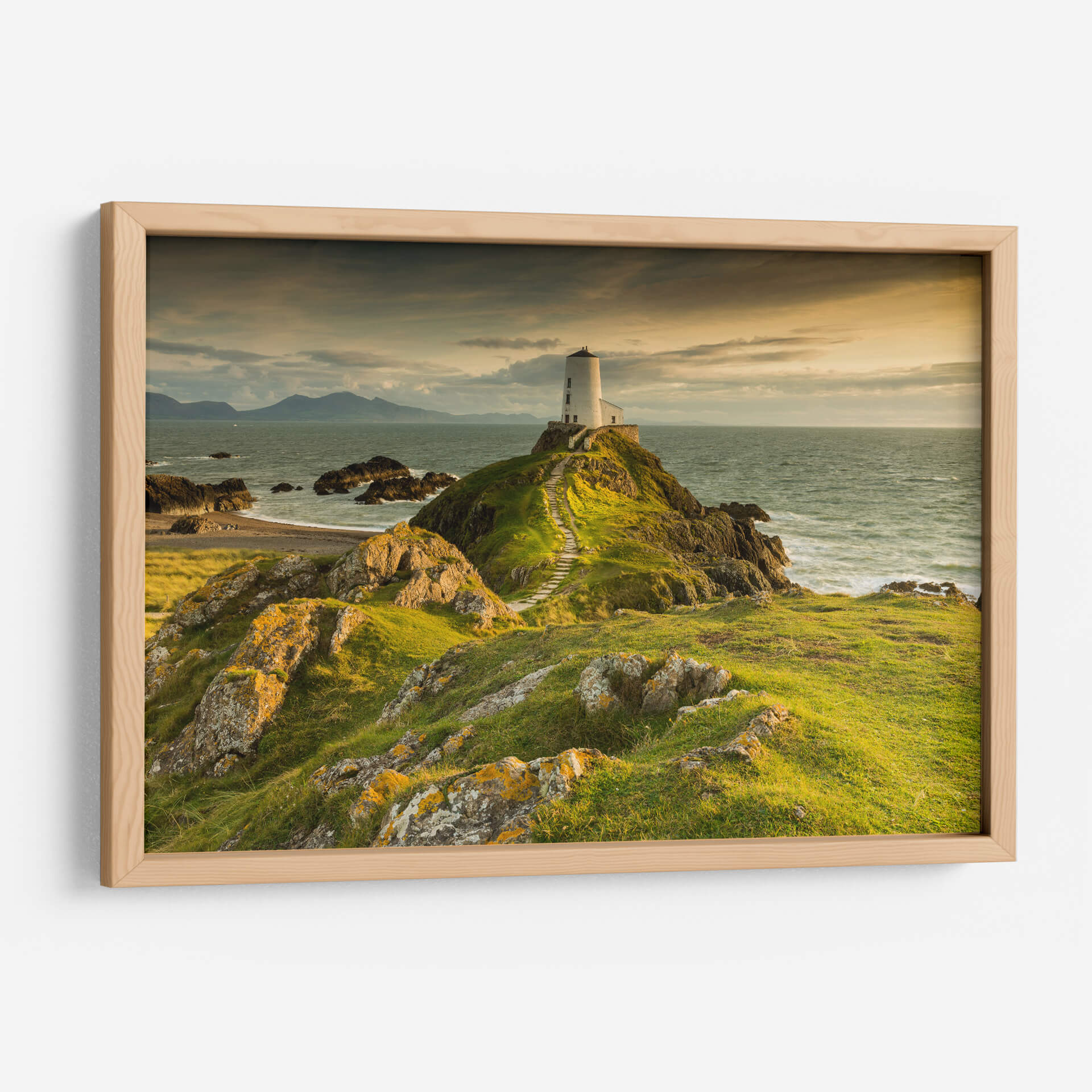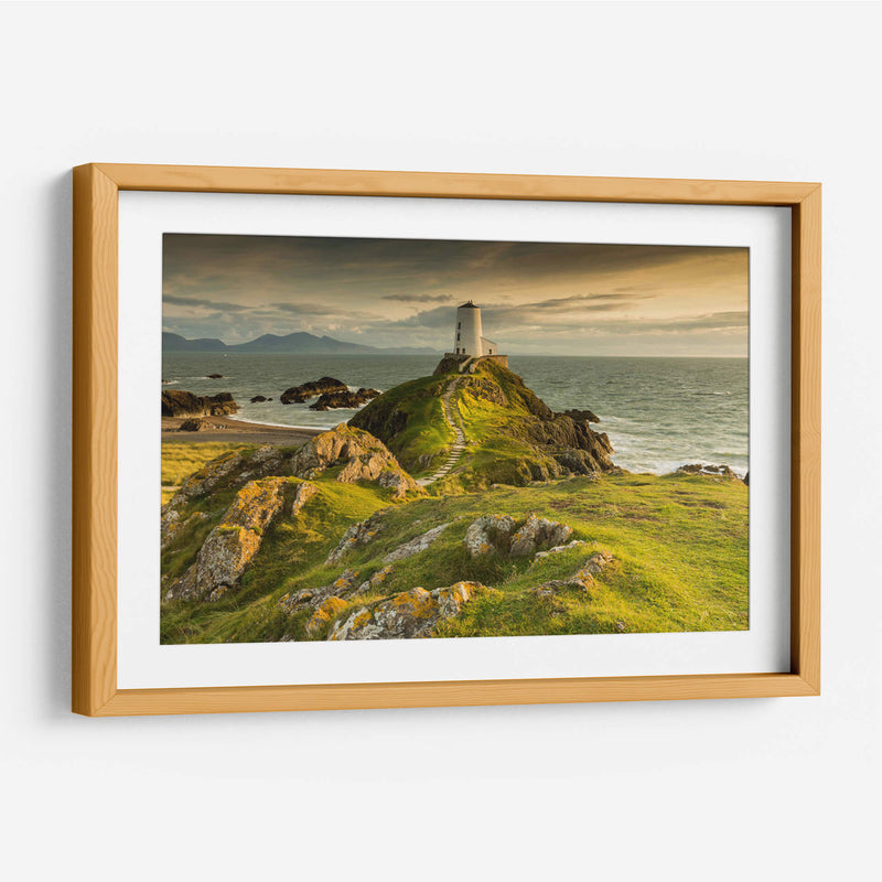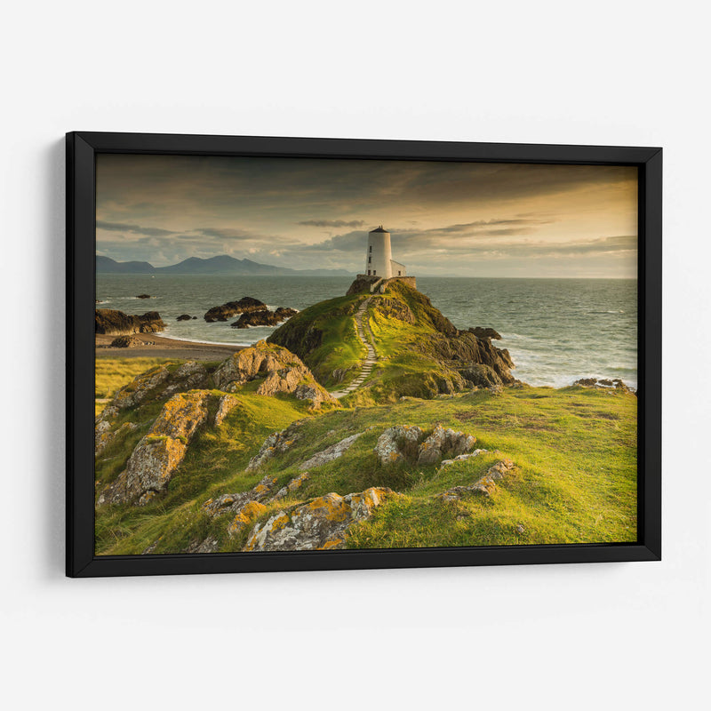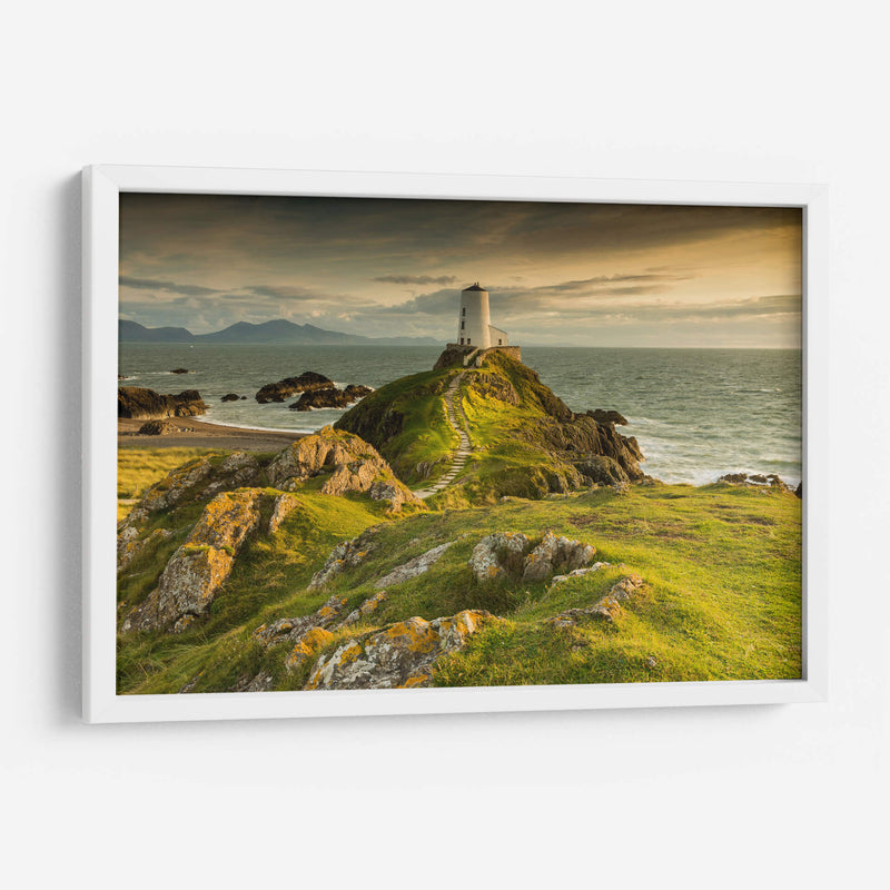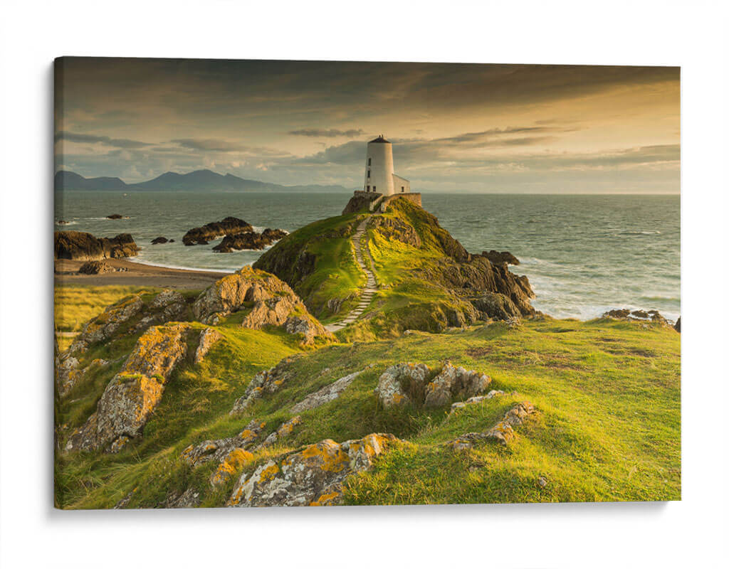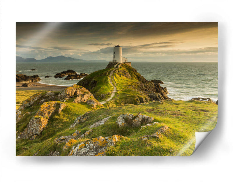 Embárcate en un viaje visual hacia la costa con "El faro de Llanddwyn", un cuadro decorativo que captura la majestuosidad de un paisaje marino al atardecer. Esta obra transporta a un rincón pintoresco donde la naturaleza se encuentra con la arquitectura, destacando un imponente faro blanco coronando una colina verde esmeralda. La escena está bañada por la cálida luz dorada del sol poniente, creando un juego de luces y sombras que realza la textura del terreno rocoso y la vegetación exuberante. El mar, con sus suaves olas rompiendo contra las rocas, aporta una sensación de tranquilidad y movimiento constante. Las montañas distantes y el cielo nublado añaden profundidad y dramatismo a la composición, sugiriendo la vastedad del océano y la fuerza de los elementos. Este cuadro decorativo es ideal para infundir serenidad y una conexión con la naturaleza en cualquier espacio, ya sea un salón, un dormitorio o un estudio. Su evocadora atmósfera lo convierte en un punto focal inspirador, perfecto para quienes buscan añadir un toque de paz y aventura a su decoración.