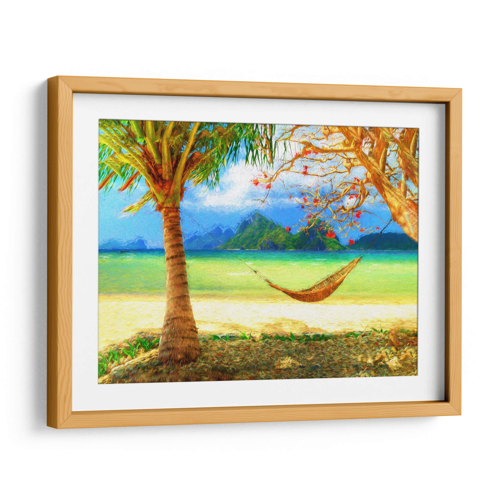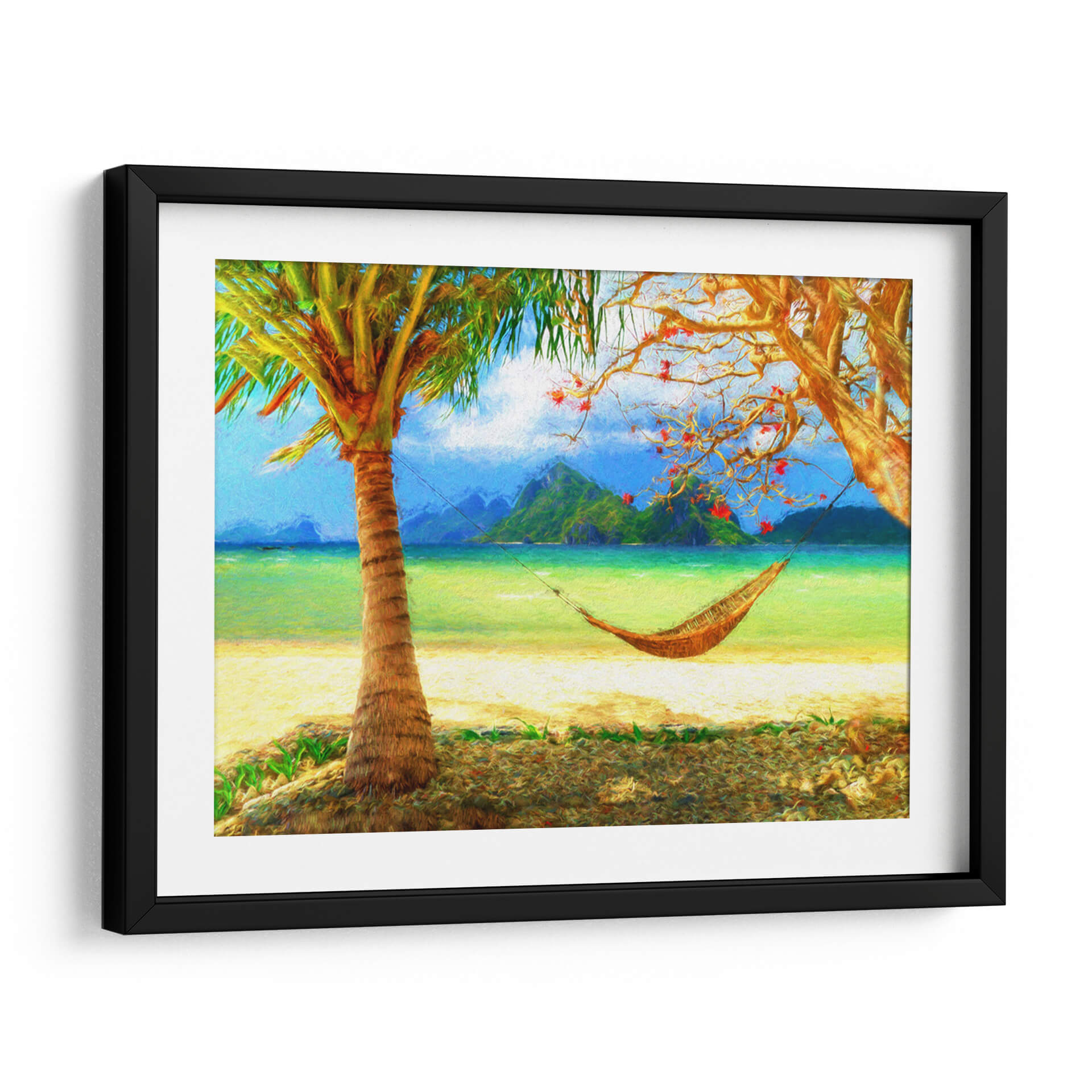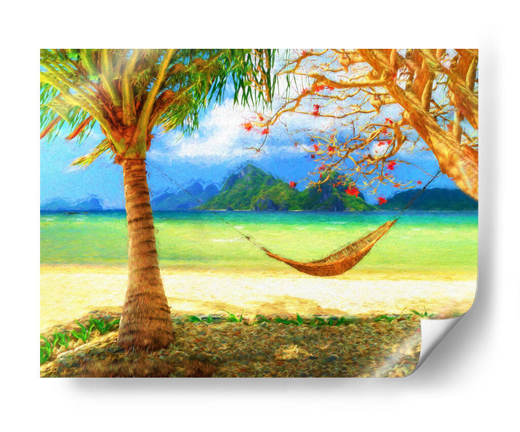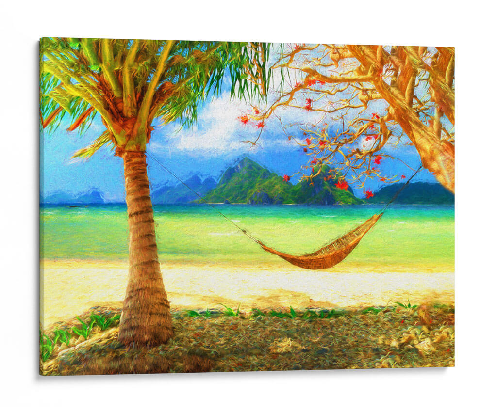 Sumérgete en la serenidad tropical con "El Mar 8", una cautivadora obra de arte del artista Marcos Rodríguez. Este cuadro decorativo transporta al espectador a una idílica playa, donde una hamaca se balancea suavemente entre palmeras frondosas bajo un cielo azul vibrante salpicado de nubes. Los tonos turquesas del mar se fusionan con las arenas doradas y la exuberante vegetación, creando una atmósfera de paz y desconexión. Las islas montañosas al fondo añaden profundidad y un toque de misterio a esta escena paradisíaca. Los toques de rojo en las flores que cuelgan de un árbol cercano aportan un contraste vibrante, inyectando vida y calidez a la composición general. El estilo pictórico, que recuerda a una pintura al óleo con pinceladas visibles, confiere textura y carácter a la obra, invitando a la contemplación. "El Mar 8" es la pieza perfecta para transformar cualquier espacio en un santuario de tranquilidad. Ideal para salones, dormitorios o cualquier rincón que necesite una ventana a un paraíso lejano, este cuadro decorativo evoca vacaciones, descanso y la belleza inmutable de la naturaleza. Añade un toque de escapismo y serenidad a tu hogar con esta pieza excepcional.
