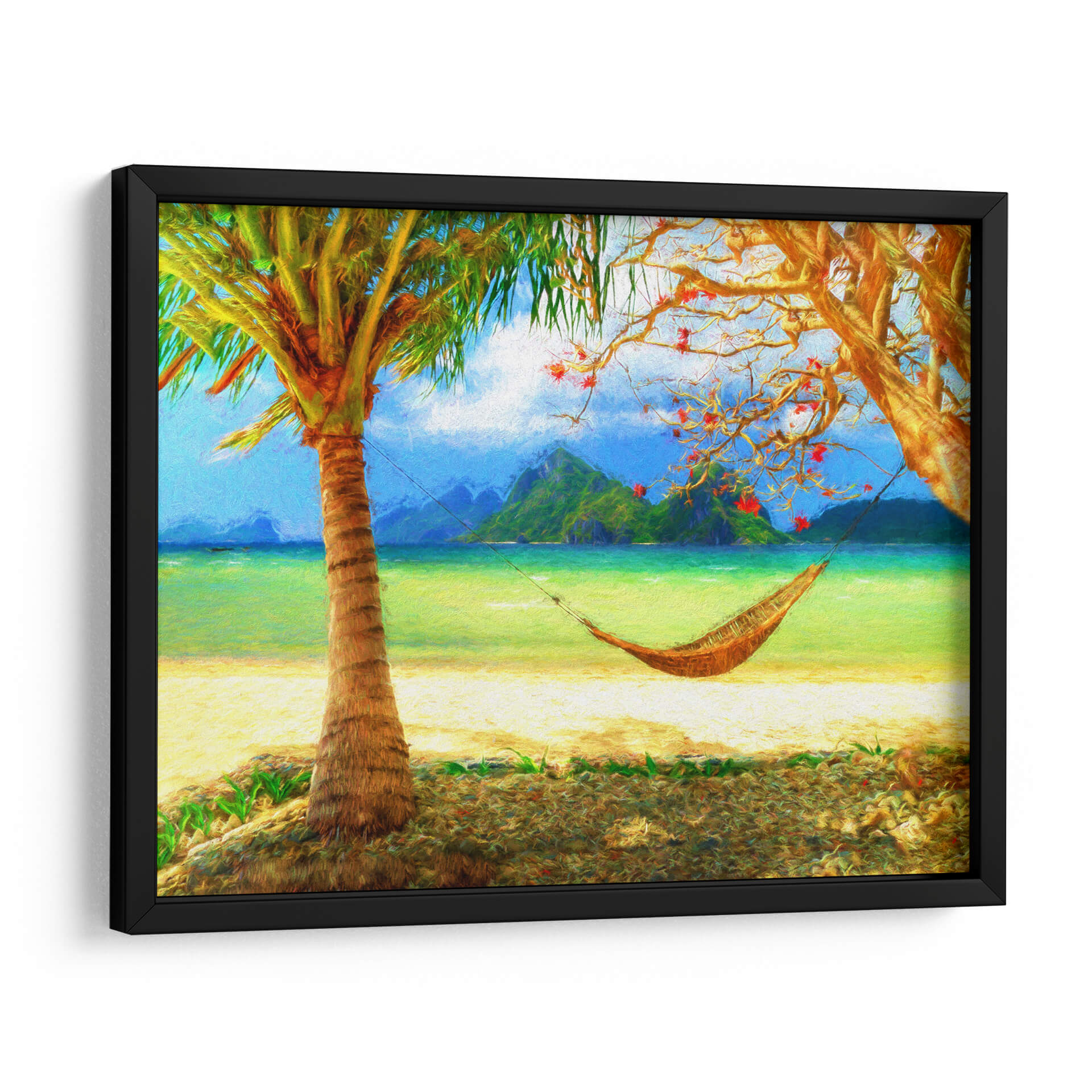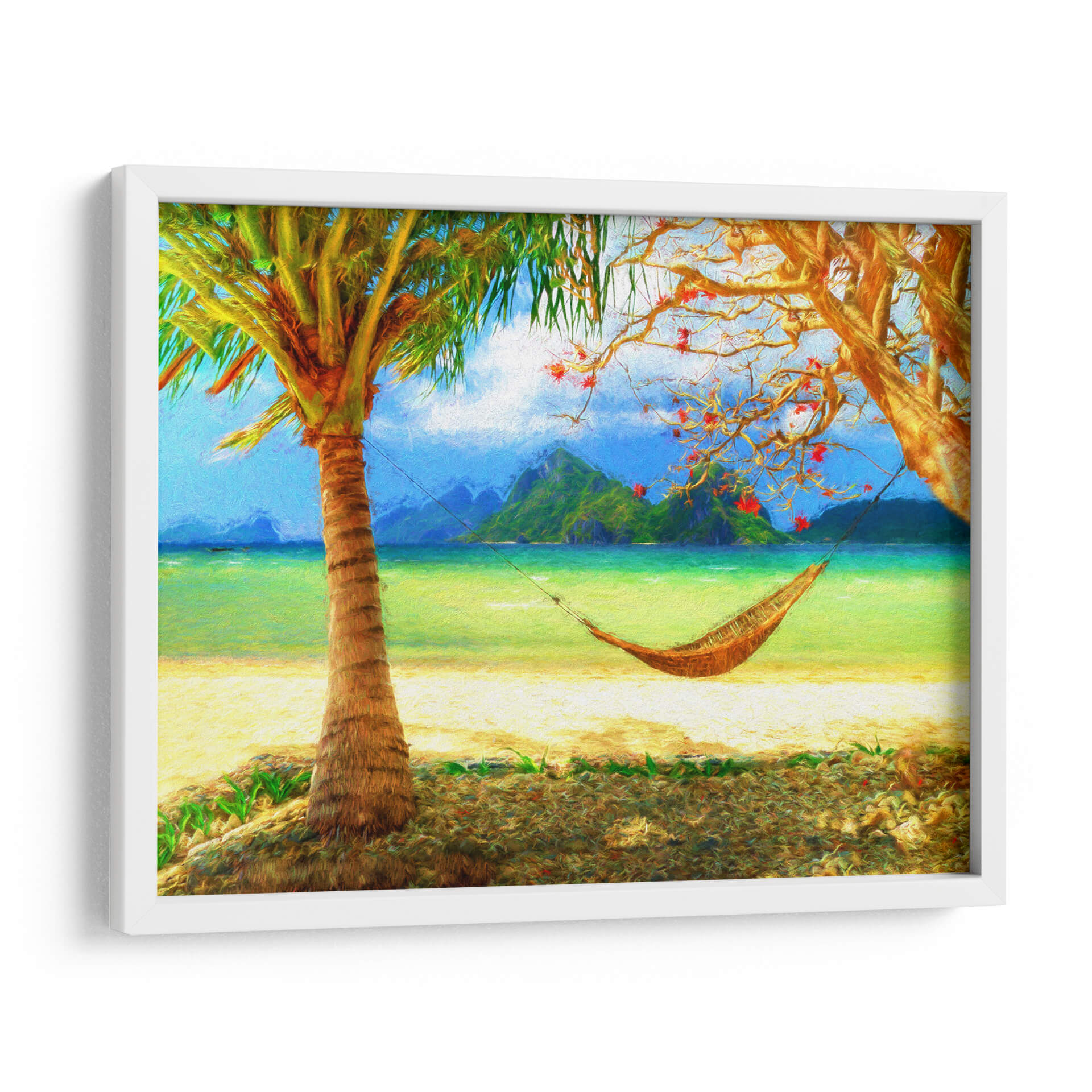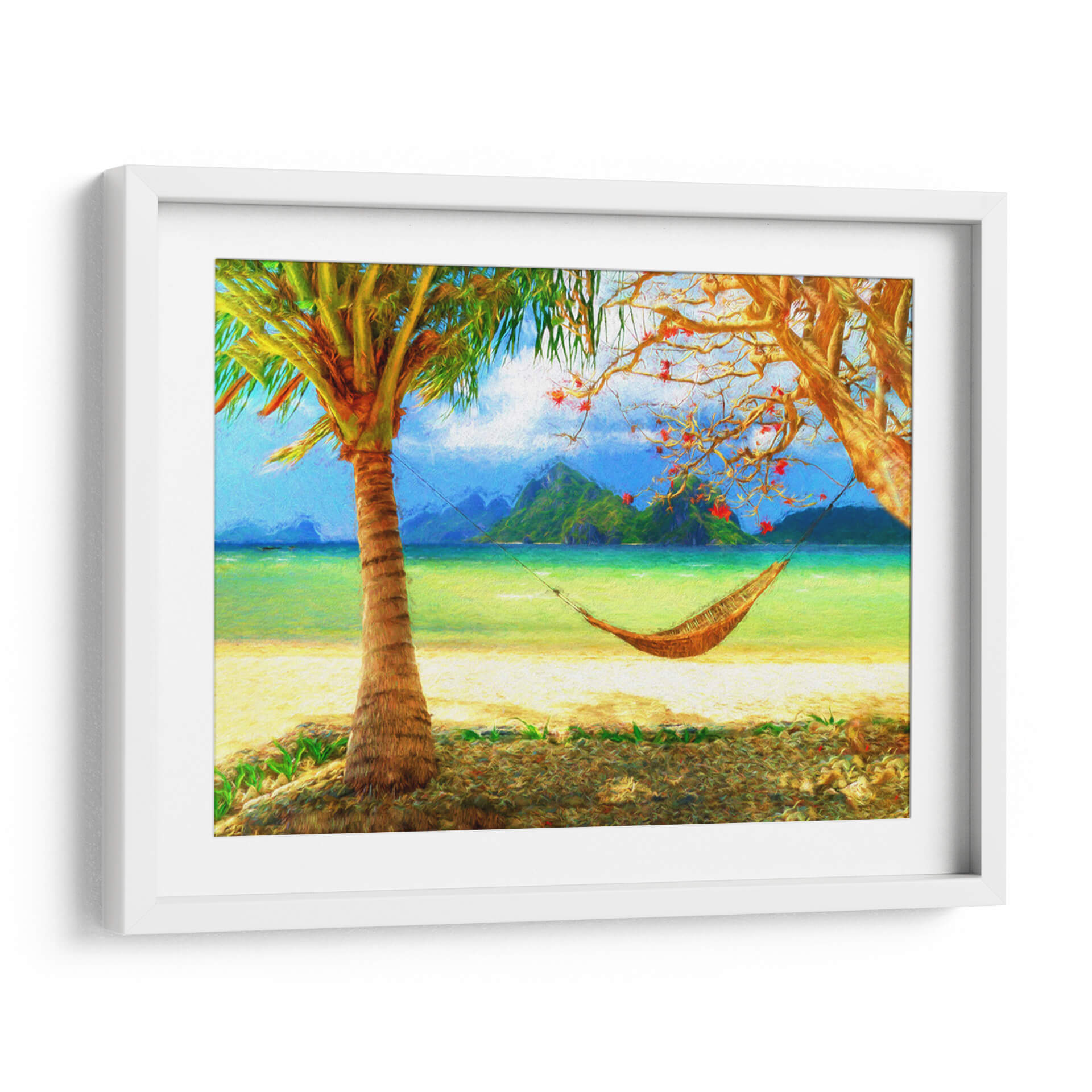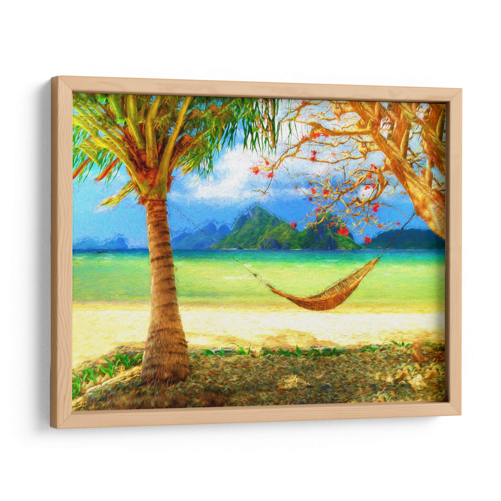 Sumérgete en la serenidad tropical con "El Mar 8", una cautivadora obra de arte del artista Marcos Rodríguez. Este cuadro decorativo transporta al espectador a una idílica playa, donde una hamaca se balancea suavemente entre palmeras frondosas bajo un cielo azul vibrante salpicado de nubes. Los tonos turquesas del mar se fusionan con las arenas doradas y la exuberante vegetación, creando una atmósfera de paz y desconexión. Las islas montañosas al fondo añaden profundidad y un toque de misterio a esta escena paradisíaca. Los toques de rojo en las flores que cuelgan de un árbol cercano aportan un contraste vibrante, inyectando vida y calidez a la composición general. El estilo pictórico, que recuerda a una pintura al óleo con pinceladas visibles, confiere textura y carácter a la obra, invitando a la contemplación. "El Mar 8" es la pieza perfecta para transformar cualquier espacio en un santuario de tranquilidad. Ideal para salones, dormitorios o cualquier rincón que necesite una ventana a un paraíso lejano, este cuadro decorativo evoca vacaciones, descanso y la belleza inmutable de la naturaleza. Añade un toque de escapismo y serenidad a tu hogar con esta pieza excepcional.