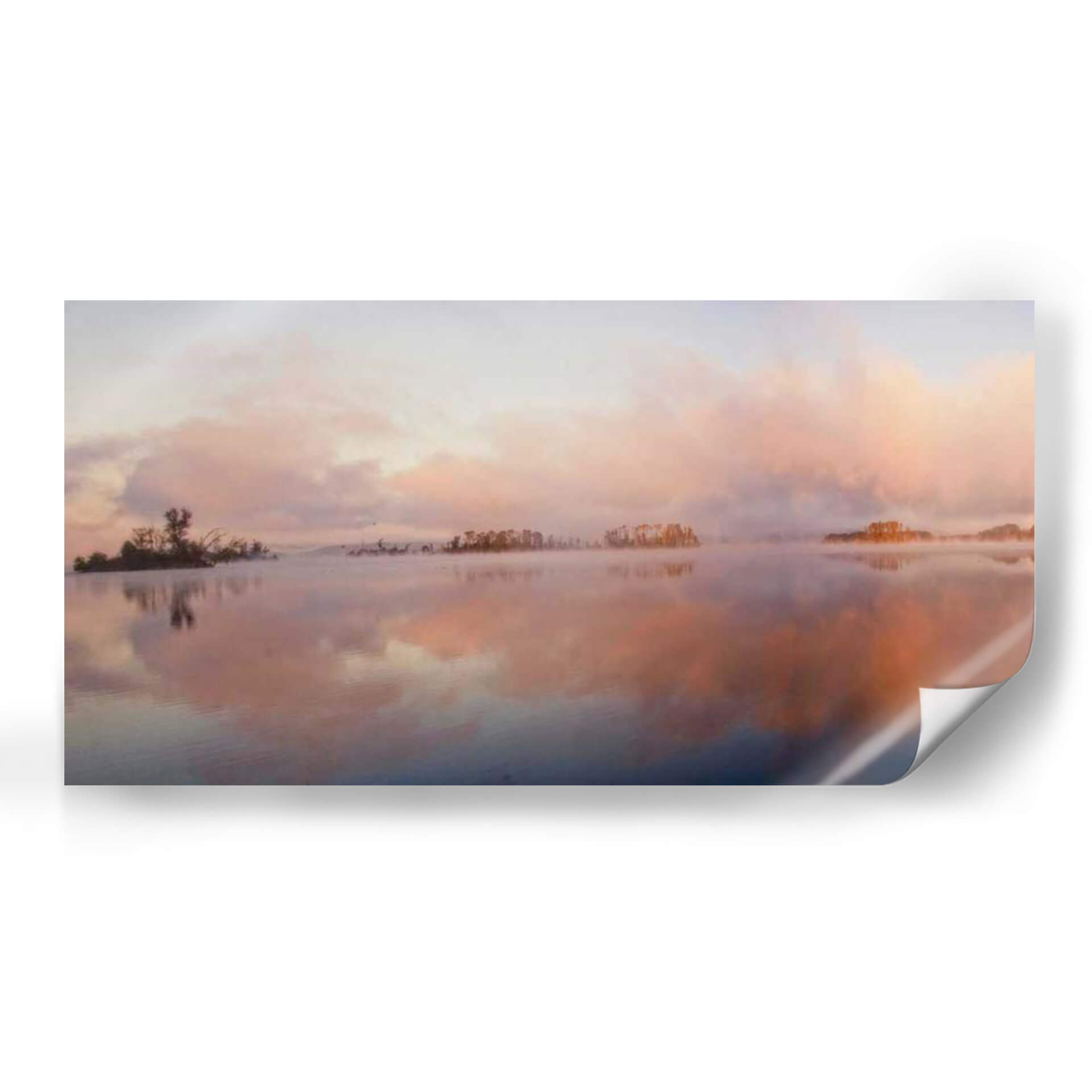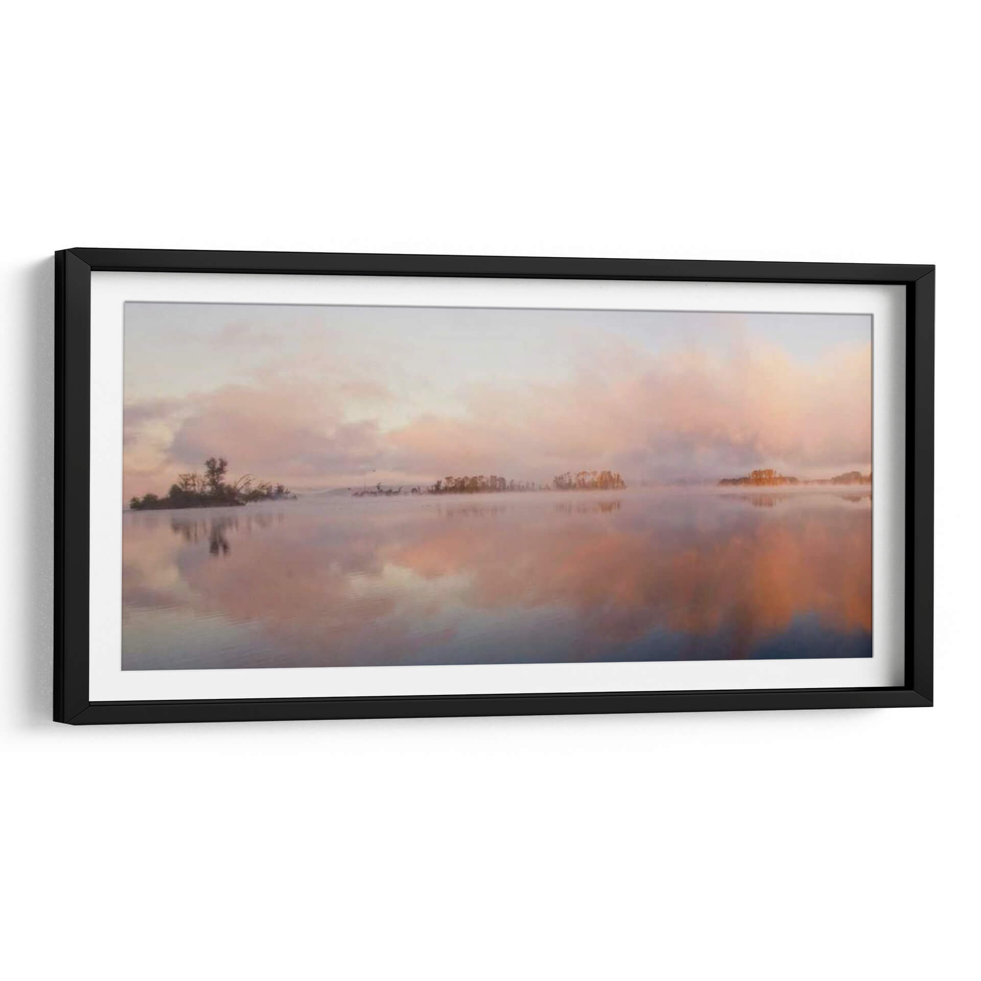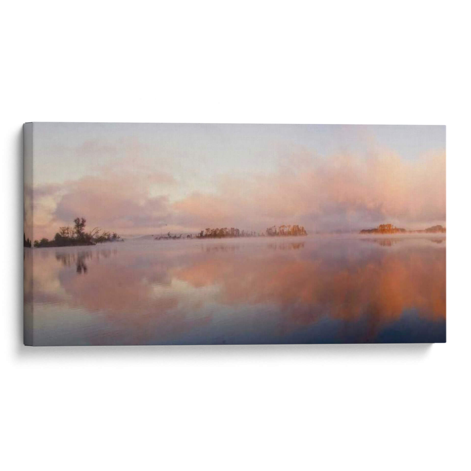 Sumérgete en la serenidad de "El Panorama Islas", una obra de arte que captura la etérea belleza de un amanecer o atardecer sobre aguas tranquilas. El artista Danny Head nos transporta a un paisaje sereno donde suaves brumas se elevan del agua, creando un velo casi místico sobre pequeñas islas boscosas salpicadas en el horizonte. La paleta de colores es un delicado juego de pasteles, con tonos rosados, naranjas y celestes que se funden en el cielo y se reflejan en el espejo del agua, evocando una profunda sensación de paz y calma. Las nubes difusas y la luz tenue contribuyen a una atmósfera onírica, invitando a la contemplación. Este cuadro decorativo es ideal para añadir un toque de tranquilidad y sofisticación a cualquier espacio, ya sea un dormitorio, una sala de estar o un estudio. Su composición panorámica y su estilo evocador lo convierten en una pieza central perfecta para crear un ambiente relajante y acogedor en tu hogar u oficina. Descubre la magia de "El Panorama Islas" y deja que su belleza natural transforme tu entorno.
