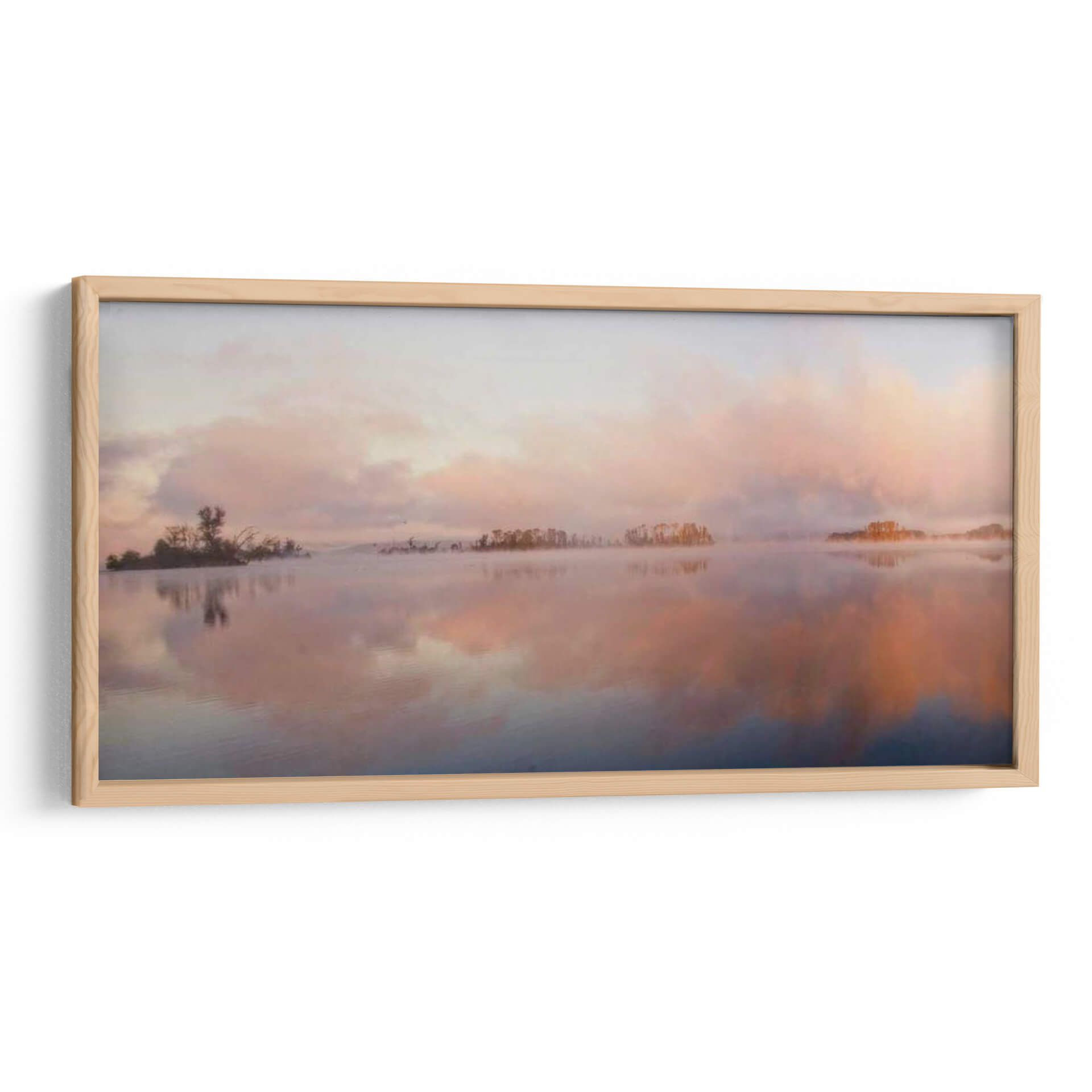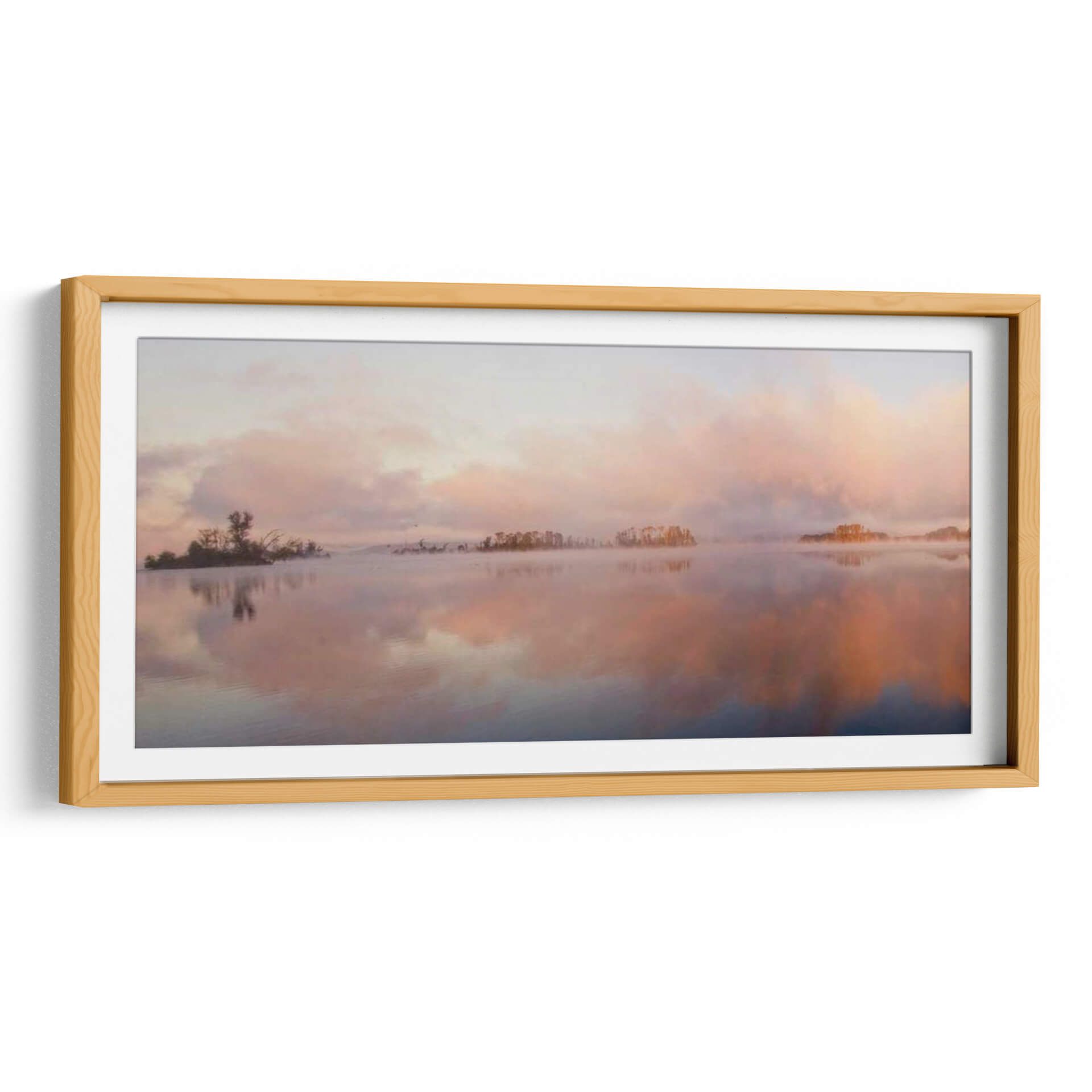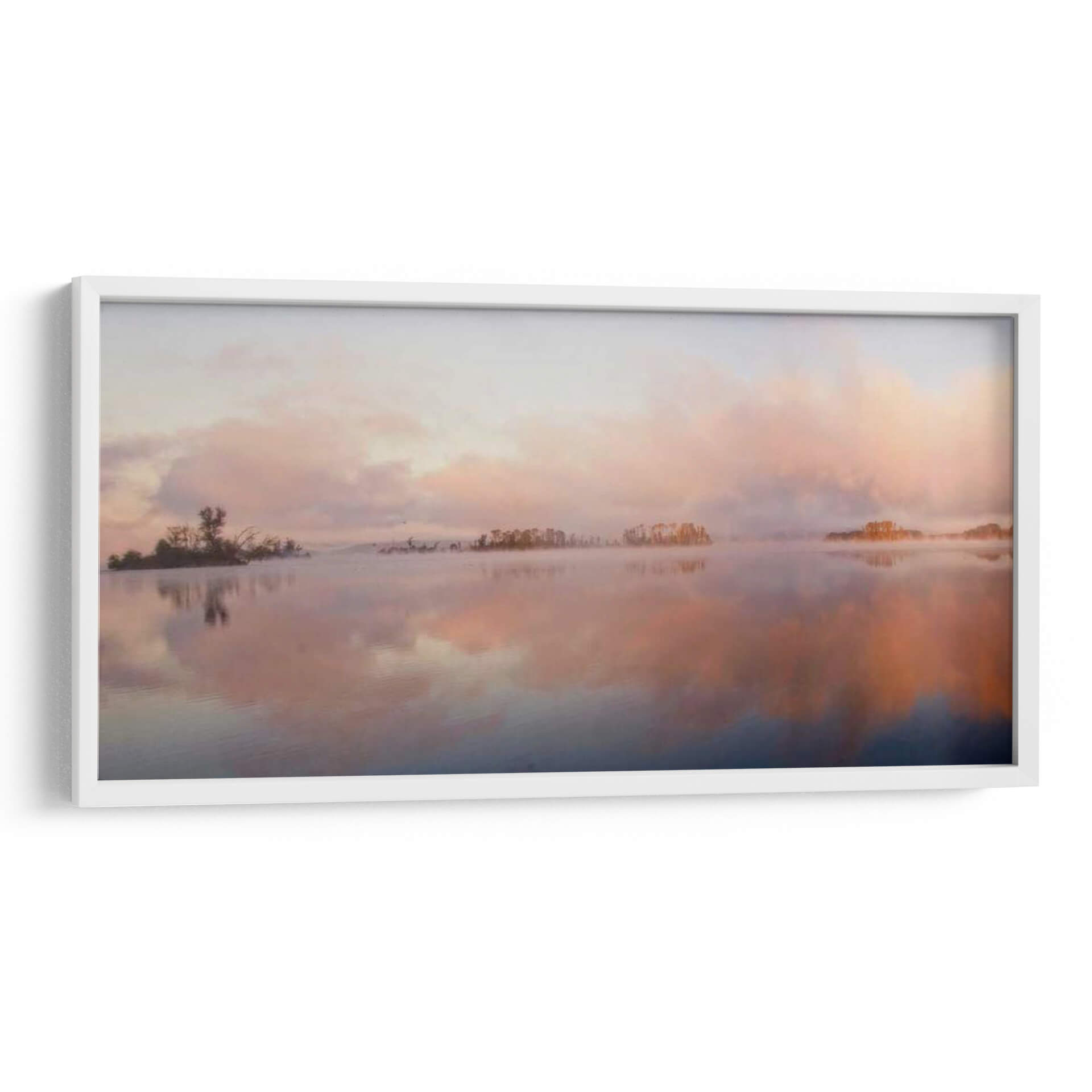 Sumérgete en la serenidad de "El Panorama Islas", una obra de arte que captura la etérea belleza de un amanecer o atardecer sobre aguas tranquilas. El artista Danny Head nos transporta a un paisaje sereno donde suaves brumas se elevan del agua, creando un velo casi místico sobre pequeñas islas boscosas salpicadas en el horizonte. La paleta de colores es un delicado juego de pasteles, con tonos rosados, naranjas y celestes que se funden en el cielo y se reflejan en el espejo del agua, evocando una profunda sensación de paz y calma. Las nubes difusas y la luz tenue contribuyen a una atmósfera onírica, invitando a la contemplación. Este cuadro decorativo es ideal para añadir un toque de tranquilidad y sofisticación a cualquier espacio, ya sea un dormitorio, una sala de estar o un estudio. Su composición panorámica y su estilo evocador lo convierten en una pieza central perfecta para crear un ambiente relajante y acogedor en tu hogar u oficina. Descubre la magia de "El Panorama Islas" y deja que su belleza natural transforme tu entorno.