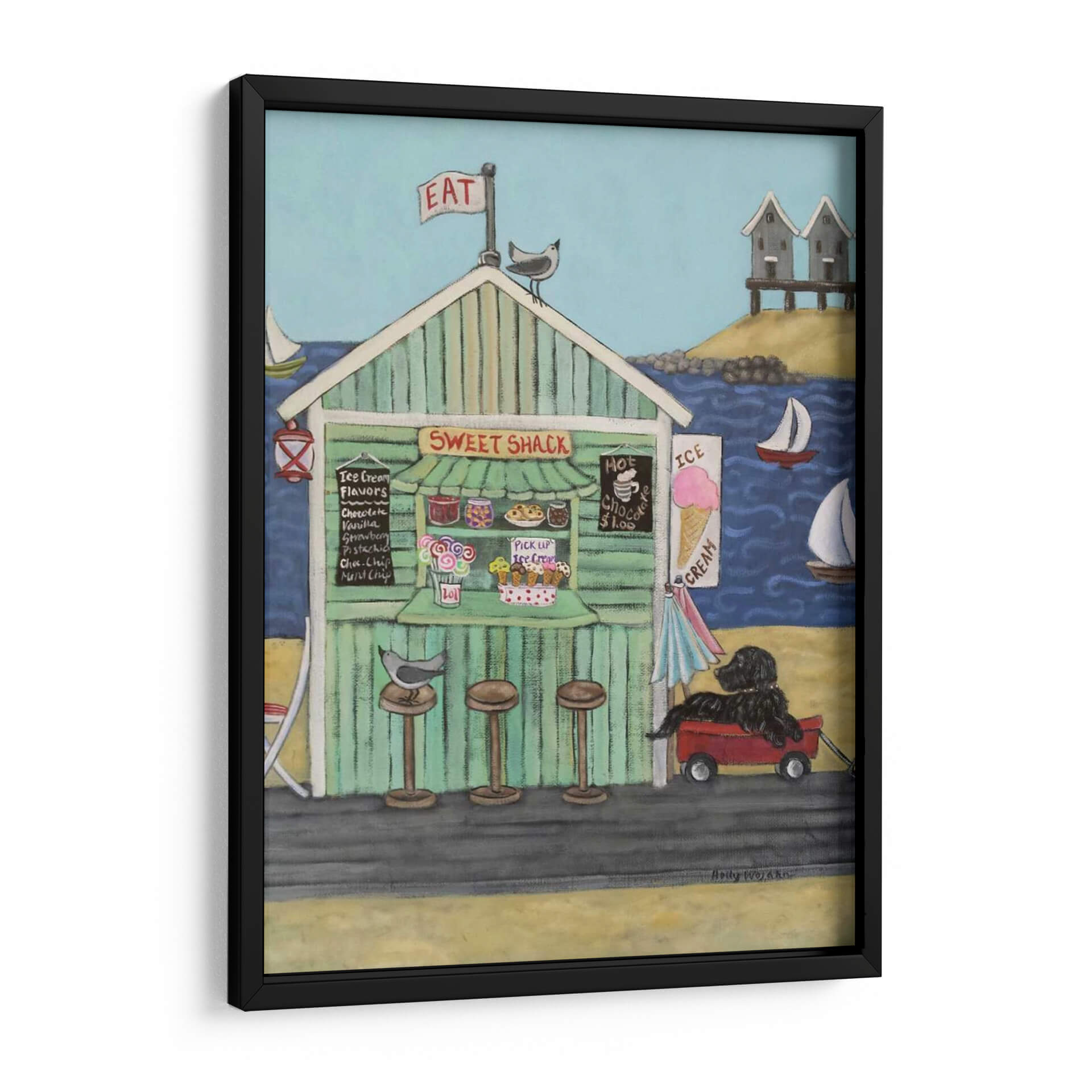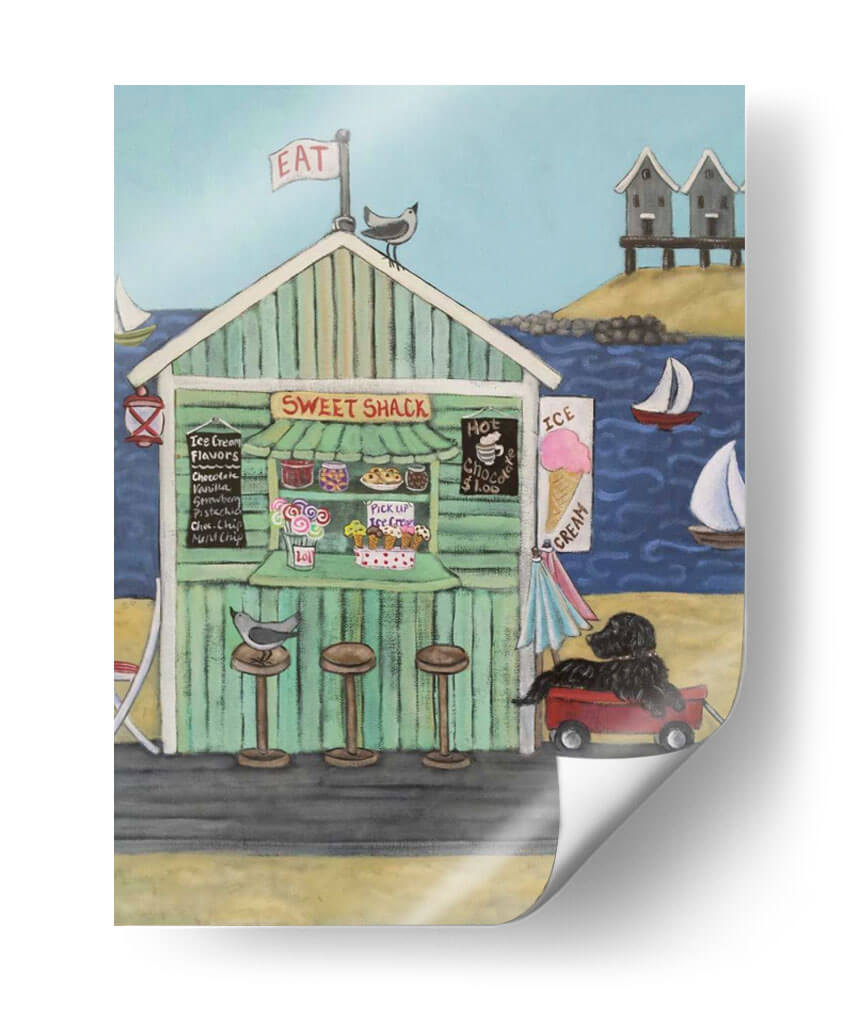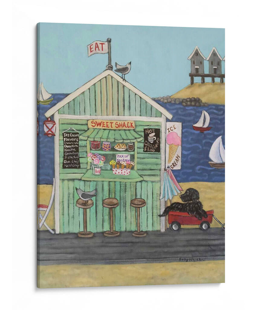 Sumérgete en la nostalgia y el encanto costero con "En La Playa Vi", una obra maestra de Holly Wojahn que captura la esencia de un día perfecto junto al mar. Este cuadro decorativo te transporta a una vibrante caseta de helados, "Sweet Shack", con su fachada a rayas verdes y un cartel que invita a "EAT". La paleta de colores, dominada por azules serenos del océano y el cielo, se complementa con los tonos cálidos y acogedores de la arena y la madera de la caseta, creando una atmósfera de alegría y relajación. La composición presenta detalles entrañables: pájaros curiosos, veleros surcando las olas, y un perro negro fiel esperando pacientemente en un carrito rojo. Las nubes dispersas y las pequeñas cabañas de playa al fondo añaden un toque de autenticidad a la escena. Ideal para espacios que buscan una dosis de optimismo y un aire vacacional, este lienzo es perfecto para salones, cocinas o incluso una habitación infantil, aportando una sensación de calidez y bienvenida. Cada pincelada evoca la simplicidad de los placeres veraniegos y la conexión con la naturaleza.