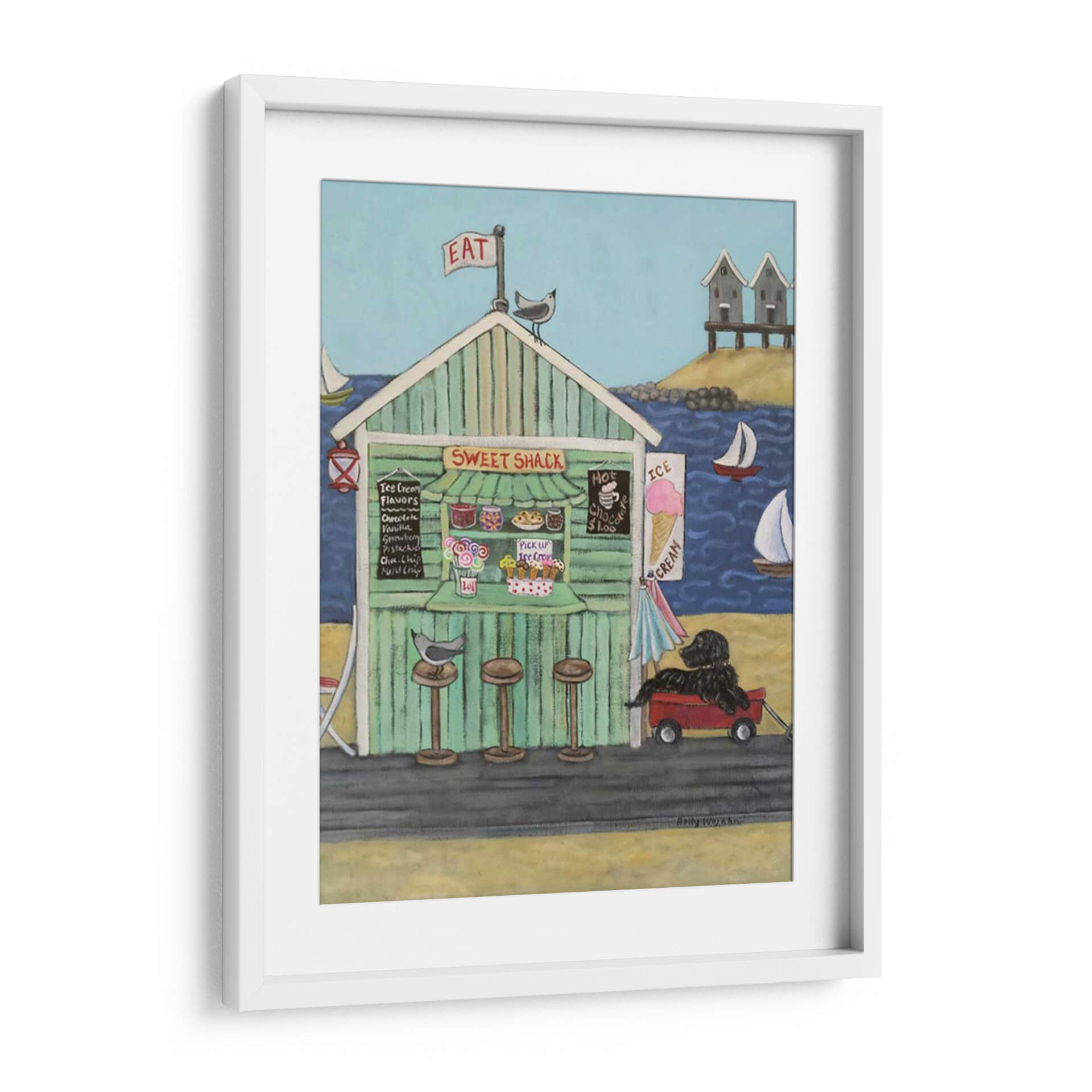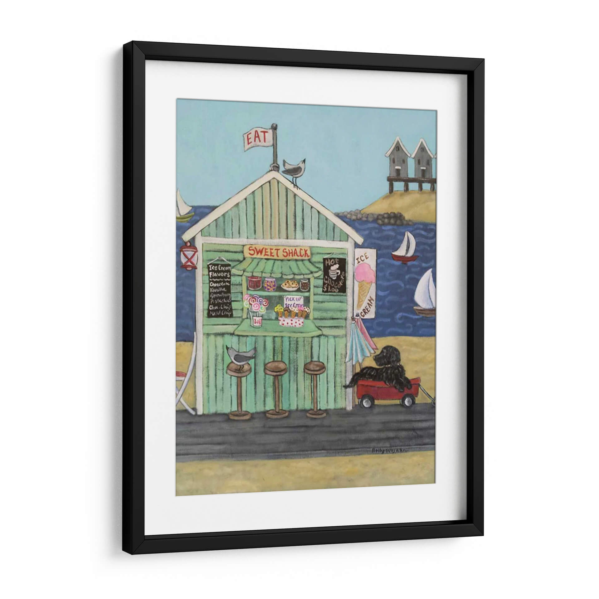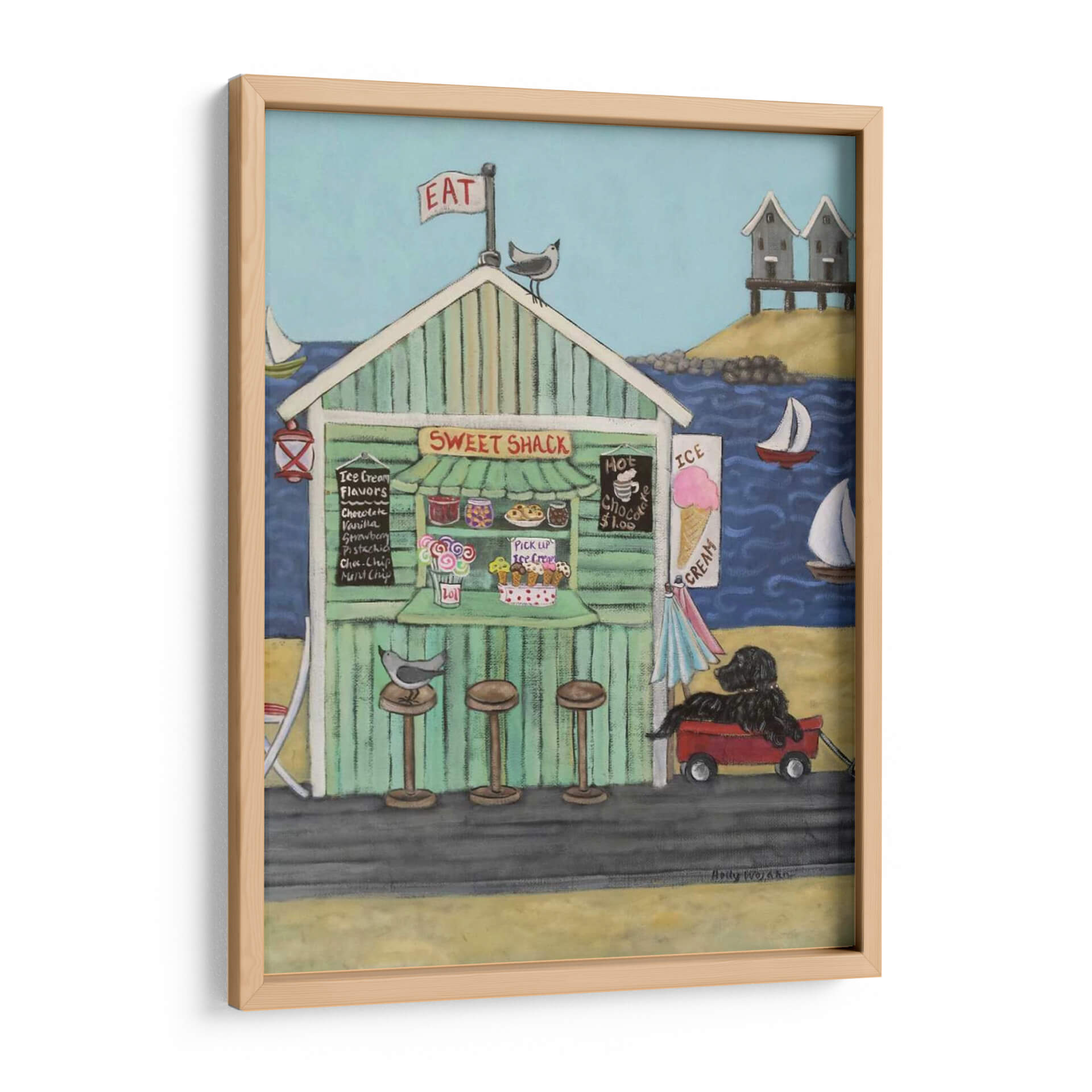 Sumérgete en la nostalgia y el encanto costero con "En La Playa Vi", una obra maestra de Holly Wojahn que captura la esencia de un día perfecto junto al mar. Este cuadro decorativo te transporta a una vibrante caseta de helados, "Sweet Shack", con su fachada a rayas verdes y un cartel que invita a "EAT". La paleta de colores, dominada por azules serenos del océano y el cielo, se complementa con los tonos cálidos y acogedores de la arena y la madera de la caseta, creando una atmósfera de alegría y relajación. La composición presenta detalles entrañables: pájaros curiosos, veleros surcando las olas, y un perro negro fiel esperando pacientemente en un carrito rojo. Las nubes dispersas y las pequeñas cabañas de playa al fondo añaden un toque de autenticidad a la escena. Ideal para espacios que buscan una dosis de optimismo y un aire vacacional, este lienzo es perfecto para salones, cocinas o incluso una habitación infantil, aportando una sensación de calidez y bienvenida. Cada pincelada evoca la simplicidad de los placeres veraniegos y la conexión con la naturaleza.