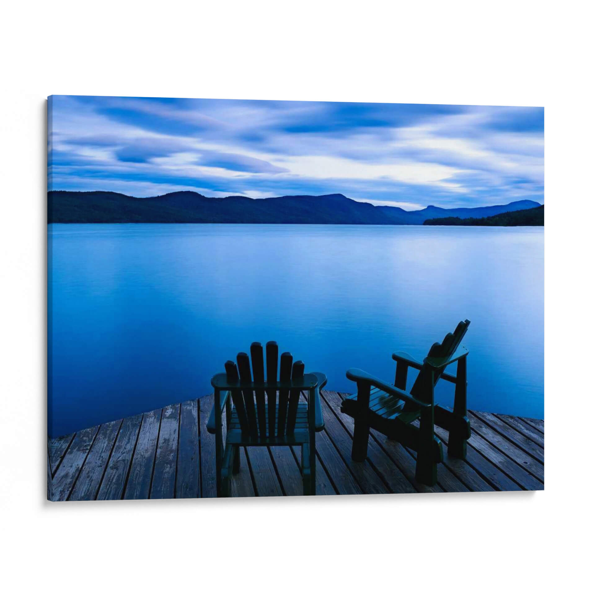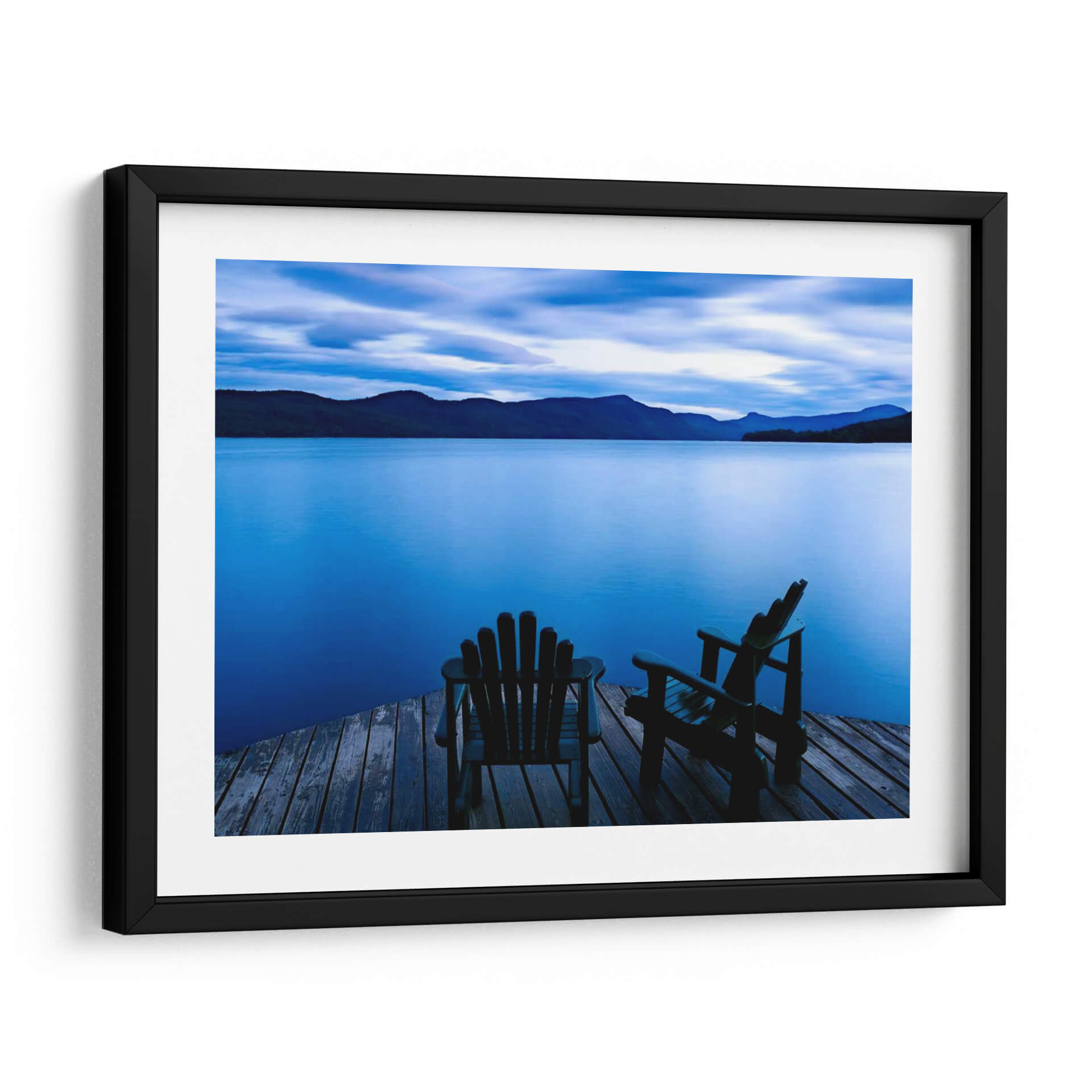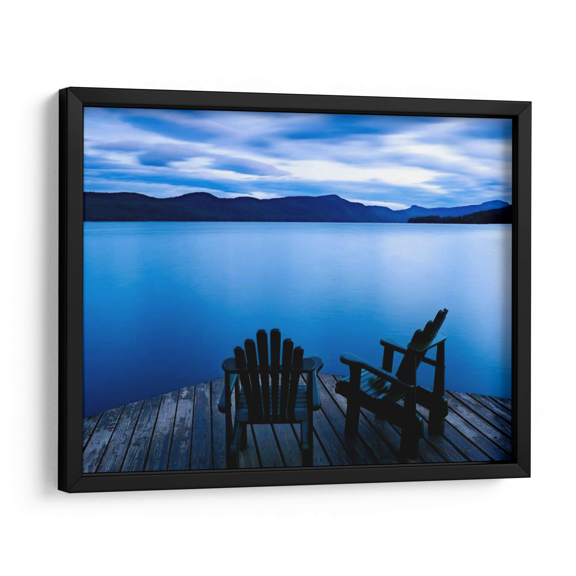 Sumérgete en la serenidad de "Escena En El Agua V", una obra de James McLoughlin que captura la esencia de un atardecer o amanecer tranquilo junto a un lago. La pintura presenta una vasta extensión de agua azul profundo, reflejando un cielo dramático con nubes alargadas y tenues tonos violáceos. En primer plano, un muelle de madera desgastada conduce la mirada hacia dos sillas de Adirondack vacías, invitando a la contemplación y al descanso. Las montañas oscuras y ondulantes en el horizonte añaden profundidad y un sentido de inmensidad al paisaje. La paleta de colores, dominada por azules intensos y sombras profundas, crea una atmósfera de calma y soledad pacífica. Este cuadro decorativo es perfecto para espacios que buscan transmitir paz y conexión con la naturaleza, como un dormitorio, un estudio o una sala de estar donde se desee un refugio visual del ajetreo diario. "Escena En El Agua V" no es solo una imagen, es una invitación a pausar, respirar y disfrutar de la belleza serena del mundo natural, añadiendo un toque de sofisticación y tranquilidad a tu decoración.