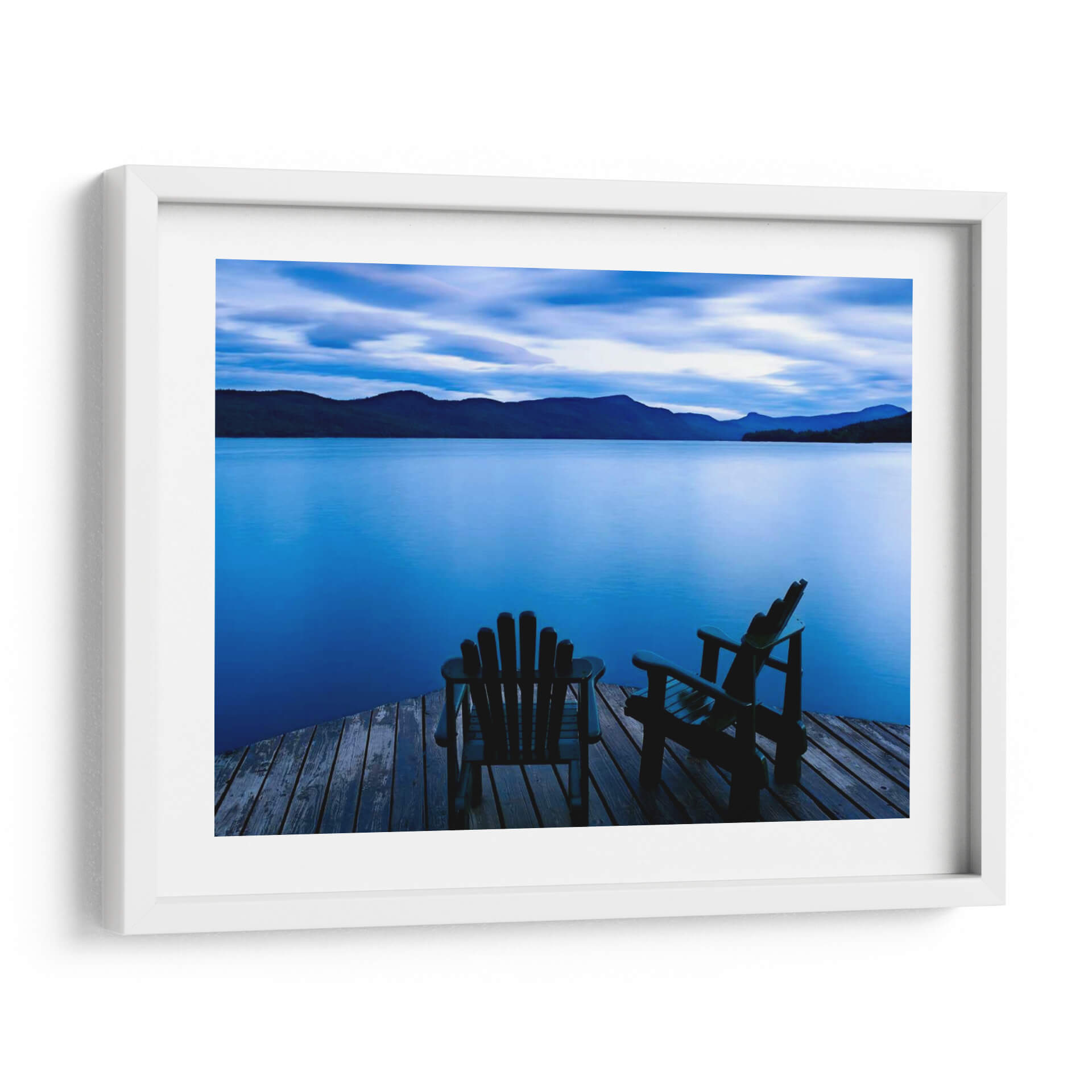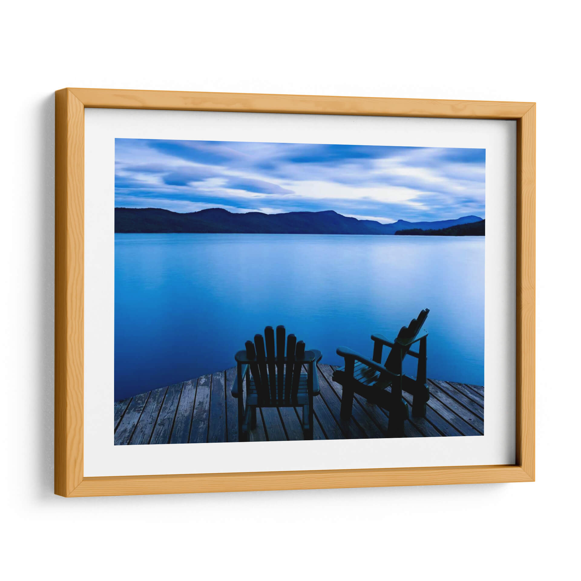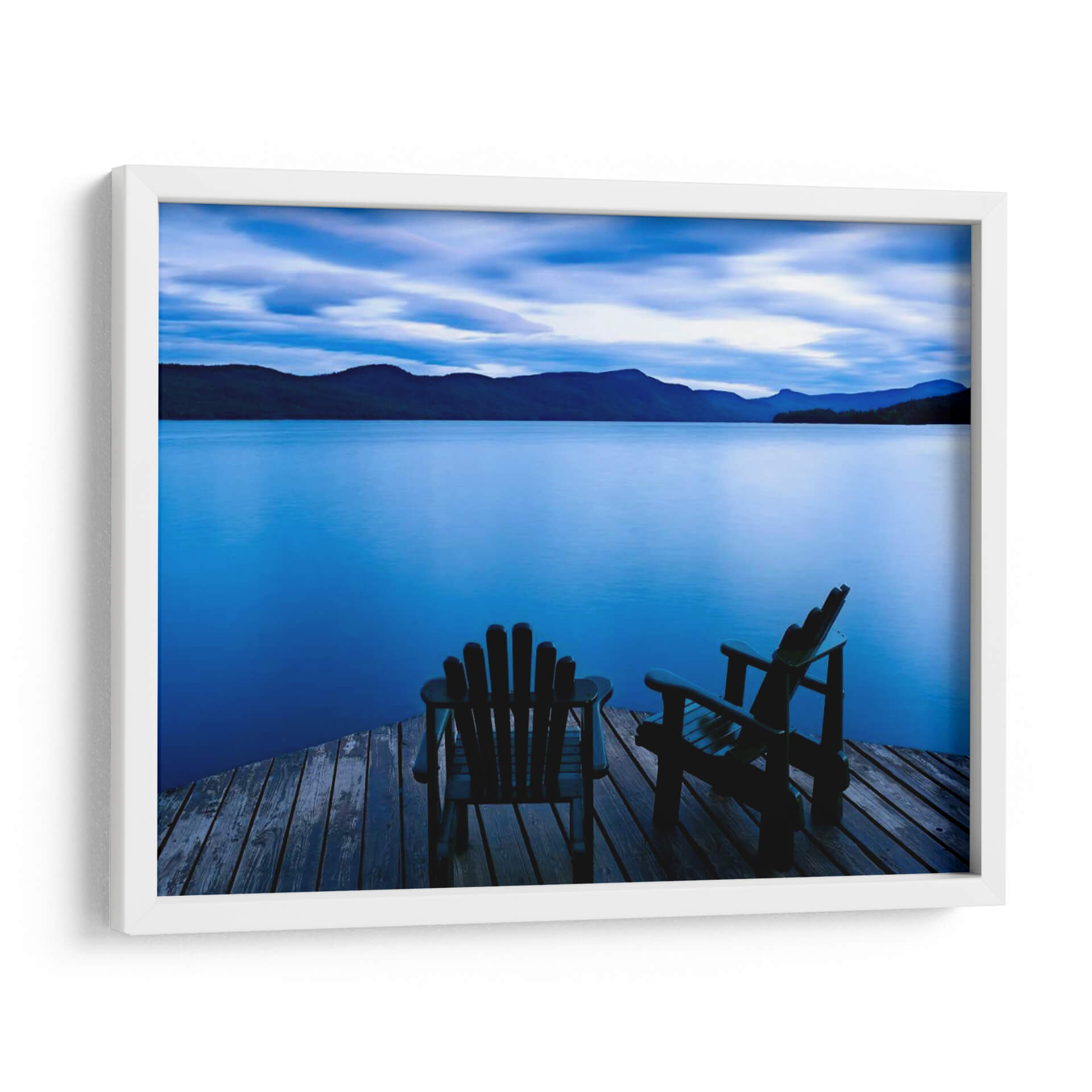 Sumérgete en la serenidad de "Escena En El Agua V", una obra de James McLoughlin que captura la esencia de un atardecer o amanecer tranquilo junto a un lago. La pintura presenta una vasta extensión de agua azul profundo, reflejando un cielo dramático con nubes alargadas y tenues tonos violáceos. En primer plano, un muelle de madera desgastada conduce la mirada hacia dos sillas de Adirondack vacías, invitando a la contemplación y al descanso. Las montañas oscuras y ondulantes en el horizonte añaden profundidad y un sentido de inmensidad al paisaje. La paleta de colores, dominada por azules intensos y sombras profundas, crea una atmósfera de calma y soledad pacífica. Este cuadro decorativo es perfecto para espacios que buscan transmitir paz y conexión con la naturaleza, como un dormitorio, un estudio o una sala de estar donde se desee un refugio visual del ajetreo diario. "Escena En El Agua V" no es solo una imagen, es una invitación a pausar, respirar y disfrutar de la belleza serena del mundo natural, añadiendo un toque de sofisticación y tranquilidad a tu decoración.