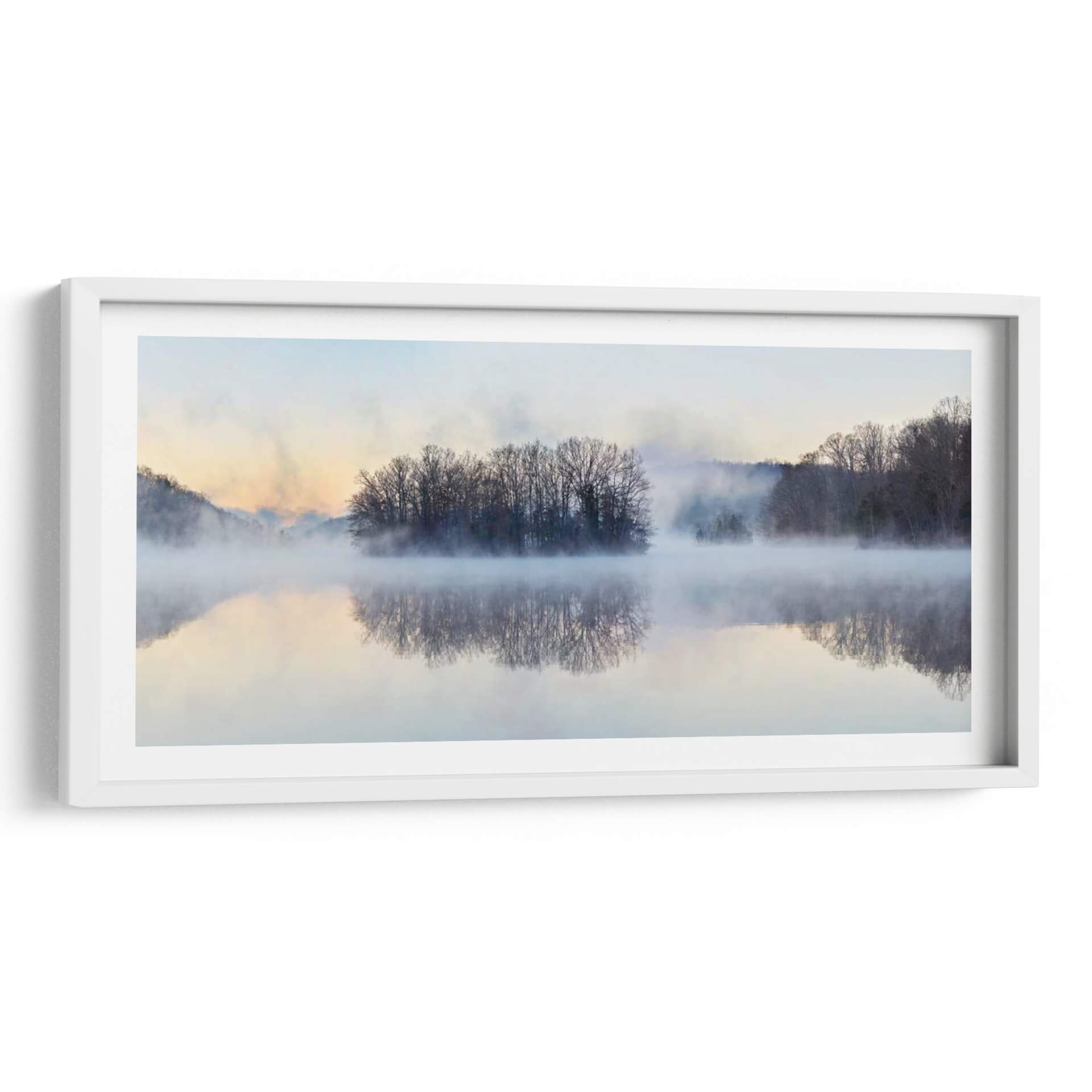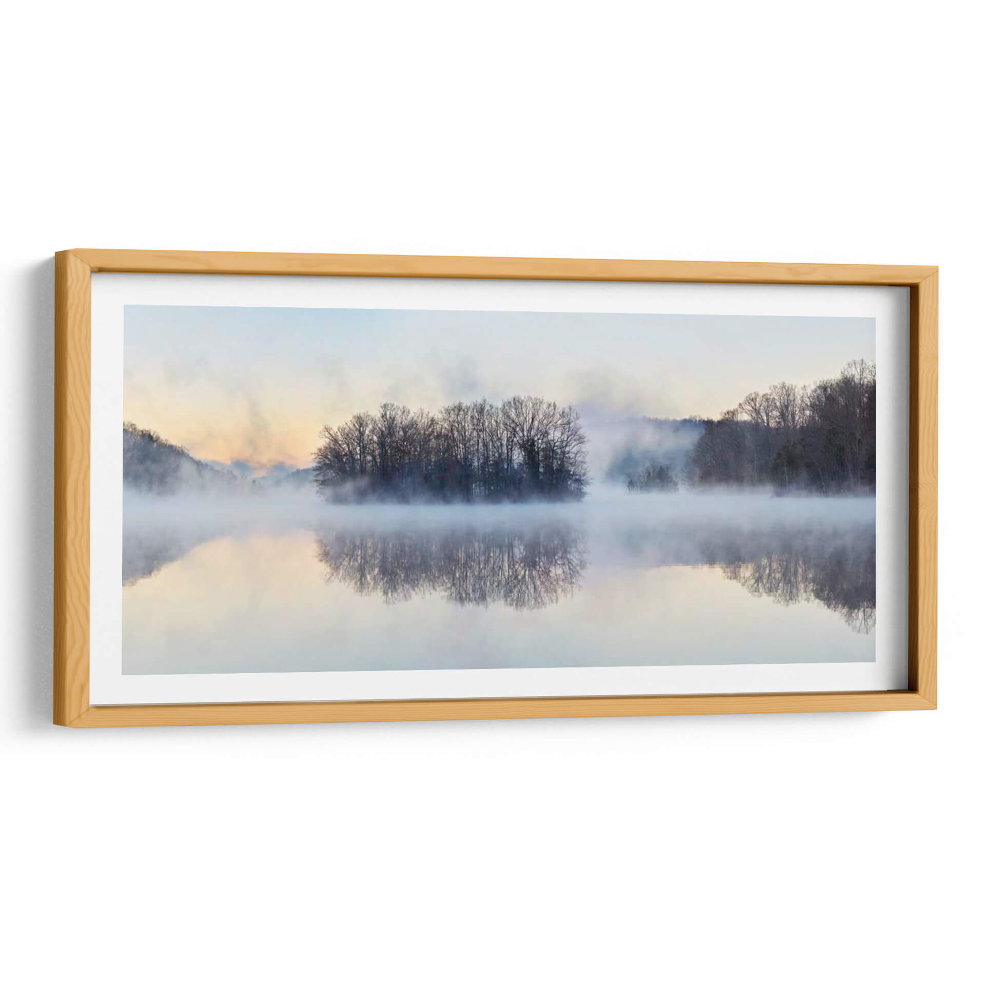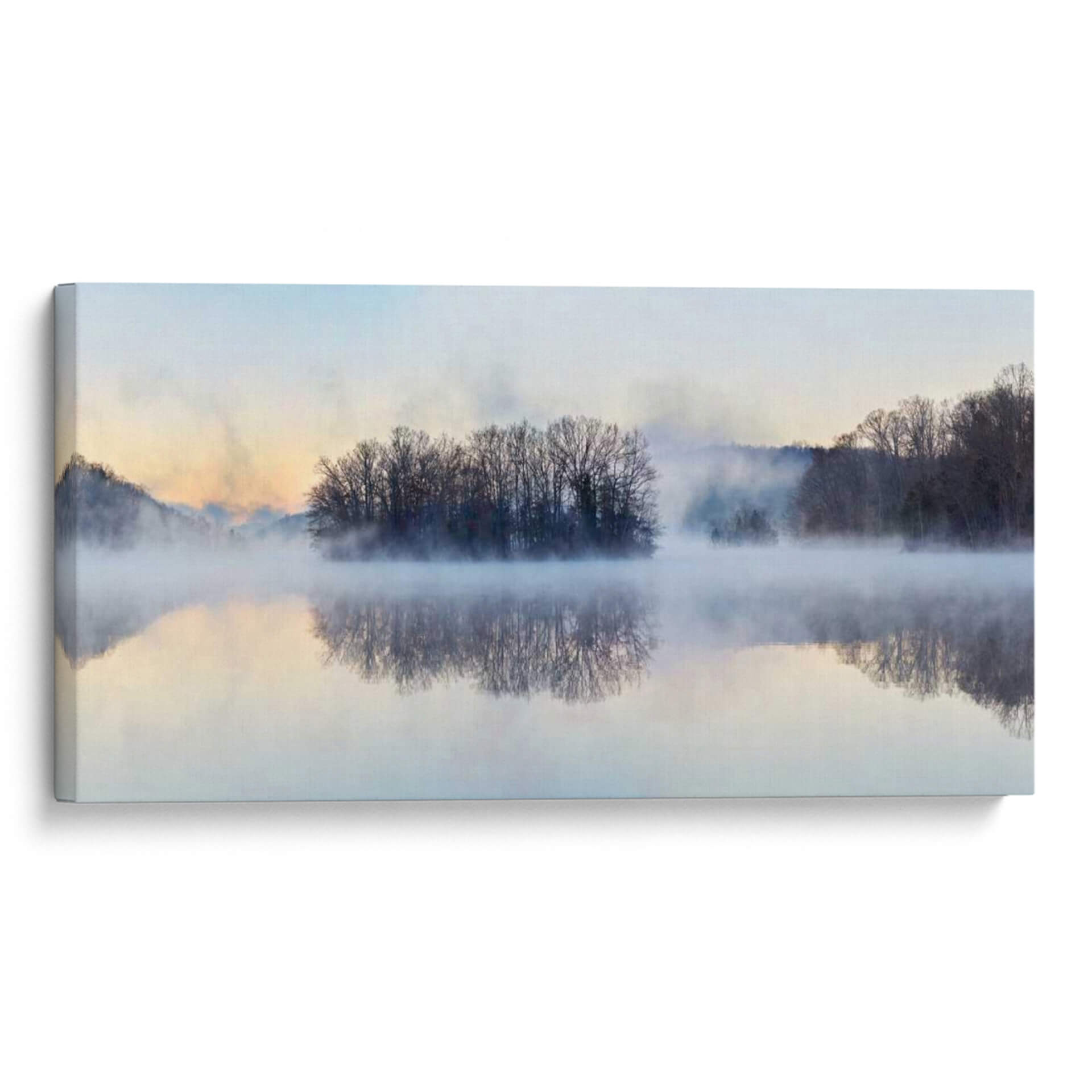 Sumérgete en la serenidad de 'Escena En El Agua VIII', una cautivadora obra de James McLoughlin que captura la etérea belleza de un paisaje acuático al amanecer o atardecer. La pieza se caracteriza por una densa niebla que se eleva desde la superficie del agua, envolviendo un grupo de árboles despojados en la distancia y creando un reflejo casi perfecto en la calma del lago. La paleta de colores es sutil y armoniosa, dominada por tonos pastel de azul cielo, un suave melocotón y blancos cremosos, que evocan una sensación de paz y tranquilidad. La composición horizontal y la profundidad creada por la neblina invitan a la contemplación, haciendo de este cuadro decorativo una adición perfecta para espacios que buscan transmitir calma y conexión con la naturaleza. Ideal para salones, dormitorios o estudios, esta pieza contemporánea aporta un toque de sofisticación natural y serenidad a cualquier ambiente, transformando tu hogar en un refugio de paz. La obra invita a la reflexión y a la introspección, ideal para aquellos que buscan un arte que hable al alma.
