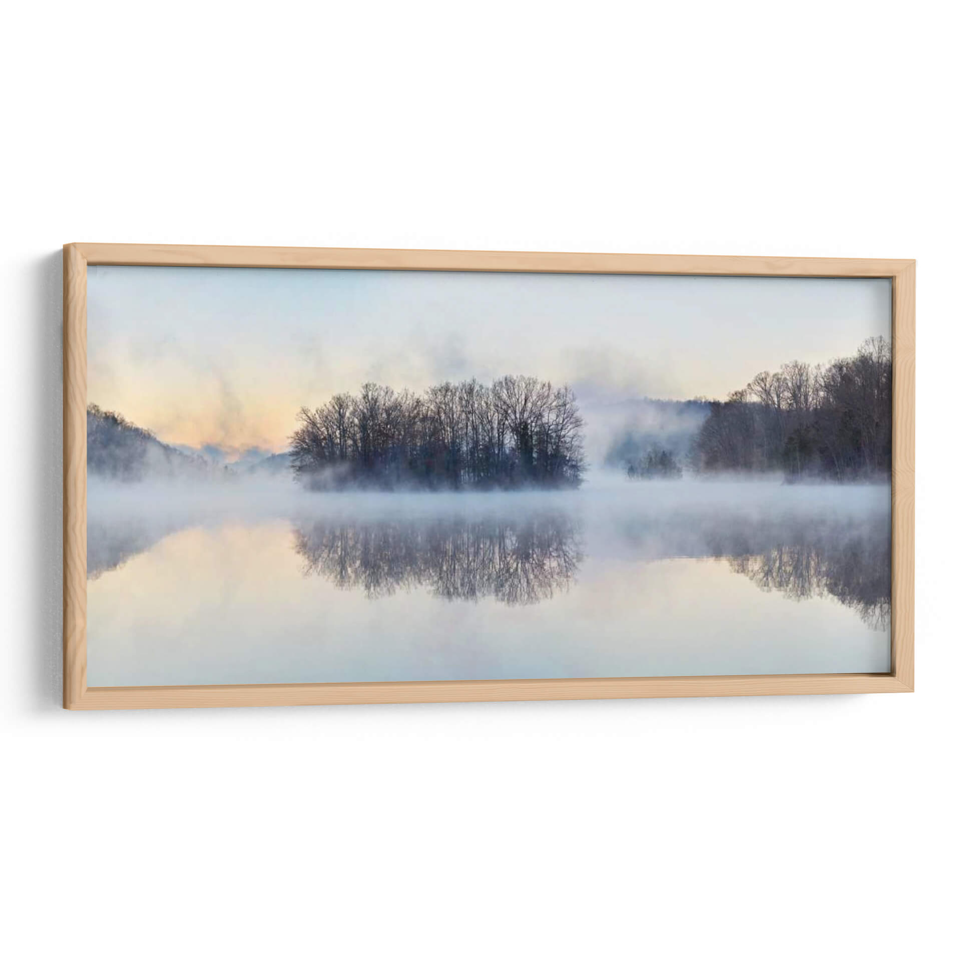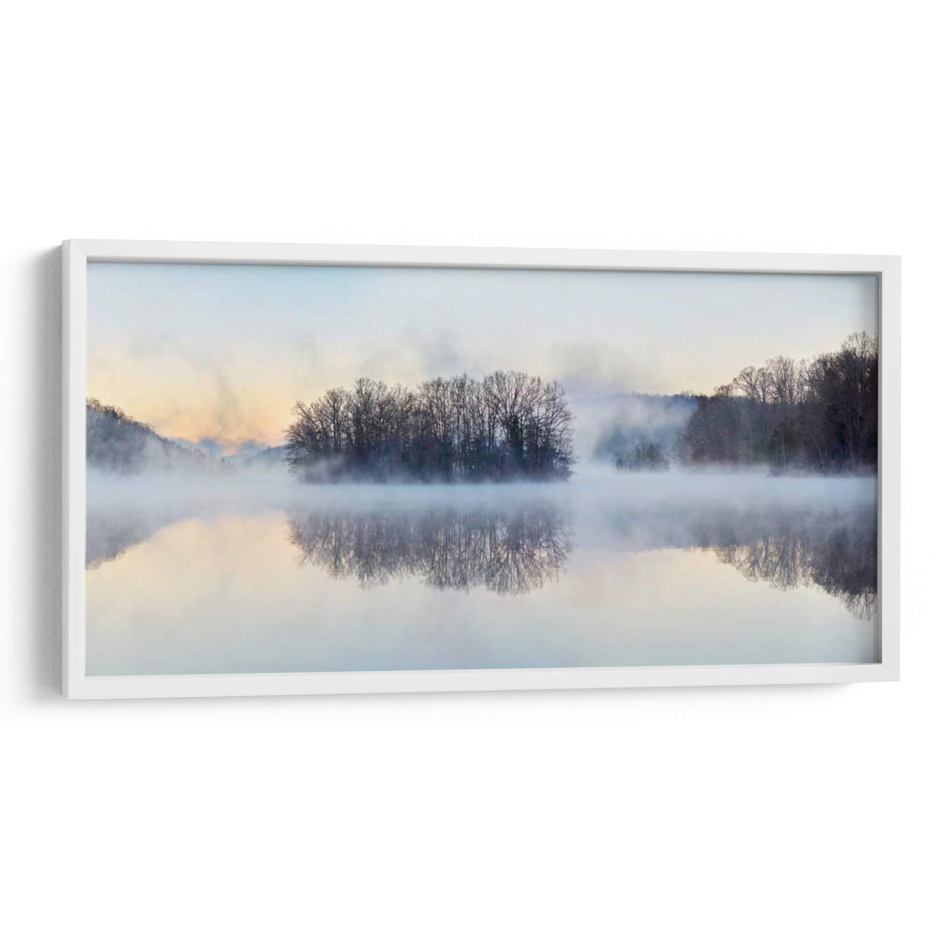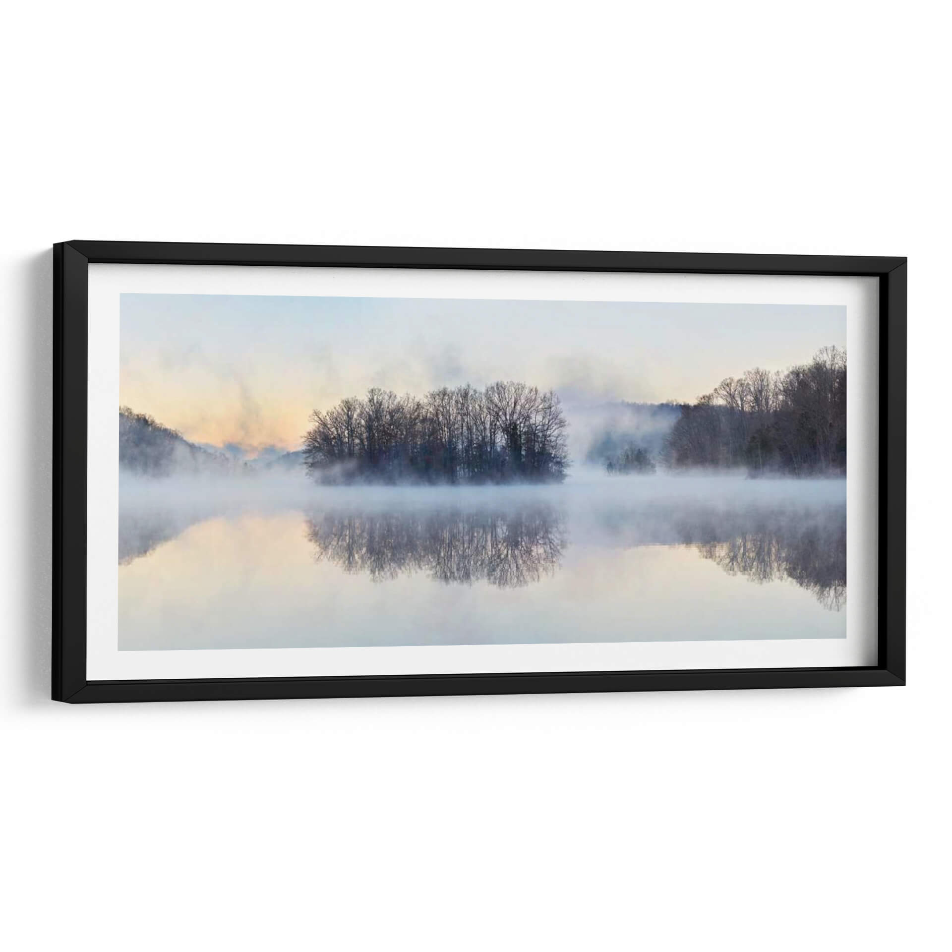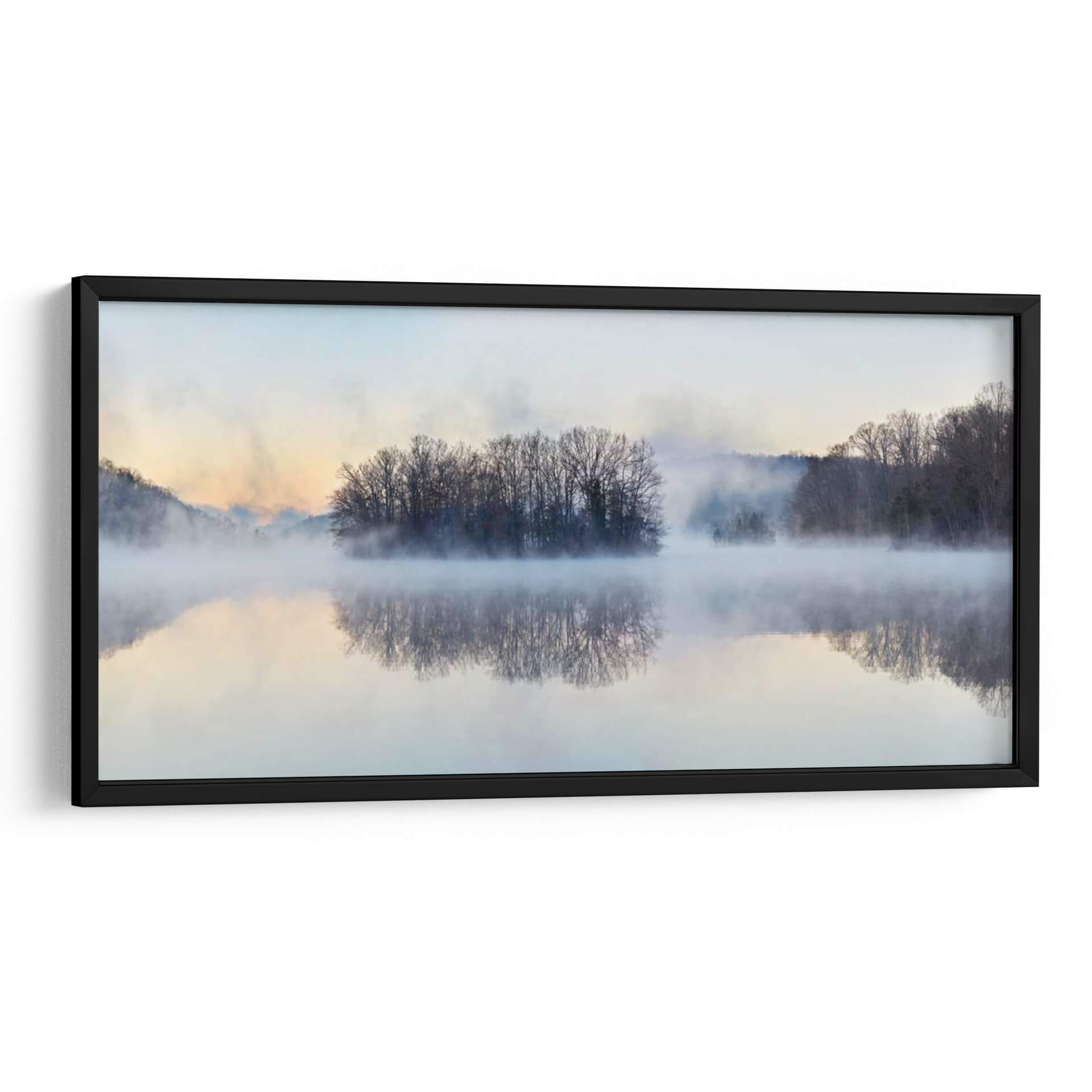 Sumérgete en la serenidad de 'Escena En El Agua VIII', una cautivadora obra de James McLoughlin que captura la etérea belleza de un paisaje acuático al amanecer o atardecer. La pieza se caracteriza por una densa niebla que se eleva desde la superficie del agua, envolviendo un grupo de árboles despojados en la distancia y creando un reflejo casi perfecto en la calma del lago. La paleta de colores es sutil y armoniosa, dominada por tonos pastel de azul cielo, un suave melocotón y blancos cremosos, que evocan una sensación de paz y tranquilidad. La composición horizontal y la profundidad creada por la neblina invitan a la contemplación, haciendo de este cuadro decorativo una adición perfecta para espacios que buscan transmitir calma y conexión con la naturaleza. Ideal para salones, dormitorios o estudios, esta pieza contemporánea aporta un toque de sofisticación natural y serenidad a cualquier ambiente, transformando tu hogar en un refugio de paz. La obra invita a la reflexión y a la introspección, ideal para aquellos que buscan un arte que hable al alma.
