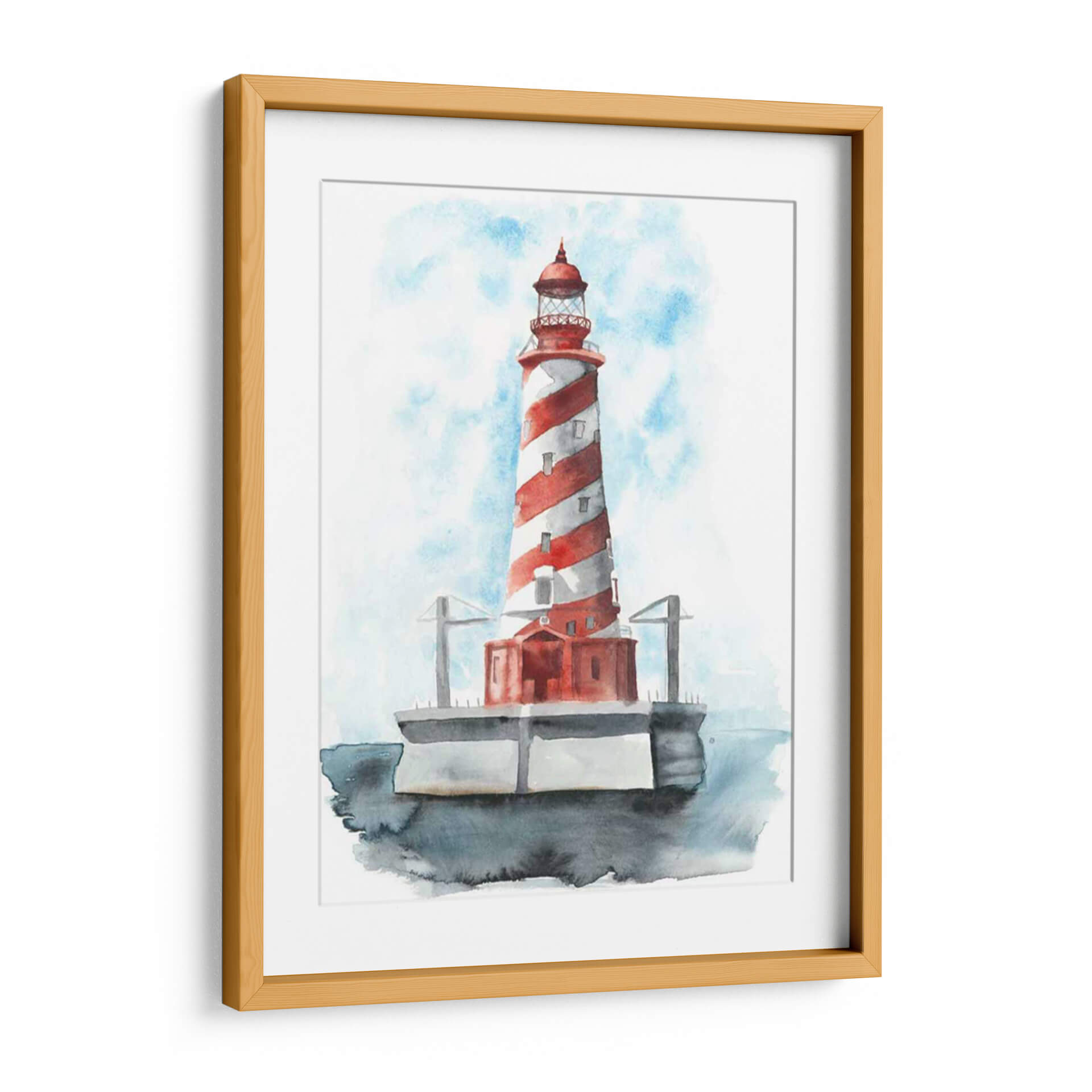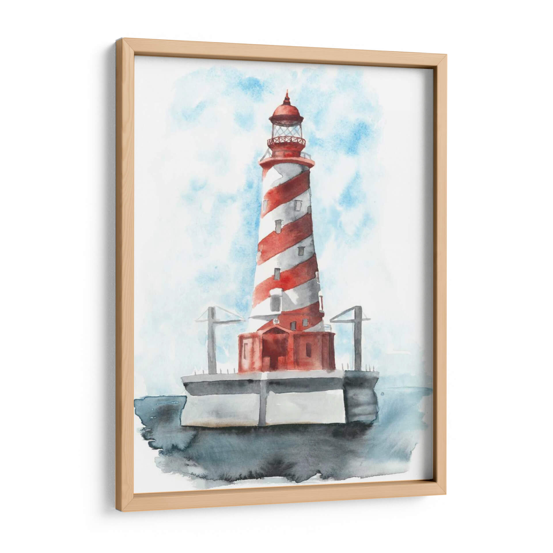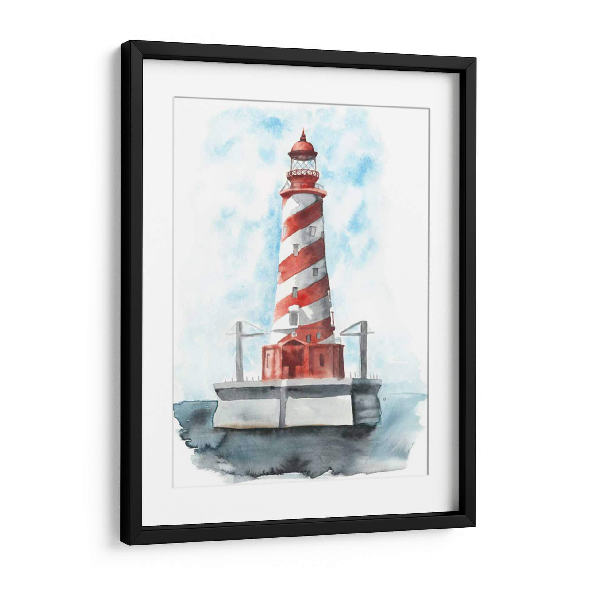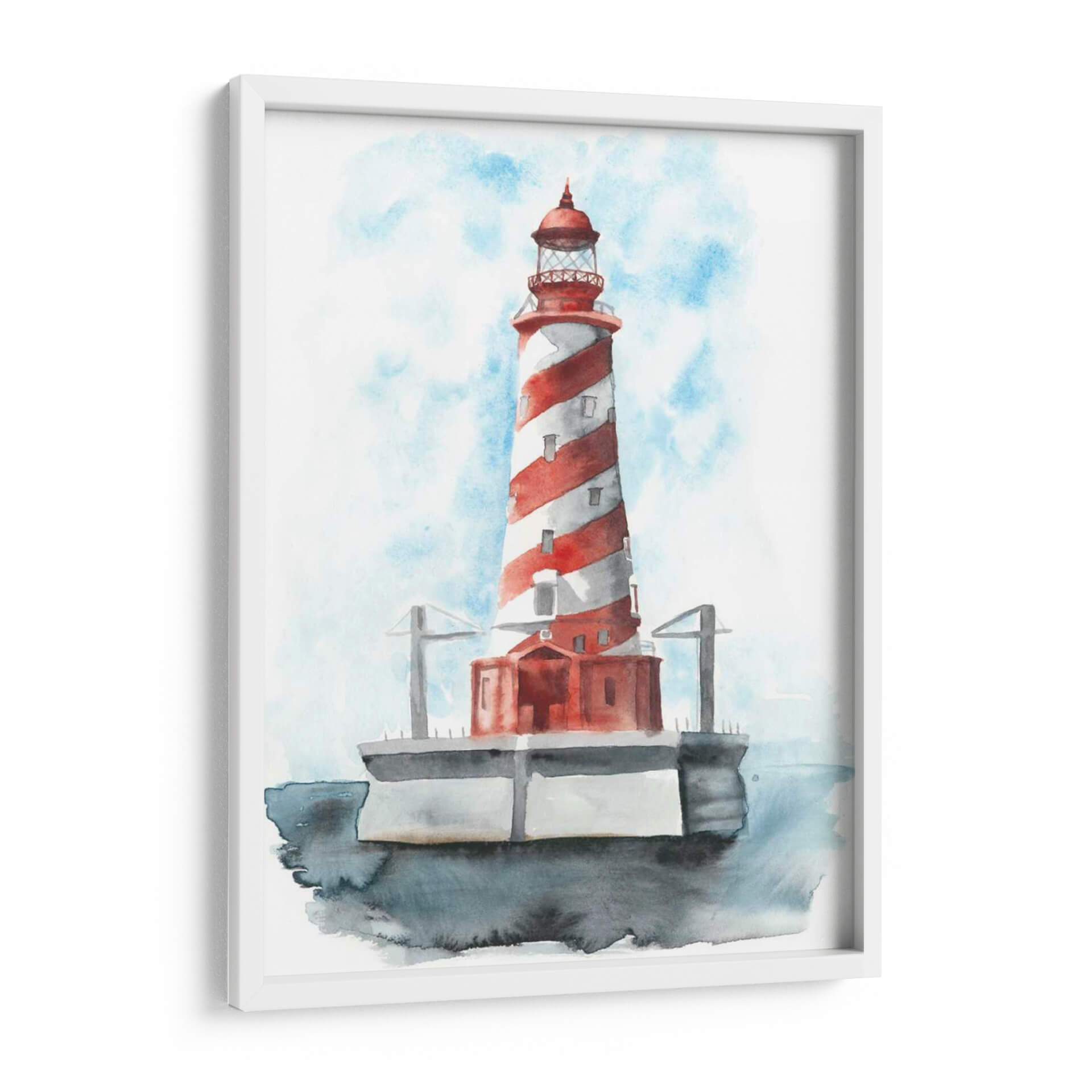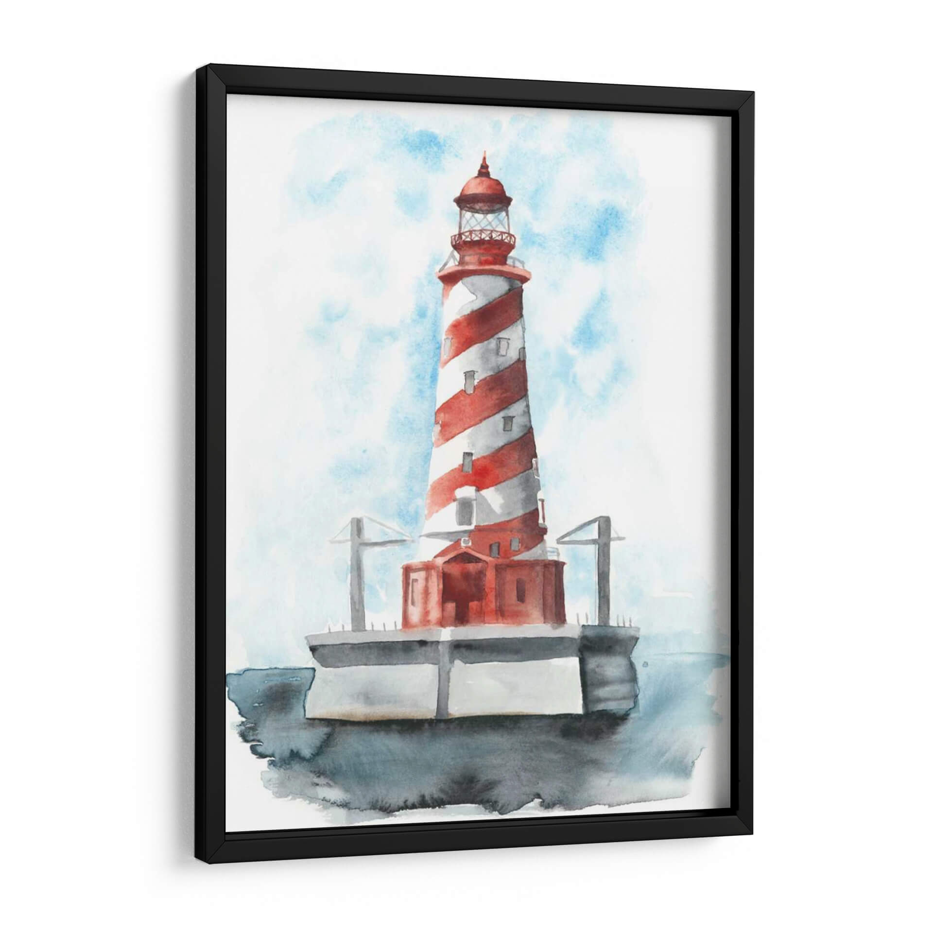 Este cautivador cuadro decorativo, titulado 'Faro De Acuarela Iv' de Naomi McCavitt, evoca la serenidad y la majestuosidad del mar. La obra presenta un faro icónico con un diseño de rayas rojas y blancas, pintado con la delicadeza y fluidez de la técnica de acuarela. Los tonos azules del cielo, con pinceladas que sugieren nubes etéreas, contrastan armoniosamente con el vibrante rojo del faro y los grises sutiles de la base y el agua circundante. La composición centra la atención en la imponente estructura, transmitiendo una sensación de guía, seguridad y tranquilidad. Ideal para quienes buscan añadir un toque costero o náutico a su hogar, este cuadro decorativo es perfecto para salones, dormitorios o incluso oficinas, aportando una atmósfera de calma y contemplación. Su estilo, que combina realismo con la suavidad de la acuarela, lo hace una pieza versátil capaz de complementar diversos estilos de decoración, desde la moderna hasta la más tradicional. Añade una pieza de arte que inspire paz y evoque la belleza atemporal de la costa a tu espacio.