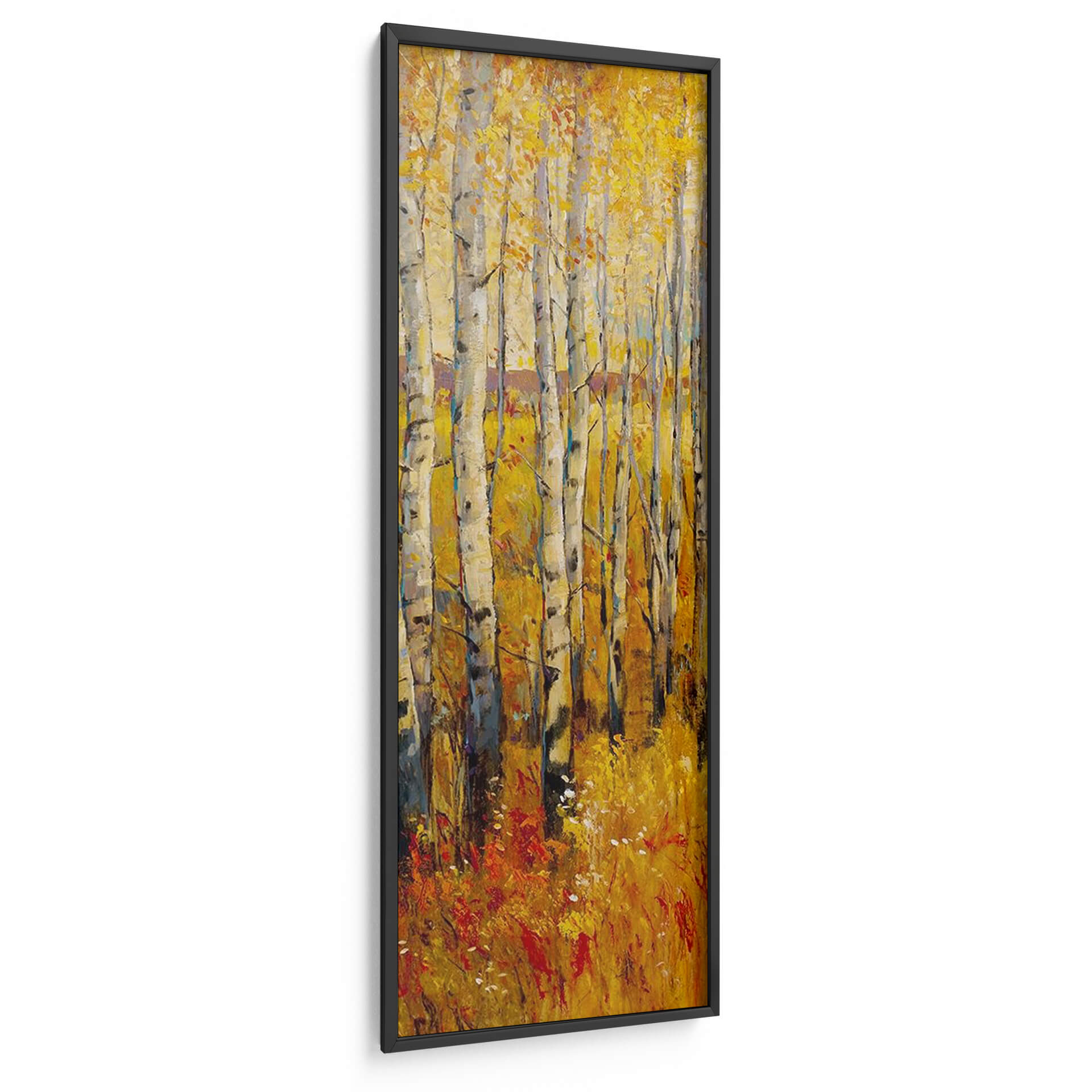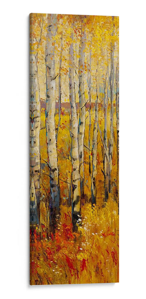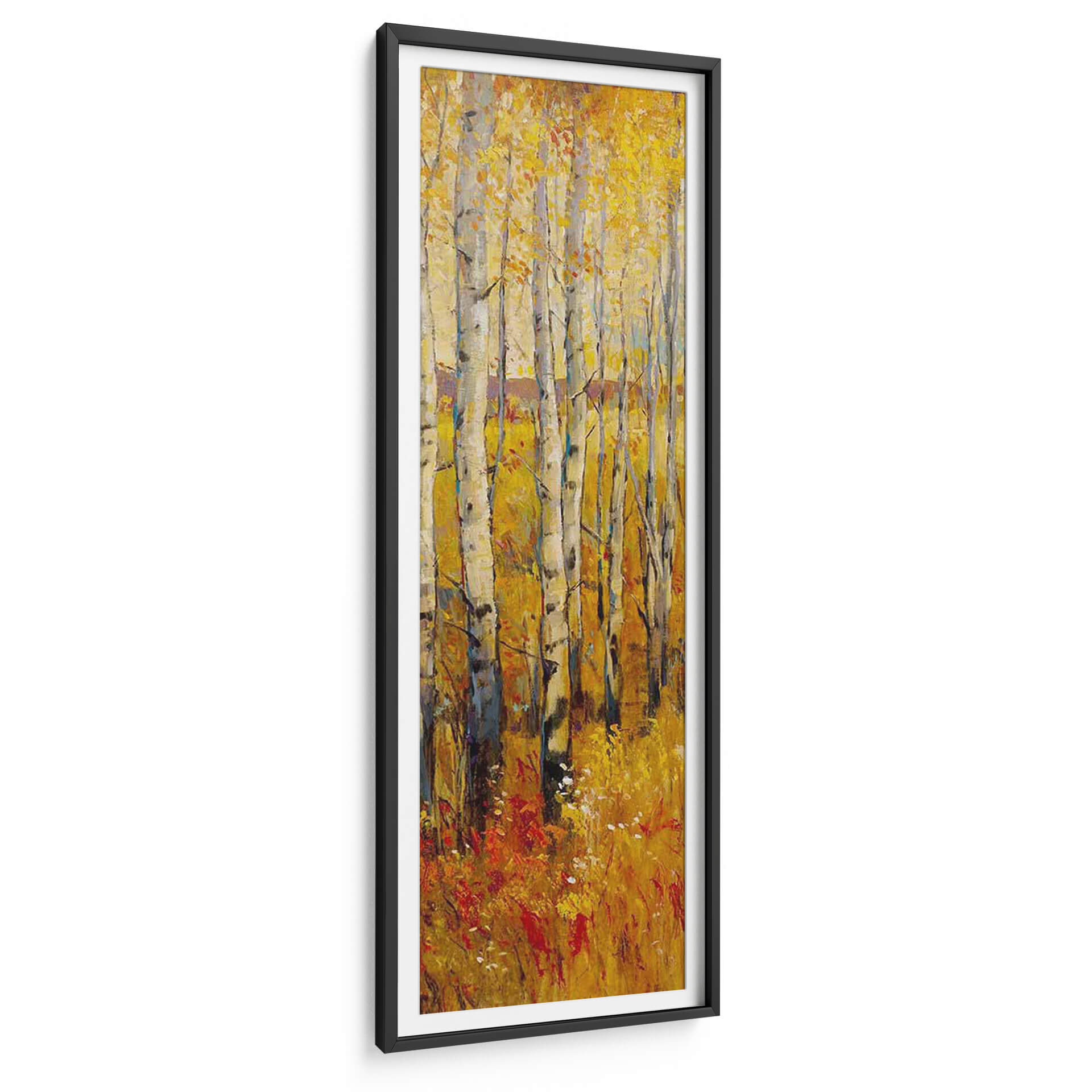 Sumérgete en la vibrante belleza del otoño con "Forest Vivid Birch II", una cautivadora obra de arte de Tim O'Toole. Este cuadro decorativo captura la esencia de un bosque de abedules en su máximo esplendor otoñal, con una explosión de colores cálidos que invitan a la contemplación. La paleta de colores se centra en dorados intensos, ocres y naranjas vibrantes, salpicados con toques de verde y rojo en la hojarasca, creando una atmósfera de energía y vitalidad. Los troncos de abedul, representados con trazos audaces y texturizados, aportan un contraste de grises y blancos que anclan la composición. El estilo impresionista de O'Toole da vida a la escena, invitando al espectador a sentir la brisa otoñal y el crujir de las hojas bajo los pies. Esta pieza es ideal para añadir un toque de calidez y naturaleza a cualquier espacio, transformando salones, comedores u oficinas en un refugio sereno y lleno de vida. Su formato vertical la hace perfecta para pasillos o espacios estrechos que buscan un impacto visual. "Forest Vivid Birch II" no es solo una decoración, es una invitación a conectar con la naturaleza y la intensidad de la temporada más colorida del año.