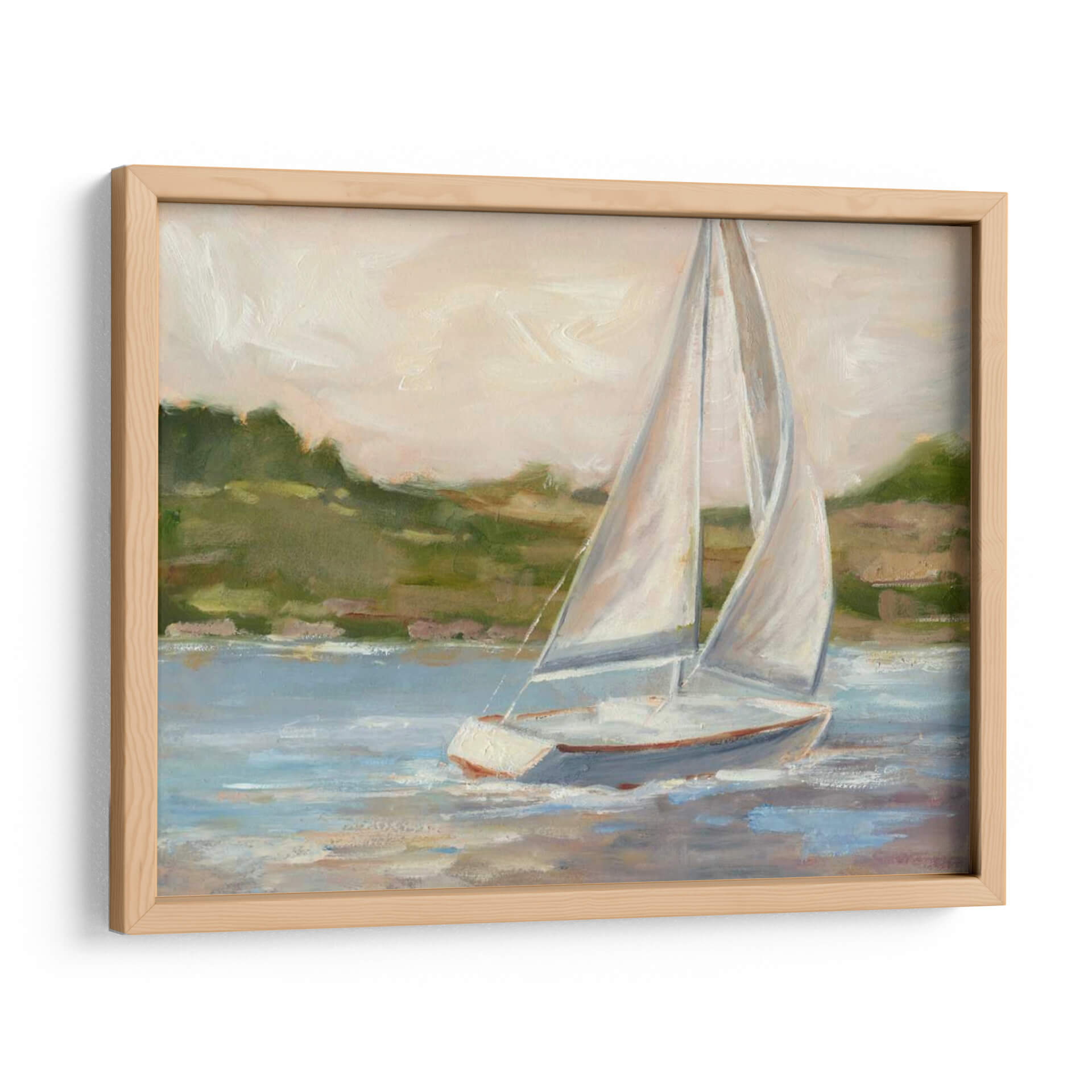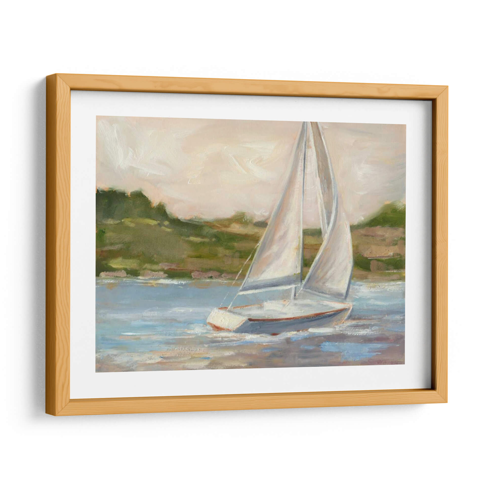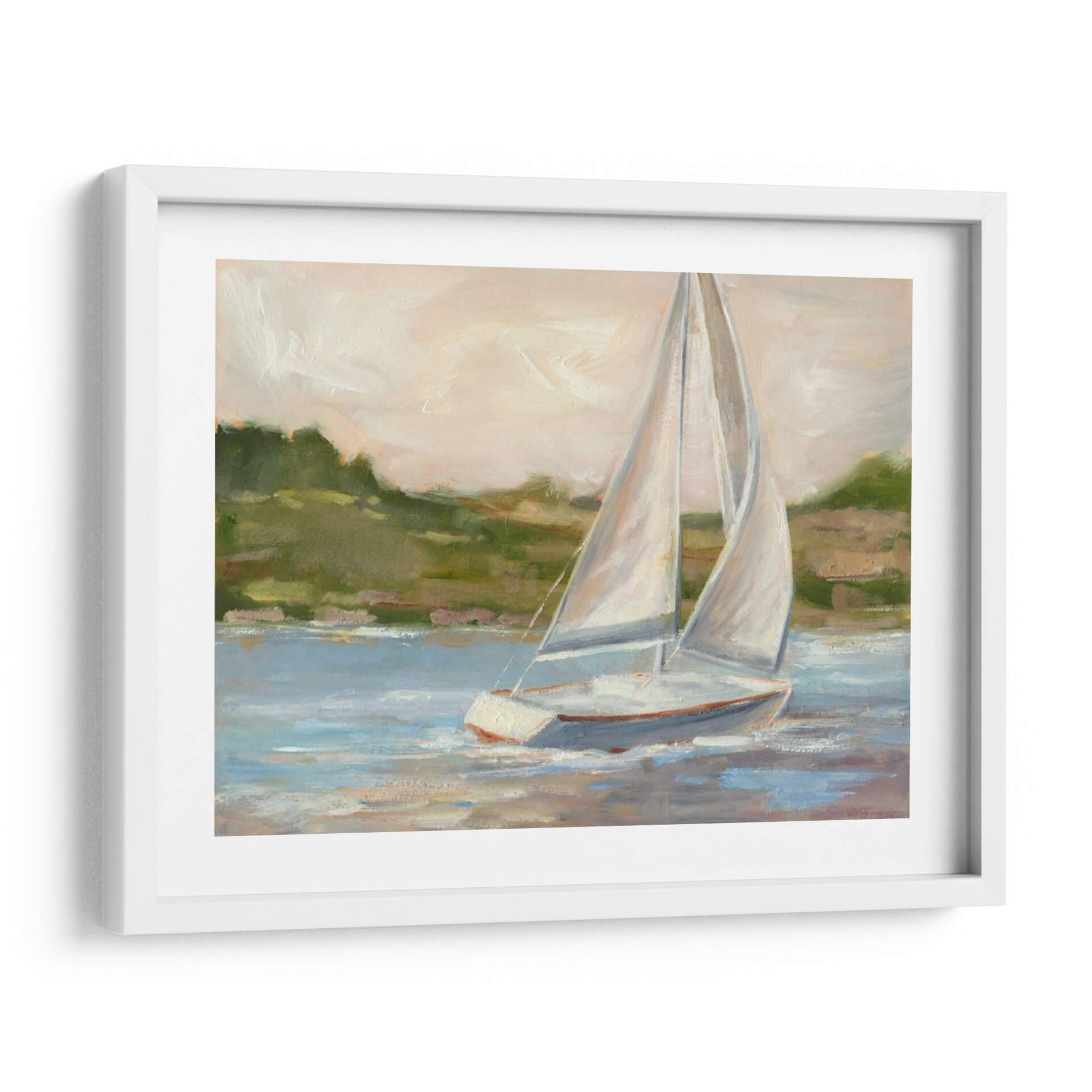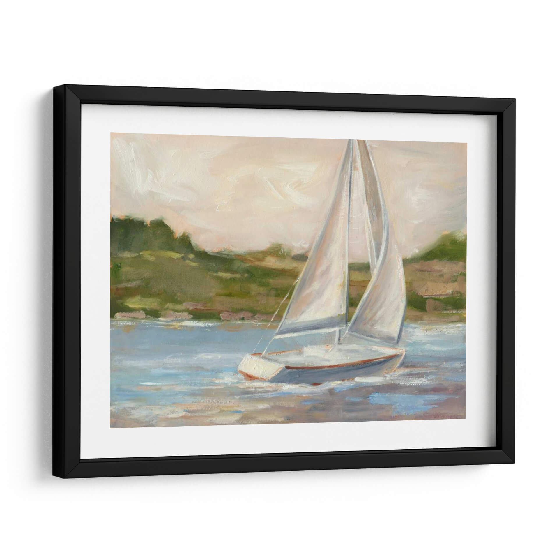 Navega hacia la serenidad con "Fuera De La Costa II", una cautivadora obra de arte de Ethan Harper que captura la esencia de un día tranquilo en el mar. Este cuadro decorativo presenta un elegante velero solitario, con sus velas blancas infladas por la brisa, deslizándose sobre aguas serenas de tonos azules y grises. El artista emplea una paleta de colores suaves y etéreos, con toques de verde terroso en el paisaje costero de fondo y un cielo que se desvanece en tonos pálidos de melocotón y crema. Las pinceladas, de estilo impresionista, aportan una textura rica y una sensación de movimiento, invitando a la contemplación y la calma. "Fuera De La Costa II" es ideal para añadir un toque de elegancia costera y tranquilidad a cualquier espacio, ya sea un dormitorio, una sala de estar o un estudio. Su composición equilibrada y su atmósfera pacífica lo convierten en una pieza versátil que evoca sensaciones de libertad, aventura y escape. Descubre la belleza atemporal de la navegación y transforma tu hogar en un refugio de paz con este exquisito cuadro decorativo.