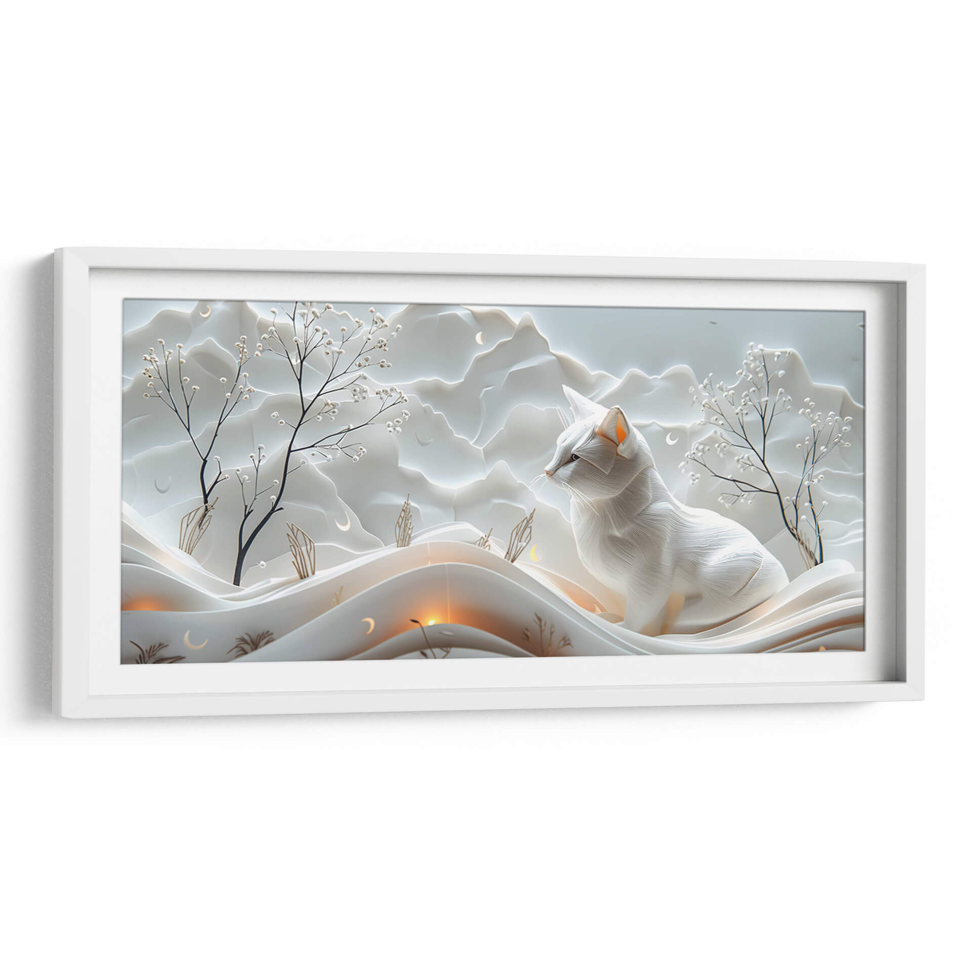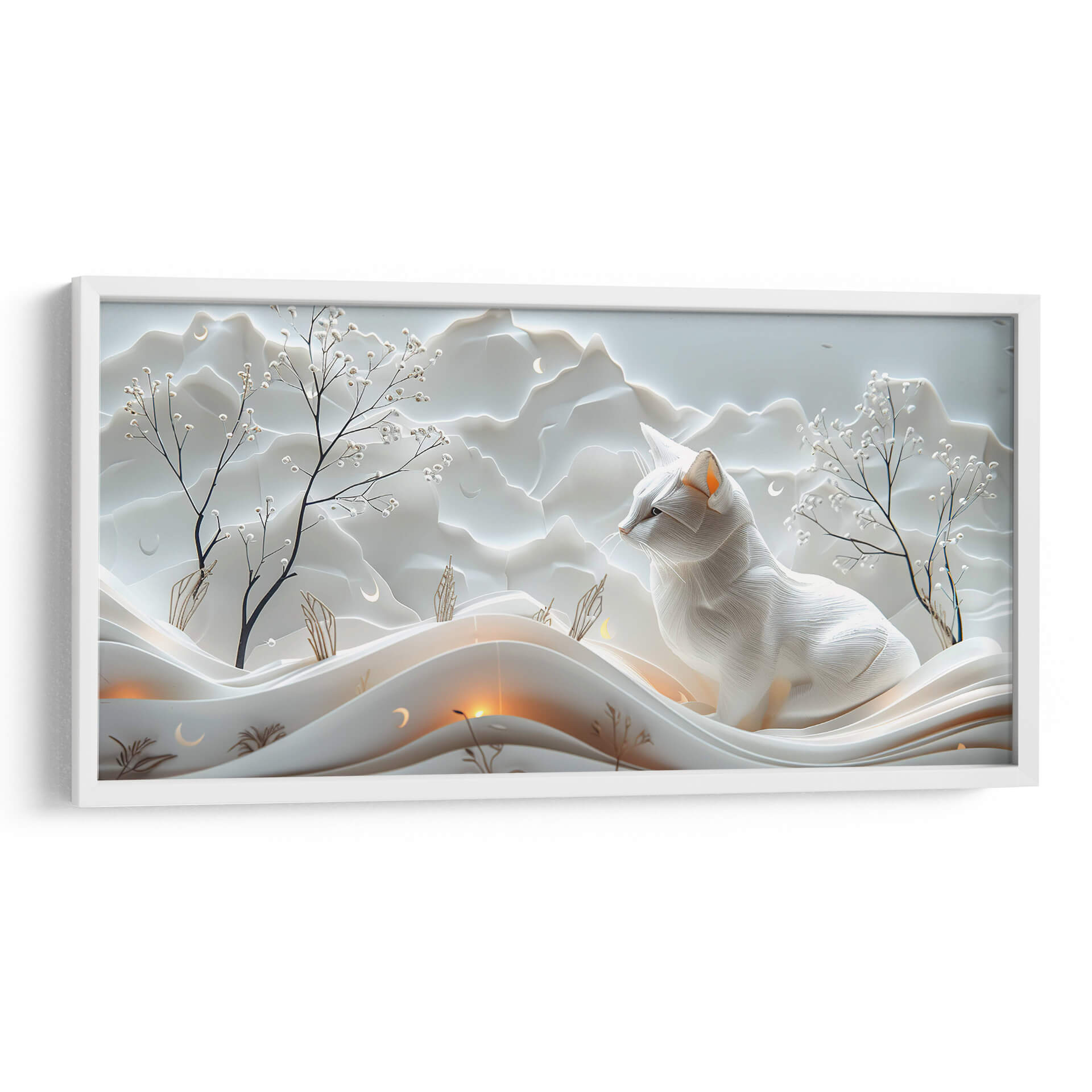 Sumérgete en la serenidad y el misterio con "Gato en el Bosque", una obra de arte digital de Cecilia Flores que captura la esencia de un felino en un paisaje onírico y etéreo. Esta pieza se distingue por su paleta de colores predominantemente blancos y grises suaves, con sutiles toques de luz cálida que emergen del paisaje, creando un contraste hipnotizante. Las formas curvas y las texturas que simulan papel o tela dan vida a un bosque estilizado, donde delicadas ramas con pequeñas flores blancas se alzan contra un fondo montañoso abstracto. El gato, figura central, irradia una elegancia tranquila y una curiosidad cautivadora, sus líneas suaves se fusionan con el entorno hasta casi hacerlo parte de él. Ideal para espacios que buscan un toque de calma y sofisticación, este cuadro decorativo es perfecto para añadir un elemento de ensueño a tu sala de estar, dormitorio o estudio. Su diseño único y su atmósfera pacífica lo convierten en una adición memorable a cualquier colección de arte contemporáneo, invitando a la contemplación y al asombro. Descubre la magia de "Gato en el Bosque" y transforma tu hogar en un refugio de paz y belleza.