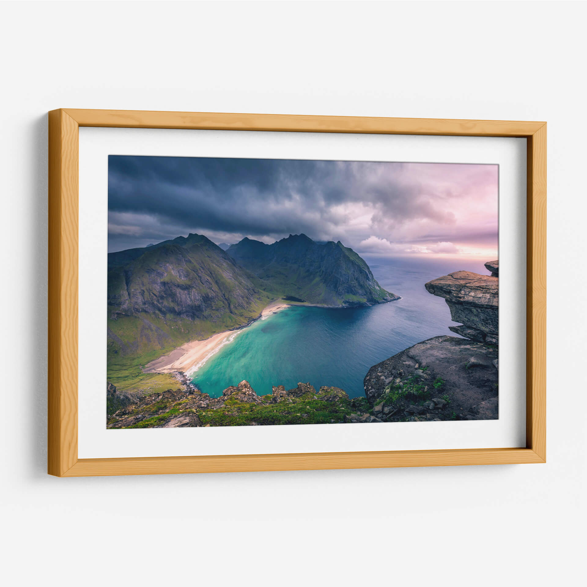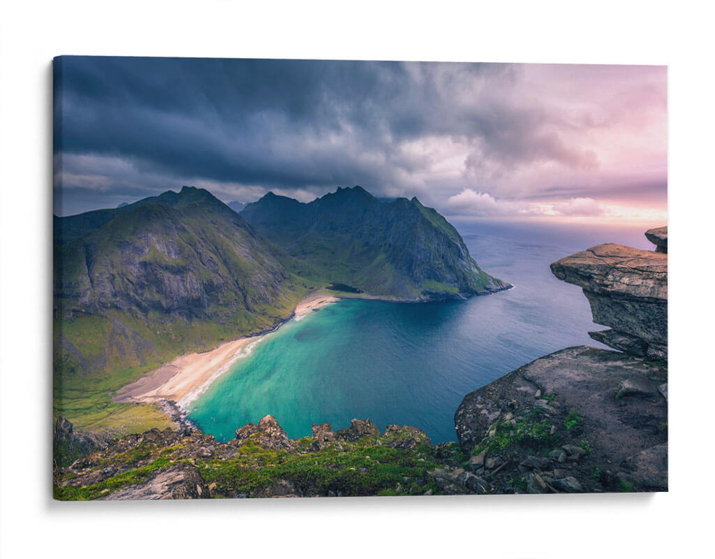 Sumérgete en la majestuosidad de 'Hermoso Noruega', un cuadro decorativo que captura la esencia dramática de los fiordos noruegos. Esta obra de arte presenta una vista aérea imponente de montañas escarpadas cubiertas de vegetación verde, descendiendo hacia una bahía de aguas cristalinas de un turquesa vibrante. Una playa de arena dorada bordea la costa, invitando a la contemplación. La composición se enriquece con la presencia de formaciones rocosas audaces en primer plano, que ofrecen una perspectiva única y profunda del paisaje. El cielo, una mezcla de nubes oscuras y tormentosas que se disipan para dar paso a tonos rosados y anaranjados del atardecer, añade un toque de misticismo y dramatismo. Los colores profundos del mar contrastan con los verdes intensos de las laderas y los grises imponentes de las cumbres, creando una paleta rica y cautivadora. Este cuadro decorativo es ideal para añadir un toque de naturaleza salvaje y serena a tu salón, estudio u oficina, transformando cualquier espacio en un santuario de tranquilidad y aventura. Es una pieza perfecta para los amantes de la fotografía paisajística y aquellos que buscan una conexión con la fuerza indómita de la naturaleza.