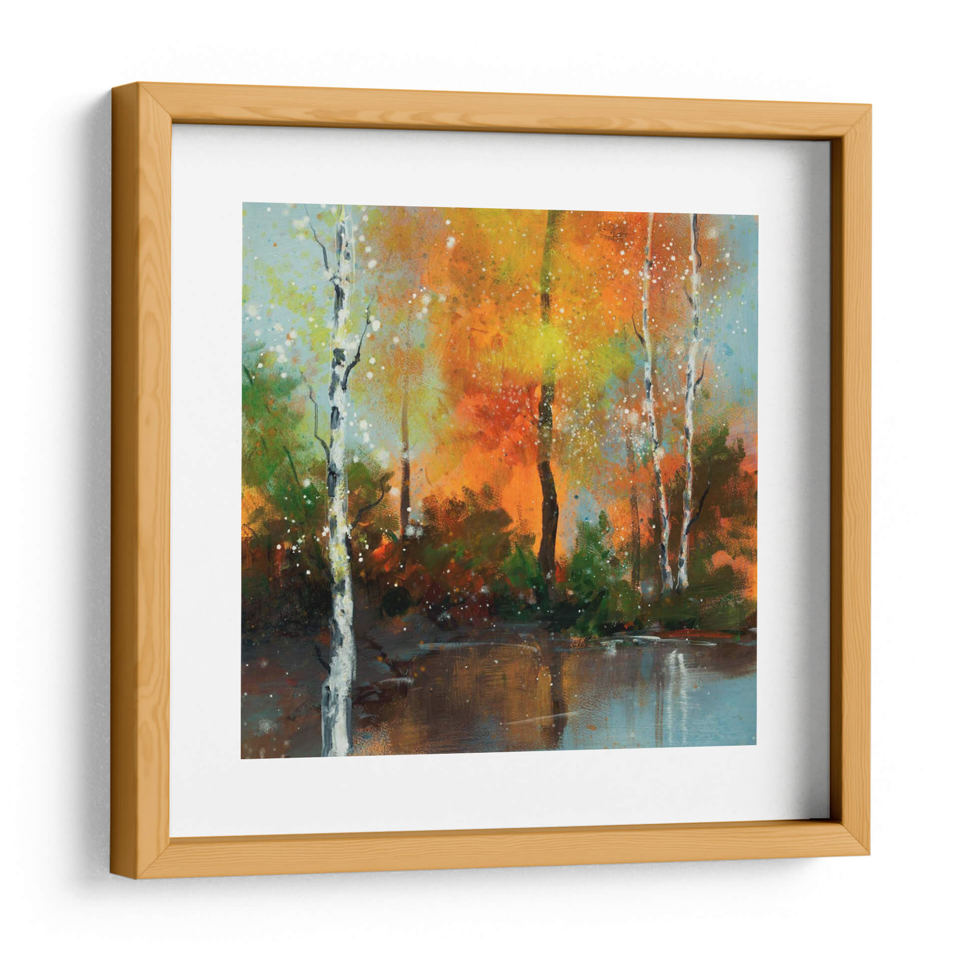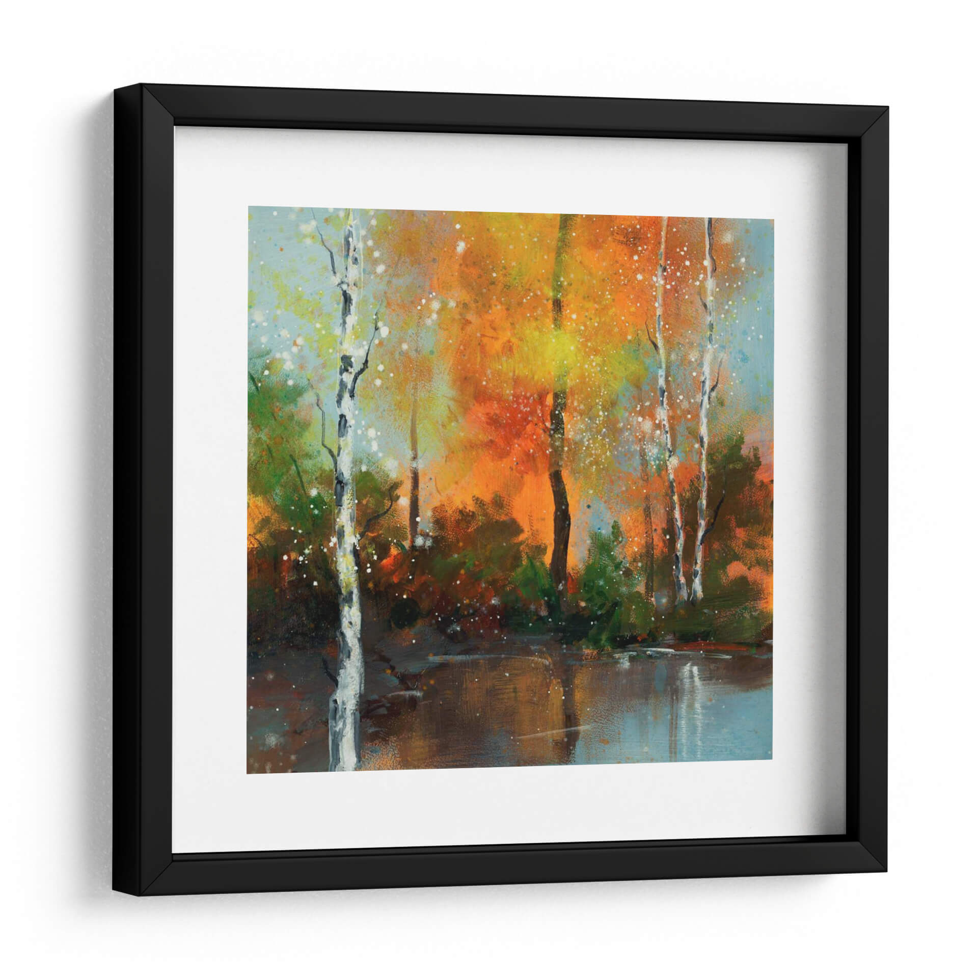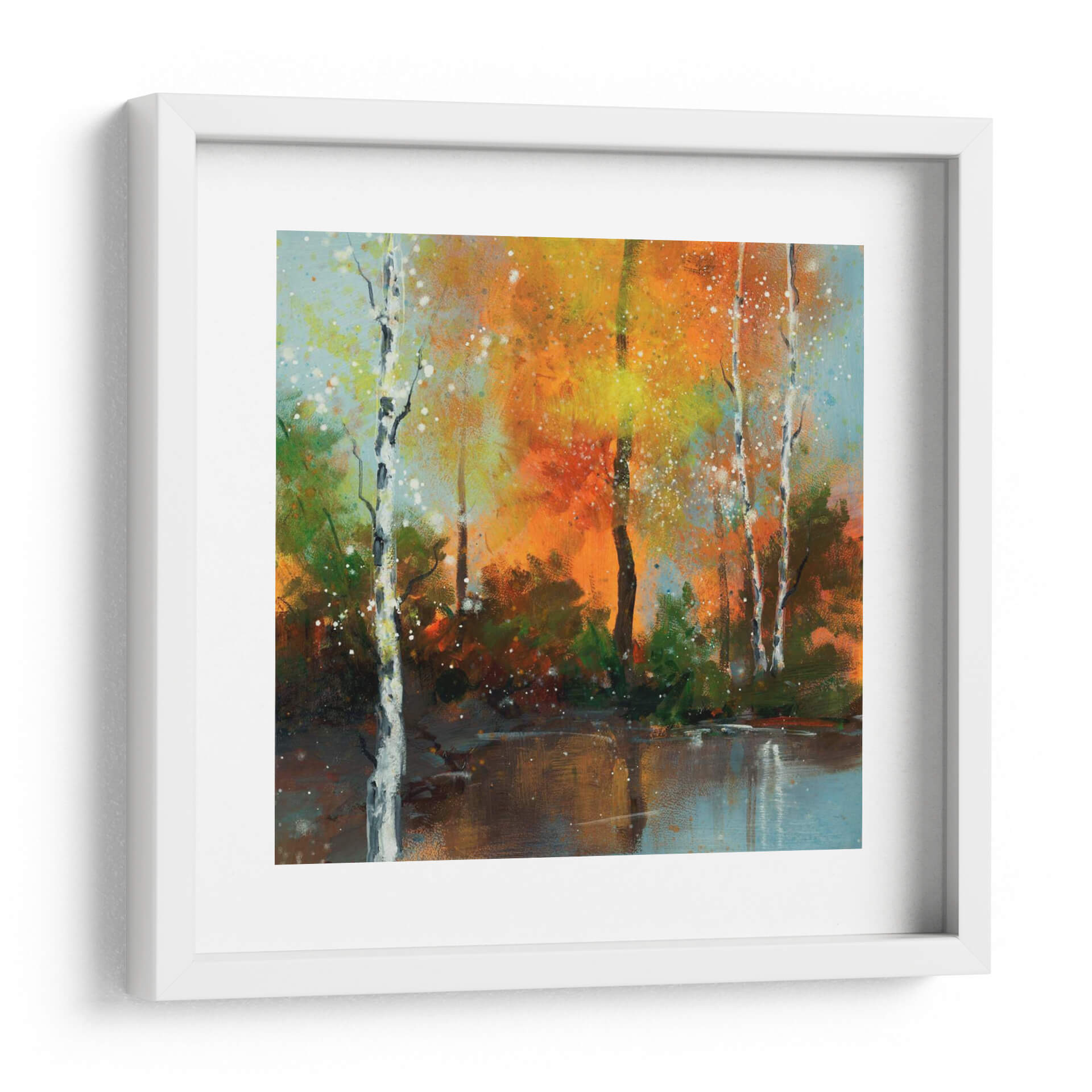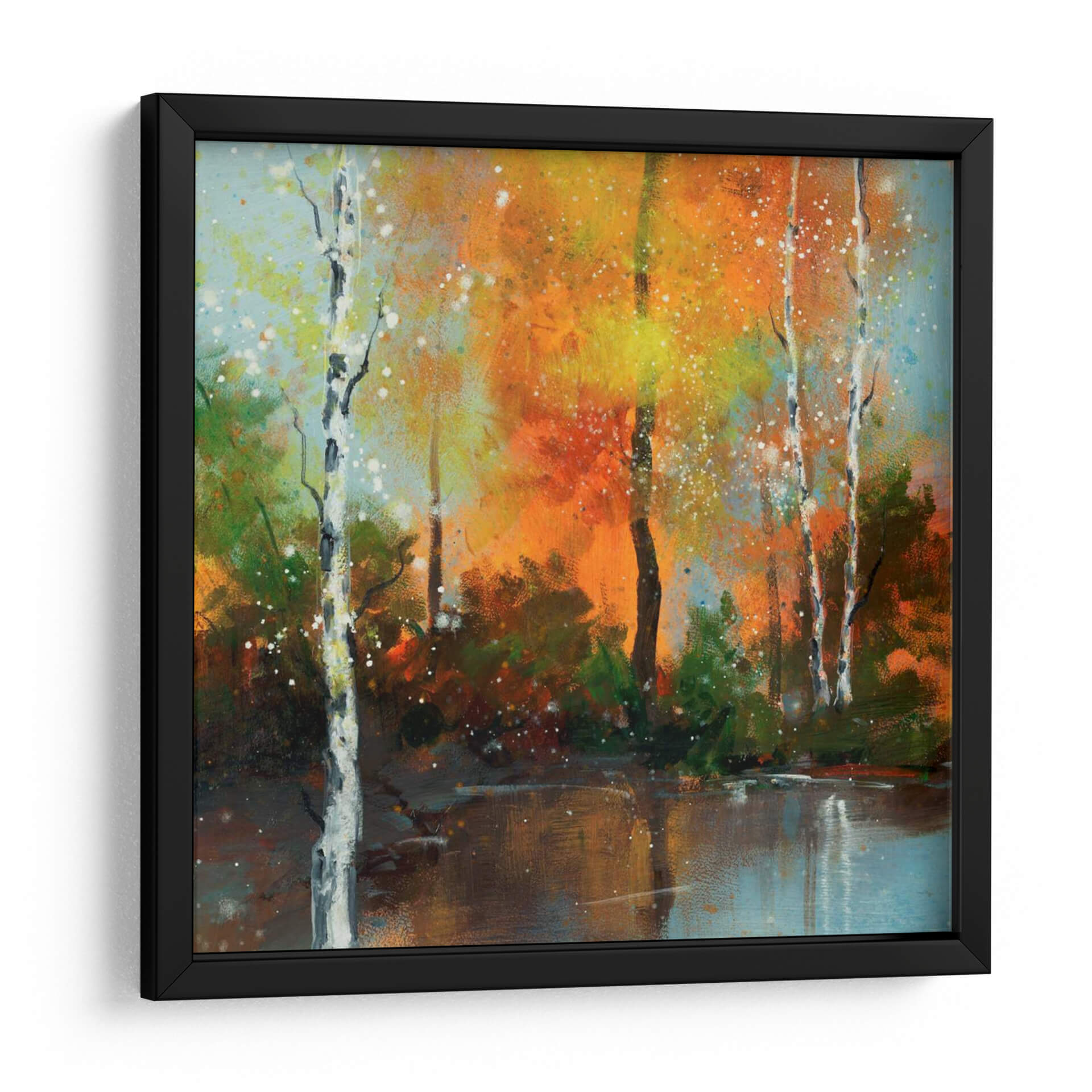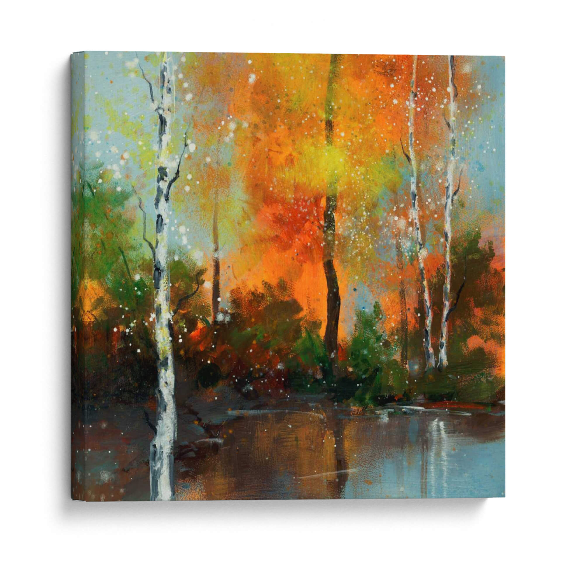 Sumérgete en la atmósfera cautivadora de "Hinterland 7", una obra de arte que captura la esencia de un paisaje otoñal con una técnica expresionista vibrante. Los tonos cálidos de naranja, amarillo y rojo se entrelazan con verdes profundos y toques de azul pálido en el cielo, creando un equilibrio dinámico que invita a la contemplación. Los troncos blancos y esbeltos de los abedules se alzan con gracia, contrastando con la frondosidad del follaje y la serena superficie del agua que refleja sutilmente el entorno. Las pinceladas enérgicas y la aplicación de pintura con textura, salpicada de blancos brillantes, añaden una cualidad etérea y casi mágica a la escena, sugiriendo la efímera belleza de la naturaleza en su máxima expresión. Este cuadro decorativo es ideal para añadir calidez, profundidad y un toque de arte contemporáneo a cualquier sala de estar, estudio u oficina. "Hinterland 7" no es solo una pieza decorativa, sino una ventana a un mundo de sensaciones, perfecta para aquellos que buscan una conexión emocional a través del arte. Su composición abstracta pero evocadora lo convierte en un punto focal intrigante que estimula la imaginación y enriquece el espacio vital con su energía y color.