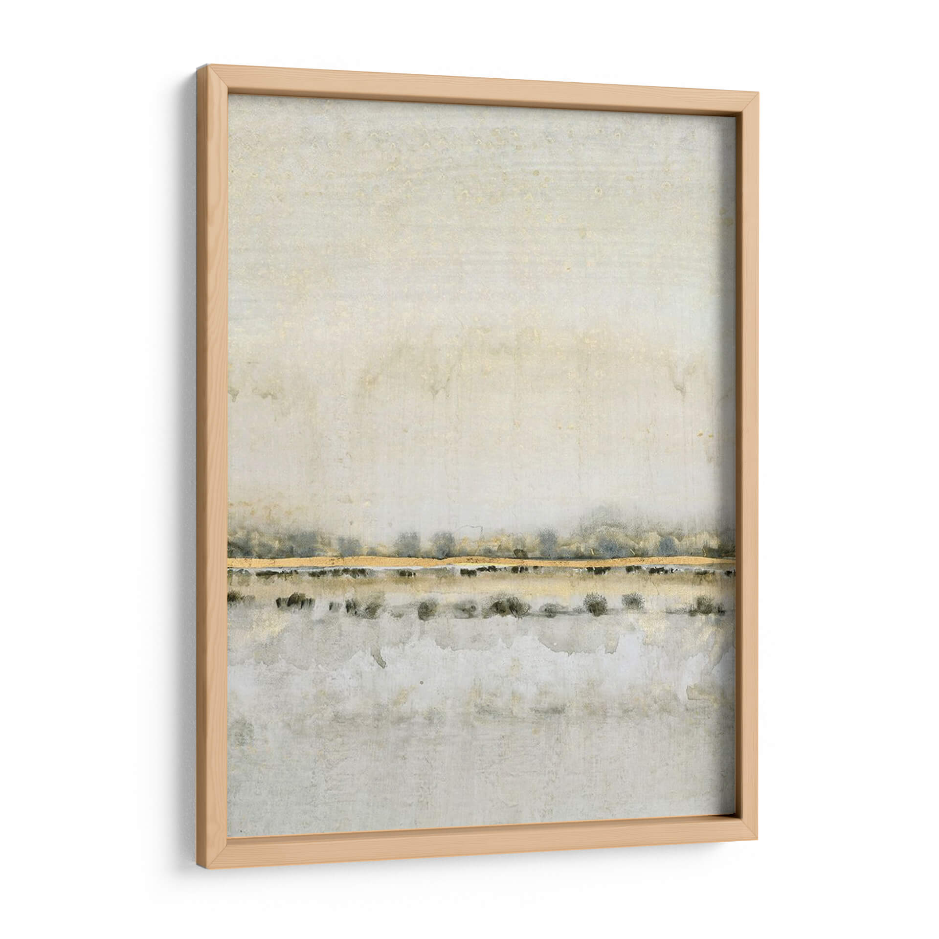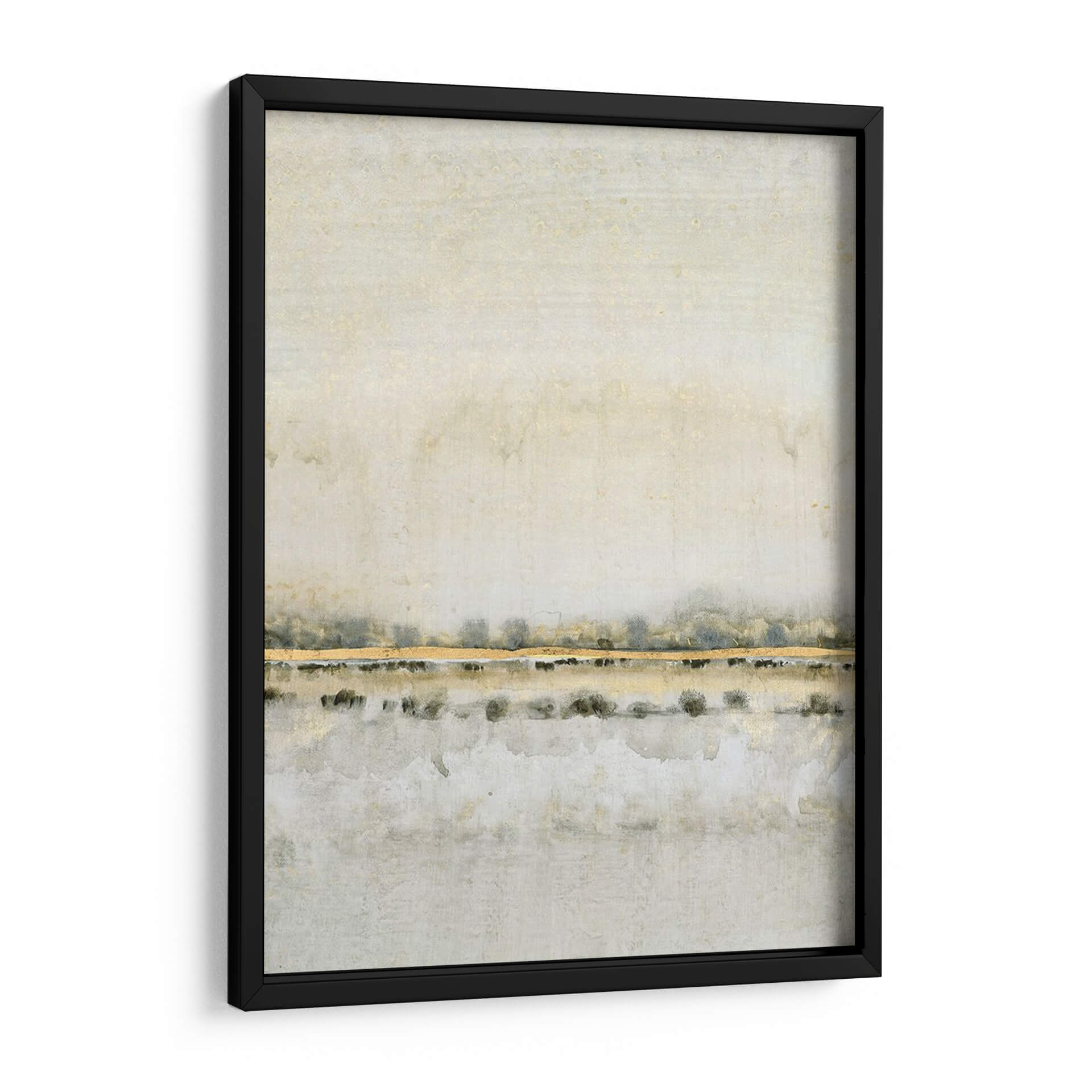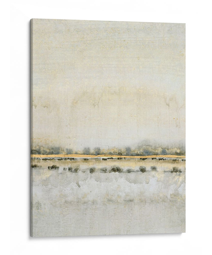 Sumérgete en la serenidad etérea de "Horizonte Dorado II", una obra de arte contemporáneo que captura la sutileza de un paisaje al amanecer o atardecer. El artista Tim O'Toole utiliza una paleta de colores suaves, dominada por tonos grises pálidos, cremas y toques sutiles de dorado y ocre, creando una atmósfera de calma y reflexión. La composición, con sus líneas horizontales y la presencia de una banda dorada distintiva, evoca la vastedad de un horizonte sobre un cuerpo de agua tranquilo, reflejando la escena con delicadeza. Las texturas sutiles y las pinceladas evocan un estilo abstracto y atmosférico, perfecto para quienes buscan añadir un toque de sofisticación minimalista a su hogar u oficina. Este cuadro decorativo es ideal para espacios que buscan un punto focal sereno pero intrigante, aportando una sensación de paz y elegancia atemporal. Su diseño abstracto permite que se integre armoniosamente en diversas decoraciones, desde interiores modernos hasta ambientes más tradicionales, invitando a la contemplación y al disfrute visual.