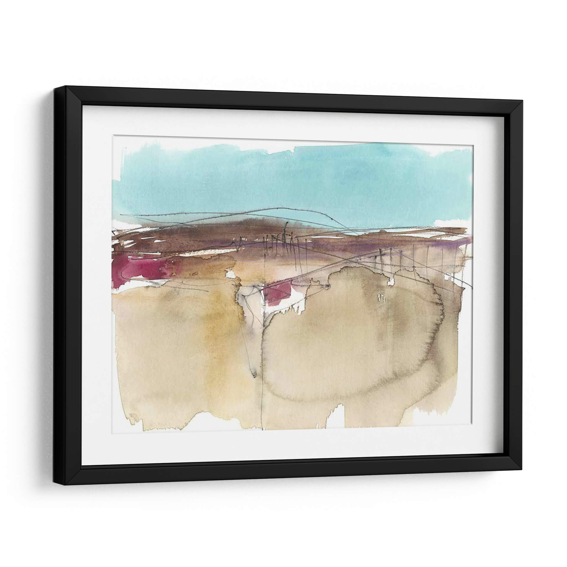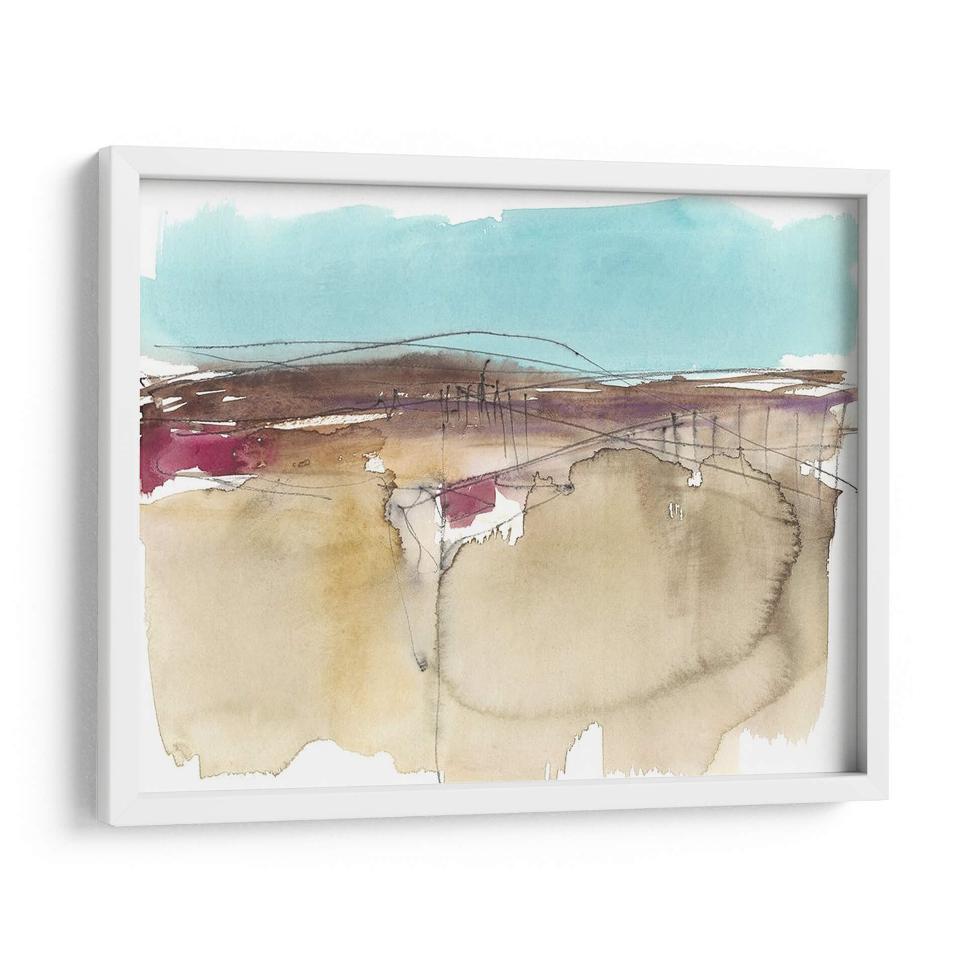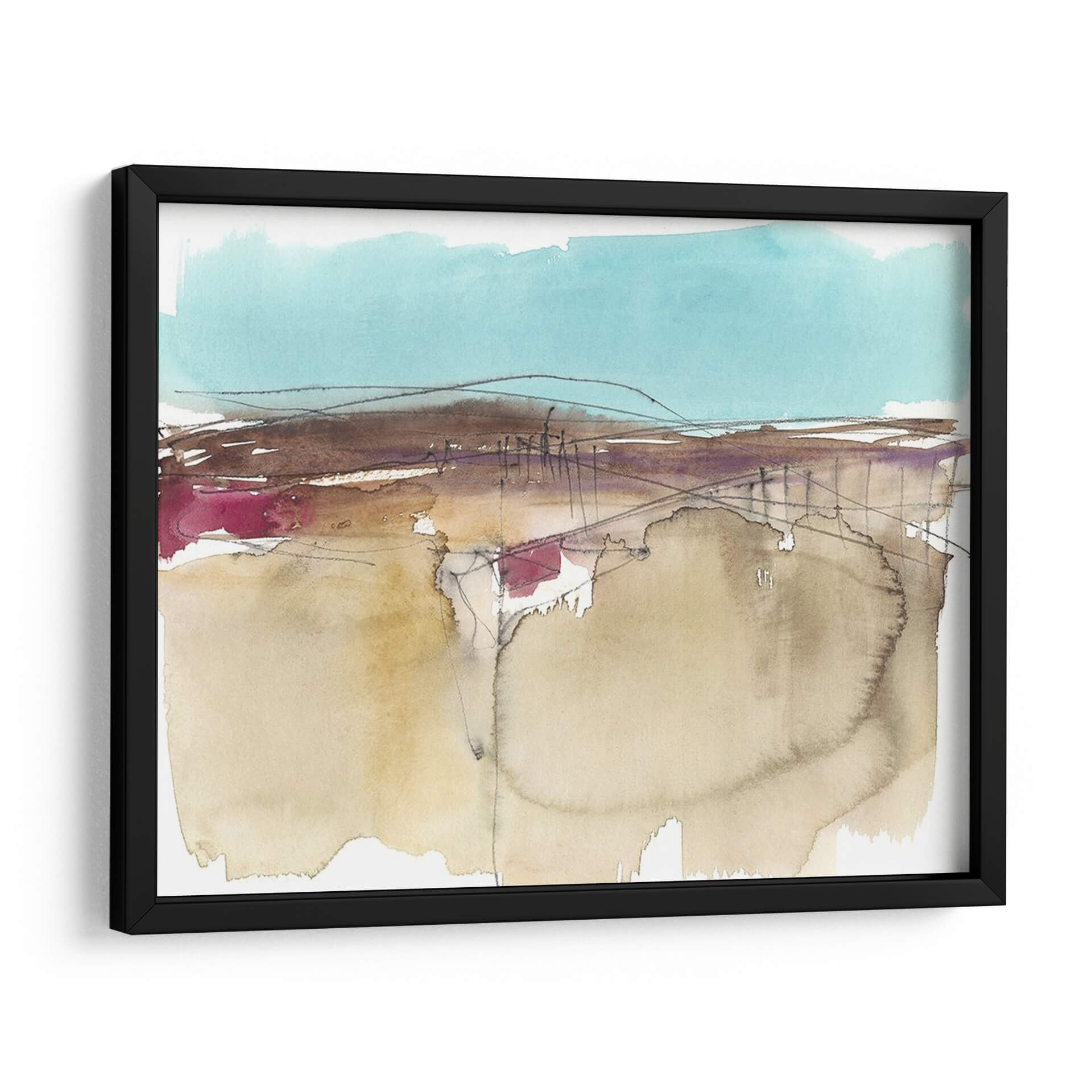 Sumérgete en la serenidad del arte contemporáneo con "Horizonte Esquemático II", una obra maestra abstracta de Jennifer Goldberger. Este cuadro decorativo evoca una sensación de paz y contemplación a través de su delicada paleta de colores, dominada por tonos tierra suaves, acentos vibrantes de magenta y un cielo sereno en azul turquesa. La técnica de acuarela, con sus pinceladas fluidas y transparencias, crea una atmósfera etérea que invita a la reflexión. Las líneas finas y a veces esbozadas añaden profundidad y un toque de misterio, sugiriendo un paisaje esquemático que se desvanece en la distancia. Ideal para aquellos que buscan infundir calma y sofisticación en su hogar u oficina, este lienzo abstracto es un punto focal cautivador para cualquier espacio moderno o minimalista. Permite que la sutileza de sus formas y la armonía de sus colores transformen tu entorno, creando un oasis de tranquilidad visual.