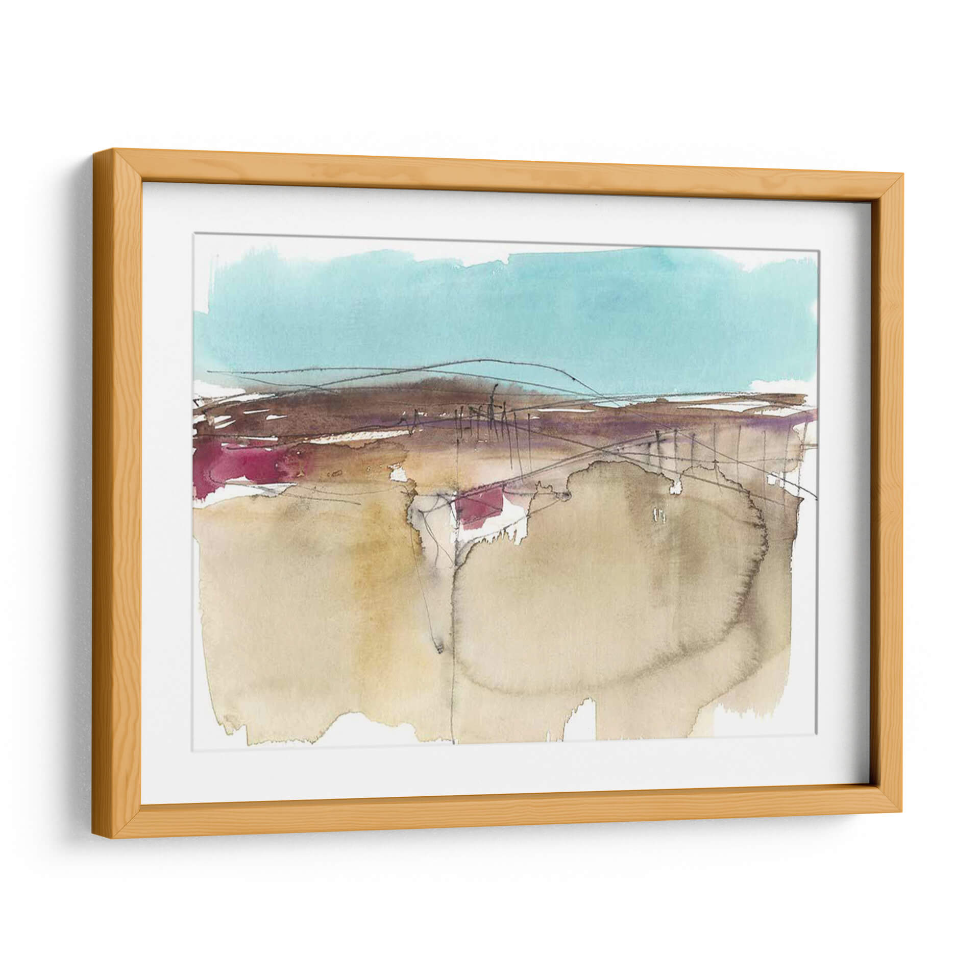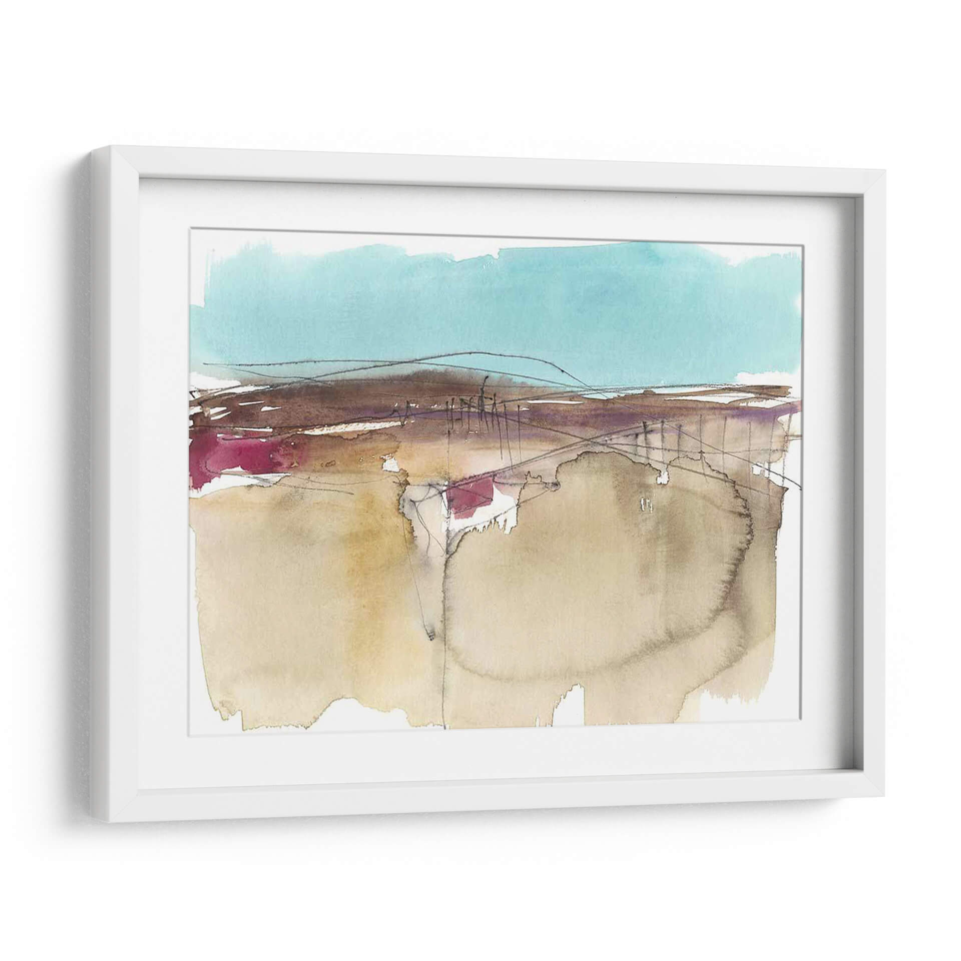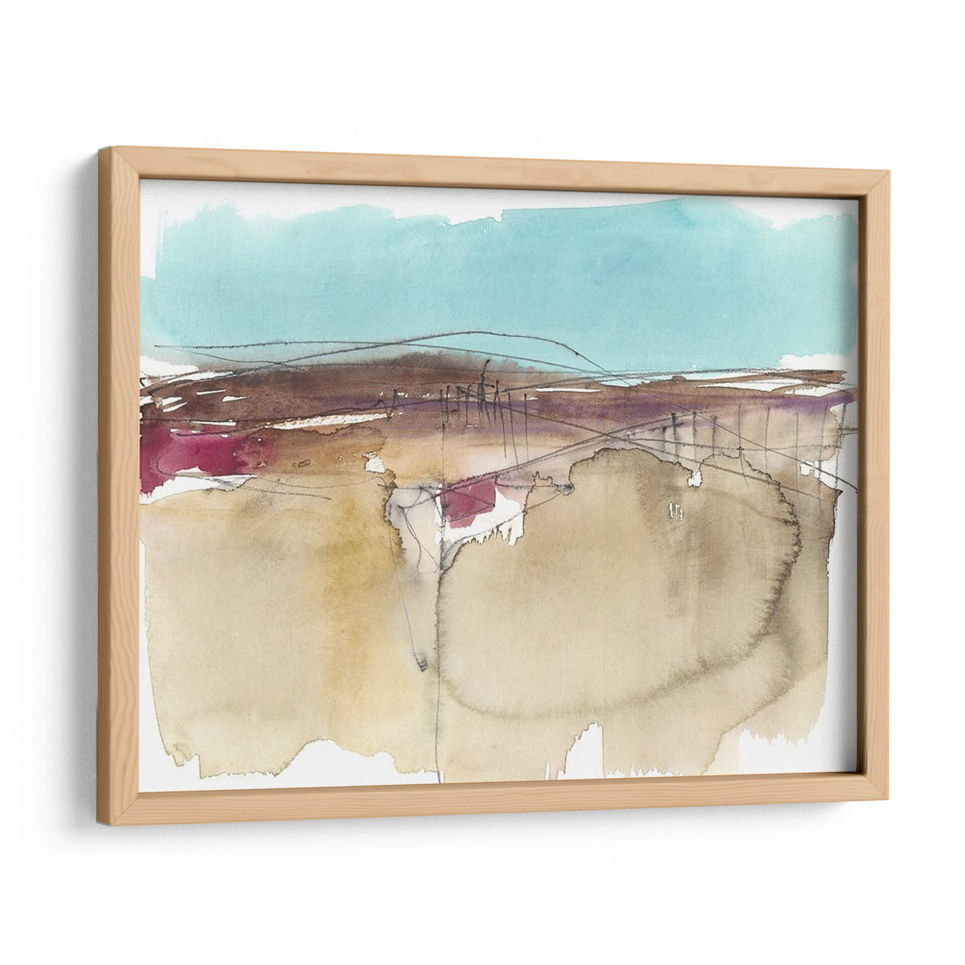 Sumérgete en la serenidad del arte contemporáneo con "Horizonte Esquemático II", una obra maestra abstracta de Jennifer Goldberger. Este cuadro decorativo evoca una sensación de paz y contemplación a través de su delicada paleta de colores, dominada por tonos tierra suaves, acentos vibrantes de magenta y un cielo sereno en azul turquesa. La técnica de acuarela, con sus pinceladas fluidas y transparencias, crea una atmósfera etérea que invita a la reflexión. Las líneas finas y a veces esbozadas añaden profundidad y un toque de misterio, sugiriendo un paisaje esquemático que se desvanece en la distancia. Ideal para aquellos que buscan infundir calma y sofisticación en su hogar u oficina, este lienzo abstracto es un punto focal cautivador para cualquier espacio moderno o minimalista. Permite que la sutileza de sus formas y la armonía de sus colores transformen tu entorno, creando un oasis de tranquilidad visual.
