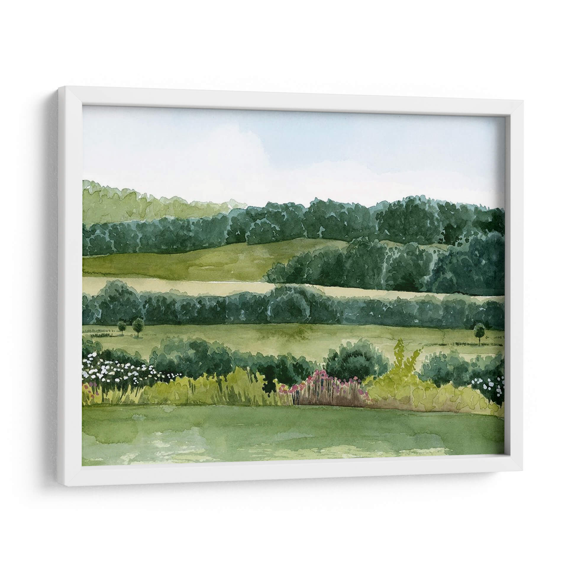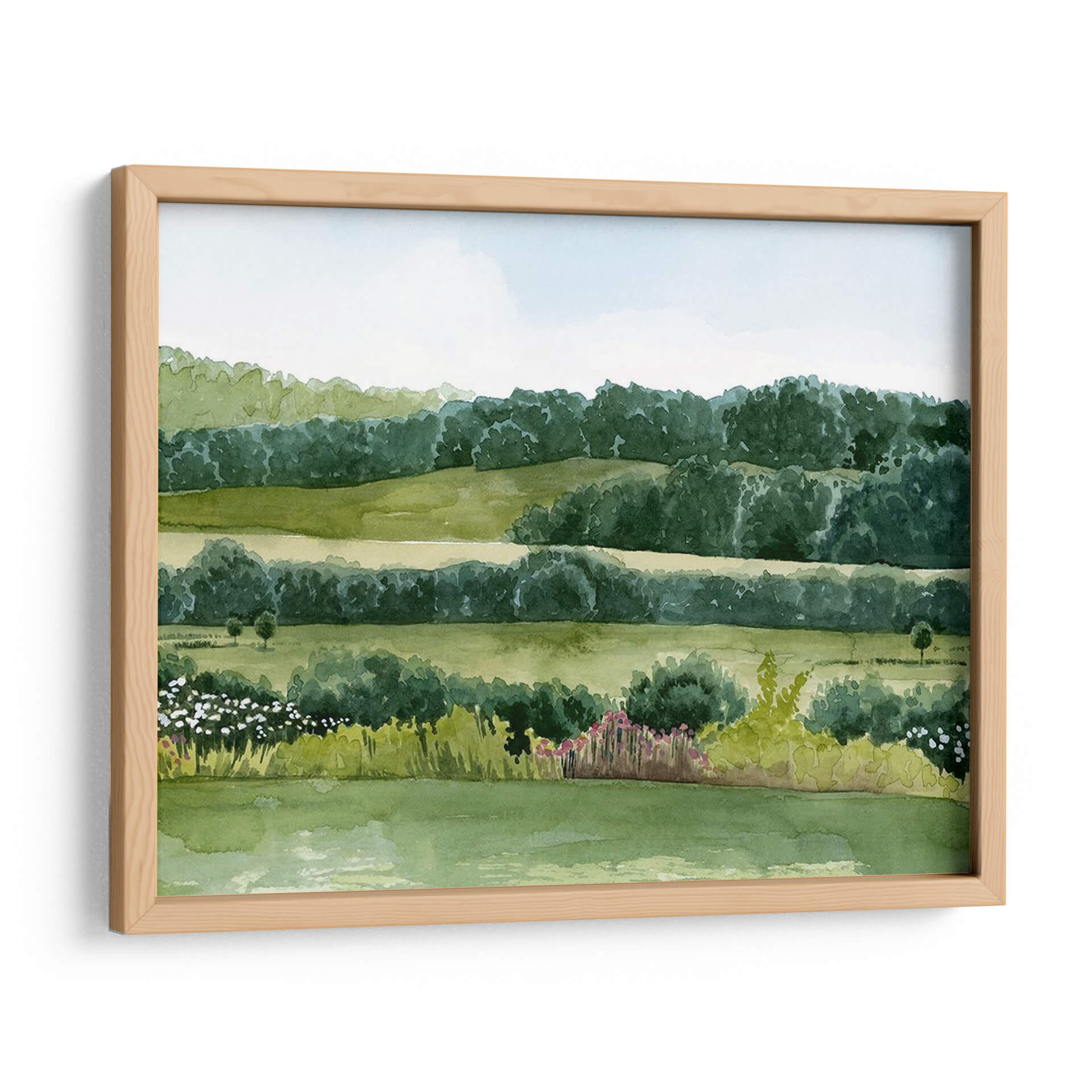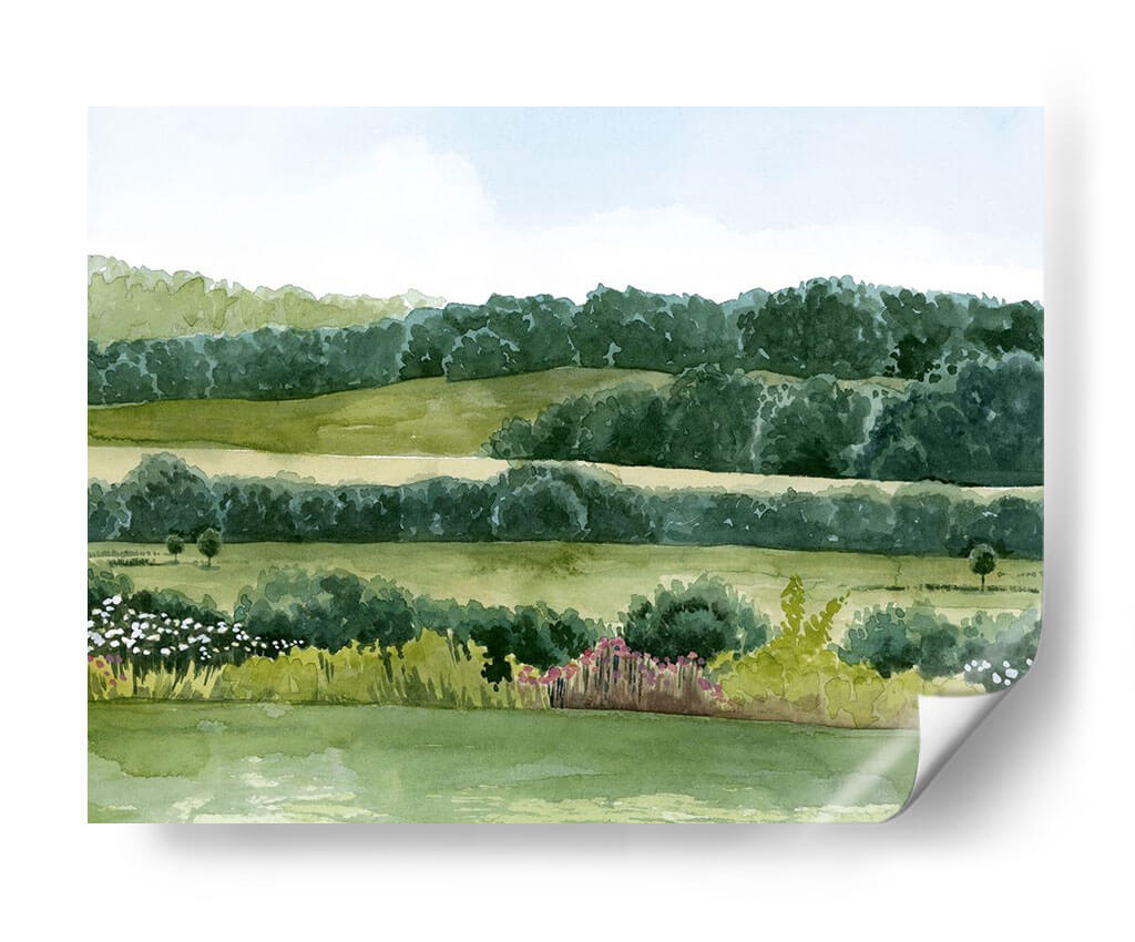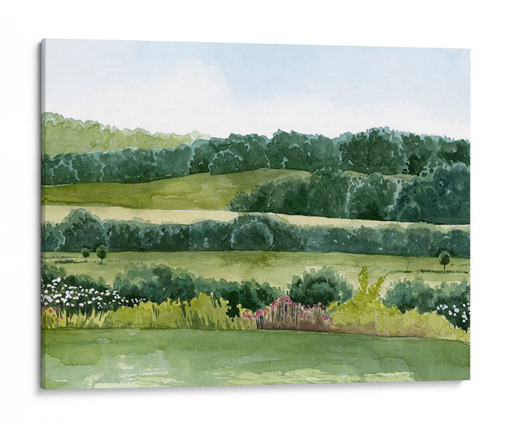 Sumérgete en la serenidad de "Idílico Domingo II", una obra de arte que captura la esencia de un día apacible en el campo. El cuadro decorativo presenta un paisaje bucólico, pintado con acuarelas que evocan la delicadeza y la frescura de la naturaleza. Las suaves colinas verdes se extienden hasta un horizonte boscoso, creando capas de profundidad y tranquilidad. La paleta de colores se centra en una gama de verdes vibrantes y pasteles celestes, que transmiten una sensación de paz y armonía. La composición, con sus líneas horizontales que se repiten y las formas orgánicas de los árboles y arbustos, invita a la contemplación. Pequeños toques de color en la flora del primer plano, con flores blancas y rosadas, añaden vida sin romper la calma general. Esta pieza es ideal para espacios que buscan un respiro de la rutina, como un dormitorio, una sala de estar o incluso una oficina, aportando una atmósfera de serenidad y conexión con la naturaleza. El estilo de la pintura, que recuerda a las acuarelas clásicas, añade un toque atemporal y elegante a cualquier decoración. "Idílico Domingo II" es más que una simple decoración de pared; es una ventana a un momento de paz.