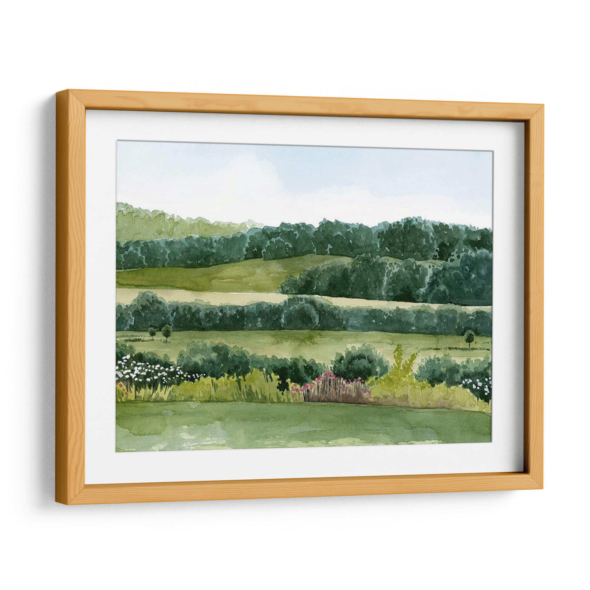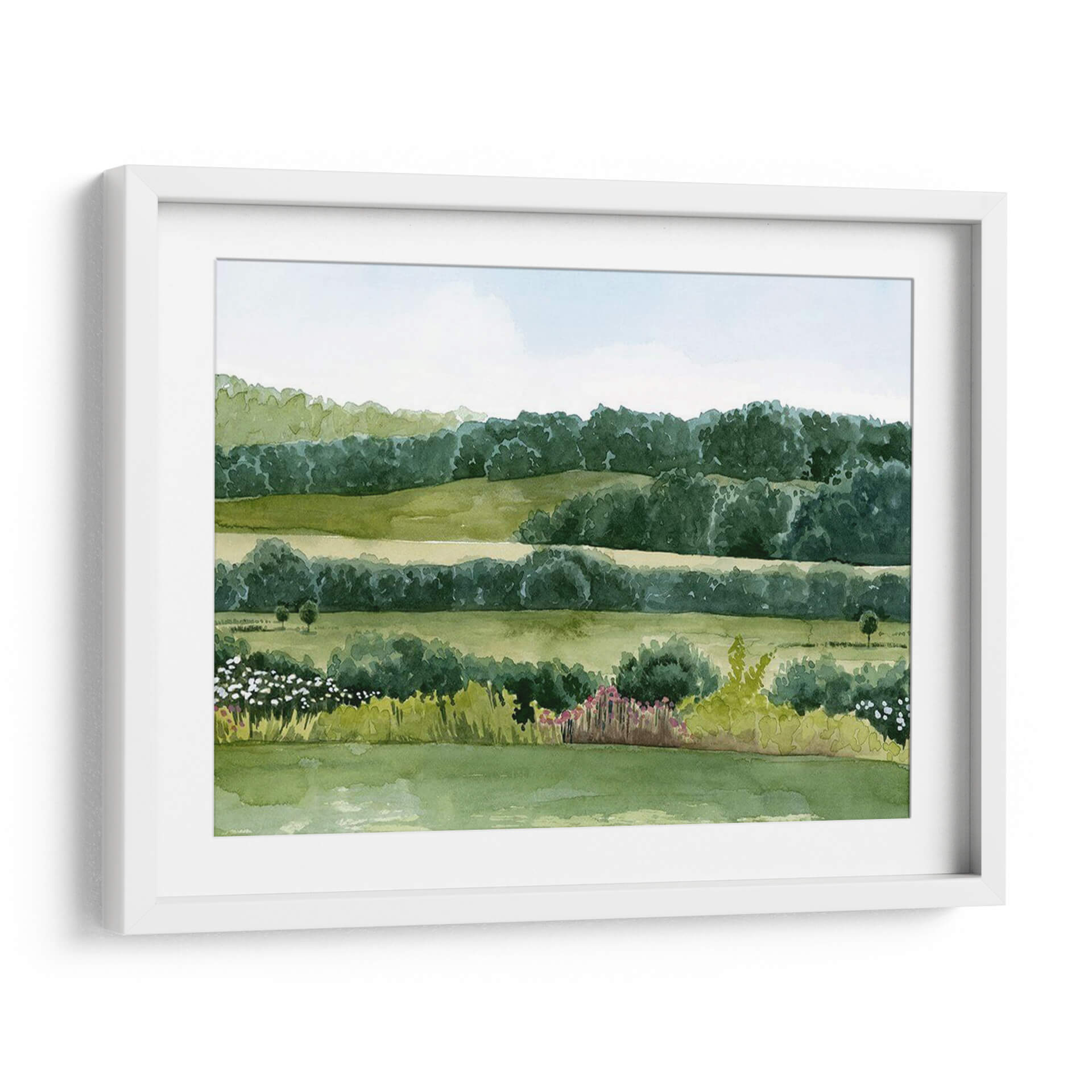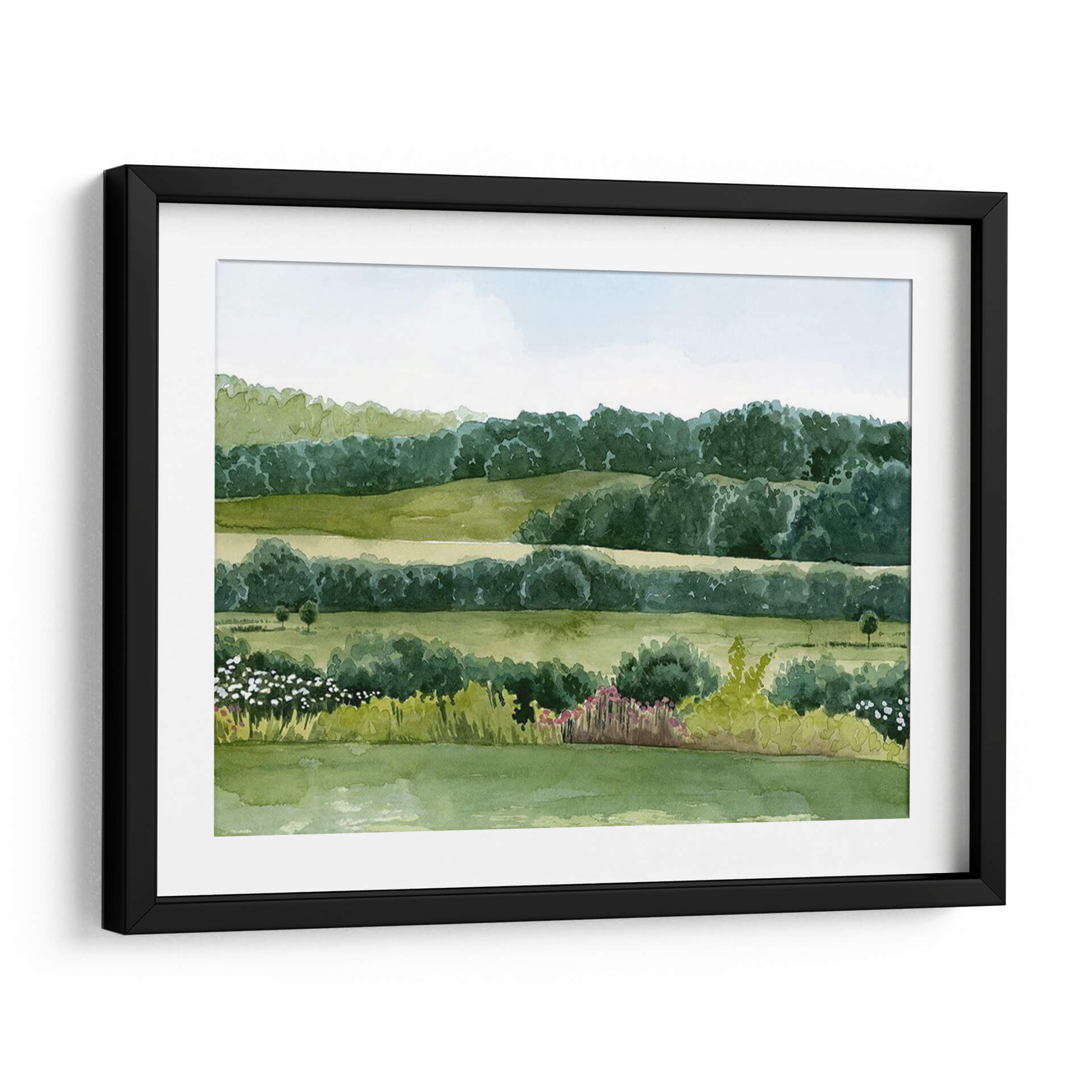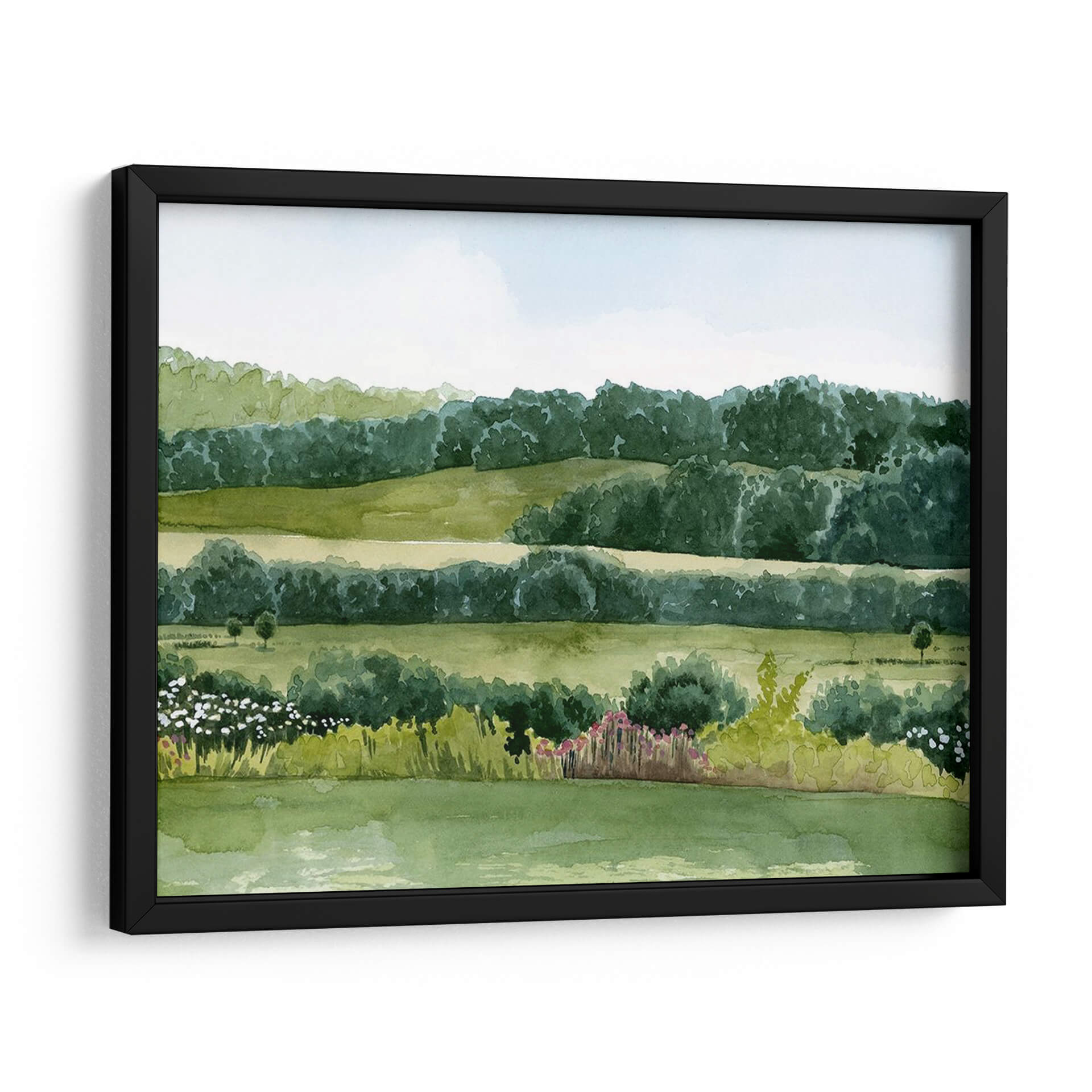 Sumérgete en la serenidad de "Idílico Domingo II", una obra de arte que captura la esencia de un día apacible en el campo. El cuadro decorativo presenta un paisaje bucólico, pintado con acuarelas que evocan la delicadeza y la frescura de la naturaleza. Las suaves colinas verdes se extienden hasta un horizonte boscoso, creando capas de profundidad y tranquilidad. La paleta de colores se centra en una gama de verdes vibrantes y pasteles celestes, que transmiten una sensación de paz y armonía. La composición, con sus líneas horizontales que se repiten y las formas orgánicas de los árboles y arbustos, invita a la contemplación. Pequeños toques de color en la flora del primer plano, con flores blancas y rosadas, añaden vida sin romper la calma general. Esta pieza es ideal para espacios que buscan un respiro de la rutina, como un dormitorio, una sala de estar o incluso una oficina, aportando una atmósfera de serenidad y conexión con la naturaleza. El estilo de la pintura, que recuerda a las acuarelas clásicas, añade un toque atemporal y elegante a cualquier decoración. "Idílico Domingo II" es más que una simple decoración de pared; es una ventana a un momento de paz.