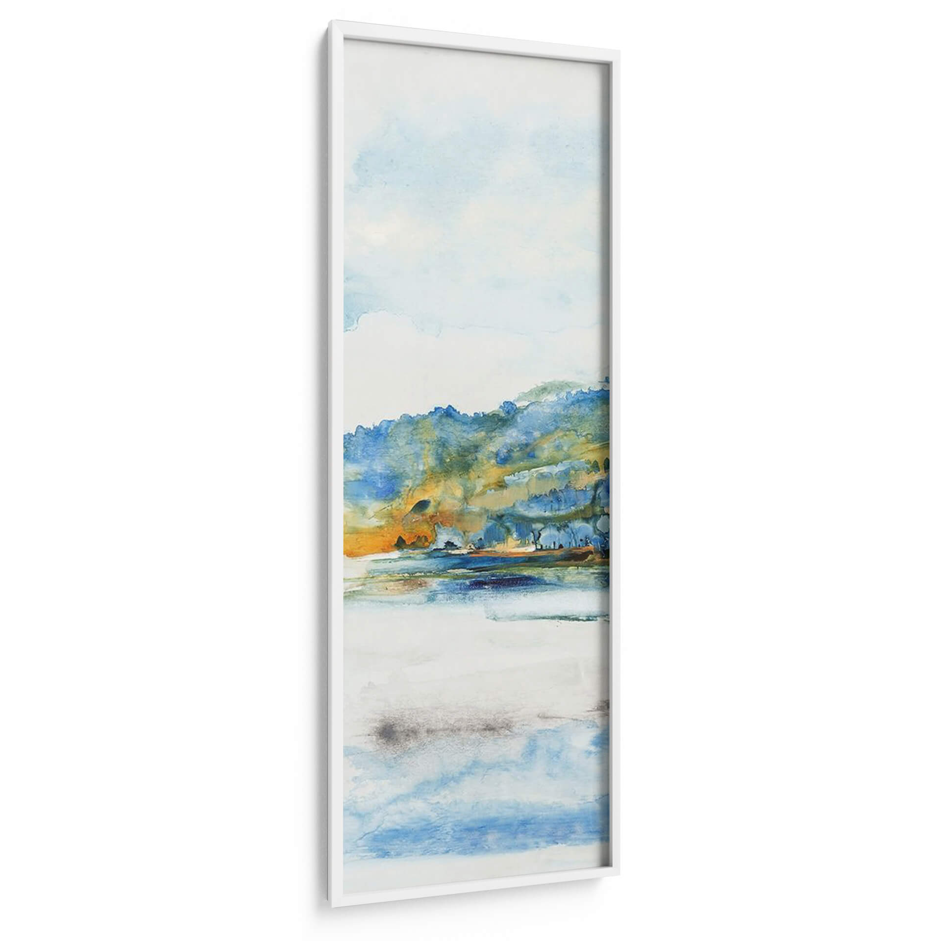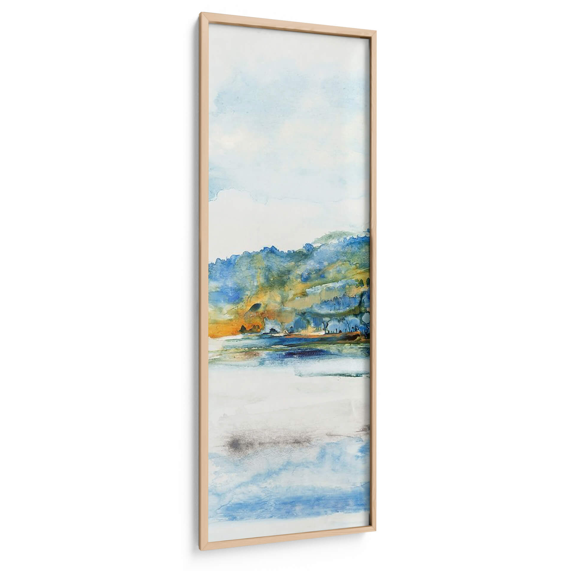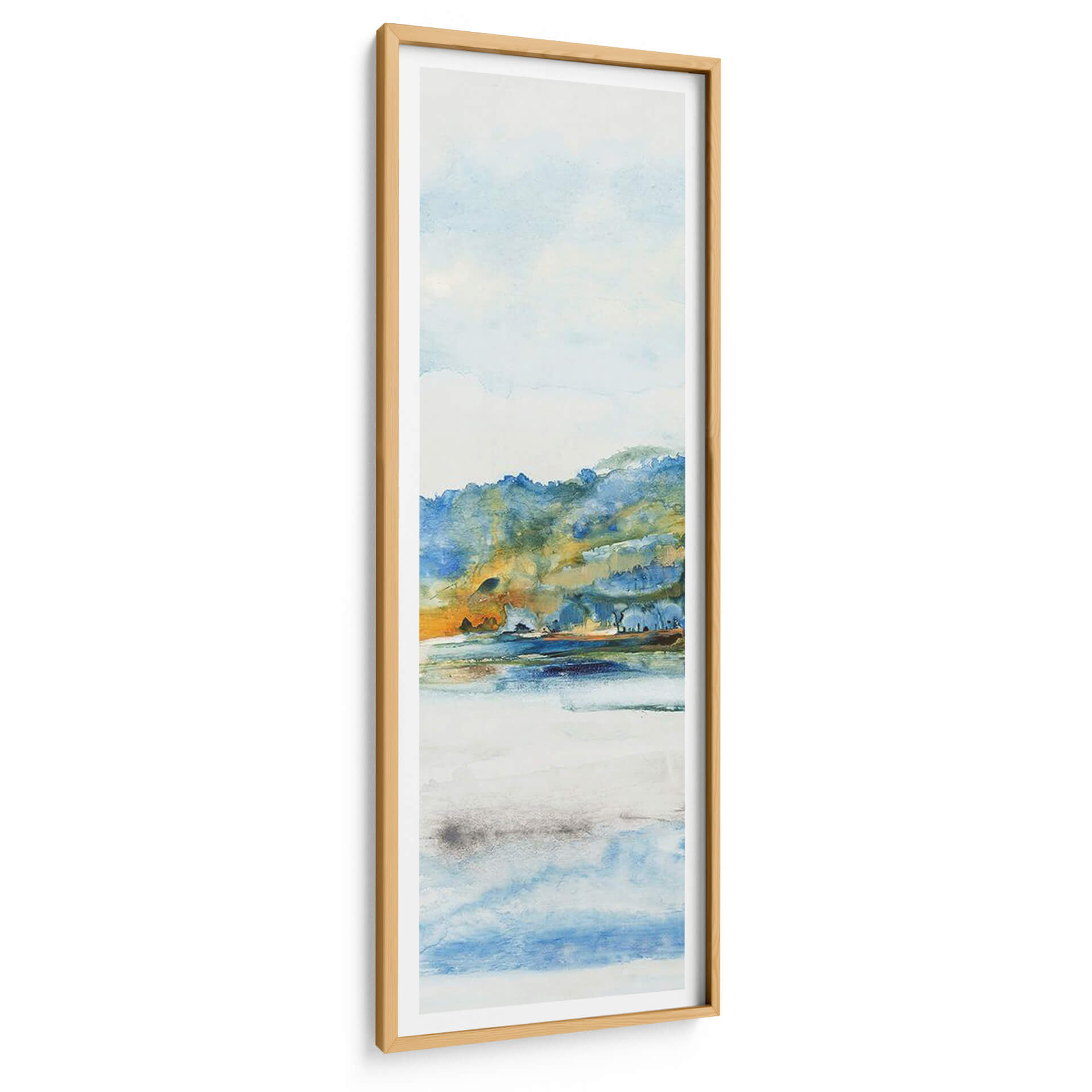 Sumérgete en la serenidad de "Isla Niebla I", una cautivadora obra de arte de Tim O'Toole que evoca la tranquilidad de un paisaje costero bañado por la luz. Esta pieza vertical se caracteriza por su estilo acuarela etéreo, donde las pinceladas fluidas dan vida a una escena brumosa y evocadora. La paleta de colores, dominada por azules celestes y profundos, verdes musgo y cálidos toques de naranja y ocre, crea una atmósfera de calma y contemplación. Observa cómo las capas de color sugieren la presencia de una isla envuelta en niebla, reflejada suavemente en las aguas serenas de primer plano. La composición, aunque abstracta en su ejecución, presenta una clara conexión con la naturaleza, invitando a la introspección y al descanso visual. "Isla Niebla I" es la elección perfecta para añadir un toque de sofisticación y paz a tu hogar u oficina, transformando cualquier espacio en un santuario personal. Ideal para salones modernos, dormitorios tranquilos o pasillos que buscan un acento de color sutil y relajante, este cuadro decorativo es una invitación a la calma y a la belleza efímera de la naturaleza.