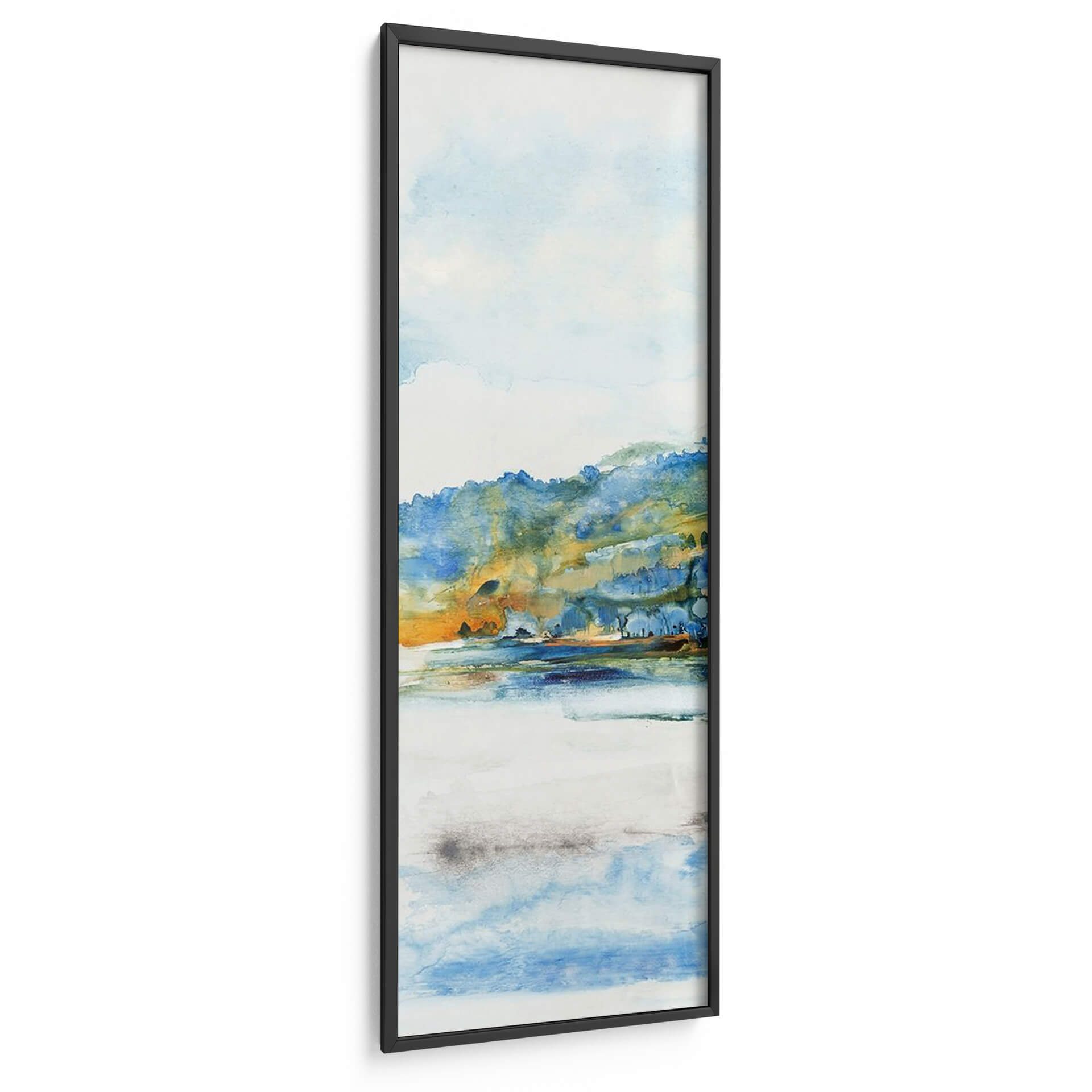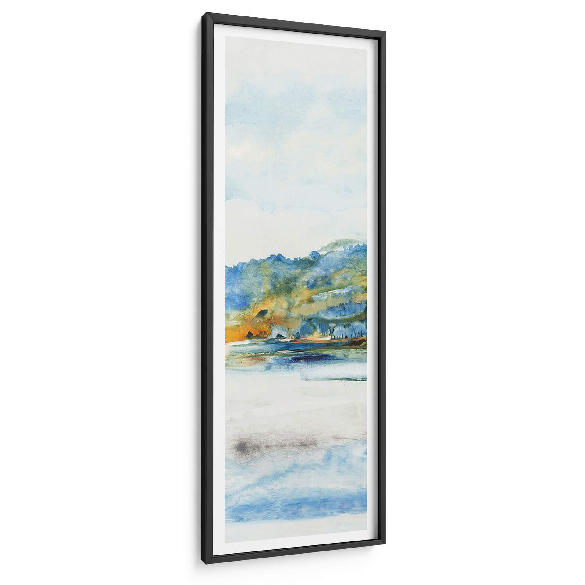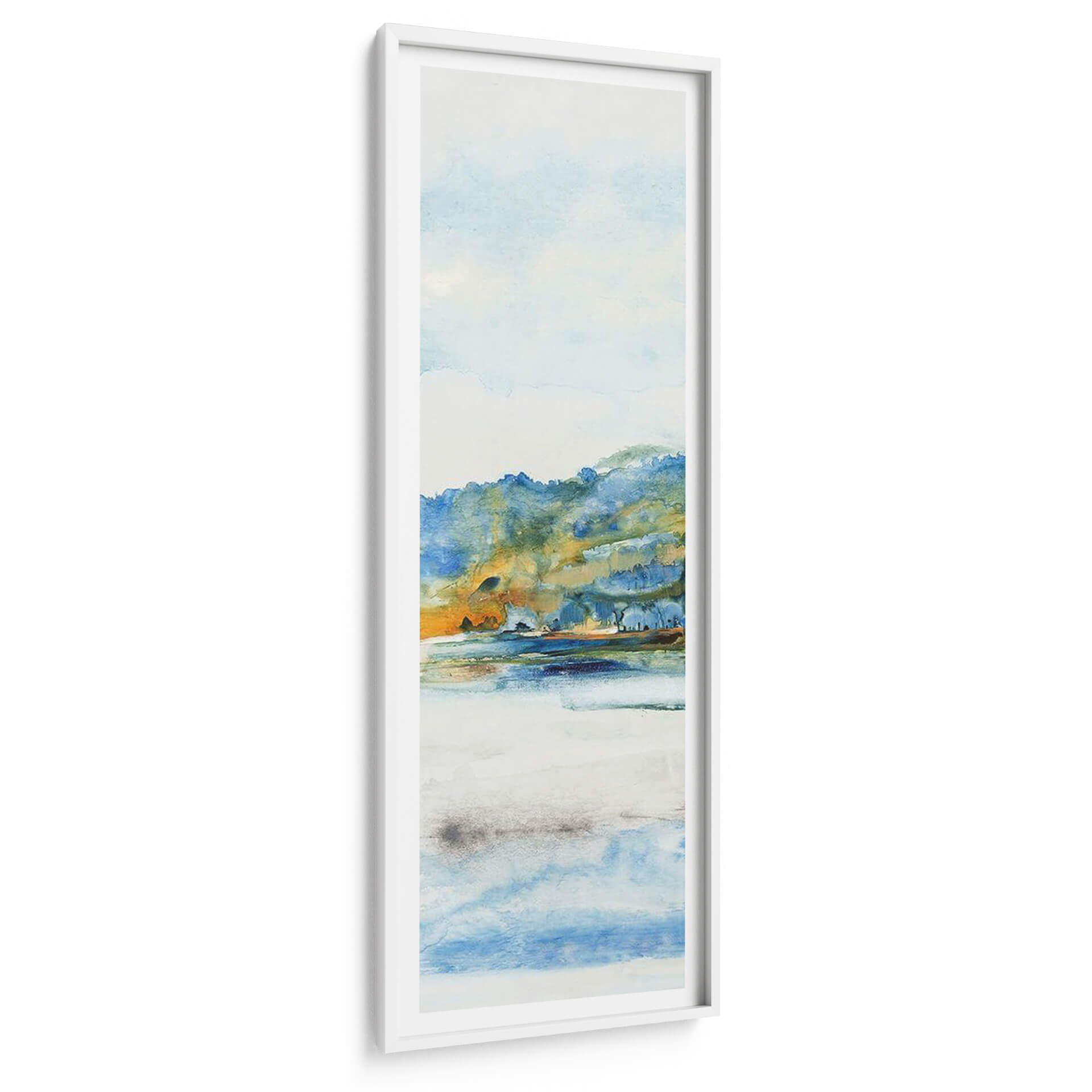Sumérgete en la serenidad de "Isla Niebla I", una cautivadora obra de arte de Tim O'Toole que evoca la tranquilidad de un paisaje costero bañado por la luz. Esta pieza vertical se caracteriza por su estilo acuarela etéreo, donde las pinceladas fluidas dan vida a una escena brumosa y evocadora. La paleta de colores, dominada por azules celestes y profundos, verdes musgo y cálidos toques de naranja y ocre, crea una atmósfera de calma y contemplación. Observa cómo las capas de color sugieren la presencia de una isla envuelta en niebla, reflejada suavemente en las aguas serenas de primer plano. La composición, aunque abstracta en su ejecución, presenta una clara conexión con la naturaleza, invitando a la introspección y al descanso visual. "Isla Niebla I" es la elección perfecta para añadir un toque de sofisticación y paz a tu hogar u oficina, transformando cualquier espacio en un santuario personal. Ideal para salones modernos, dormitorios tranquilos o pasillos que buscan un acento de color sutil y relajante, este cuadro decorativo es una invitación a la calma y a la belleza efímera de la naturaleza.