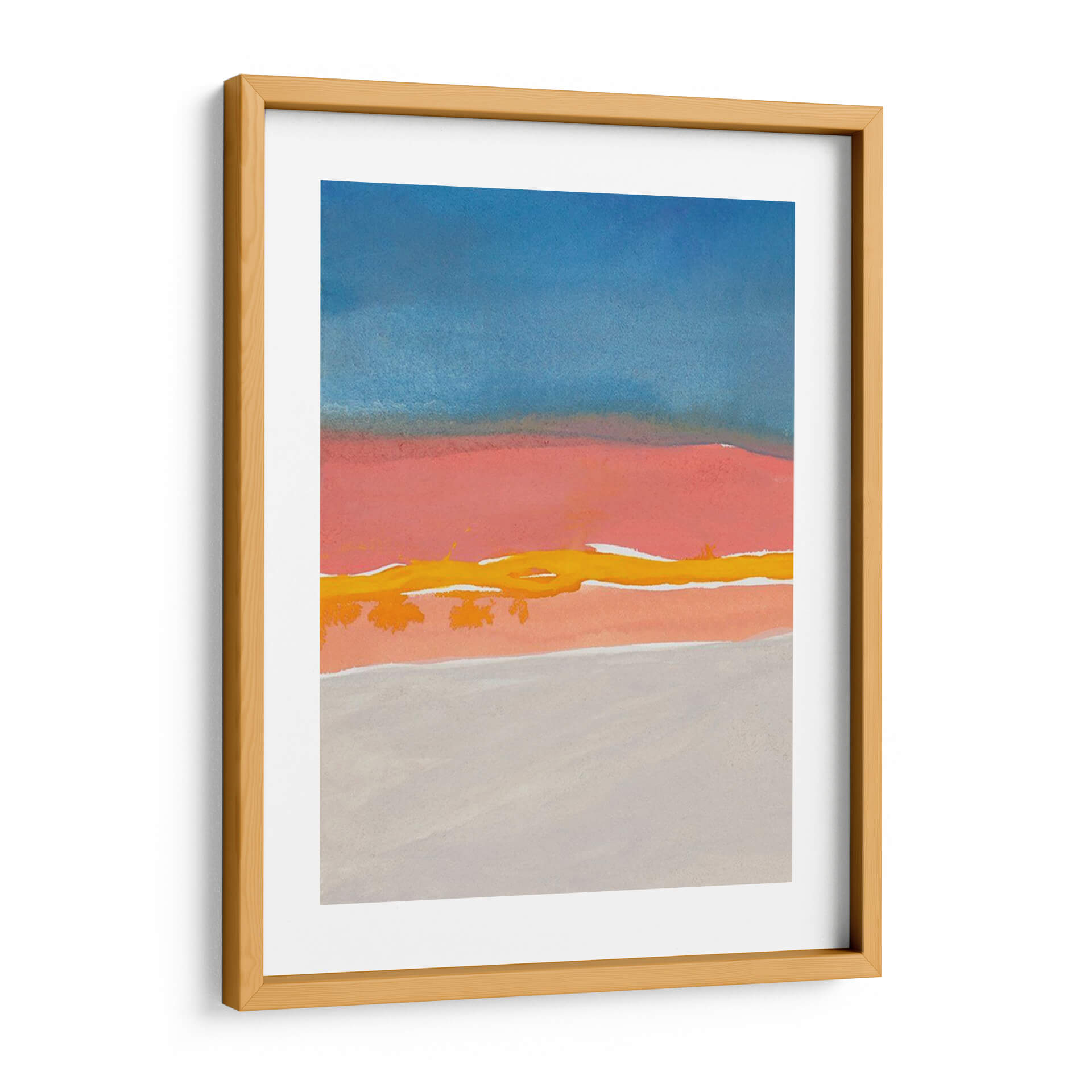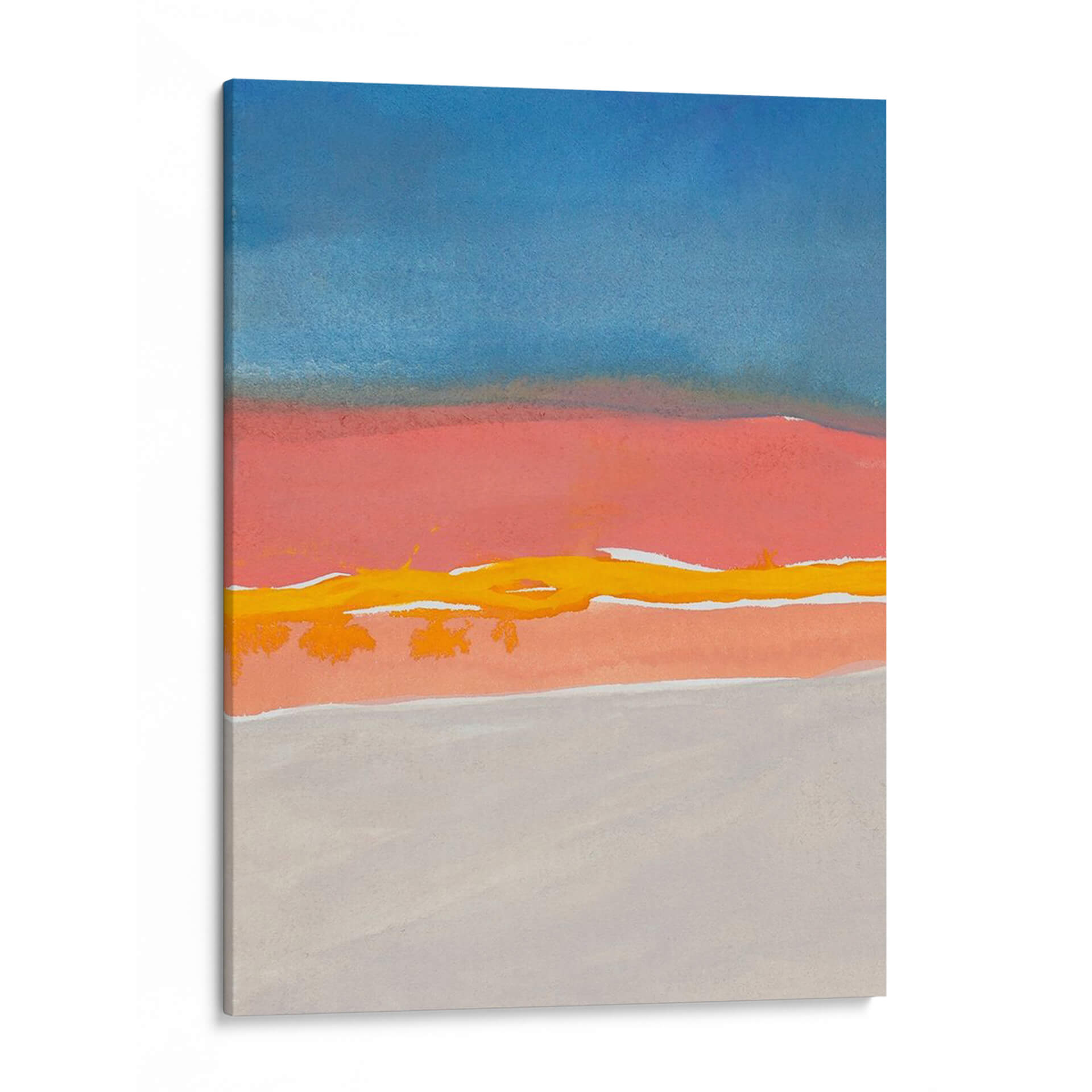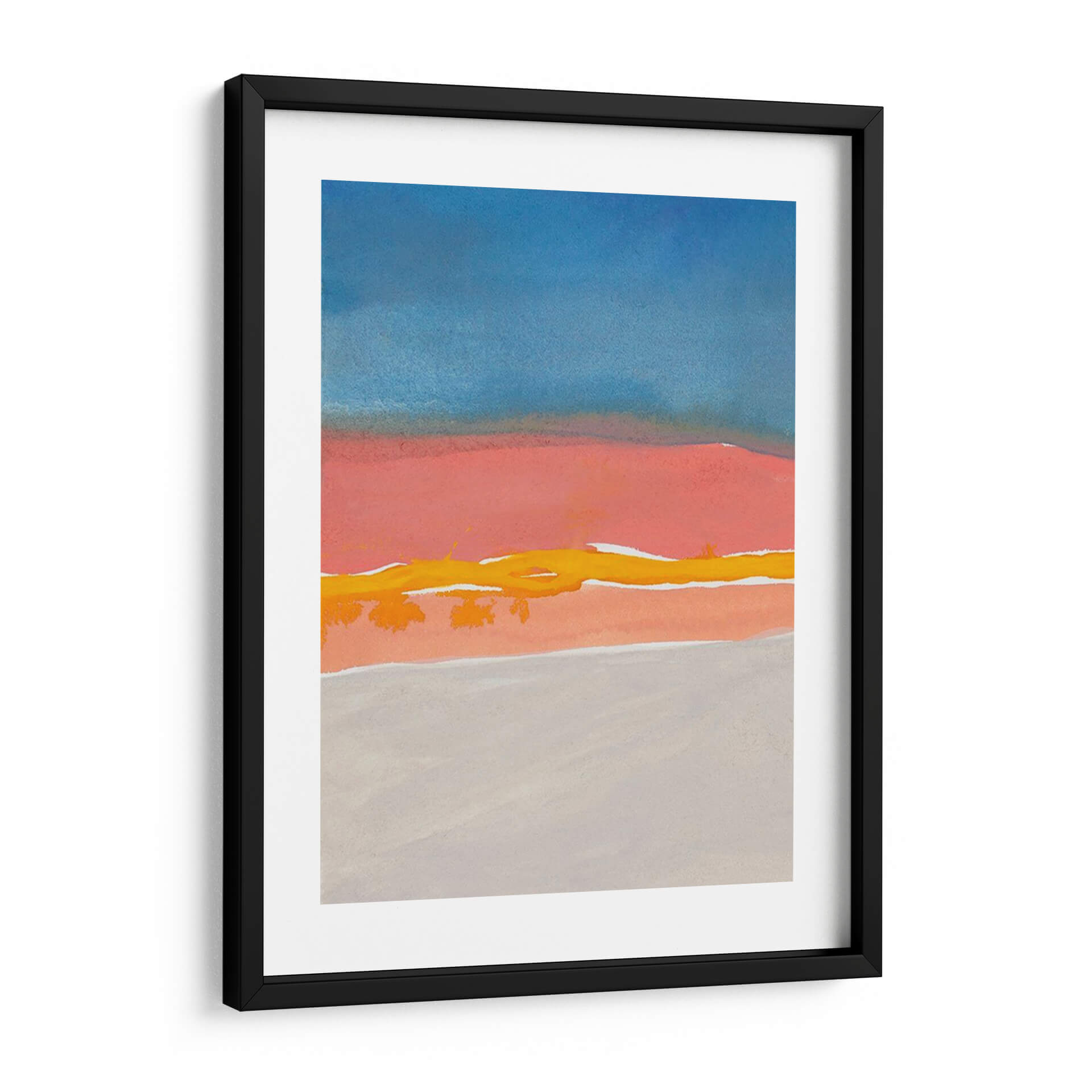 Sumérgete en la serena belleza del cuadro 'Kodachrome Horizonte Diptych I' de Rob Delamater, una obra de arte contemporáneo que evoca la tranquilidad de un atardecer o amanecer minimalista. Este cuadro decorativo se caracteriza por su paleta de colores armoniosa, donde el azul profundo del cielo se funde con tonos cálidos de coral y naranja, atravesados por una vibrante línea amarilla que evoca la luz del sol o un horizonte lejano. Las formas abstractas y las capas de color crean una atmósfera de calma y contemplación, invitando a la reflexión. Su composición dividida, reminiscente de un díptico, aporta un equilibrio visual y un dinamismo sutil que complementa cualquier espacio. Ideal para añadir un toque de sofisticación y serenidad a tu sala de estar, dormitorio u oficina moderna, este cuadro abstracto es una pieza versátil que captura la esencia de la naturaleza en su forma más pura. Transforma tu hogar en un oasis de paz con esta cautivadora obra de arte contemporáneo. Perfecta para quienes buscan una decoración elegante y con carácter.