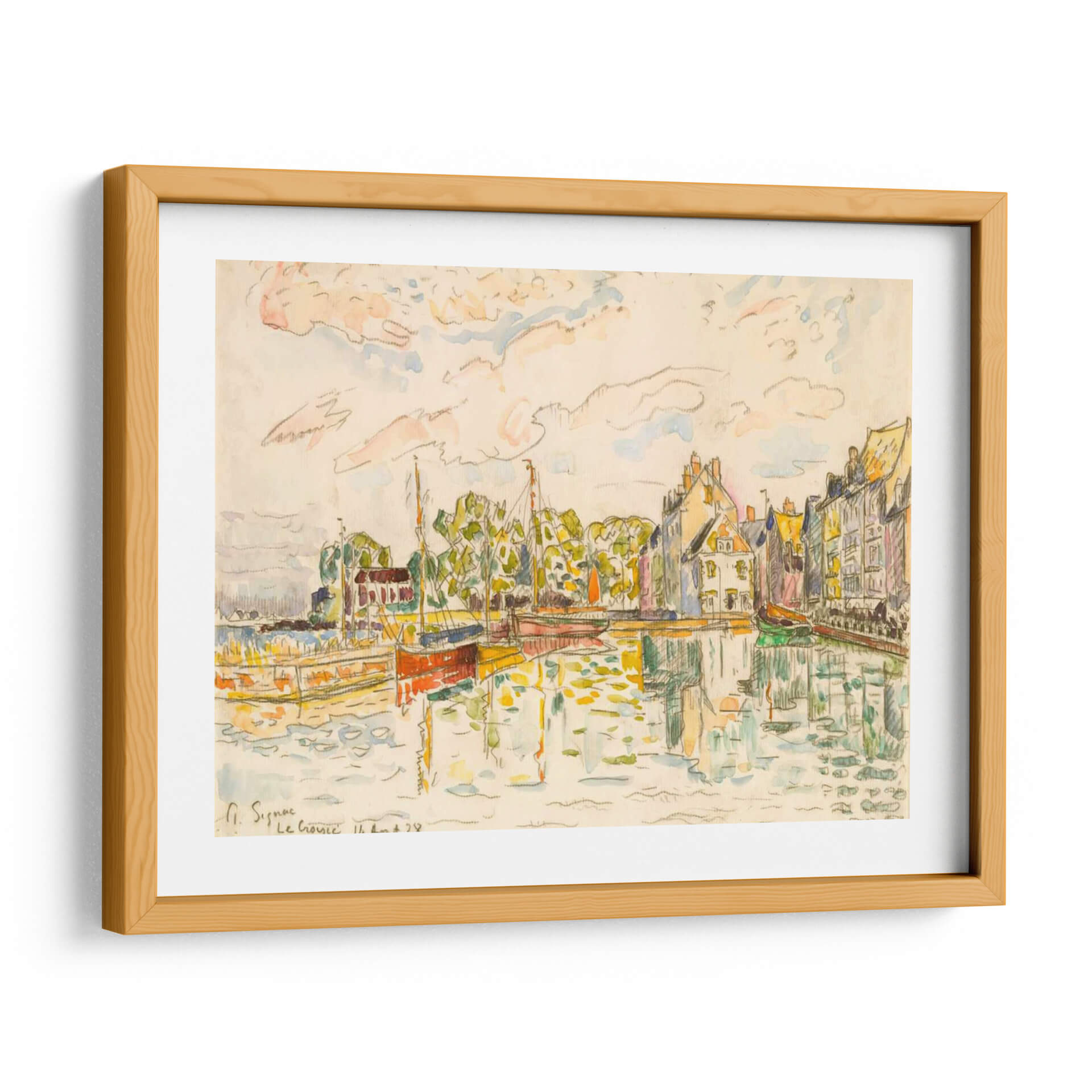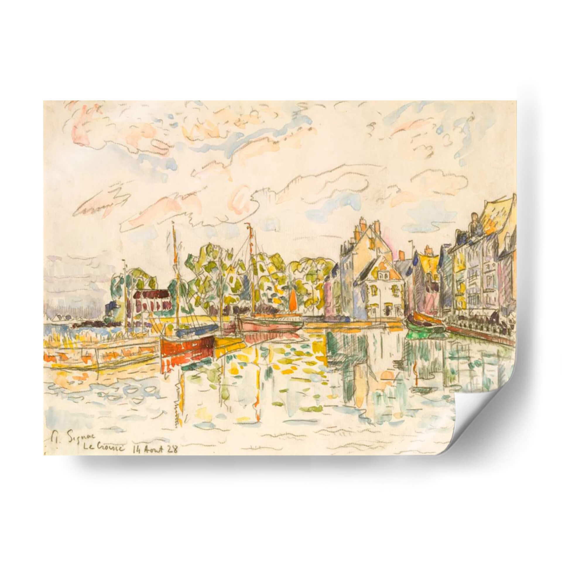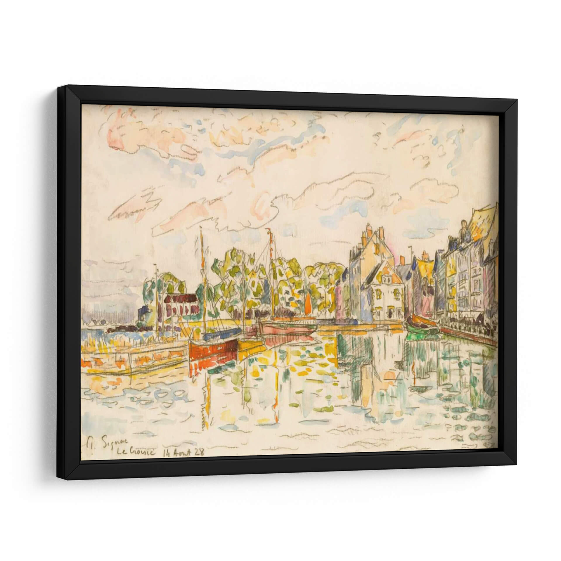 Sumérgete en la serenidad y el encanto costero con "Le Croisic I", una cautivadora obra de Paul Signac. Este cuadro decorativo captura la vibrante vida de un puerto francés, con sus coloridas edificaciones reflejándose en el agua tranquila y embarcaciones a la deriva. La técnica de acuarela y lápiz transmite una sensación de espontaneidad y luminosidad, con pinceladas sueltas que dan forma a las fachadas de las casas y a la frondosa vegetación. La paleta de colores, dominada por tonos tierra, amarillos cálidos y toques de azul y verde, crea una atmósfera de paz y alegría veraniega. La composición, que juega con las líneas del agua y la arquitectura, invita a la contemplación y al disfrute de un paisaje cotidiano elevado a arte. "Le Croisic I" es una pieza versátil, ideal para añadir un toque de sofisticación mediterránea a tu sala de estar, un soplo de aire fresco a tu estudio, o una nota de color y tranquilidad a tu dormitorio. Transforma tu espacio con la esencia del sur de Francia y el legado impresionista de Signac, una invitación visual a evocar recuerdos de vacaciones o sueños de futuros viajes.
